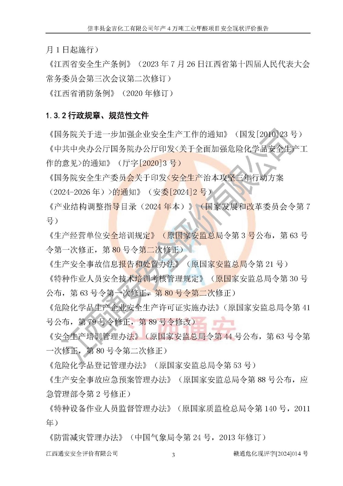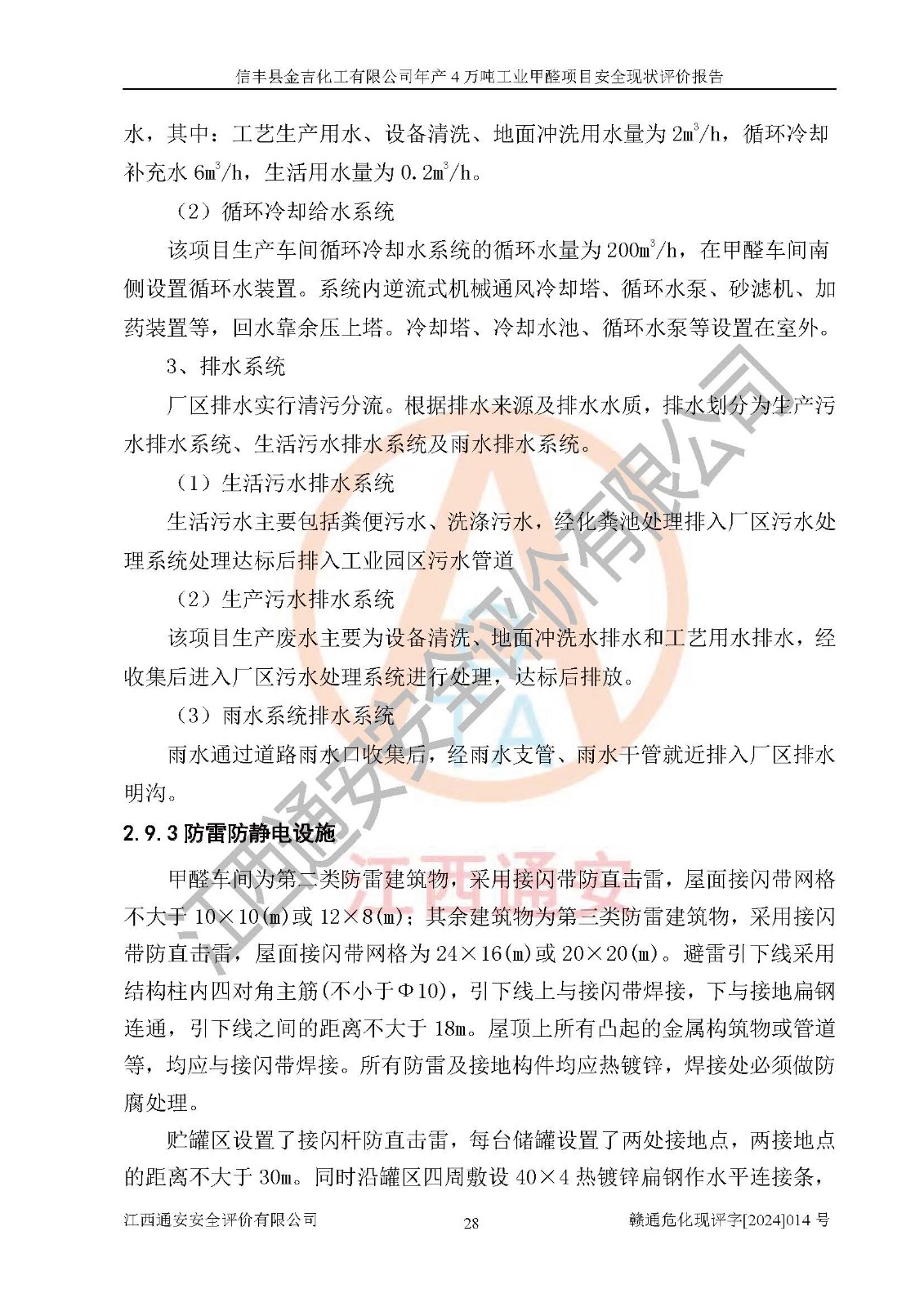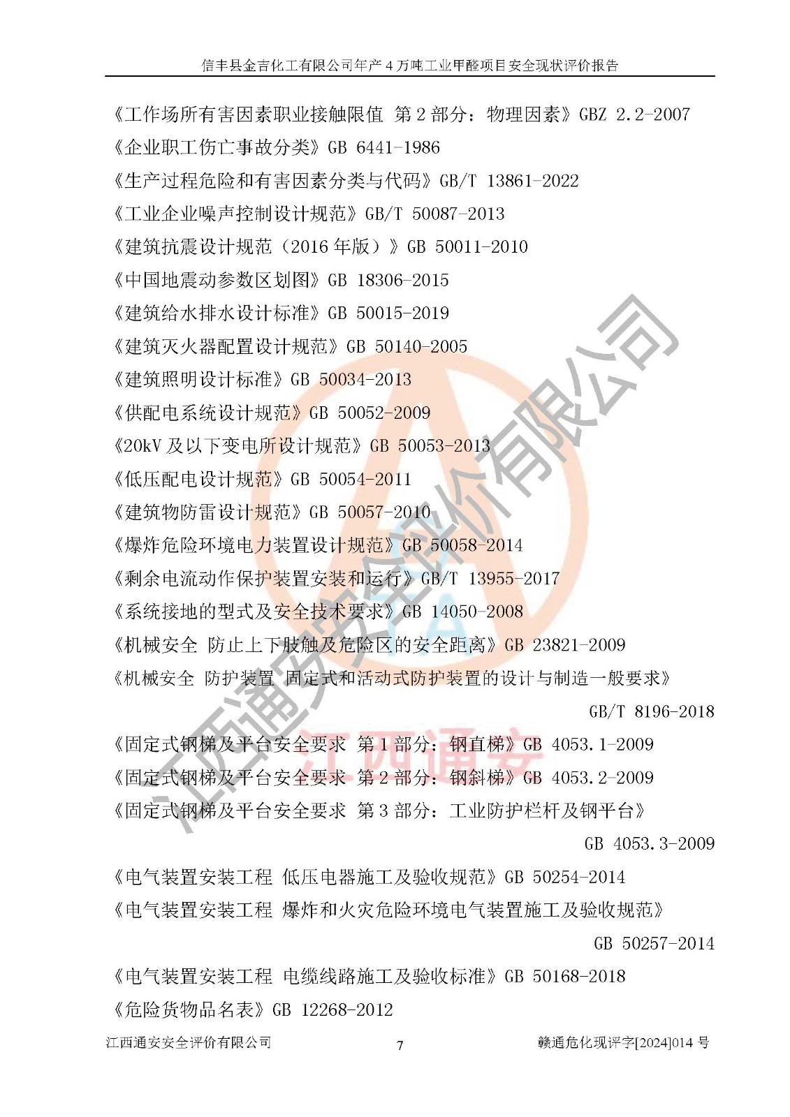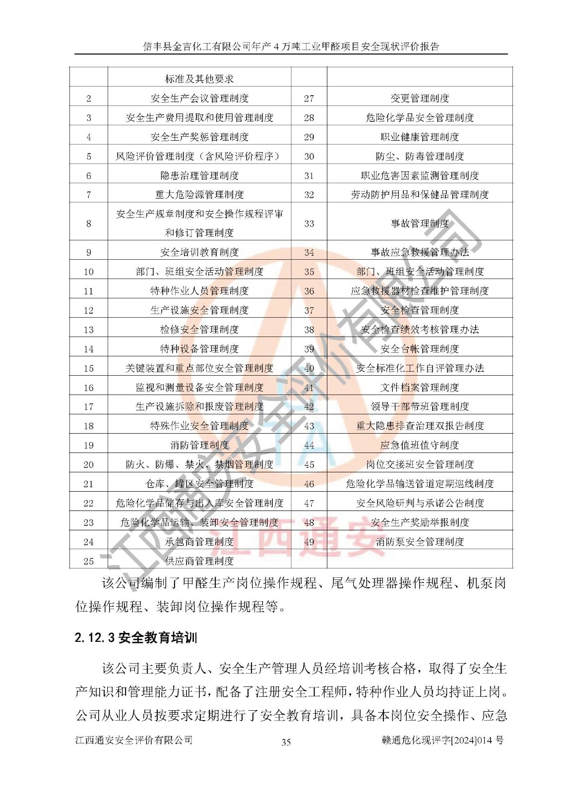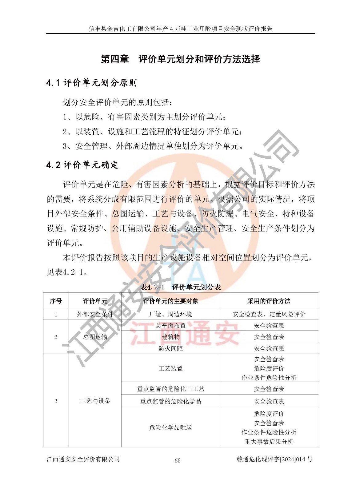 评价结论 | 信丰县金吉化工有限公司年产4万吨工业甲醛项目现场情况与设计图纸一致,DCS和SIS系统设计符合要求、运行正常,有关从业人员资质符合《江西省危险化学品安全专项整治三年行动实施方案》要求,安全设施及安全管理符合法律、法规、标准的要求,安全风险是受控制的,其风险程度是可以接受的,安全设施符合安全生产条件,能够满足安全生产的要求。 | ||||||