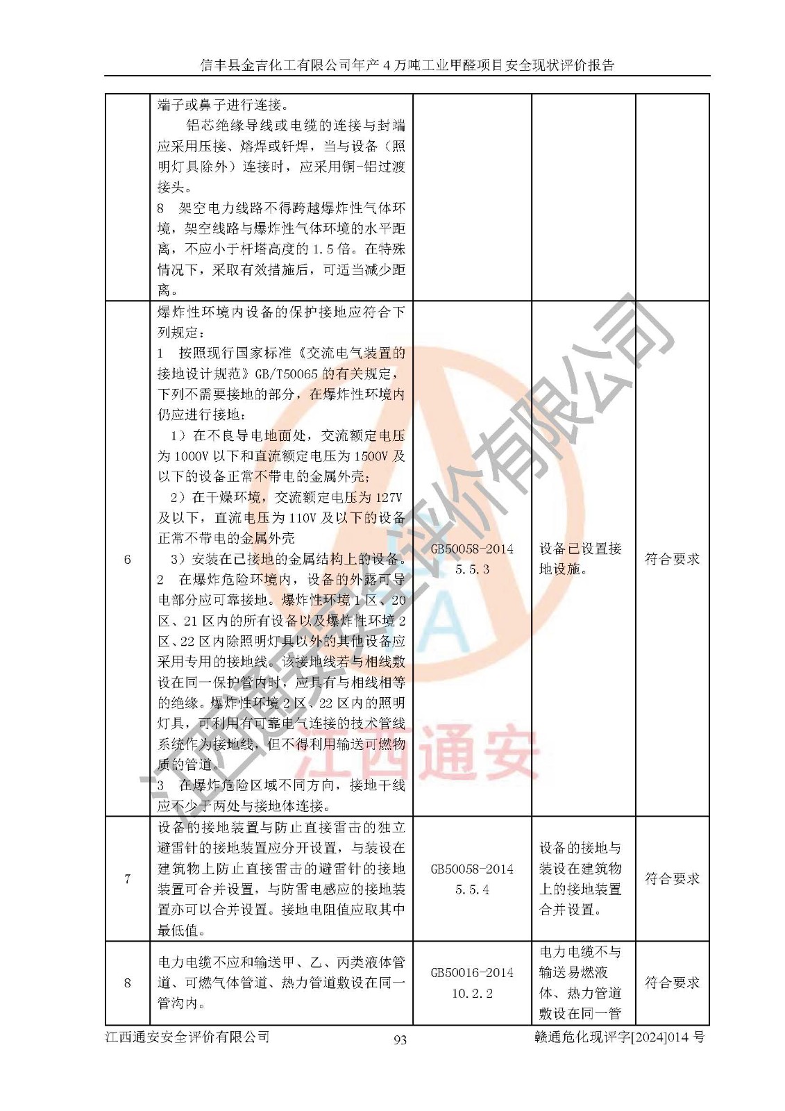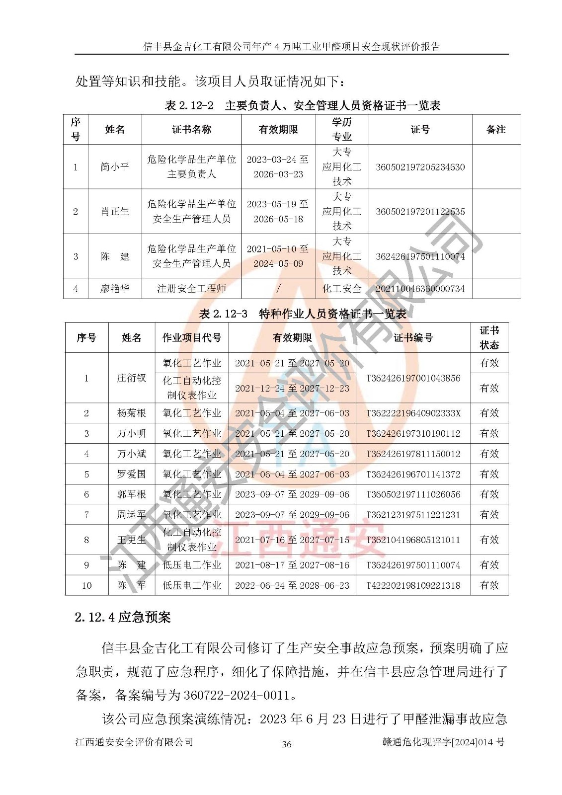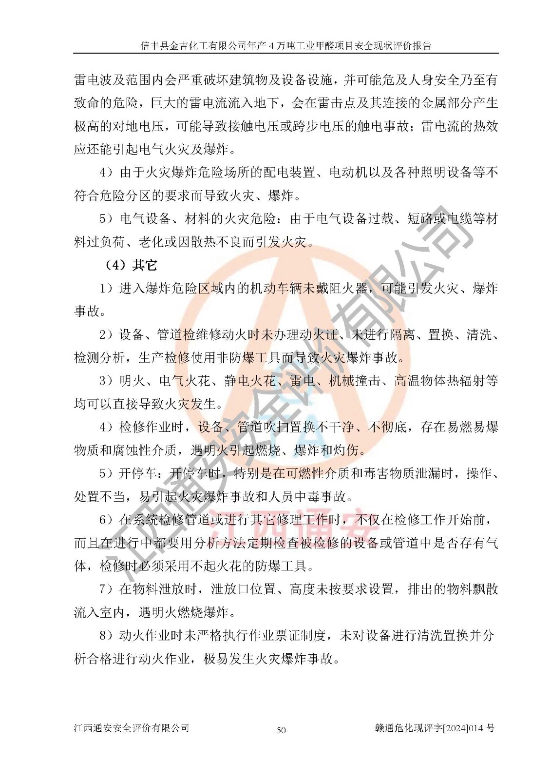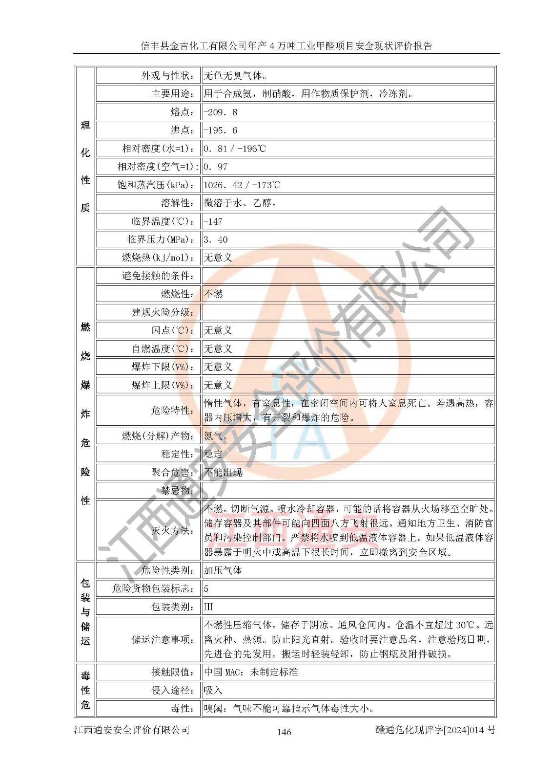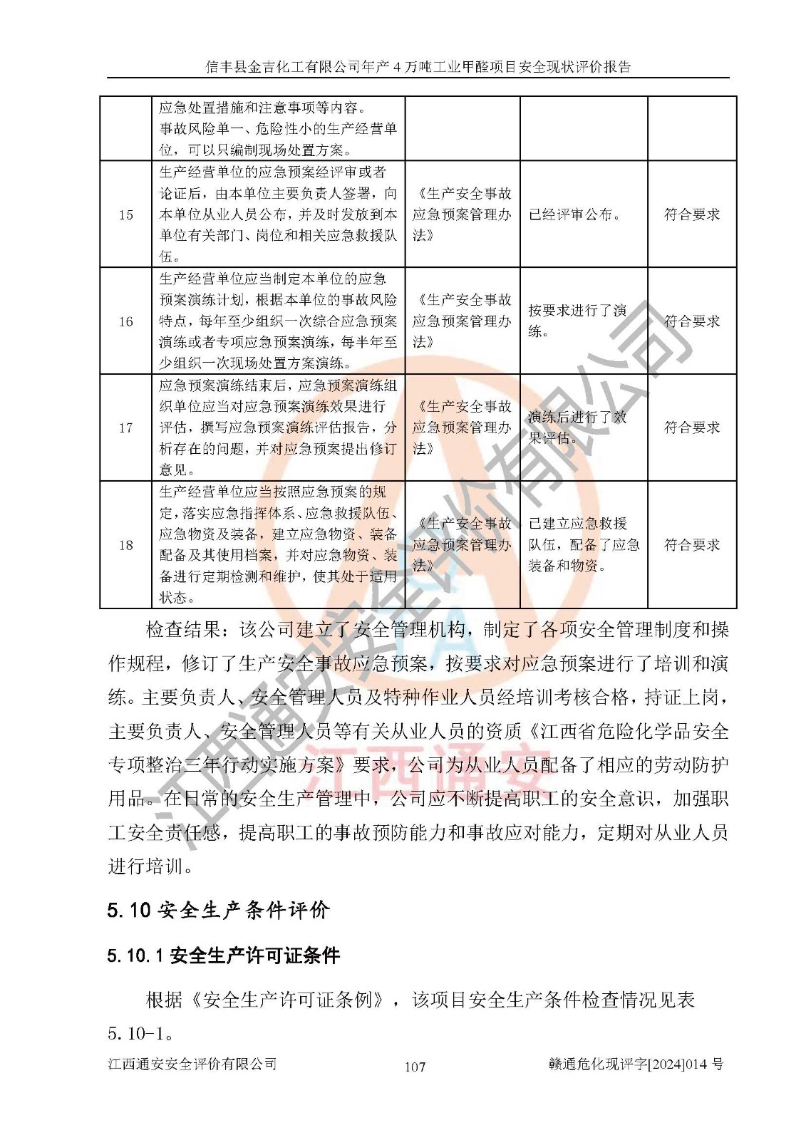 评价结论 | 信丰县金吉化工有限公司年产4万吨工业甲醛项目现场情况与设计图纸一致,DCS和SIS系统设计符合要求、运行正常,有关从业人员资质符合《江西省危险化学品安全专项整治三年行动实施方案》要求,安全设施及安全管理符合法律、法规、标准的要求,安全风险是受控制的,其风险程度是可以接受的,安全设施符合安全生产条件,能够满足安全生产的要求。 | ||||||