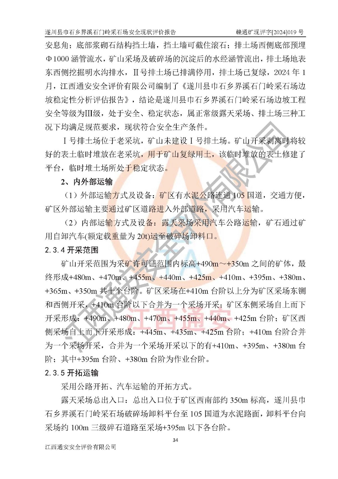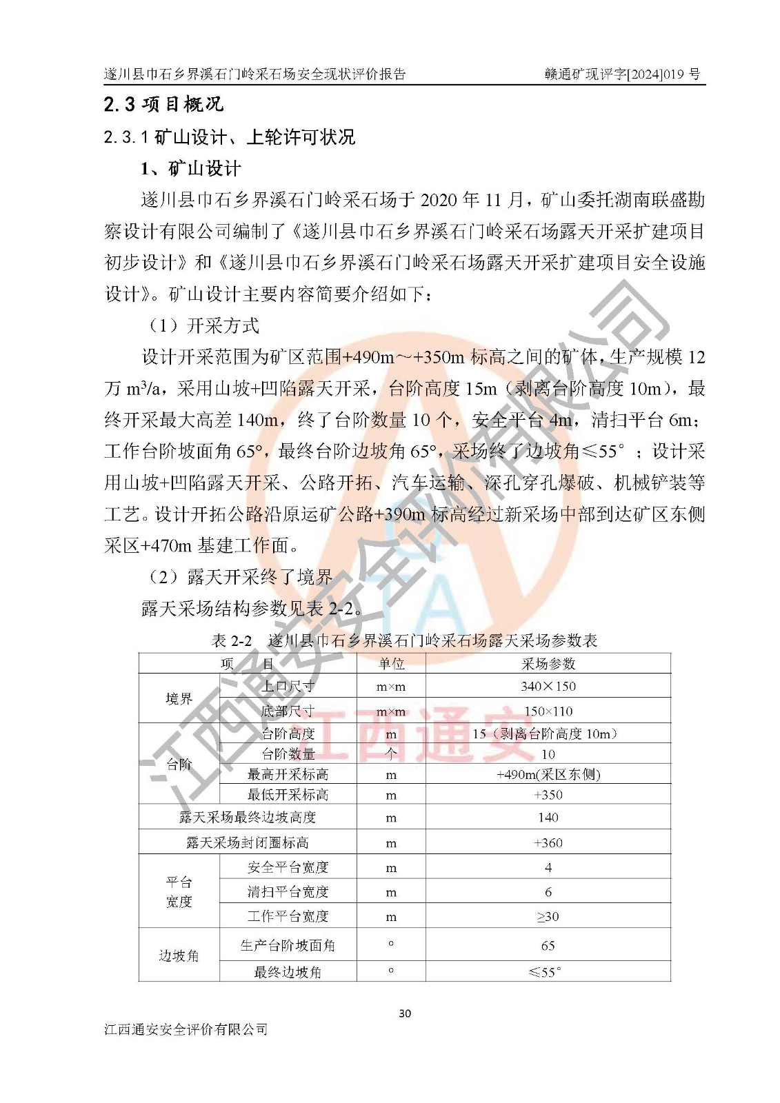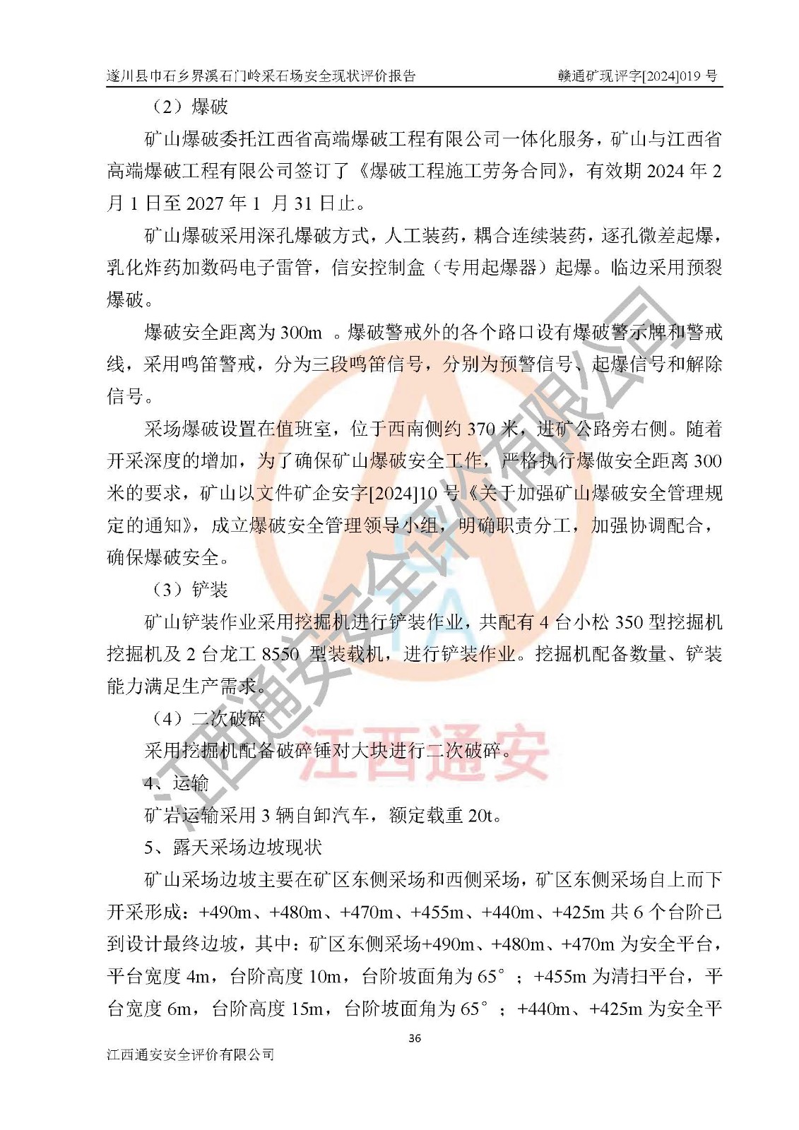 项目简介 | 遂川县巾石乡界溪石门岭采石场位于遂川县县城165º方位直距约15**处,行政区划隶属遂川县巾石乡管辖。矿区位置地理坐标:东经114°37′07″~114°37′21″,北纬26°15′22″~26°15′38″。矿区中心位置地理坐标:东经114°37′14″,北纬26°15′30″。矿区西距105国道直线约0.6km,并有矿区水泥公路与之相连,交通较便利。 矿山采用开拓公路汽车运输,矿山上山公路从矿区办公室往东南侧进入卸料平台向采场约100m三级碎石道路至采场+395m以下各台阶;矿山经过多年的开采,自上而形成了+490m、+480m、+470m、+455m、+440m、+425m共6个台阶已到设计*终边坡,其中:矿区东侧采场+490m、+480m、+470m为安全平台,平台宽度4m,台阶**10m,台阶坡面角为65°;+455m为清扫平台,平台宽度6m,台阶**15m,台阶坡面角为65°;+440m、+425m为安全平台,平台宽度4m,台阶**15m,台阶坡面角为65°。矿区西侧采场自上而下开采形成:+445m、+435m、+425m共3个台阶均为安全平台,平台宽度4m,台阶**10m,台阶坡面角为65°;+410m台阶矿区东侧采场和矿区西侧采场合并为一个采场开采的台阶,+410m为清扫平台,平台宽度6m,台阶**15m,台阶坡面角为65°。 2022年3月,矿山取得吉安市应急管理局颁发的安全生产标准化三级企业(非煤矿山)证书,证书编号:(吉)AQBKⅢ20220004,**期至2025年3月。 | ||||