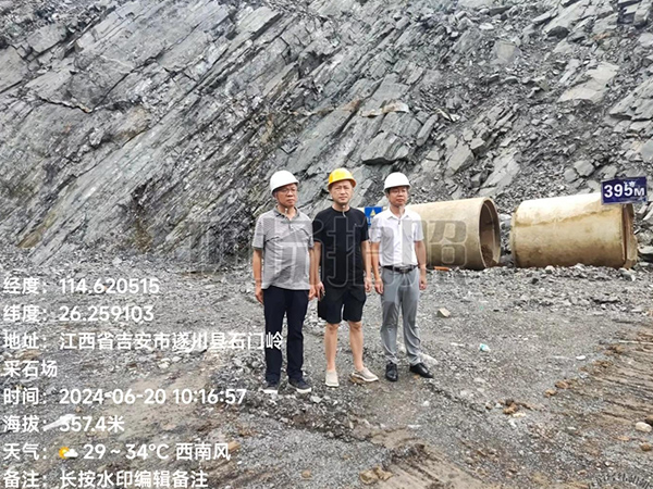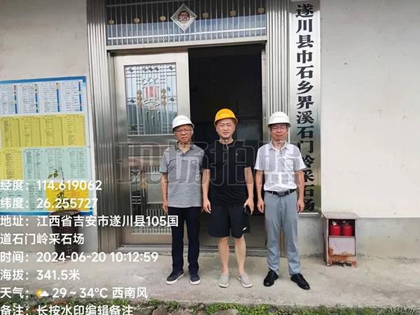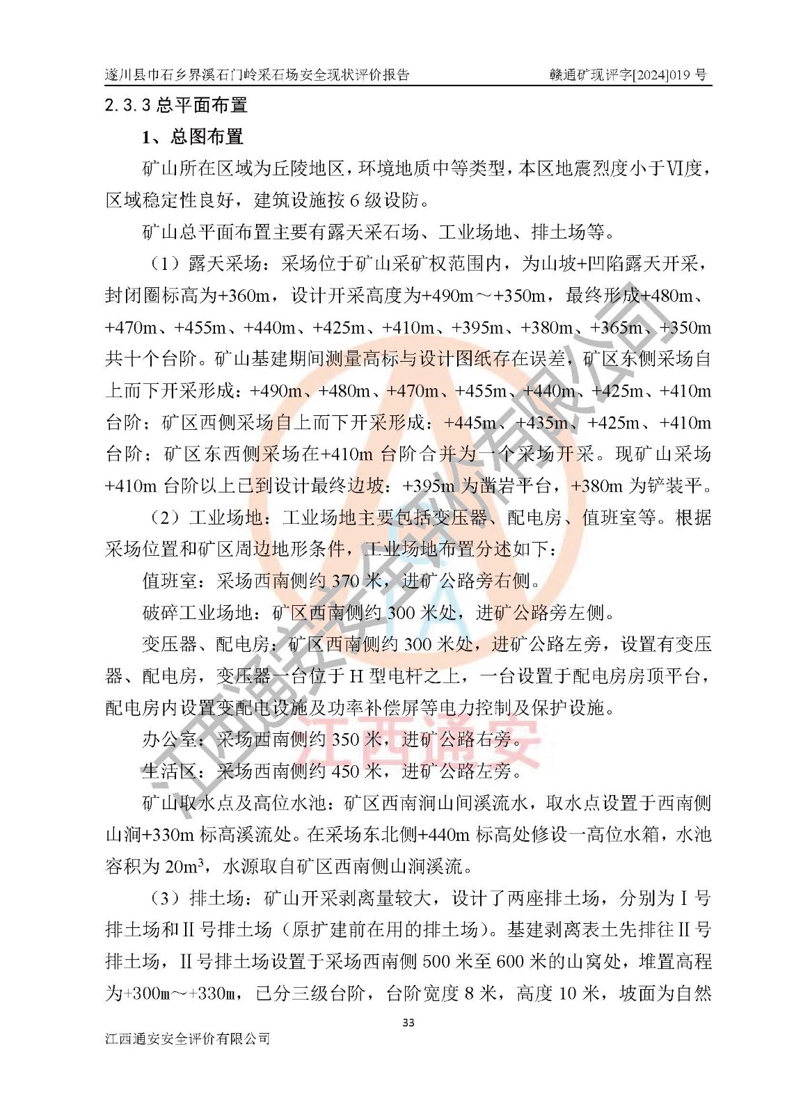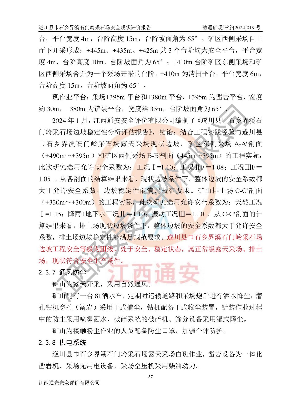 项目简介 | 遂川县巾石乡界溪石门岭采石场位于遂川县县城165º方位直距约15**处,行政区划隶属遂川县巾石乡管辖。矿区位置地理坐标:东经114°37′07″~114°37′21″,北纬26°15′22″~26°15′38″。矿区中心位置地理坐标:东经114°37′14″,北纬26°15′30″。矿区西距105国道直线约0.6km,并有矿区水泥公路与之相连,交通较便利。 矿山采用开拓公路汽车运输,矿山上山公路从矿区办公室往东南侧进入卸料平台向采场约100m三级碎石道路至采场+395m以下各台阶;矿山经过多年的开采,自上而形成了+490m、+480m、+470m、+455m、+440m、+425m共6个台阶已到设计*终边坡,其中:矿区东侧采场+490m、+480m、+470m为安全平台,平台宽度4m,台阶**10m,台阶坡面角为65°;+455m为清扫平台,平台宽度6m,台阶**15m,台阶坡面角为65°;+440m、+425m为安全平台,平台宽度4m,台阶**15m,台阶坡面角为65°。矿区西侧采场自上而下开采形成:+445m、+435m、+425m共3个台阶均为安全平台,平台宽度4m,台阶**10m,台阶坡面角为65°;+410m台阶矿区东侧采场和矿区西侧采场合并为一个采场开采的台阶,+410m为清扫平台,平台宽度6m,台阶**15m,台阶坡面角为65°。 2022年3月,矿山取得吉安市应急管理局颁发的安全生产标准化三级企业(非煤矿山)证书,证书编号:(吉)AQBKⅢ20220004,**期至2025年3月。 | ||||