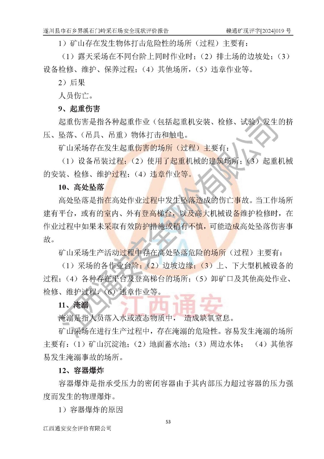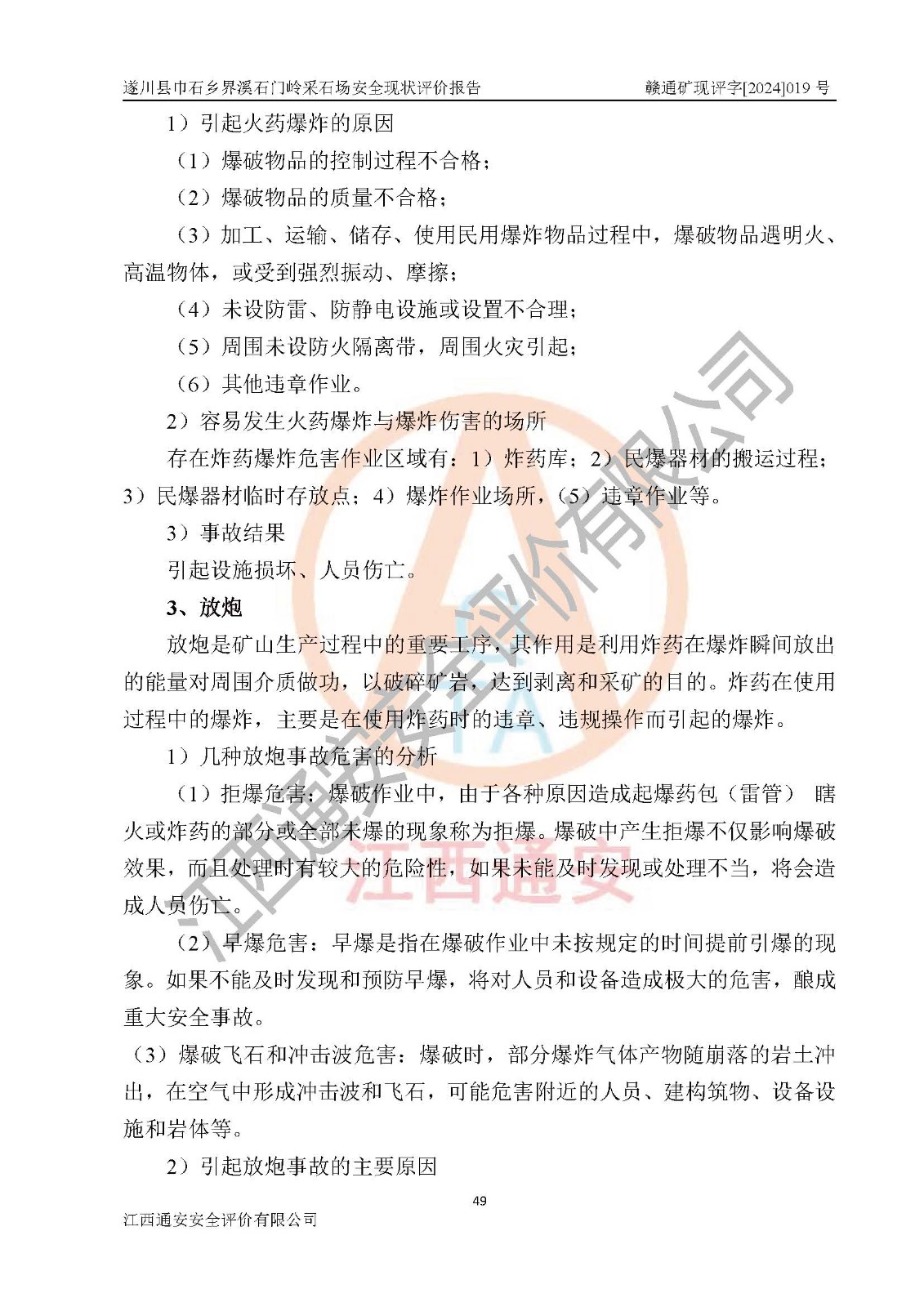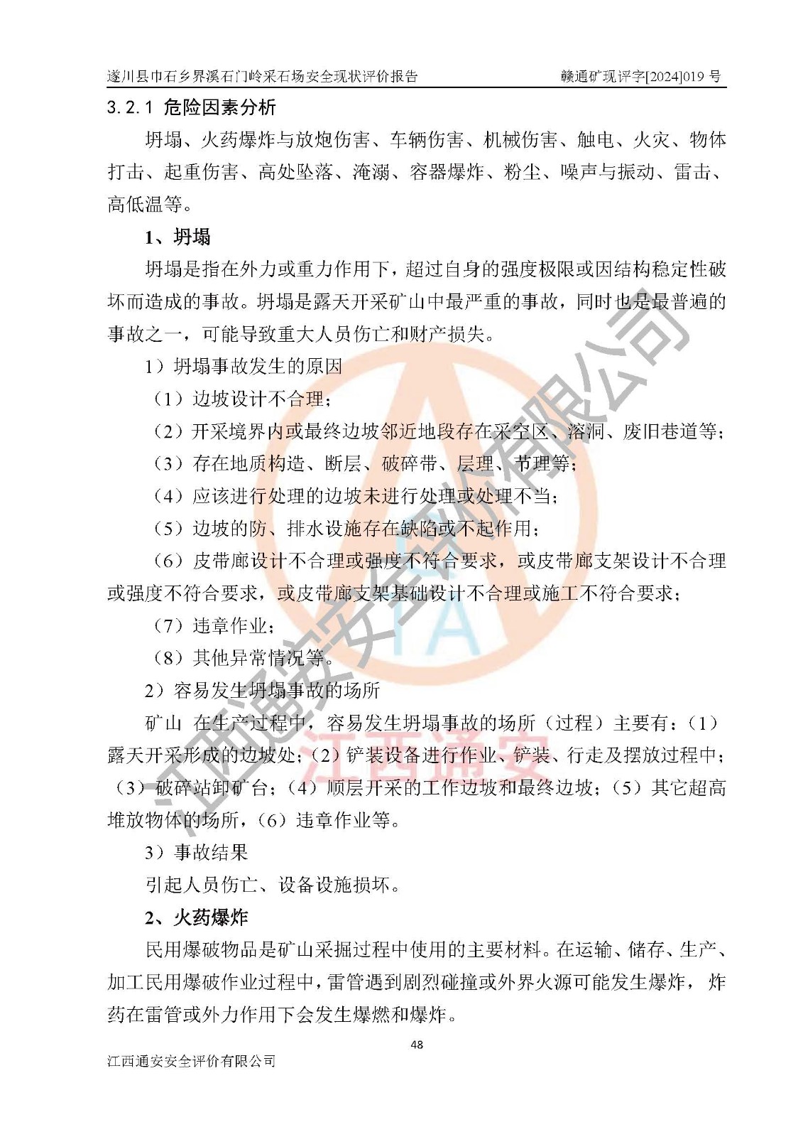 其它 | 1、该评价项目中存在的主要危险因素:火药爆炸、爆破伤害、容器爆炸、触电与雷电、坍塌、机械伤害、**伤害、火灾、高处坠落、物体打击、滑坡、泥石流、淹溺、中毒和窒息等危险有害因素。 2、该评价项目中存在的有害因素包括:粉尘、噪声与振动、不良作业环境,如高温、雷击对矿山人员的伤害和其他不利的环境因素等。 3、该评价项目为非金属露天采石场,无瓦斯和自燃发火危险,矿区范围内及周边无较大水系,矿区水文地质条件简单。该评价项目只是对建筑用砂岩矿进行露天开采,不使用有毒有害危险化学品药剂,该评价项目涉及的危险物品主要为民用爆破器材,根据业主介绍,爆破器材采用配送制。该评价项目使用的压力容器为空压机储气罐,其工作介质为空气,属**性、非易燃介质。综合上述分析,本评价项目不存在重大危险源。 上述主要危险、有害因素在采取本报告第六章中提出的安全对策措施后,能得到**控制。该项目从安全生产角度符合**有关安全生产法律、法规、规章和技术标准的要求。 | ||||