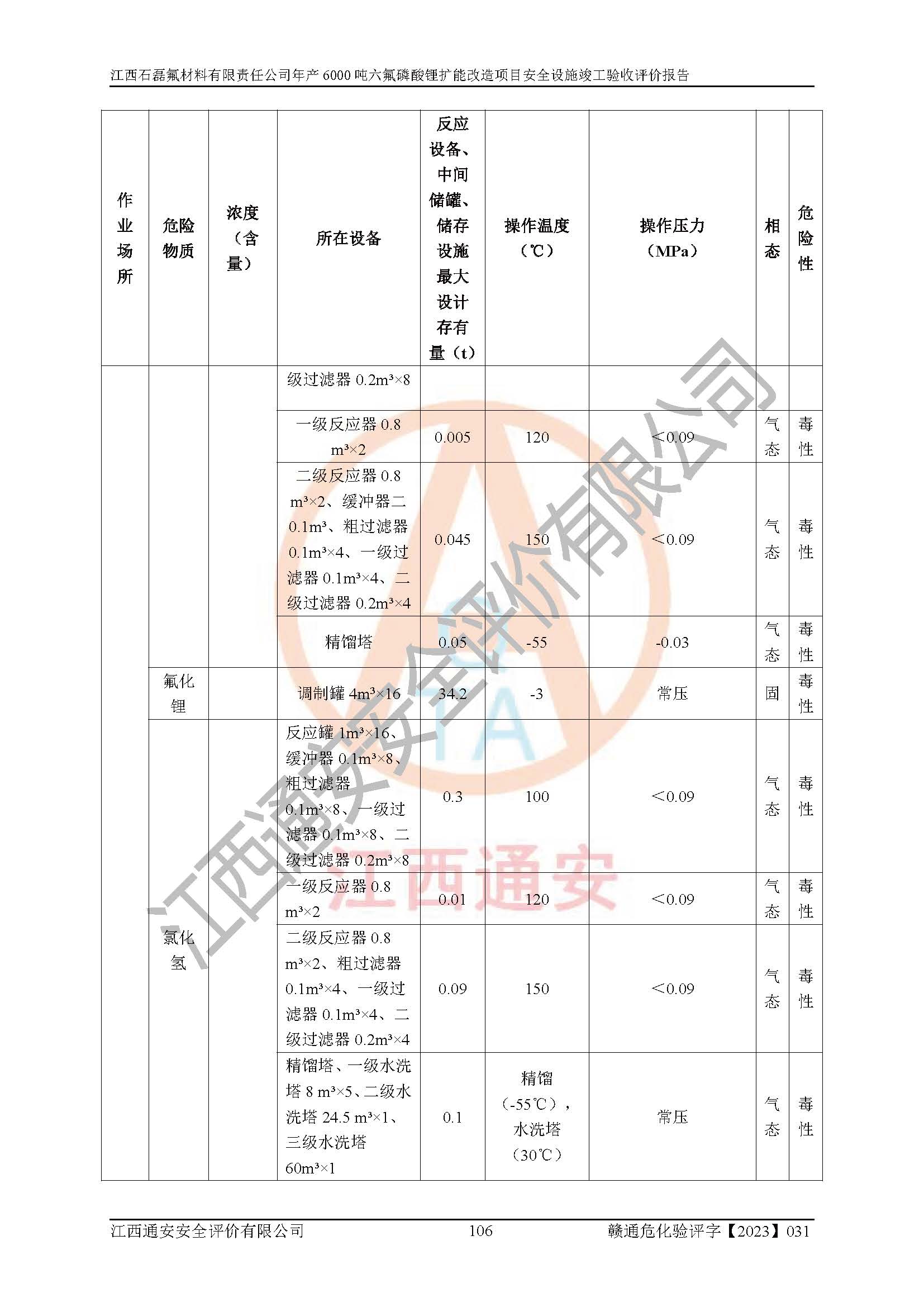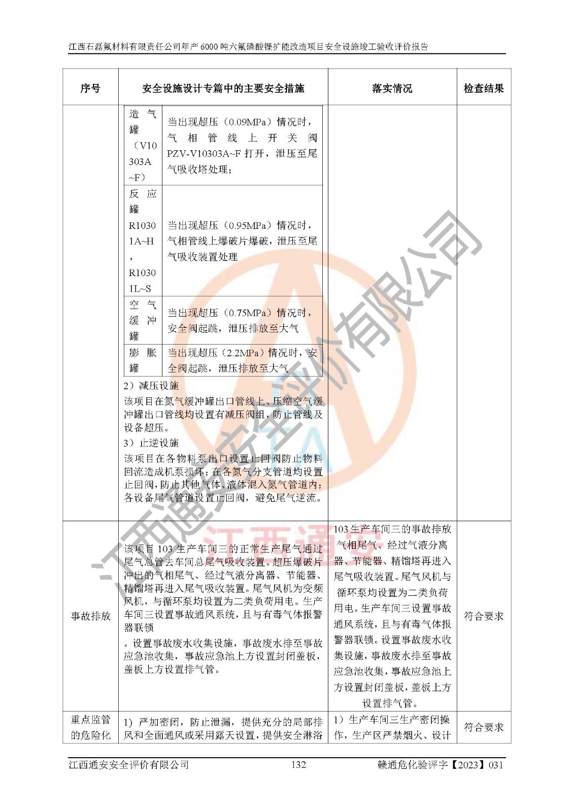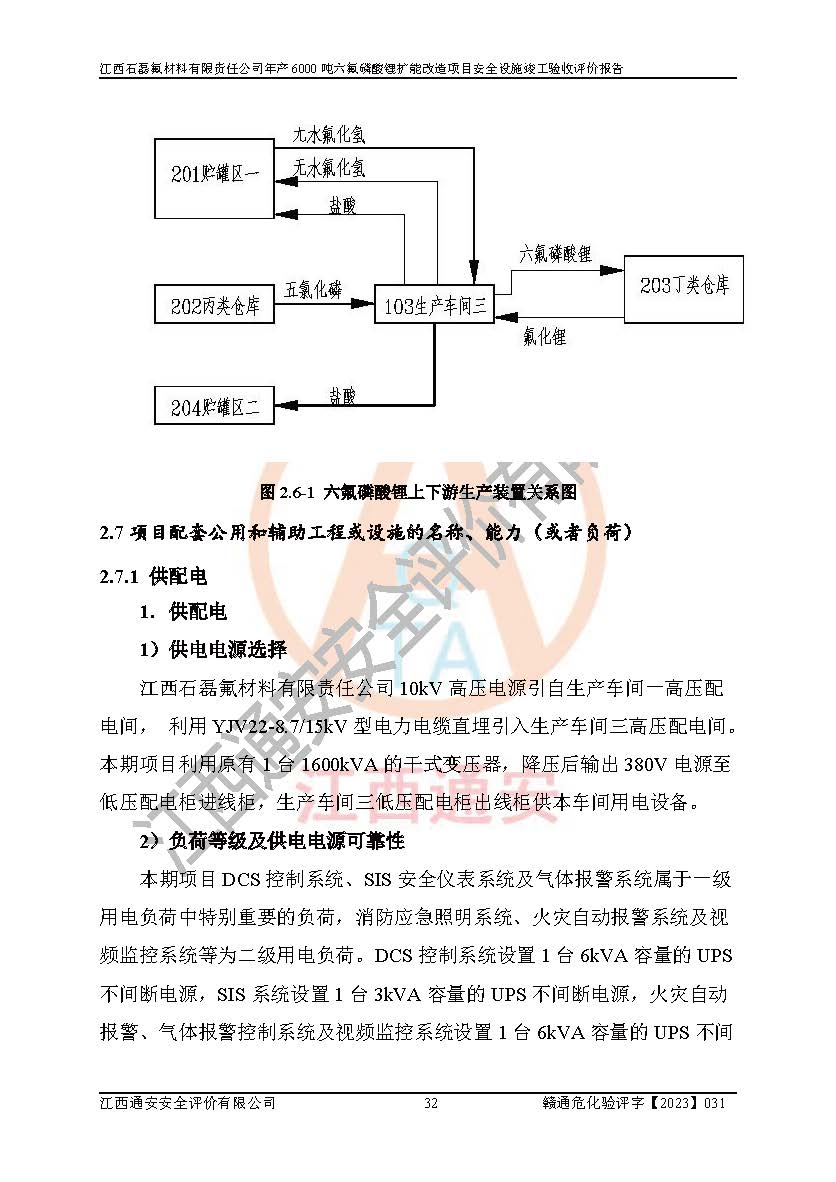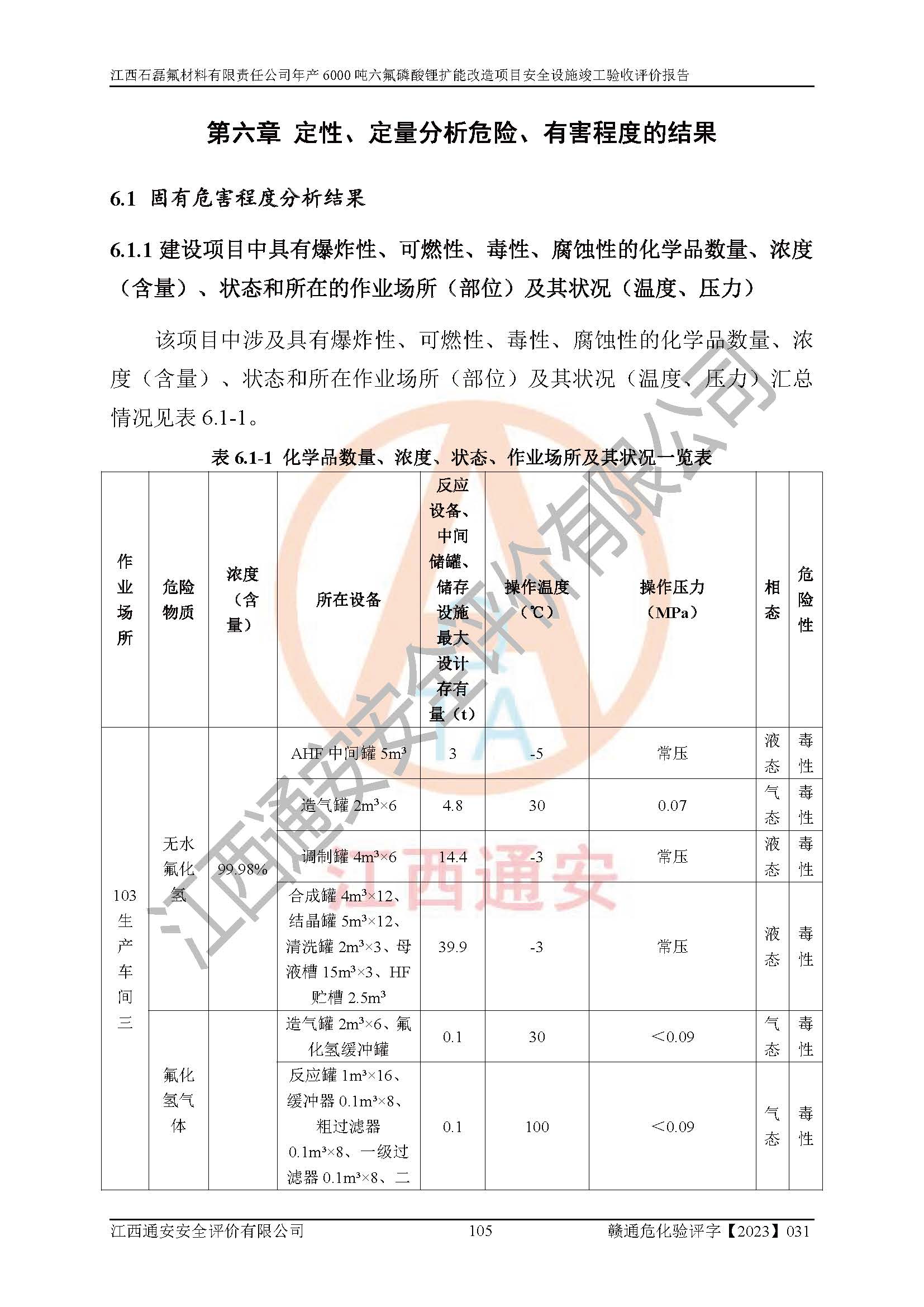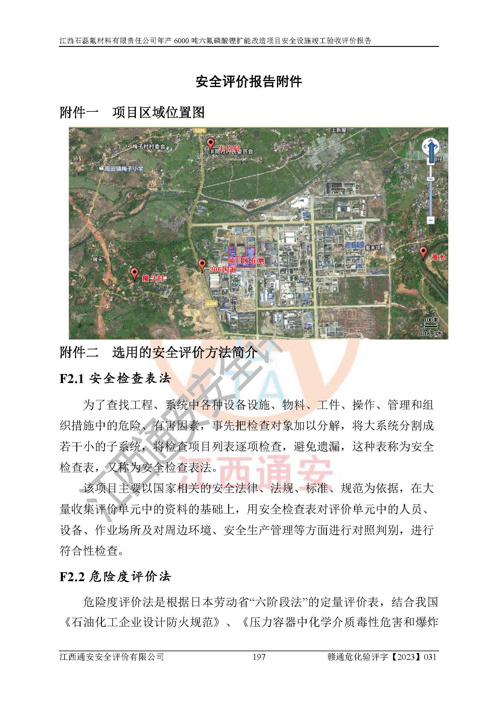 一、建设项目所在地的安全条件和与周边的安全防护距离 (1)该项目位于江西省赣州市会昌县氟盐化工产业基地,属于认定的化工园区,厂址选择合理,该项目与周边环境的防火间距符合规范的要求。 (2)重大危险源与“八类敏感场所及区域”的距离符合相关法律、法规的规定。 (3)该项目103生产车间三和201罐区一均构成**重大危险源。根据《危险化学品生产装置和储存设施外部安全防护距离确定方法》(GB/T 37243-2019)和《危险化学品生产装置和储存设施风险基准》(GB 36894-2018),该项目高敏感防护目标、重要防护目标、一般防护目标中的一类防护目标(<3×10-7)的外部安全防护距离包络线距离厂界*大值为76.36m,个人风险等值线范围内未出现该类防护目标;一般防护目标中的二类防护目标(<3×10-6)的外部安全防护距离包络线距离厂界*大值为51.62m,个人风险等值线范围内未涉及相应的防护目标;一般防护目标中的三类防护目标(<1×10-5)外部安全防护距离的包络线未出厂界。项目外部安全防护距离内无相应的防护目标,该项目不存在社会风险。 (4)该项目投产后在正常生产情况下,对其周边单位的生产、经营活动和居民的生活影响很小。在发生事故的情况下对周边单位的生产、经营活动和居民的生活存在影响。该项目周边单位的生产、经营活动和居民的生活对该项目投产后的正常生产影响很小。该项目所在地自然条件(不包括地震等破坏力**的自然灾害)的变化对该项目投产后的正常生产没有影响。 二、建设项目安全设施设计的采纳情况和已采用(取)的安全设施水平 该项目采用的主要安全设施包括了以下方面:检测、报警设施,设备安全防护设施,作业场所防护设施,安全警示标志,泄压和止逆设施,紧急处理设施,防止火灾蔓延设施,灭火设施,紧急个人处置设施,应急救援设施,劳动防护用品和装备等。 该项目在建设过程中采纳了《安全设施设计专篇》中的有关安全措施建议及要求,针对性的采取了相应的预防和控制措施,建设中未落实的安全措施,在试生产中已进行了整改。试生产表明该项目所采取的安全控制措施安全**,主要生产装置、设备运行平稳,安全可靠,安全水平较高,能够满足安全生产条件。 三、建设项目试生产(使用)后具备**现行有关安全生产法律、法规和部门规章及标准规定和要求的安全生产条件 1)法律法规等方面的符合性:该项目按照建设项目“三同时”要求,项目进行了备案、通过了安全条件审查、安全设施设计审查、试生产方案审查,立项审批手续齐全,安全设施设计、建设施工、施工监理均由有资质的单位承担,项目建设符合法律、法规规定的审批、施工、监理手续。项目建设期间,公司结合生产需要,增设了部分辅助设施和工艺管线,属于一般变更,试生产期间公司已委托河北英科石化工程有限公司进行了设计变更,作为已经审查通过的安全设施设计专篇的补充文件。 2)该项目与周边建构筑物的防火距离符合《精细化工企业工程设计防火标准》《建筑设计防火规范》的要求。根据《危险化学品生产装置和储存设施风险基准》GB36894-2018确定危险化学品单位周边重要目标和敏感场所承受的可容许个人风险和社会风险的定量风险评价。项目的个人风险计算结果表明,项目外部安全防护距离的包络线内无相应的防护目标。该软件未计算出社会风险。因此项目可容许个人风险和社会风险均在可接受范围内。 3)平面布置及常规防护设施措施的合理性:该项目生产场所、办公场所之间的间距满足安全要求,建筑结构、防火分区、防雷设施、安全出口的设置等满足安全生产的要求。消防道路的净宽度、净**、转弯半径均满足运输**及消防**通行。设置的常规防护设施、防止机械伤害、防急性中毒窒息的设施和措施符合要求。 4)设施、设备、装置及工艺方面的安全性:无**明令淘汰的工艺和 设备,该项目不涉及爆炸性危险区域划分。生产工艺操作和设置的安全设施满足安全需要,生产设施的布置能**人员疏散安全及操作方便。设施、设备、装置及工艺方面安全可靠。 5)特种设备、强制检测设备设施监督检验情况:该项目特种设备均进行了检验检测,并取得了检验报告;安全阀、压力表、有毒气体探头也进行了校验,校验结论合格,特种设备及安全附件符合《特种设备安全监察条例》 等相关法律法规、条例的规定。 6)公用工程、辅助设施的配套性:为该项目生产配套的供水、供电、 供气、供热等满足需要。 7)人员管理及安全培训方面充分性:公司现已建立了安全管理机构, 配备了专职安全管理人员。主要负责人王成具备化学工程与工艺专业本科学历,分管生产负责人曾中山具备化学工程与工艺专业本科学历,分管设备和技术负责人刘辉涛具备应用化学专业本科学历。专职安全管理人员共4人,配有一名注册安全工程师,专职安全管理人员均具有大专以上化工及安全专业相关学历。重点监管化工工艺的生产装置、储存设施操作人员具备高中及以上学历或化工类中等及以上职业教育水平。该公司制定了较完善的安全管理制度、岗位责任制、安全操作规程,制度执行情况较好。该公司已为从业职工交纳了工伤**。该公司对操作员工进行相关的培训和教育,经培训合格后上岗。 8)应急救援**性:企业根据自身实际情况,将该项目按照《生产经 营单位生产安全事故
