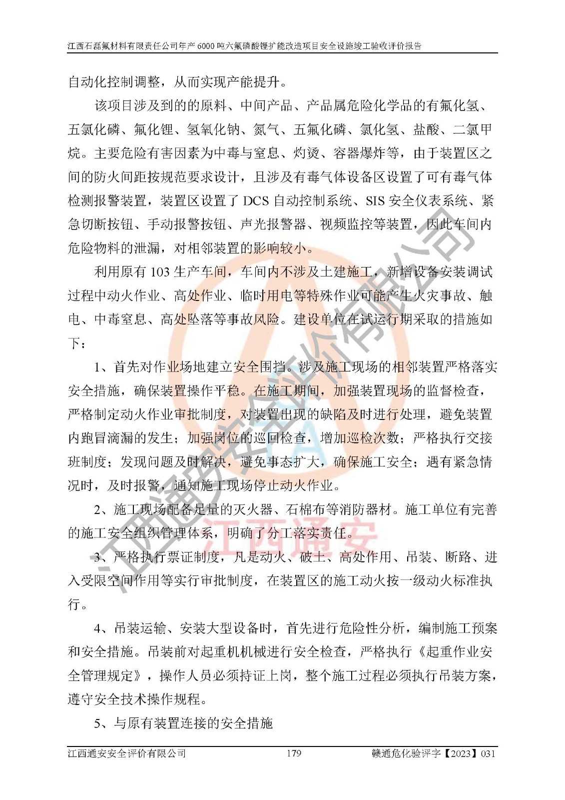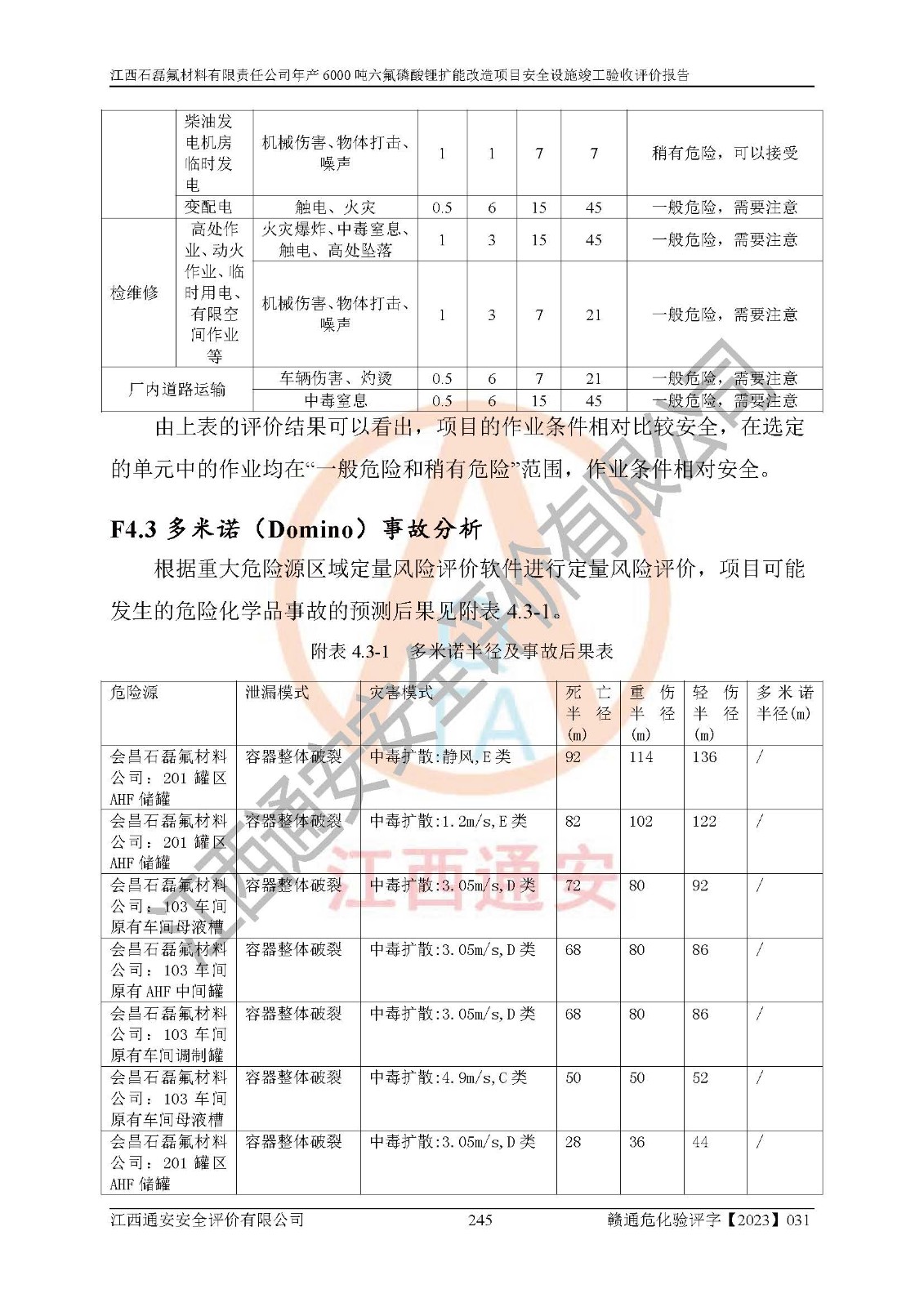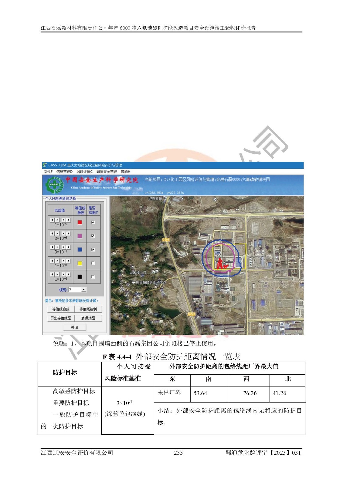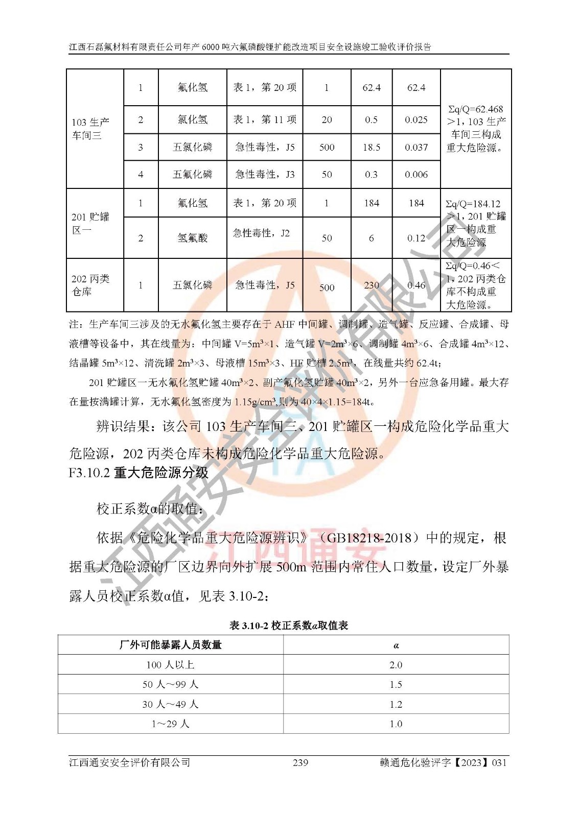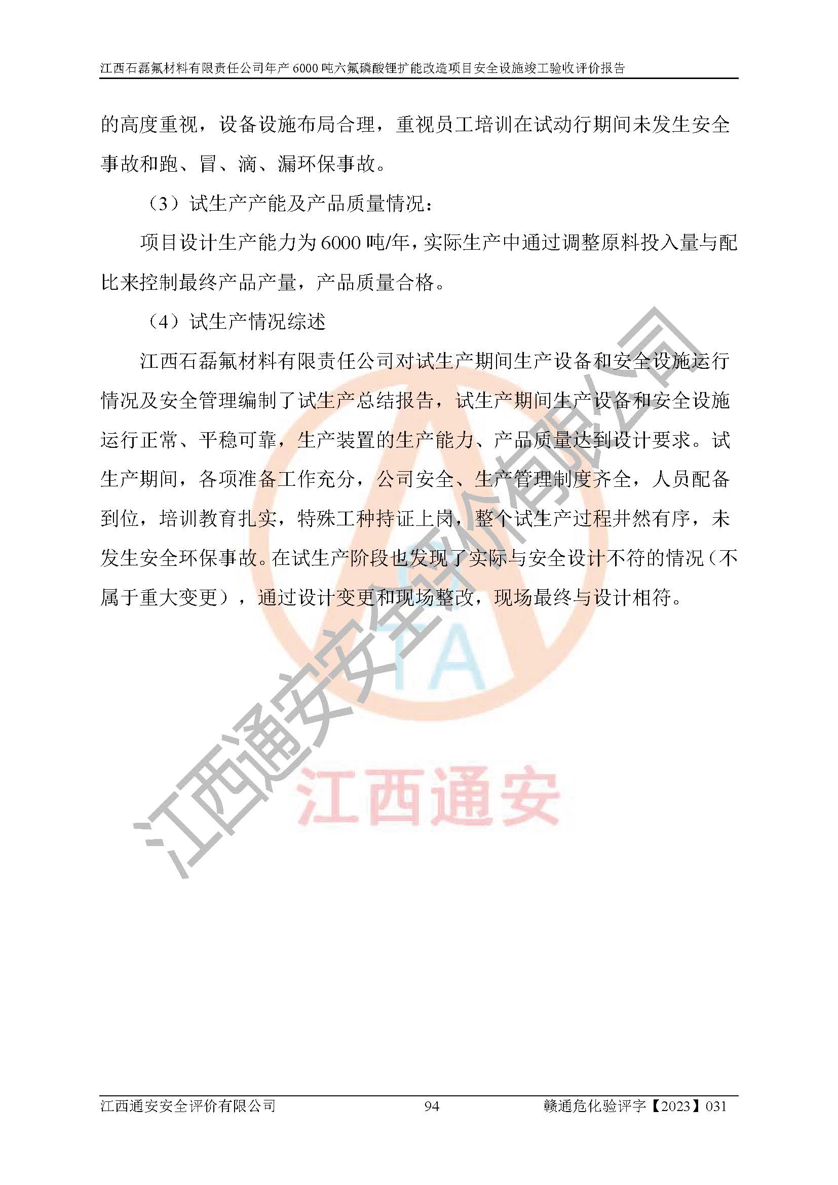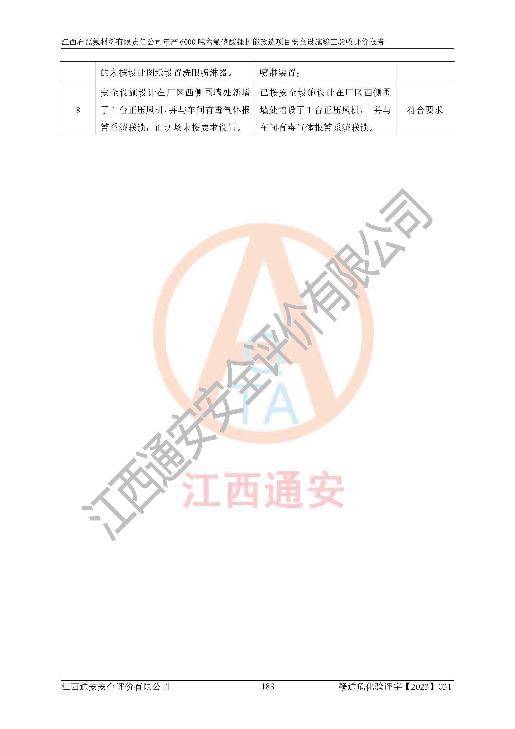 一、建设项目所在地的安全条件和与周边的安全防护距离 (1)该项目位于江西省赣州市会昌县氟盐化工产业基地,属于认定的化工园区,厂址选择合理,该项目与周边环境的防火间距符合规范的要求。 (2)重大危险源与“八类敏感场所及区域”的距离符合相关法律、法规的规定。 (3)该项目103生产车间三和201罐区一均构成**重大危险源。根据《危险化学品生产装置和储存设施外部安全防护距离确定方法》(GB/T 37243-2019)和《危险化学品生产装置和储存设施风险基准》(GB 36894-2018),该项目高敏感防护目标、重要防护目标、一般防护目标中的一类防护目标(<3×10-7)的外部安全防护距离包络线距离厂界*大值为76.36m,个人风险等值线范围内未出现该类防护目标;一般防护目标中的二类防护目标(<3×10-6)的外部安全防护距离包络线距离厂界*大值为51.62m,个人风险等值线范围内未涉及相应的防护目标;一般防护目标中的三类防护目标(<1×10-5)外部安全防护距离的包络线未出厂界。项目外部安全防护距离内无相应的防护目标,该项目不存在社会风险。 (4)该项目投产后在正常生产情况下,对其周边单位的生产、经营活动和居民的生活影响很小。在发生事故的情况下对周边单位的生产、经营活动和居民的生活存在影响。该项目周边单位的生产、经营活动和居民的生活对该项目投产后的正常生产影响很小。该项目所在地自然条件(不包括地震等破坏力**的自然灾害)的变化对该项目投产后的正常生产没有影响。 二、建设项目安全设施设计的采纳情况和已采用(取)的安全设施水平 该项目采用的主要安全设施包括了以下方面:检测、报警设施,设备安全防护设施,作业场所防护设施,安全警示标志,泄压和止逆设施,紧急处理设施,防止火灾蔓延设施,灭火设施,紧急个人处置设施,应急救援设施,劳动防护用品和装备等。 该项目在建设过程中采纳了《安全设施设计专篇》中的有关安全措施建议及要求,针对性的采取了相应的预防和控制措施,建设中未落实的安全措施,在试生产中已进行了整改。试生产表明该项目所采取的安全控制措施安全**,主要生产装置、设备运行平稳,安全可靠,安全水平较高,能够满足安全生产条件。 三、建设项目试生产(使用)后具备**现行有关安全生产法律、法规和部门规章及标准规定和要求的安全生产条件 1)法律法规等方面的符合性:该项目按照建设项目“三同时”要求,项目进行了备案、通过了安全条件审查、安全设施设计审查、试生产方案审查,立项审批手续齐全,安全设施设计、建设施工、施工监理均由有资质的单位承担,项目建设符合法律、法规规定的审批、施工、监理手续。项目建设期间,公司结合生产需要,增设了部分辅助设施和工艺管线,属于一般变更,试生产期间公司已委托河北英科石化工程有限公司进行了设计变更,作为已经审查通过的安全设施设计专篇的补充文件。 2)该项目与周边建构筑物的防火距离符合《精细化工企业工程设计防火标准》《建筑设计防火规范》的要求。根据《危险化学品生产装置和储存设施风险基准》GB36894-2018确定危险化学品单位周边重要目标和敏感场所承受的可容许个人风险和社会风险的定量风险评价。项目的个人风险计算结果表明,项目外部安全防护距离的包络线内无相应的防护目标。该软件未计算出社会风险。因此项目可容许个人风险和社会风险均在可接受范围内。 3)平面布置及常规防护设施措施的合理性:该项目生产场所、办公场所之间的间距满足安全要求,建筑结构、防火分区、防雷设施、安全出口的设置等满足安全生产的要求。消防道路的净宽度、净**、转弯半径均满足运输**及消防**通行。设置的常规防护设施、防止机械伤害、防急性中毒窒息的设施和措施符合要求。 4)设施、设备、装置及工艺方面的安全性:无**明令淘汰的工艺和 设备,该项目不涉及爆炸性危险区域划分。生产工艺操作和设置的安全设施满足安全需要,生产设施的布置能**人员疏散安全及操作方便。设施、设备、装置及工艺方面安全可靠。 5)特种设备、强制检测设备设施监督检验情况:该项目特种设备均进行了检验检测,并取得了检验报告;安全阀、压力表、有毒气体探头也进行了校验,校验结论合格,特种设备及安全附件符合《特种设备安全监察条例》 等相关法律法规、条例的规定。 6)公用工程、辅助设施的配套性:为该项目生产配套的供水、供电、 供气、供热等满足需要。 7)人员管理及安全培训方面充分性:公司现已建立了安全管理机构, 配备了专职安全管理人员。主要负责人王成具备化学工程与工艺专业本科学历,分管生产负责人曾中山具备化学工程与工艺专业本科学历,分管设备和技术负责人刘辉涛具备应用化学专业本科学历。专职安全管理人员共4人,配有一名注册安全工程师,专职安全管理人员均具有大专以上化工及安全专业相关学历。重点监管化工工艺的生产装置、储存设施操作人员具备高中及以上学历或化工类中等及以上职业教育水平。该公司制定了较完善的安全管理制度、岗位责任制、安全操作规程,制度执行情况较好。该公司已为从业职工交纳了工伤**。该公司对操作员工进行相关的培训和教育,经培训合格后上岗。 8)应急救援**性:企业根据自身实际情况,将该项目按照《生产经 营单位生产安全事故