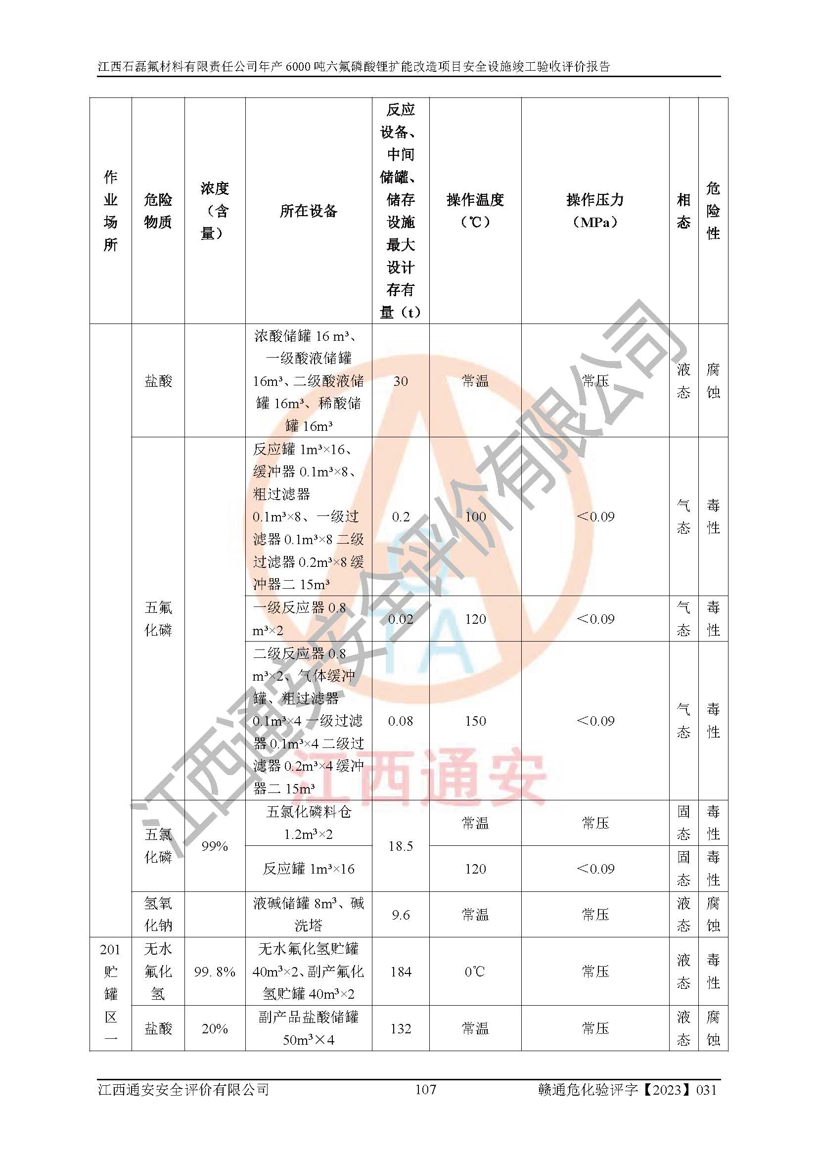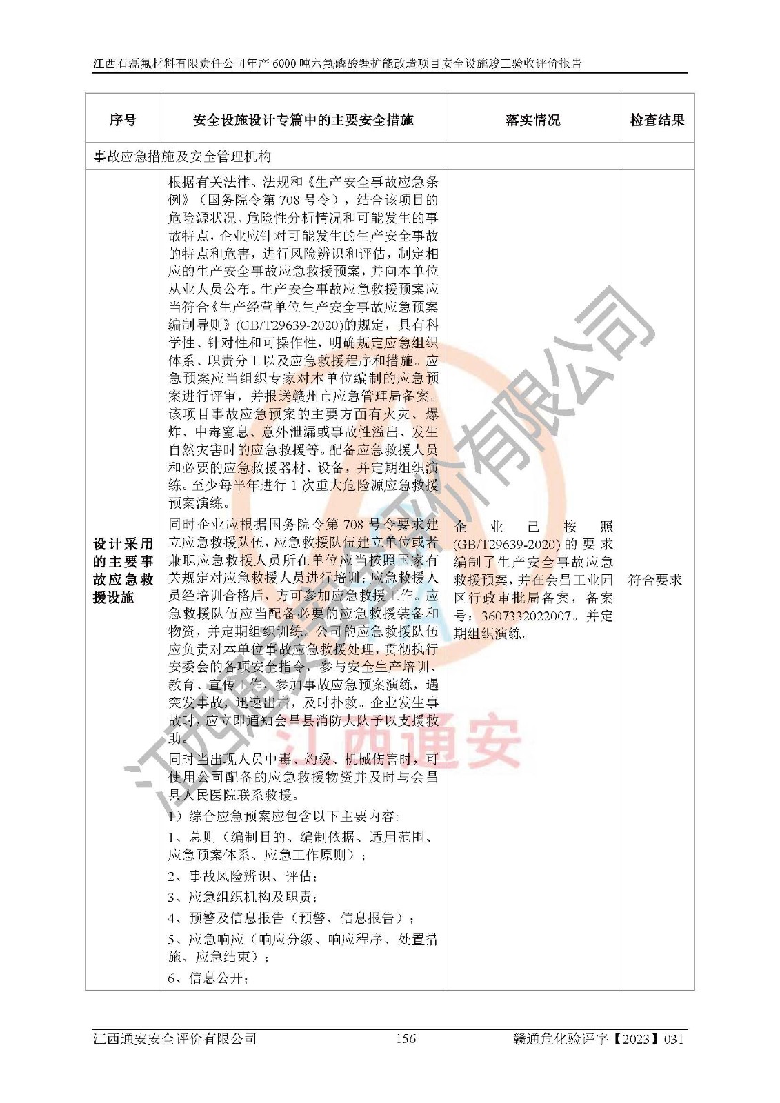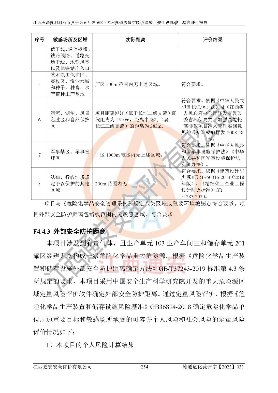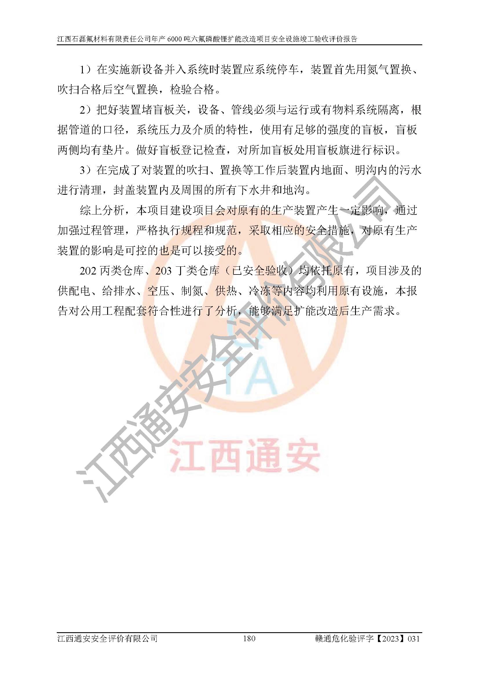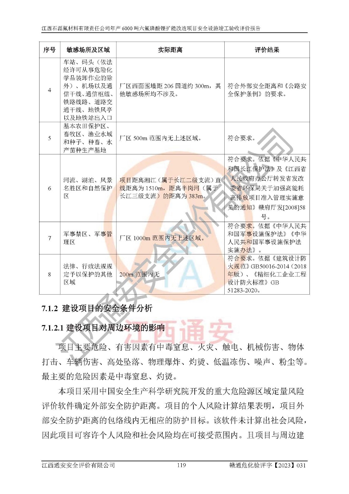 一、建设项目所在地的安全条件和与周边的安全防护距离 (1)该项目位于江西省赣州市会昌县氟盐化工产业基地,属于认定的化工园区,厂址选择合理,该项目与周边环境的防火间距符合规范的要求。 (2)重大危险源与“八类敏感场所及区域”的距离符合相关法律、法规的规定。 (3)该项目103生产车间三和201罐区一均构成**重大危险源。根据《危险化学品生产装置和储存设施外部安全防护距离确定方法》(GB/T 37243-2019)和《危险化学品生产装置和储存设施风险基准》(GB 36894-2018),该项目高敏感防护目标、重要防护目标、一般防护目标中的一类防护目标(<3×10-7)的外部安全防护距离包络线距离厂界*大值为76.36m,个人风险等值线范围内未出现该类防护目标;一般防护目标中的二类防护目标(<3×10-6)的外部安全防护距离包络线距离厂界*大值为51.62m,个人风险等值线范围内未涉及相应的防护目标;一般防护目标中的三类防护目标(<1×10-5)外部安全防护距离的包络线未出厂界。项目外部安全防护距离内无相应的防护目标,该项目不存在社会风险。 (4)该项目投产后在正常生产情况下,对其周边单位的生产、经营活动和居民的生活影响很小。在发生事故的情况下对周边单位的生产、经营活动和居民的生活存在影响。该项目周边单位的生产、经营活动和居民的生活对该项目投产后的正常生产影响很小。该项目所在地自然条件(不包括地震等破坏力**的自然灾害)的变化对该项目投产后的正常生产没有影响。 二、建设项目安全设施设计的采纳情况和已采用(取)的安全设施水平 该项目采用的主要安全设施包括了以下方面:检测、报警设施,设备安全防护设施,作业场所防护设施,安全警示标志,泄压和止逆设施,紧急处理设施,防止火灾蔓延设施,灭火设施,紧急个人处置设施,应急救援设施,劳动防护用品和装备等。 该项目在建设过程中采纳了《安全设施设计专篇》中的有关安全措施建议及要求,针对性的采取了相应的预防和控制措施,建设中未落实的安全措施,在试生产中已进行了整改。试生产表明该项目所采取的安全控制措施安全**,主要生产装置、设备运行平稳,安全可靠,安全水平较高,能够满足安全生产条件。 三、建设项目试生产(使用)后具备**现行有关安全生产法律、法规和部门规章及标准规定和要求的安全生产条件 1)法律法规等方面的符合性:该项目按照建设项目“三同时”要求,项目进行了备案、通过了安全条件审查、安全设施设计审查、试生产方案审查,立项审批手续齐全,安全设施设计、建设施工、施工监理均由有资质的单位承担,项目建设符合法律、法规规定的审批、施工、监理手续。项目建设期间,公司结合生产需要,增设了部分辅助设施和工艺管线,属于一般变更,试生产期间公司已委托河北英科石化工程有限公司进行了设计变更,作为已经审查通过的安全设施设计专篇的补充文件。 2)该项目与周边建构筑物的防火距离符合《精细化工企业工程设计防火标准》《建筑设计防火规范》的要求。根据《危险化学品生产装置和储存设施风险基准》GB36894-2018确定危险化学品单位周边重要目标和敏感场所承受的可容许个人风险和社会风险的定量风险评价。项目的个人风险计算结果表明,项目外部安全防护距离的包络线内无相应的防护目标。该软件未计算出社会风险。因此项目可容许个人风险和社会风险均在可接受范围内。 3)平面布置及常规防护设施措施的合理性:该项目生产场所、办公场所之间的间距满足安全要求,建筑结构、防火分区、防雷设施、安全出口的设置等满足安全生产的要求。消防道路的净宽度、净**、转弯半径均满足运输**及消防**通行。设置的常规防护设施、防止机械伤害、防急性中毒窒息的设施和措施符合要求。 4)设施、设备、装置及工艺方面的安全性:无**明令淘汰的工艺和 设备,该项目不涉及爆炸性危险区域划分。生产工艺操作和设置的安全设施满足安全需要,生产设施的布置能**人员疏散安全及操作方便。设施、设备、装置及工艺方面安全可靠。 5)特种设备、强制检测设备设施监督检验情况:该项目特种设备均进行了检验检测,并取得了检验报告;安全阀、压力表、有毒气体探头也进行了校验,校验结论合格,特种设备及安全附件符合《特种设备安全监察条例》 等相关法律法规、条例的规定。 6)公用工程、辅助设施的配套性:为该项目生产配套的供水、供电、 供气、供热等满足需要。 7)人员管理及安全培训方面充分性:公司现已建立了安全管理机构, 配备了专职安全管理人员。主要负责人王成具备化学工程与工艺专业本科学历,分管生产负责人曾中山具备化学工程与工艺专业本科学历,分管设备和技术负责人刘辉涛具备应用化学专业本科学历。专职安全管理人员共4人,配有一名注册安全工程师,专职安全管理人员均具有大专以上化工及安全专业相关学历。重点监管化工工艺的生产装置、储存设施操作人员具备高中及以上学历或化工类中等及以上职业教育水平。该公司制定了较完善的安全管理制度、岗位责任制、安全操作规程,制度执行情况较好。该公司已为从业职工交纳了工伤**。该公司对操作员工进行相关的培训和教育,经培训合格后上岗。 8)应急救援**性:企业根据自身实际情况,将该项目按照《生产经 营单位生产安全事故