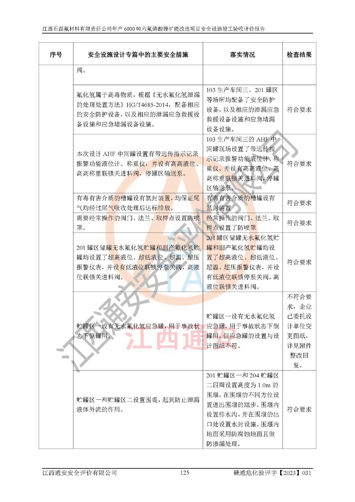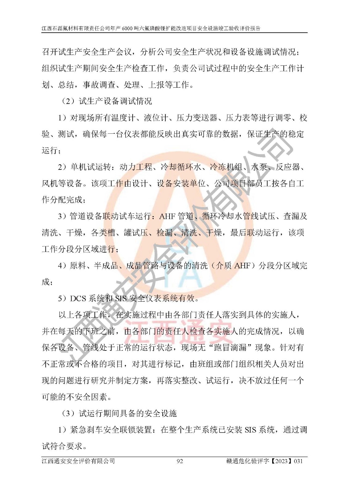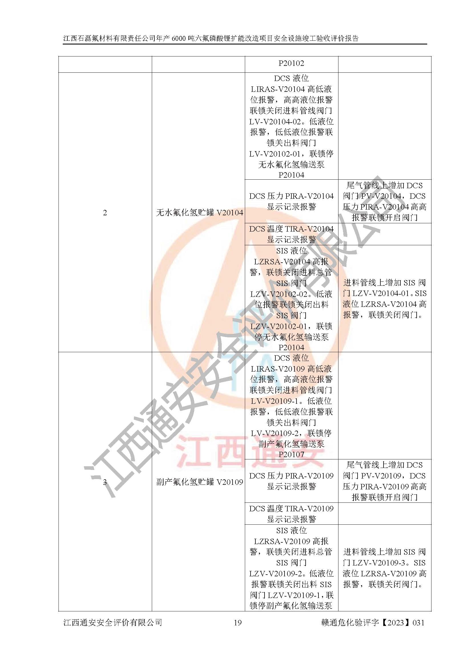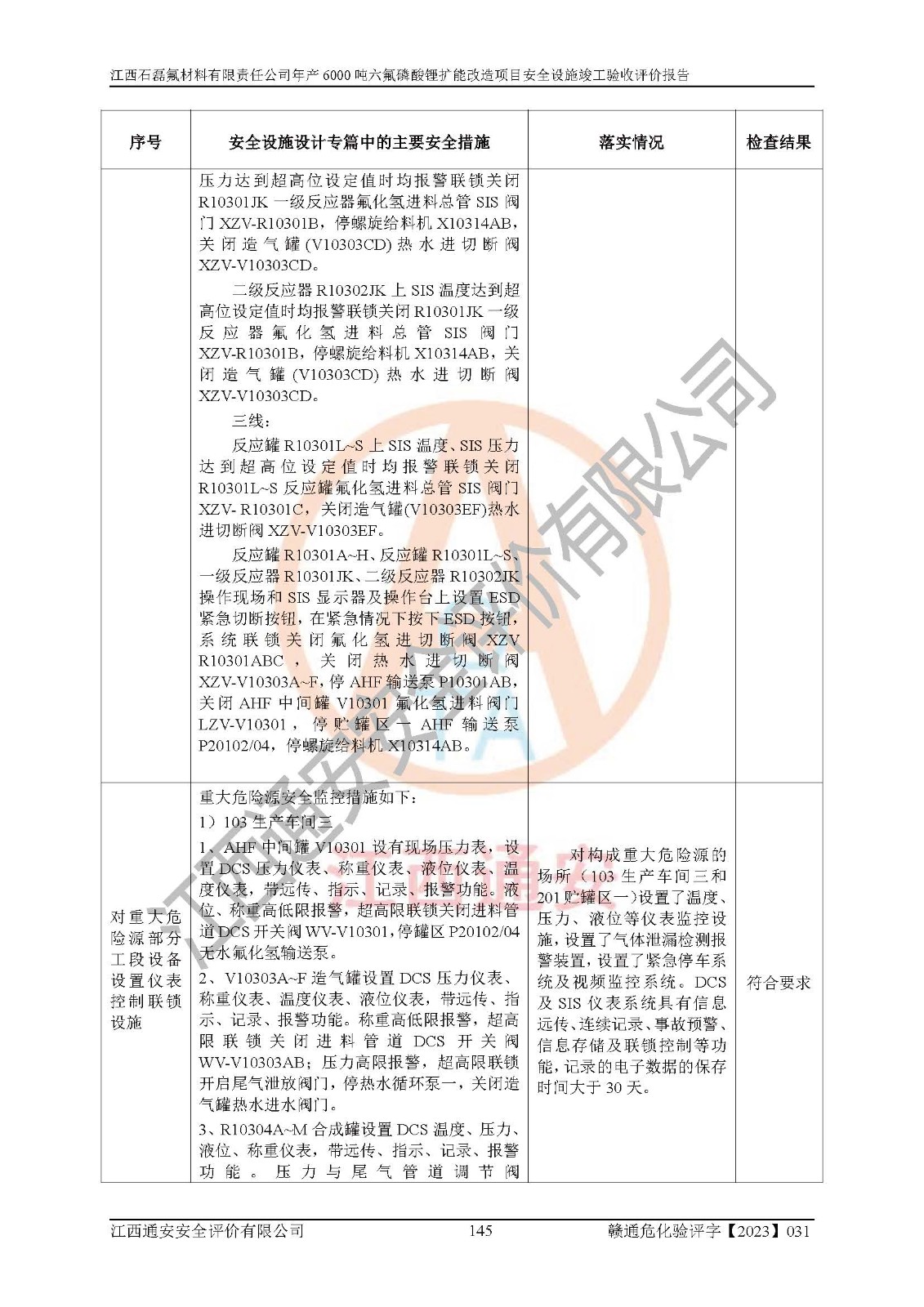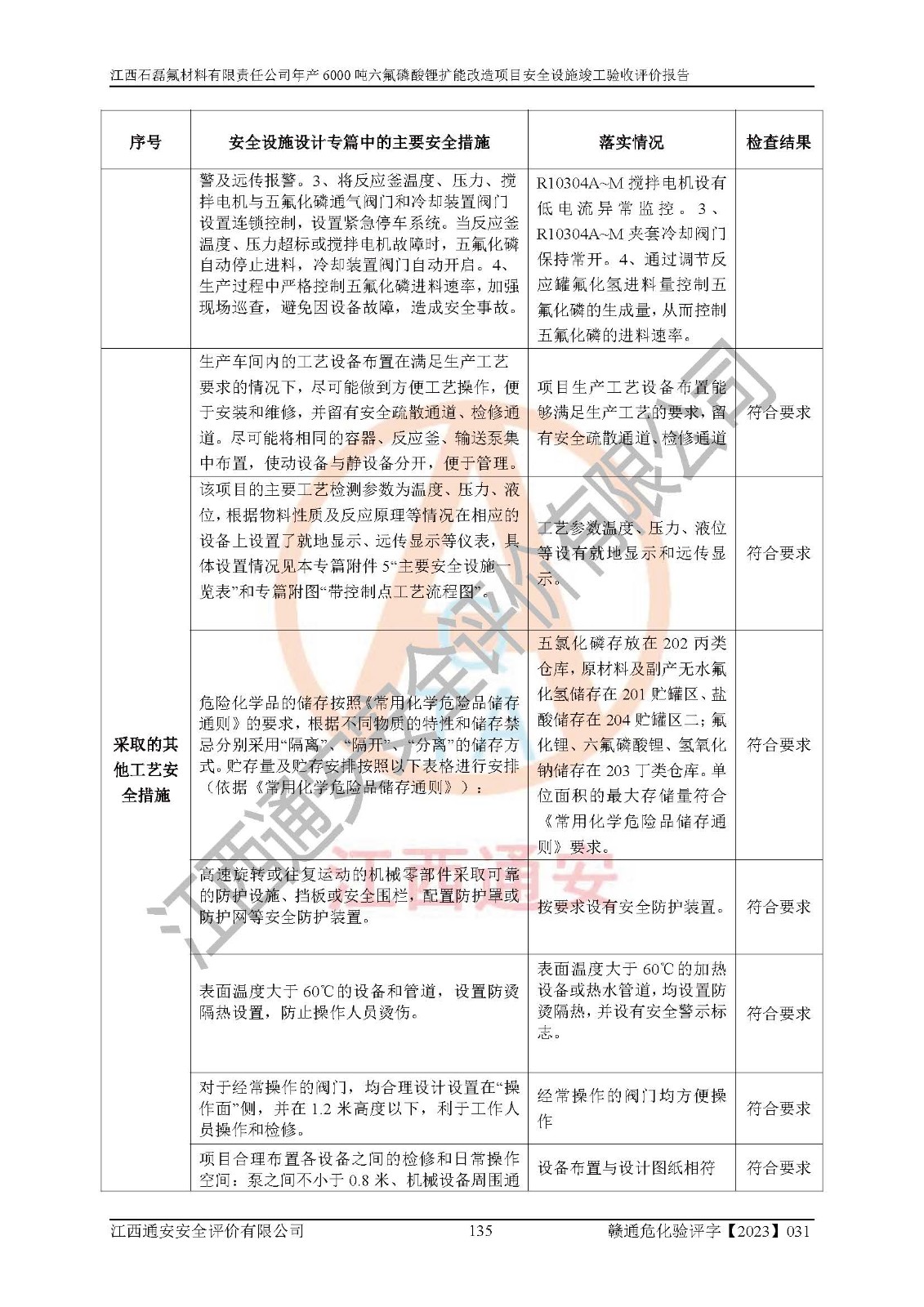 一、建设项目所在地的安全条件和与周边的安全防护距离 (1)该项目位于江西省赣州市会昌县氟盐化工产业基地,属于认定的化工园区,厂址选择合理,该项目与周边环境的防火间距符合规范的要求。 (2)重大危险源与“八类敏感场所及区域”的距离符合相关法律、法规的规定。 (3)该项目103生产车间三和201罐区一均构成**重大危险源。根据《危险化学品生产装置和储存设施外部安全防护距离确定方法》(GB/T 37243-2019)和《危险化学品生产装置和储存设施风险基准》(GB 36894-2018),该项目高敏感防护目标、重要防护目标、一般防护目标中的一类防护目标(<3×10-7)的外部安全防护距离包络线距离厂界*大值为76.36m,个人风险等值线范围内未出现该类防护目标;一般防护目标中的二类防护目标(<3×10-6)的外部安全防护距离包络线距离厂界*大值为51.62m,个人风险等值线范围内未涉及相应的防护目标;一般防护目标中的三类防护目标(<1×10-5)外部安全防护距离的包络线未出厂界。项目外部安全防护距离内无相应的防护目标,该项目不存在社会风险。 (4)该项目投产后在正常生产情况下,对其周边单位的生产、经营活动和居民的生活影响很小。在发生事故的情况下对周边单位的生产、经营活动和居民的生活存在影响。该项目周边单位的生产、经营活动和居民的生活对该项目投产后的正常生产影响很小。该项目所在地自然条件(不包括地震等破坏力**的自然灾害)的变化对该项目投产后的正常生产没有影响。 二、建设项目安全设施设计的采纳情况和已采用(取)的安全设施水平 该项目采用的主要安全设施包括了以下方面:检测、报警设施,设备安全防护设施,作业场所防护设施,安全警示标志,泄压和止逆设施,紧急处理设施,防止火灾蔓延设施,灭火设施,紧急个人处置设施,应急救援设施,劳动防护用品和装备等。 该项目在建设过程中采纳了《安全设施设计专篇》中的有关安全措施建议及要求,针对性的采取了相应的预防和控制措施,建设中未落实的安全措施,在试生产中已进行了整改。试生产表明该项目所采取的安全控制措施安全**,主要生产装置、设备运行平稳,安全可靠,安全水平较高,能够满足安全生产条件。 三、建设项目试生产(使用)后具备**现行有关安全生产法律、法规和部门规章及标准规定和要求的安全生产条件 1)法律法规等方面的符合性:该项目按照建设项目“三同时”要求,项目进行了备案、通过了安全条件审查、安全设施设计审查、试生产方案审查,立项审批手续齐全,安全设施设计、建设施工、施工监理均由有资质的单位承担,项目建设符合法律、法规规定的审批、施工、监理手续。项目建设期间,公司结合生产需要,增设了部分辅助设施和工艺管线,属于一般变更,试生产期间公司已委托河北英科石化工程有限公司进行了设计变更,作为已经审查通过的安全设施设计专篇的补充文件。 2)该项目与周边建构筑物的防火距离符合《精细化工企业工程设计防火标准》《建筑设计防火规范》的要求。根据《危险化学品生产装置和储存设施风险基准》GB36894-2018确定危险化学品单位周边重要目标和敏感场所承受的可容许个人风险和社会风险的定量风险评价。项目的个人风险计算结果表明,项目外部安全防护距离的包络线内无相应的防护目标。该软件未计算出社会风险。因此项目可容许个人风险和社会风险均在可接受范围内。 3)平面布置及常规防护设施措施的合理性:该项目生产场所、办公场所之间的间距满足安全要求,建筑结构、防火分区、防雷设施、安全出口的设置等满足安全生产的要求。消防道路的净宽度、净**、转弯半径均满足运输**及消防**通行。设置的常规防护设施、防止机械伤害、防急性中毒窒息的设施和措施符合要求。 4)设施、设备、装置及工艺方面的安全性:无**明令淘汰的工艺和 设备,该项目不涉及爆炸性危险区域划分。生产工艺操作和设置的安全设施满足安全需要,生产设施的布置能**人员疏散安全及操作方便。设施、设备、装置及工艺方面安全可靠。 5)特种设备、强制检测设备设施监督检验情况:该项目特种设备均进行了检验检测,并取得了检验报告;安全阀、压力表、有毒气体探头也进行了校验,校验结论合格,特种设备及安全附件符合《特种设备安全监察条例》 等相关法律法规、条例的规定。 6)公用工程、辅助设施的配套性:为该项目生产配套的供水、供电、 供气、供热等满足需要。 7)人员管理及安全培训方面充分性:公司现已建立了安全管理机构, 配备了专职安全管理人员。主要负责人王成具备化学工程与工艺专业本科学历,分管生产负责人曾中山具备化学工程与工艺专业本科学历,分管设备和技术负责人刘辉涛具备应用化学专业本科学历。专职安全管理人员共4人,配有一名注册安全工程师,专职安全管理人员均具有大专以上化工及安全专业相关学历。重点监管化工工艺的生产装置、储存设施操作人员具备高中及以上学历或化工类中等及以上职业教育水平。该公司制定了较完善的安全管理制度、岗位责任制、安全操作规程,制度执行情况较好。该公司已为从业职工交纳了工伤**。该公司对操作员工进行相关的培训和教育,经培训合格后上岗。 8)应急救援**性:企业根据自身实际情况,将该项目按照《生产经 营单位生产安全事故