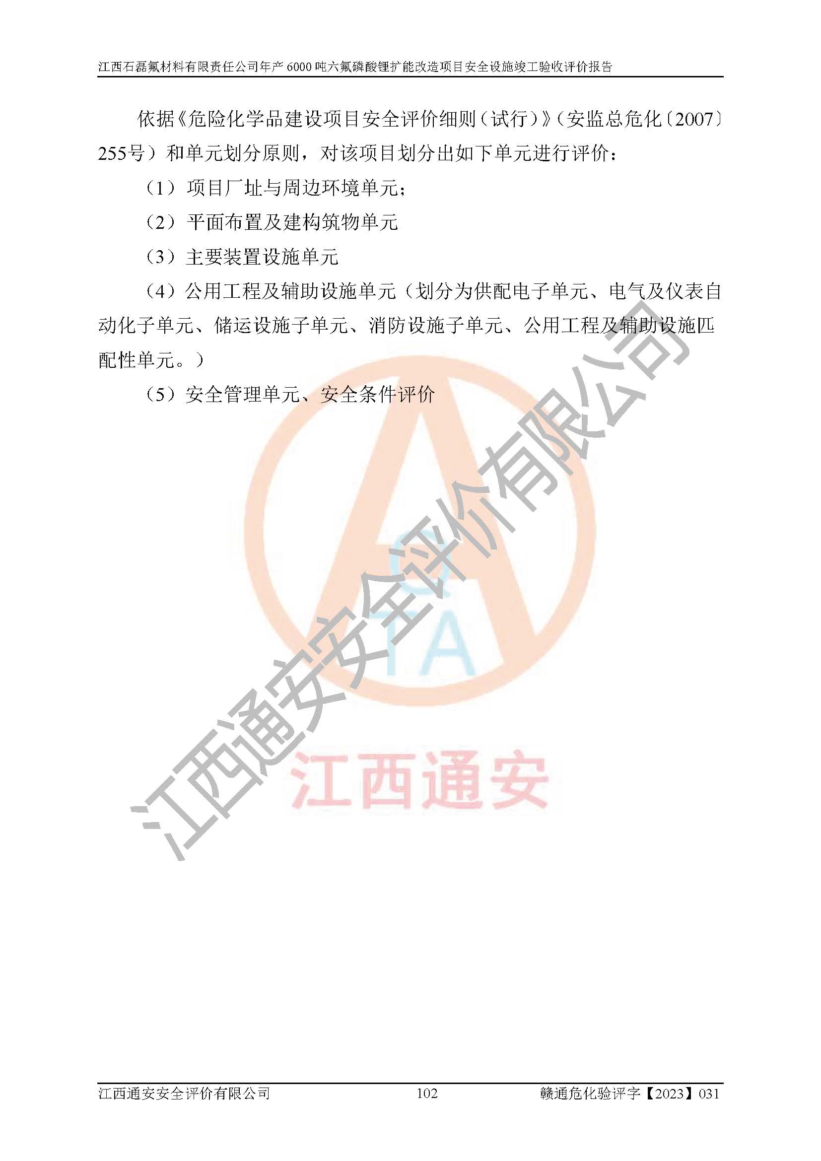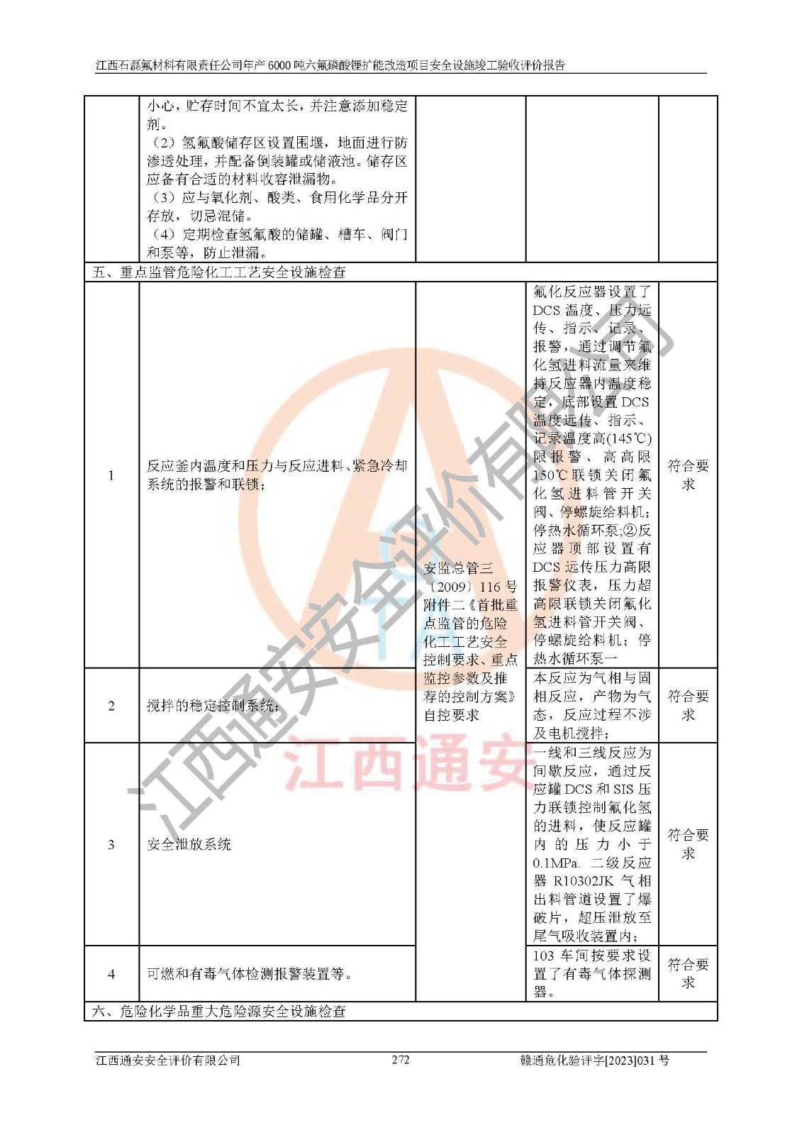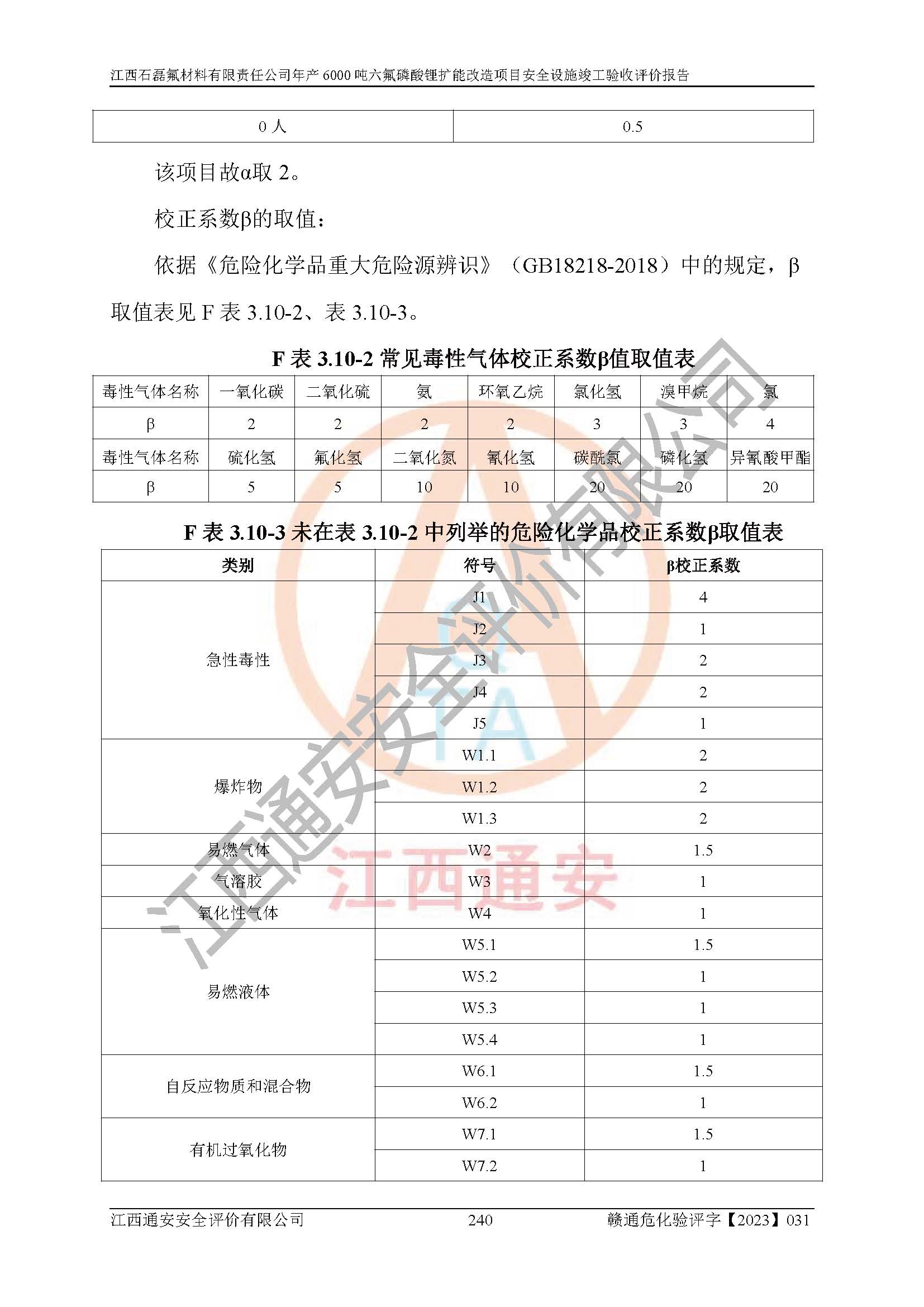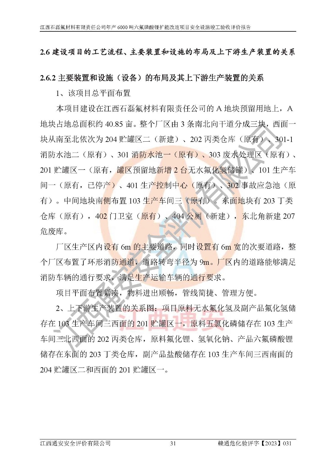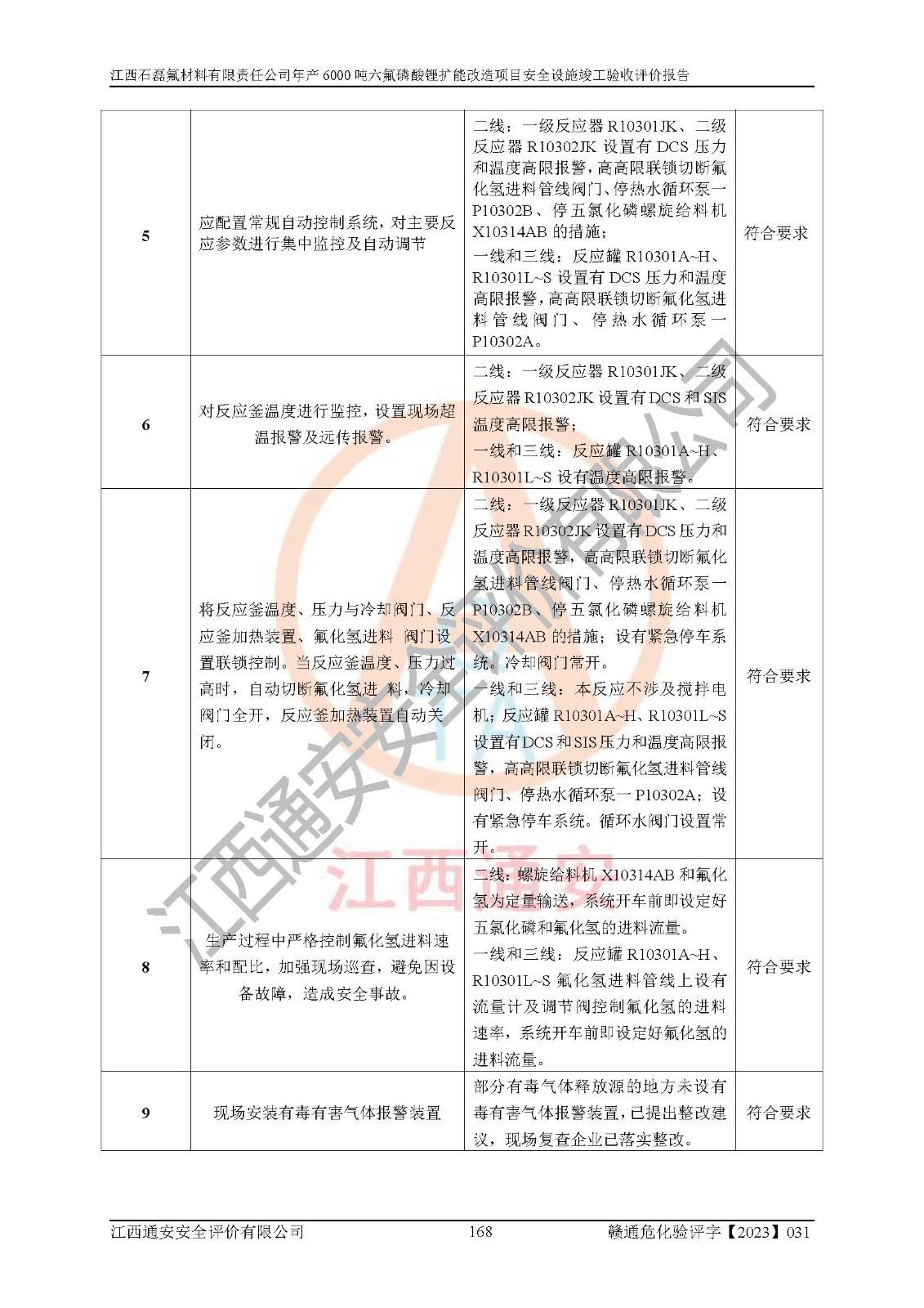 一、建设项目所在地的安全条件和与周边的安全防护距离 (1)该项目位于江西省赣州市会昌县氟盐化工产业基地,属于认定的化工园区,厂址选择合理,该项目与周边环境的防火间距符合规范的要求。 (2)重大危险源与“八类敏感场所及区域”的距离符合相关法律、法规的规定。 (3)该项目103生产车间三和201罐区一均构成**重大危险源。根据《危险化学品生产装置和储存设施外部安全防护距离确定方法》(GB/T 37243-2019)和《危险化学品生产装置和储存设施风险基准》(GB 36894-2018),该项目高敏感防护目标、重要防护目标、一般防护目标中的一类防护目标(<3×10-7)的外部安全防护距离包络线距离厂界*大值为76.36m,个人风险等值线范围内未出现该类防护目标;一般防护目标中的二类防护目标(<3×10-6)的外部安全防护距离包络线距离厂界*大值为51.62m,个人风险等值线范围内未涉及相应的防护目标;一般防护目标中的三类防护目标(<1×10-5)外部安全防护距离的包络线未出厂界。项目外部安全防护距离内无相应的防护目标,该项目不存在社会风险。 (4)该项目投产后在正常生产情况下,对其周边单位的生产、经营活动和居民的生活影响很小。在发生事故的情况下对周边单位的生产、经营活动和居民的生活存在影响。该项目周边单位的生产、经营活动和居民的生活对该项目投产后的正常生产影响很小。该项目所在地自然条件(不包括地震等破坏力**的自然灾害)的变化对该项目投产后的正常生产没有影响。 二、建设项目安全设施设计的采纳情况和已采用(取)的安全设施水平 该项目采用的主要安全设施包括了以下方面:检测、报警设施,设备安全防护设施,作业场所防护设施,安全警示标志,泄压和止逆设施,紧急处理设施,防止火灾蔓延设施,灭火设施,紧急个人处置设施,应急救援设施,劳动防护用品和装备等。 该项目在建设过程中采纳了《安全设施设计专篇》中的有关安全措施建议及要求,针对性的采取了相应的预防和控制措施,建设中未落实的安全措施,在试生产中已进行了整改。试生产表明该项目所采取的安全控制措施安全**,主要生产装置、设备运行平稳,安全可靠,安全水平较高,能够满足安全生产条件。 三、建设项目试生产(使用)后具备**现行有关安全生产法律、法规和部门规章及标准规定和要求的安全生产条件 1)法律法规等方面的符合性:该项目按照建设项目“三同时”要求,项目进行了备案、通过了安全条件审查、安全设施设计审查、试生产方案审查,立项审批手续齐全,安全设施设计、建设施工、施工监理均由有资质的单位承担,项目建设符合法律、法规规定的审批、施工、监理手续。项目建设期间,公司结合生产需要,增设了部分辅助设施和工艺管线,属于一般变更,试生产期间公司已委托河北英科石化工程有限公司进行了设计变更,作为已经审查通过的安全设施设计专篇的补充文件。 2)该项目与周边建构筑物的防火距离符合《精细化工企业工程设计防火标准》《建筑设计防火规范》的要求。根据《危险化学品生产装置和储存设施风险基准》GB36894-2018确定危险化学品单位周边重要目标和敏感场所承受的可容许个人风险和社会风险的定量风险评价。项目的个人风险计算结果表明,项目外部安全防护距离的包络线内无相应的防护目标。该软件未计算出社会风险。因此项目可容许个人风险和社会风险均在可接受范围内。 3)平面布置及常规防护设施措施的合理性:该项目生产场所、办公场所之间的间距满足安全要求,建筑结构、防火分区、防雷设施、安全出口的设置等满足安全生产的要求。消防道路的净宽度、净**、转弯半径均满足运输**及消防**通行。设置的常规防护设施、防止机械伤害、防急性中毒窒息的设施和措施符合要求。 4)设施、设备、装置及工艺方面的安全性:无**明令淘汰的工艺和 设备,该项目不涉及爆炸性危险区域划分。生产工艺操作和设置的安全设施满足安全需要,生产设施的布置能**人员疏散安全及操作方便。设施、设备、装置及工艺方面安全可靠。 5)特种设备、强制检测设备设施监督检验情况:该项目特种设备均进行了检验检测,并取得了检验报告;安全阀、压力表、有毒气体探头也进行了校验,校验结论合格,特种设备及安全附件符合《特种设备安全监察条例》 等相关法律法规、条例的规定。 6)公用工程、辅助设施的配套性:为该项目生产配套的供水、供电、 供气、供热等满足需要。 7)人员管理及安全培训方面充分性:公司现已建立了安全管理机构, 配备了专职安全管理人员。主要负责人王成具备化学工程与工艺专业本科学历,分管生产负责人曾中山具备化学工程与工艺专业本科学历,分管设备和技术负责人刘辉涛具备应用化学专业本科学历。专职安全管理人员共4人,配有一名注册安全工程师,专职安全管理人员均具有大专以上化工及安全专业相关学历。重点监管化工工艺的生产装置、储存设施操作人员具备高中及以上学历或化工类中等及以上职业教育水平。该公司制定了较完善的安全管理制度、岗位责任制、安全操作规程,制度执行情况较好。该公司已为从业职工交纳了工伤**。该公司对操作员工进行相关的培训和教育,经培训合格后上岗。 8)应急救援**性:企业根据自身实际情况,将该项目按照《生产经 营单位生产安全事故