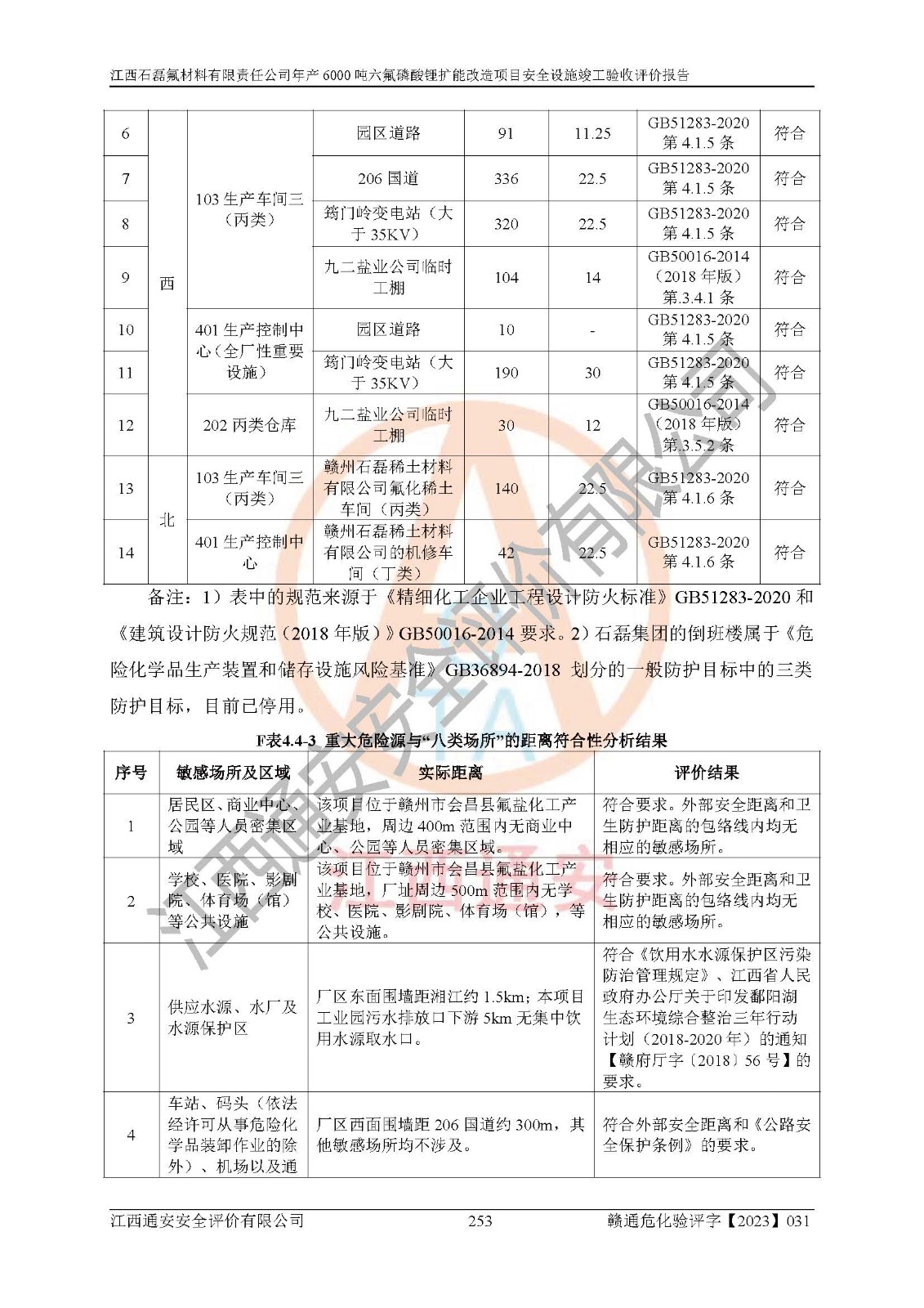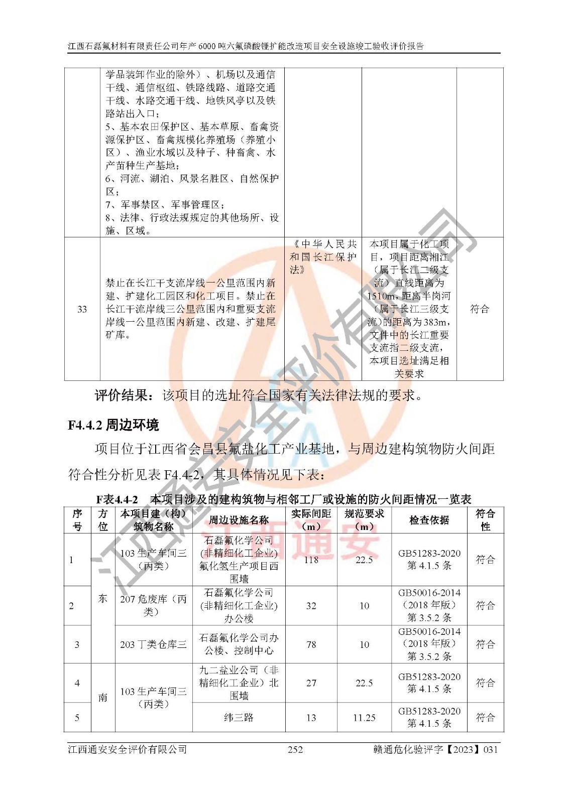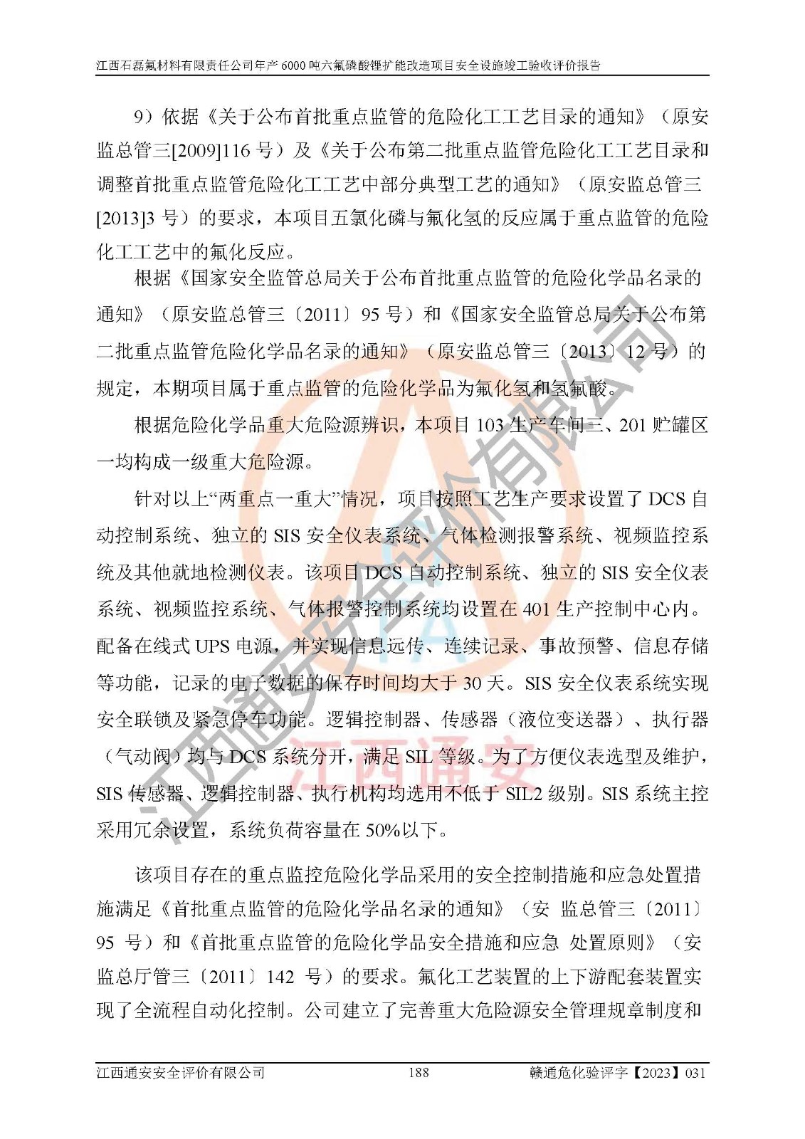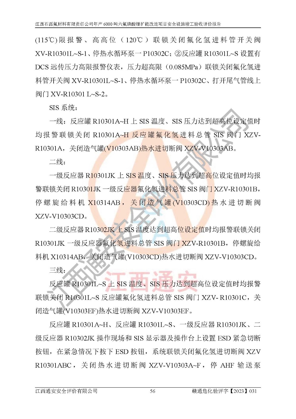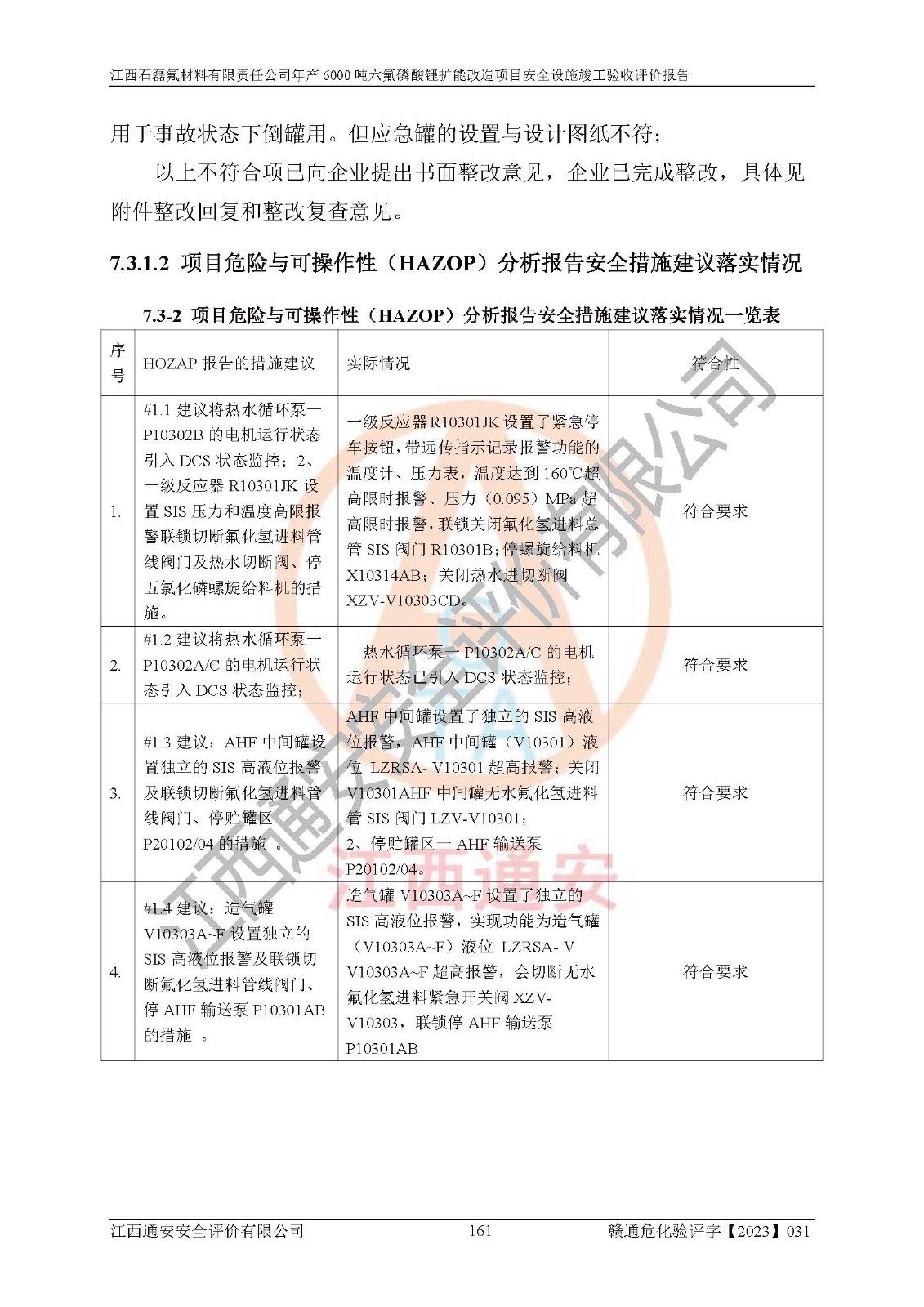 一、建设项目所在地的安全条件和与周边的安全防护距离 (1)该项目位于江西省赣州市会昌县氟盐化工产业基地,属于认定的化工园区,厂址选择合理,该项目与周边环境的防火间距符合规范的要求。 (2)重大危险源与“八类敏感场所及区域”的距离符合相关法律、法规的规定。 (3)该项目103生产车间三和201罐区一均构成**重大危险源。根据《危险化学品生产装置和储存设施外部安全防护距离确定方法》(GB/T 37243-2019)和《危险化学品生产装置和储存设施风险基准》(GB 36894-2018),该项目高敏感防护目标、重要防护目标、一般防护目标中的一类防护目标(<3×10-7)的外部安全防护距离包络线距离厂界*大值为76.36m,个人风险等值线范围内未出现该类防护目标;一般防护目标中的二类防护目标(<3×10-6)的外部安全防护距离包络线距离厂界*大值为51.62m,个人风险等值线范围内未涉及相应的防护目标;一般防护目标中的三类防护目标(<1×10-5)外部安全防护距离的包络线未出厂界。项目外部安全防护距离内无相应的防护目标,该项目不存在社会风险。 (4)该项目投产后在正常生产情况下,对其周边单位的生产、经营活动和居民的生活影响很小。在发生事故的情况下对周边单位的生产、经营活动和居民的生活存在影响。该项目周边单位的生产、经营活动和居民的生活对该项目投产后的正常生产影响很小。该项目所在地自然条件(不包括地震等破坏力**的自然灾害)的变化对该项目投产后的正常生产没有影响。 二、建设项目安全设施设计的采纳情况和已采用(取)的安全设施水平 该项目采用的主要安全设施包括了以下方面:检测、报警设施,设备安全防护设施,作业场所防护设施,安全警示标志,泄压和止逆设施,紧急处理设施,防止火灾蔓延设施,灭火设施,紧急个人处置设施,应急救援设施,劳动防护用品和装备等。 该项目在建设过程中采纳了《安全设施设计专篇》中的有关安全措施建议及要求,针对性的采取了相应的预防和控制措施,建设中未落实的安全措施,在试生产中已进行了整改。试生产表明该项目所采取的安全控制措施安全**,主要生产装置、设备运行平稳,安全可靠,安全水平较高,能够满足安全生产条件。 三、建设项目试生产(使用)后具备**现行有关安全生产法律、法规和部门规章及标准规定和要求的安全生产条件 1)法律法规等方面的符合性:该项目按照建设项目“三同时”要求,项目进行了备案、通过了安全条件审查、安全设施设计审查、试生产方案审查,立项审批手续齐全,安全设施设计、建设施工、施工监理均由有资质的单位承担,项目建设符合法律、法规规定的审批、施工、监理手续。项目建设期间,公司结合生产需要,增设了部分辅助设施和工艺管线,属于一般变更,试生产期间公司已委托河北英科石化工程有限公司进行了设计变更,作为已经审查通过的安全设施设计专篇的补充文件。 2)该项目与周边建构筑物的防火距离符合《精细化工企业工程设计防火标准》《建筑设计防火规范》的要求。根据《危险化学品生产装置和储存设施风险基准》GB36894-2018确定危险化学品单位周边重要目标和敏感场所承受的可容许个人风险和社会风险的定量风险评价。项目的个人风险计算结果表明,项目外部安全防护距离的包络线内无相应的防护目标。该软件未计算出社会风险。因此项目可容许个人风险和社会风险均在可接受范围内。 3)平面布置及常规防护设施措施的合理性:该项目生产场所、办公场所之间的间距满足安全要求,建筑结构、防火分区、防雷设施、安全出口的设置等满足安全生产的要求。消防道路的净宽度、净**、转弯半径均满足运输**及消防**通行。设置的常规防护设施、防止机械伤害、防急性中毒窒息的设施和措施符合要求。 4)设施、设备、装置及工艺方面的安全性:无**明令淘汰的工艺和 设备,该项目不涉及爆炸性危险区域划分。生产工艺操作和设置的安全设施满足安全需要,生产设施的布置能**人员疏散安全及操作方便。设施、设备、装置及工艺方面安全可靠。 5)特种设备、强制检测设备设施监督检验情况:该项目特种设备均进行了检验检测,并取得了检验报告;安全阀、压力表、有毒气体探头也进行了校验,校验结论合格,特种设备及安全附件符合《特种设备安全监察条例》 等相关法律法规、条例的规定。 6)公用工程、辅助设施的配套性:为该项目生产配套的供水、供电、 供气、供热等满足需要。 7)人员管理及安全培训方面充分性:公司现已建立了安全管理机构, 配备了专职安全管理人员。主要负责人王成具备化学工程与工艺专业本科学历,分管生产负责人曾中山具备化学工程与工艺专业本科学历,分管设备和技术负责人刘辉涛具备应用化学专业本科学历。专职安全管理人员共4人,配有一名注册安全工程师,专职安全管理人员均具有大专以上化工及安全专业相关学历。重点监管化工工艺的生产装置、储存设施操作人员具备高中及以上学历或化工类中等及以上职业教育水平。该公司制定了较完善的安全管理制度、岗位责任制、安全操作规程,制度执行情况较好。该公司已为从业职工交纳了工伤**。该公司对操作员工进行相关的培训和教育,经培训合格后上岗。 8)应急救援**性:企业根据自身实际情况,将该项目按照《生产经 营单位生产安全事故