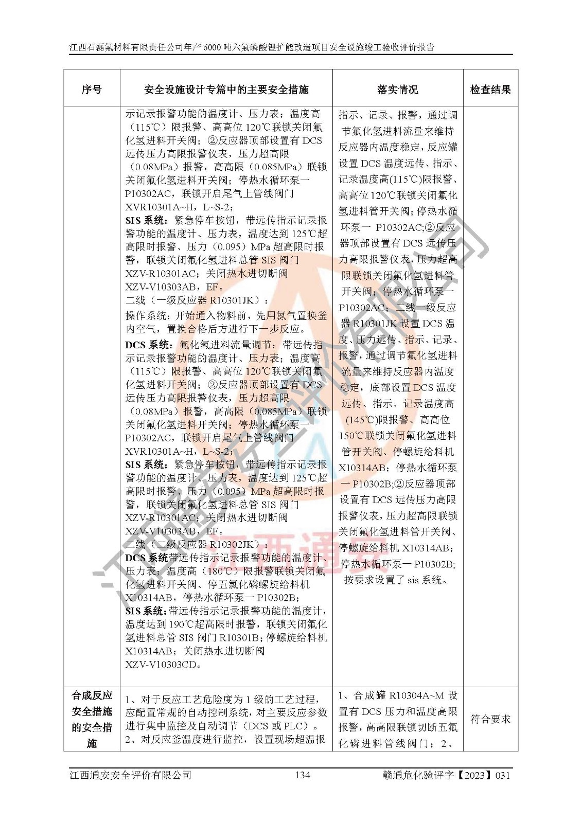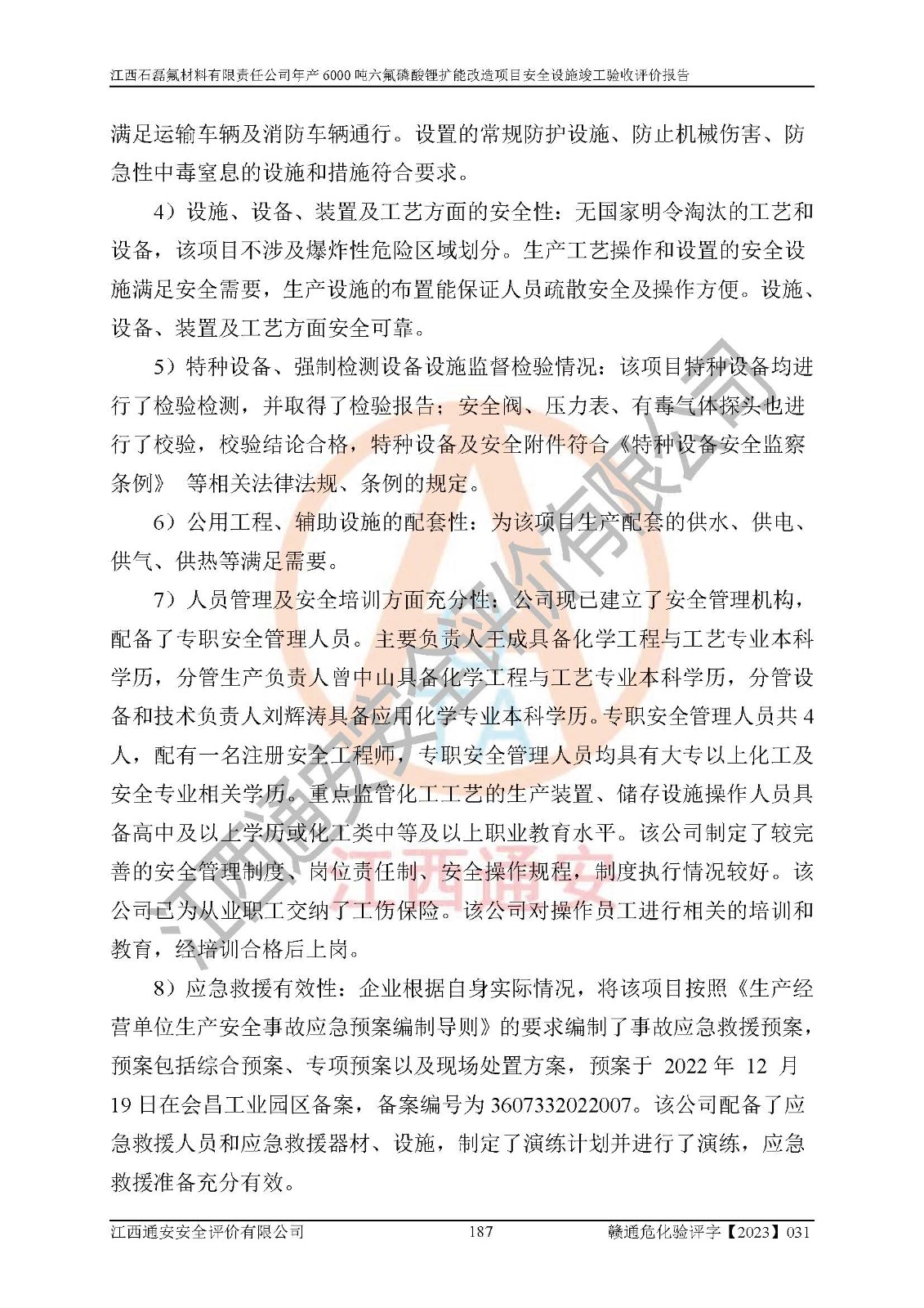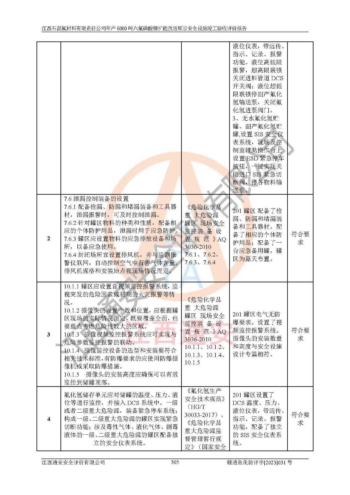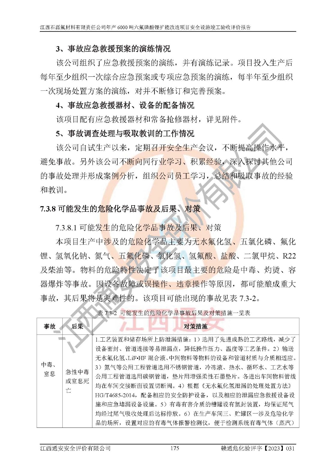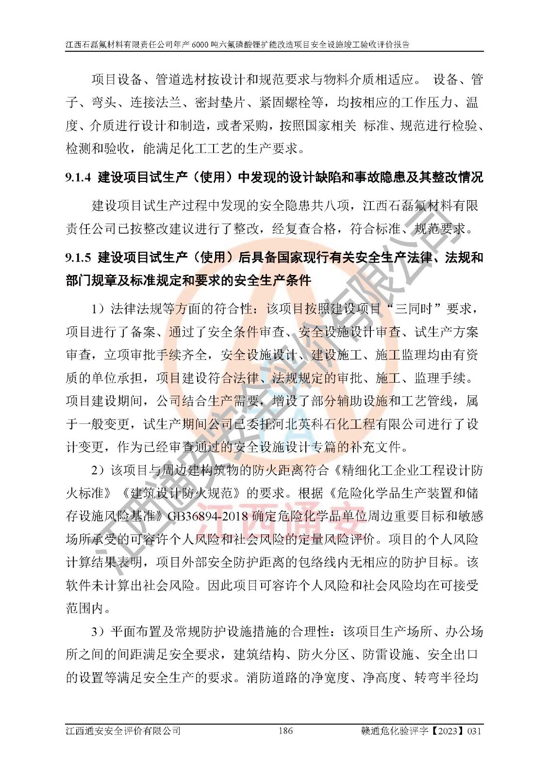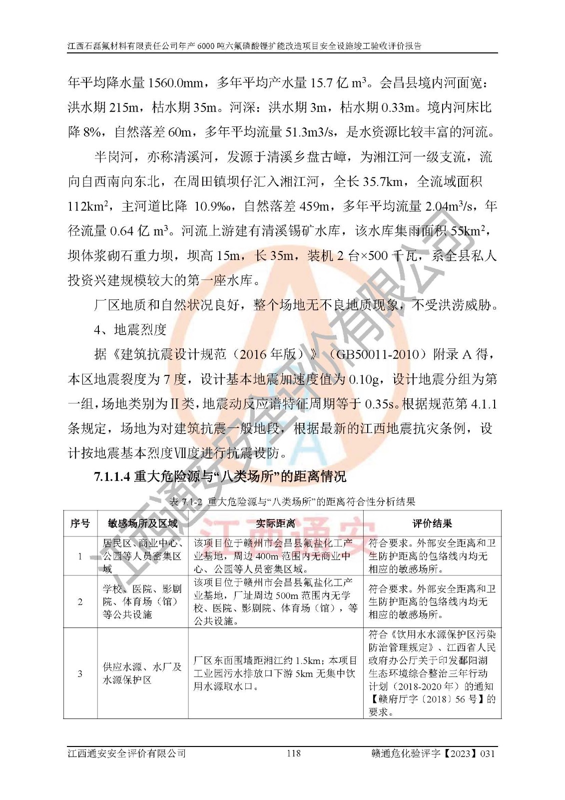 一、建设项目所在地的安全条件和与周边的安全防护距离 (1)该项目位于江西省赣州市会昌县氟盐化工产业基地,属于认定的化工园区,厂址选择合理,该项目与周边环境的防火间距符合规范的要求。 (2)重大危险源与“八类敏感场所及区域”的距离符合相关法律、法规的规定。 (3)该项目103生产车间三和201罐区一均构成**重大危险源。根据《危险化学品生产装置和储存设施外部安全防护距离确定方法》(GB/T 37243-2019)和《危险化学品生产装置和储存设施风险基准》(GB 36894-2018),该项目高敏感防护目标、重要防护目标、一般防护目标中的一类防护目标(<3×10-7)的外部安全防护距离包络线距离厂界*大值为76.36m,个人风险等值线范围内未出现该类防护目标;一般防护目标中的二类防护目标(<3×10-6)的外部安全防护距离包络线距离厂界*大值为51.62m,个人风险等值线范围内未涉及相应的防护目标;一般防护目标中的三类防护目标(<1×10-5)外部安全防护距离的包络线未出厂界。项目外部安全防护距离内无相应的防护目标,该项目不存在社会风险。 (4)该项目投产后在正常生产情况下,对其周边单位的生产、经营活动和居民的生活影响很小。在发生事故的情况下对周边单位的生产、经营活动和居民的生活存在影响。该项目周边单位的生产、经营活动和居民的生活对该项目投产后的正常生产影响很小。该项目所在地自然条件(不包括地震等破坏力**的自然灾害)的变化对该项目投产后的正常生产没有影响。 二、建设项目安全设施设计的采纳情况和已采用(取)的安全设施水平 该项目采用的主要安全设施包括了以下方面:检测、报警设施,设备安全防护设施,作业场所防护设施,安全警示标志,泄压和止逆设施,紧急处理设施,防止火灾蔓延设施,灭火设施,紧急个人处置设施,应急救援设施,劳动防护用品和装备等。 该项目在建设过程中采纳了《安全设施设计专篇》中的有关安全措施建议及要求,针对性的采取了相应的预防和控制措施,建设中未落实的安全措施,在试生产中已进行了整改。试生产表明该项目所采取的安全控制措施安全**,主要生产装置、设备运行平稳,安全可靠,安全水平较高,能够满足安全生产条件。 三、建设项目试生产(使用)后具备**现行有关安全生产法律、法规和部门规章及标准规定和要求的安全生产条件 1)法律法规等方面的符合性:该项目按照建设项目“三同时”要求,项目进行了备案、通过了安全条件审查、安全设施设计审查、试生产方案审查,立项审批手续齐全,安全设施设计、建设施工、施工监理均由有资质的单位承担,项目建设符合法律、法规规定的审批、施工、监理手续。项目建设期间,公司结合生产需要,增设了部分辅助设施和工艺管线,属于一般变更,试生产期间公司已委托河北英科石化工程有限公司进行了设计变更,作为已经审查通过的安全设施设计专篇的补充文件。 2)该项目与周边建构筑物的防火距离符合《精细化工企业工程设计防火标准》《建筑设计防火规范》的要求。根据《危险化学品生产装置和储存设施风险基准》GB36894-2018确定危险化学品单位周边重要目标和敏感场所承受的可容许个人风险和社会风险的定量风险评价。项目的个人风险计算结果表明,项目外部安全防护距离的包络线内无相应的防护目标。该软件未计算出社会风险。因此项目可容许个人风险和社会风险均在可接受范围内。 3)平面布置及常规防护设施措施的合理性:该项目生产场所、办公场所之间的间距满足安全要求,建筑结构、防火分区、防雷设施、安全出口的设置等满足安全生产的要求。消防道路的净宽度、净**、转弯半径均满足运输**及消防**通行。设置的常规防护设施、防止机械伤害、防急性中毒窒息的设施和措施符合要求。 4)设施、设备、装置及工艺方面的安全性:无**明令淘汰的工艺和 设备,该项目不涉及爆炸性危险区域划分。生产工艺操作和设置的安全设施满足安全需要,生产设施的布置能**人员疏散安全及操作方便。设施、设备、装置及工艺方面安全可靠。 5)特种设备、强制检测设备设施监督检验情况:该项目特种设备均进行了检验检测,并取得了检验报告;安全阀、压力表、有毒气体探头也进行了校验,校验结论合格,特种设备及安全附件符合《特种设备安全监察条例》 等相关法律法规、条例的规定。 6)公用工程、辅助设施的配套性:为该项目生产配套的供水、供电、 供气、供热等满足需要。 7)人员管理及安全培训方面充分性:公司现已建立了安全管理机构, 配备了专职安全管理人员。主要负责人王成具备化学工程与工艺专业本科学历,分管生产负责人曾中山具备化学工程与工艺专业本科学历,分管设备和技术负责人刘辉涛具备应用化学专业本科学历。专职安全管理人员共4人,配有一名注册安全工程师,专职安全管理人员均具有大专以上化工及安全专业相关学历。重点监管化工工艺的生产装置、储存设施操作人员具备高中及以上学历或化工类中等及以上职业教育水平。该公司制定了较完善的安全管理制度、岗位责任制、安全操作规程,制度执行情况较好。该公司已为从业职工交纳了工伤**。该公司对操作员工进行相关的培训和教育,经培训合格后上岗。 8)应急救援**性:企业根据自身实际情况,将该项目按照《生产经 营单位生产安全事故