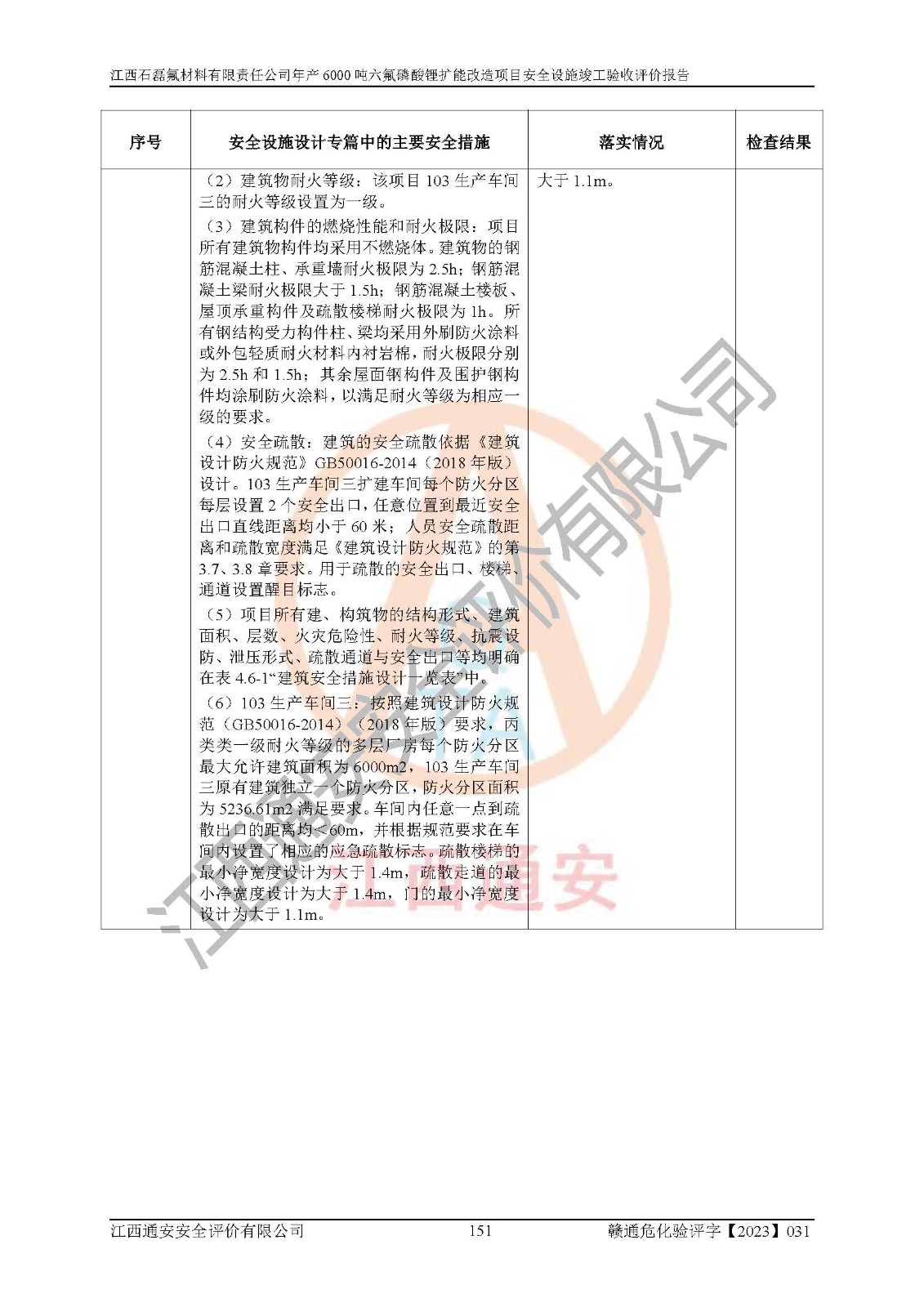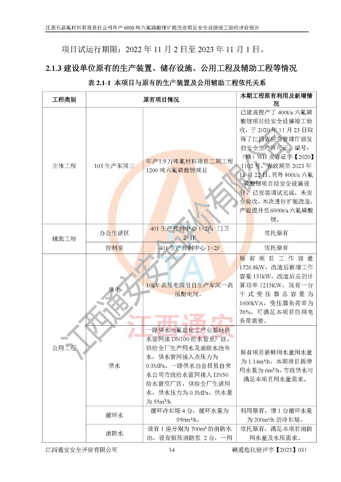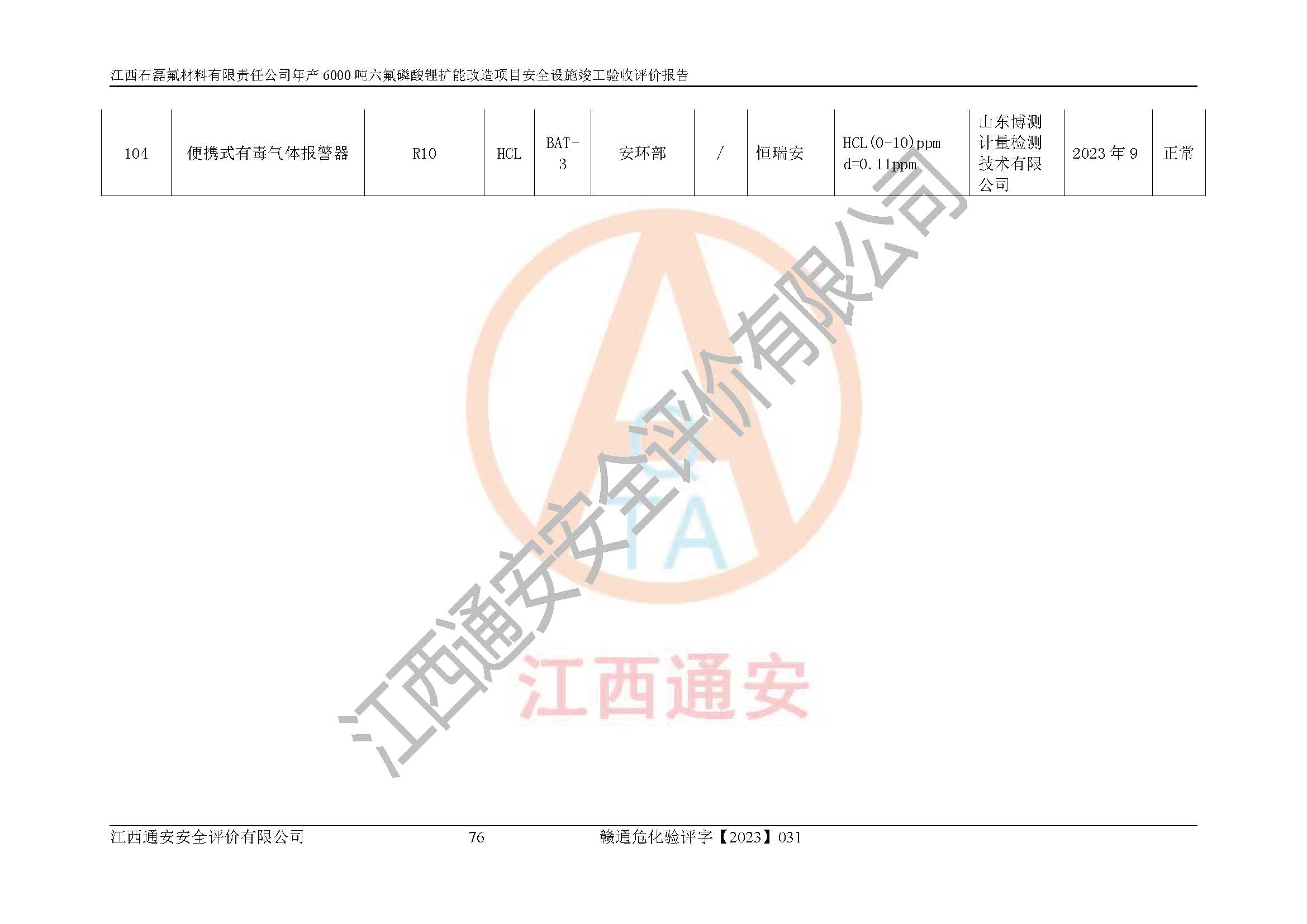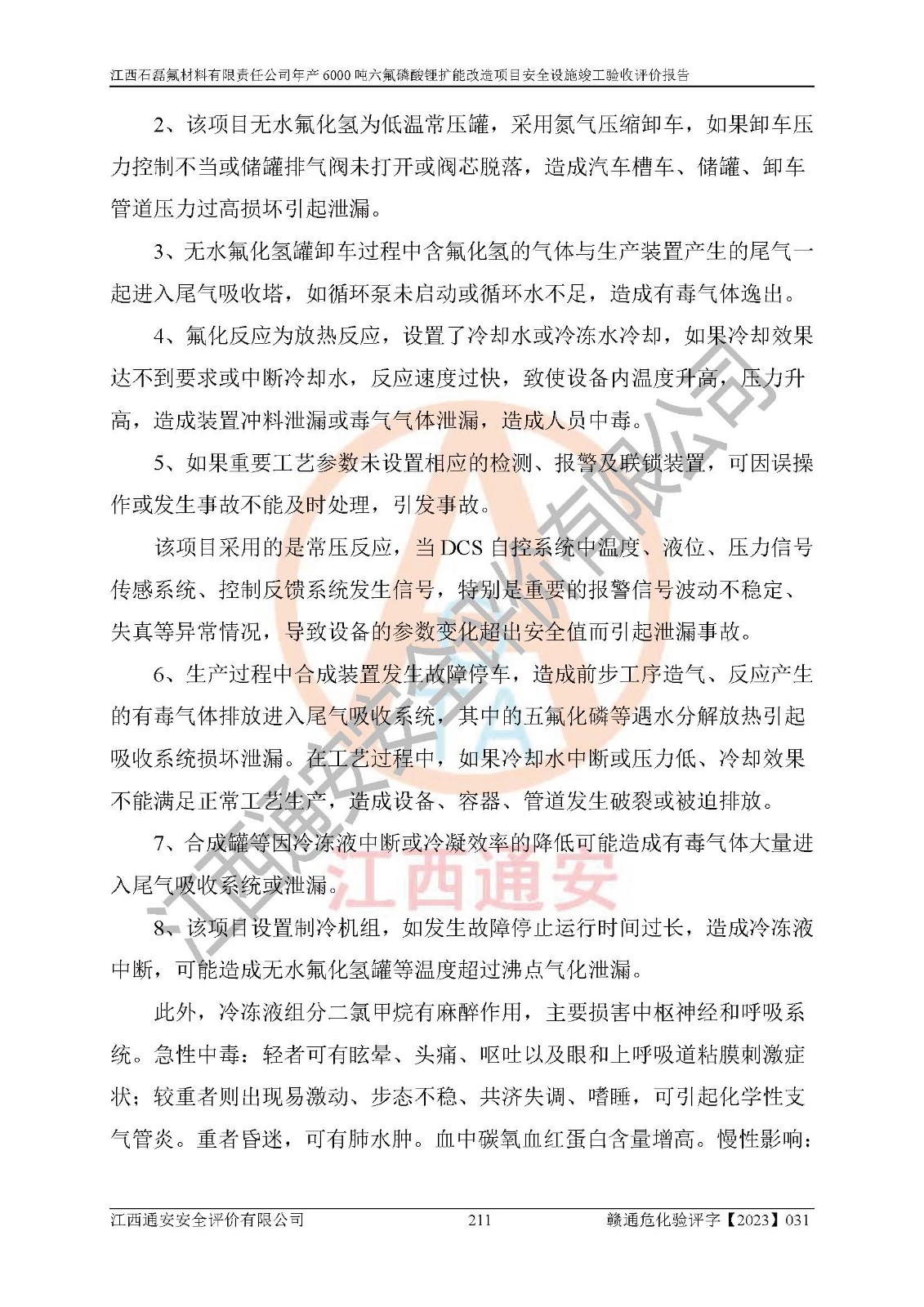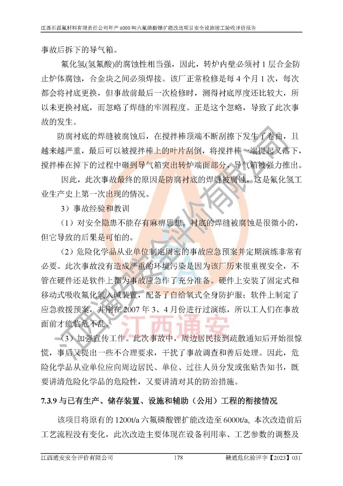 一、建设项目所在地的安全条件和与周边的安全防护距离 (1)该项目位于江西省赣州市会昌县氟盐化工产业基地,属于认定的化工园区,厂址选择合理,该项目与周边环境的防火间距符合规范的要求。 (2)重大危险源与“八类敏感场所及区域”的距离符合相关法律、法规的规定。 (3)该项目103生产车间三和201罐区一均构成**重大危险源。根据《危险化学品生产装置和储存设施外部安全防护距离确定方法》(GB/T 37243-2019)和《危险化学品生产装置和储存设施风险基准》(GB 36894-2018),该项目高敏感防护目标、重要防护目标、一般防护目标中的一类防护目标(<3×10-7)的外部安全防护距离包络线距离厂界*大值为76.36m,个人风险等值线范围内未出现该类防护目标;一般防护目标中的二类防护目标(<3×10-6)的外部安全防护距离包络线距离厂界*大值为51.62m,个人风险等值线范围内未涉及相应的防护目标;一般防护目标中的三类防护目标(<1×10-5)外部安全防护距离的包络线未出厂界。项目外部安全防护距离内无相应的防护目标,该项目不存在社会风险。 (4)该项目投产后在正常生产情况下,对其周边单位的生产、经营活动和居民的生活影响很小。在发生事故的情况下对周边单位的生产、经营活动和居民的生活存在影响。该项目周边单位的生产、经营活动和居民的生活对该项目投产后的正常生产影响很小。该项目所在地自然条件(不包括地震等破坏力**的自然灾害)的变化对该项目投产后的正常生产没有影响。 二、建设项目安全设施设计的采纳情况和已采用(取)的安全设施水平 该项目采用的主要安全设施包括了以下方面:检测、报警设施,设备安全防护设施,作业场所防护设施,安全警示标志,泄压和止逆设施,紧急处理设施,防止火灾蔓延设施,灭火设施,紧急个人处置设施,应急救援设施,劳动防护用品和装备等。 该项目在建设过程中采纳了《安全设施设计专篇》中的有关安全措施建议及要求,针对性的采取了相应的预防和控制措施,建设中未落实的安全措施,在试生产中已进行了整改。试生产表明该项目所采取的安全控制措施安全**,主要生产装置、设备运行平稳,安全可靠,安全水平较高,能够满足安全生产条件。 三、建设项目试生产(使用)后具备**现行有关安全生产法律、法规和部门规章及标准规定和要求的安全生产条件 1)法律法规等方面的符合性:该项目按照建设项目“三同时”要求,项目进行了备案、通过了安全条件审查、安全设施设计审查、试生产方案审查,立项审批手续齐全,安全设施设计、建设施工、施工监理均由有资质的单位承担,项目建设符合法律、法规规定的审批、施工、监理手续。项目建设期间,公司结合生产需要,增设了部分辅助设施和工艺管线,属于一般变更,试生产期间公司已委托河北英科石化工程有限公司进行了设计变更,作为已经审查通过的安全设施设计专篇的补充文件。 2)该项目与周边建构筑物的防火距离符合《精细化工企业工程设计防火标准》《建筑设计防火规范》的要求。根据《危险化学品生产装置和储存设施风险基准》GB36894-2018确定危险化学品单位周边重要目标和敏感场所承受的可容许个人风险和社会风险的定量风险评价。项目的个人风险计算结果表明,项目外部安全防护距离的包络线内无相应的防护目标。该软件未计算出社会风险。因此项目可容许个人风险和社会风险均在可接受范围内。 3)平面布置及常规防护设施措施的合理性:该项目生产场所、办公场所之间的间距满足安全要求,建筑结构、防火分区、防雷设施、安全出口的设置等满足安全生产的要求。消防道路的净宽度、净**、转弯半径均满足运输**及消防**通行。设置的常规防护设施、防止机械伤害、防急性中毒窒息的设施和措施符合要求。 4)设施、设备、装置及工艺方面的安全性:无**明令淘汰的工艺和 设备,该项目不涉及爆炸性危险区域划分。生产工艺操作和设置的安全设施满足安全需要,生产设施的布置能**人员疏散安全及操作方便。设施、设备、装置及工艺方面安全可靠。 5)特种设备、强制检测设备设施监督检验情况:该项目特种设备均进行了检验检测,并取得了检验报告;安全阀、压力表、有毒气体探头也进行了校验,校验结论合格,特种设备及安全附件符合《特种设备安全监察条例》 等相关法律法规、条例的规定。 6)公用工程、辅助设施的配套性:为该项目生产配套的供水、供电、 供气、供热等满足需要。 7)人员管理及安全培训方面充分性:公司现已建立了安全管理机构, 配备了专职安全管理人员。主要负责人王成具备化学工程与工艺专业本科学历,分管生产负责人曾中山具备化学工程与工艺专业本科学历,分管设备和技术负责人刘辉涛具备应用化学专业本科学历。专职安全管理人员共4人,配有一名注册安全工程师,专职安全管理人员均具有大专以上化工及安全专业相关学历。重点监管化工工艺的生产装置、储存设施操作人员具备高中及以上学历或化工类中等及以上职业教育水平。该公司制定了较完善的安全管理制度、岗位责任制、安全操作规程,制度执行情况较好。该公司已为从业职工交纳了工伤**。该公司对操作员工进行相关的培训和教育,经培训合格后上岗。 8)应急救援**性:企业根据自身实际情况,将该项目按照《生产经 营单位生产安全事故