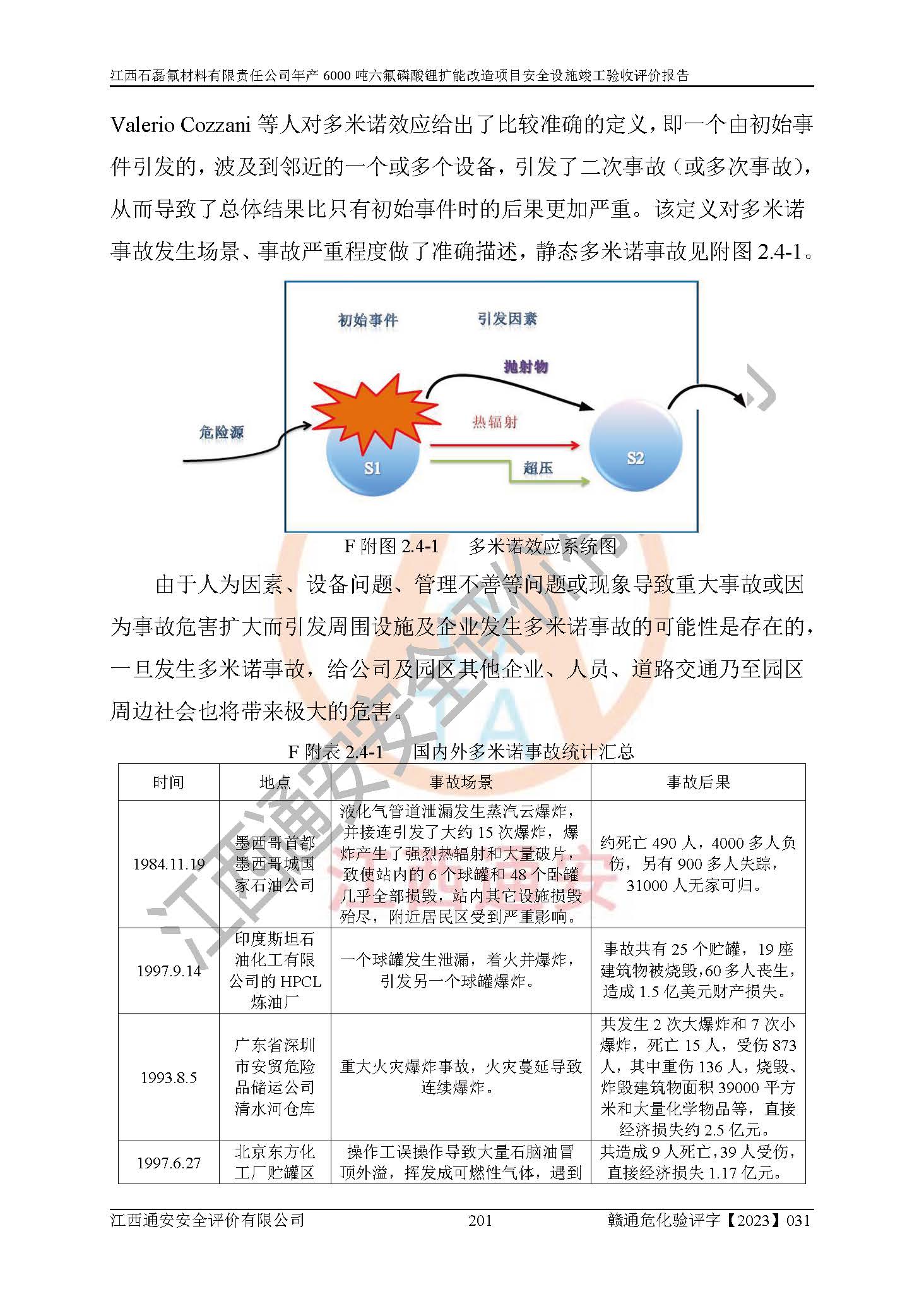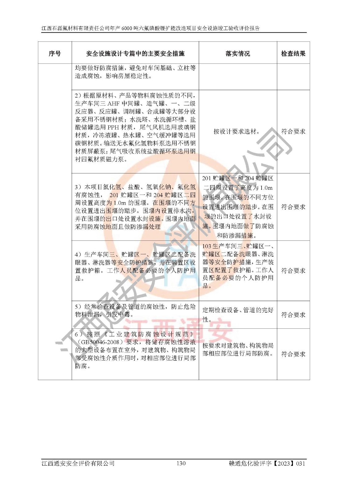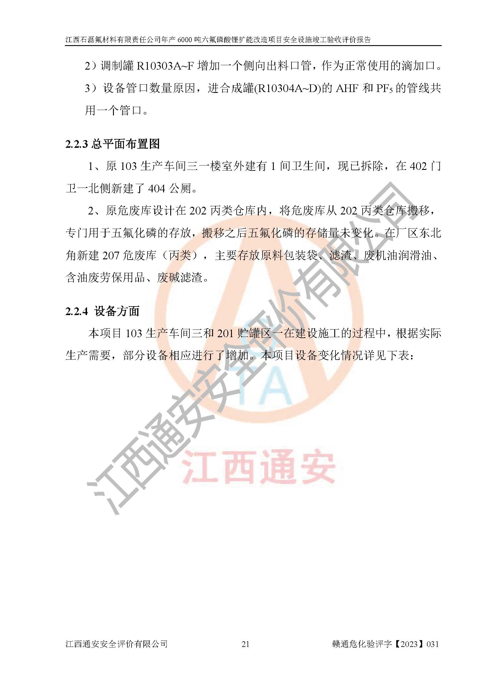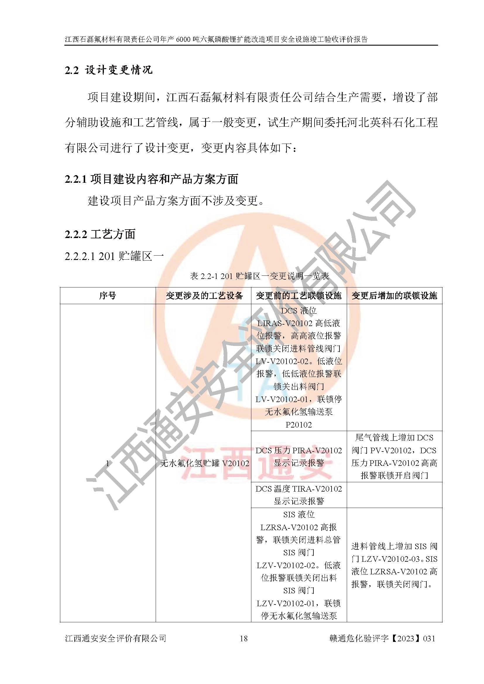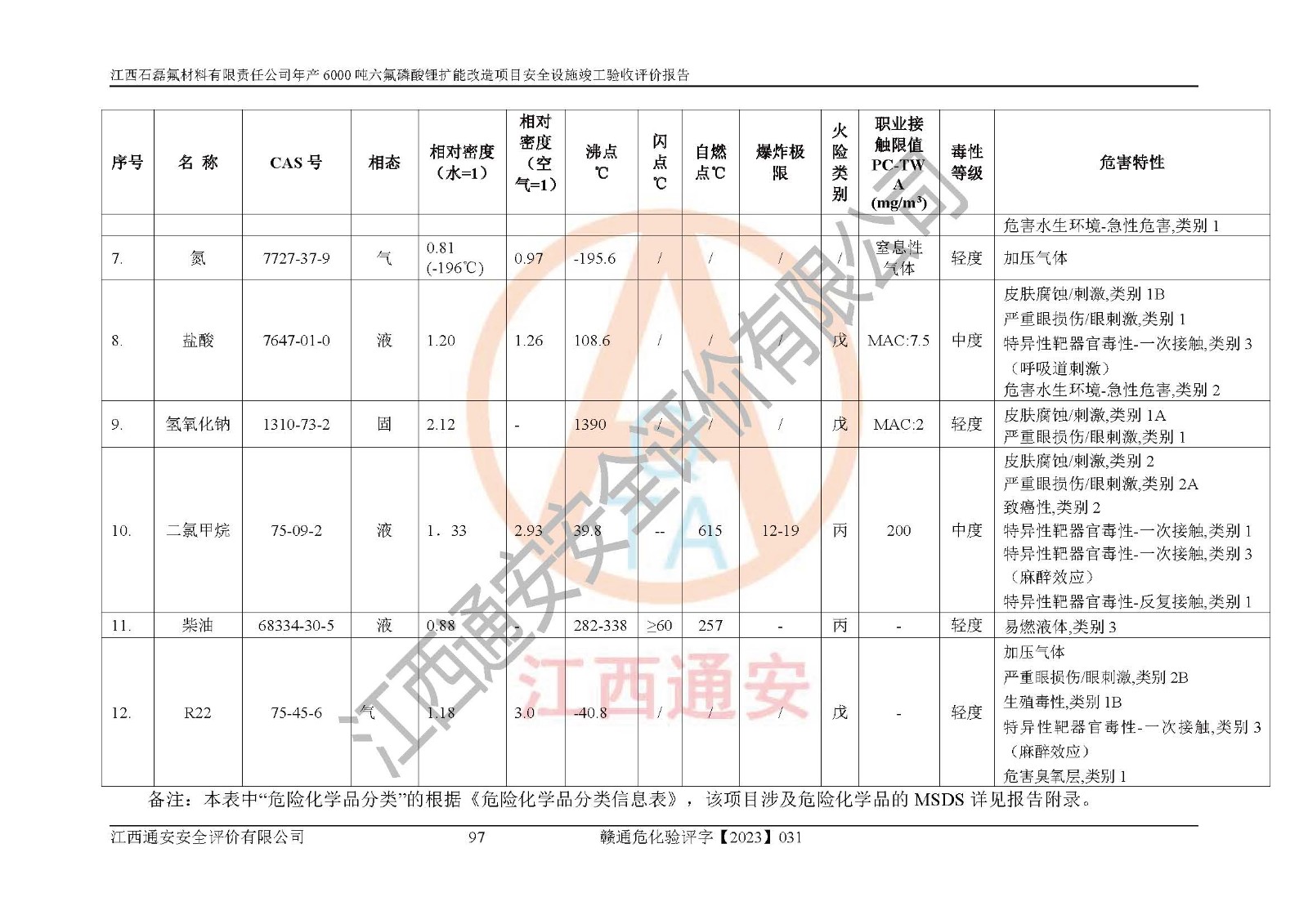 一、建设项目所在地的安全条件和与周边的安全防护距离 (1)该项目位于江西省赣州市会昌县氟盐化工产业基地,属于认定的化工园区,厂址选择合理,该项目与周边环境的防火间距符合规范的要求。 (2)重大危险源与“八类敏感场所及区域”的距离符合相关法律、法规的规定。 (3)该项目103生产车间三和201罐区一均构成**重大危险源。根据《危险化学品生产装置和储存设施外部安全防护距离确定方法》(GB/T 37243-2019)和《危险化学品生产装置和储存设施风险基准》(GB 36894-2018),该项目高敏感防护目标、重要防护目标、一般防护目标中的一类防护目标(<3×10-7)的外部安全防护距离包络线距离厂界*大值为76.36m,个人风险等值线范围内未出现该类防护目标;一般防护目标中的二类防护目标(<3×10-6)的外部安全防护距离包络线距离厂界*大值为51.62m,个人风险等值线范围内未涉及相应的防护目标;一般防护目标中的三类防护目标(<1×10-5)外部安全防护距离的包络线未出厂界。项目外部安全防护距离内无相应的防护目标,该项目不存在社会风险。 (4)该项目投产后在正常生产情况下,对其周边单位的生产、经营活动和居民的生活影响很小。在发生事故的情况下对周边单位的生产、经营活动和居民的生活存在影响。该项目周边单位的生产、经营活动和居民的生活对该项目投产后的正常生产影响很小。该项目所在地自然条件(不包括地震等破坏力**的自然灾害)的变化对该项目投产后的正常生产没有影响。 二、建设项目安全设施设计的采纳情况和已采用(取)的安全设施水平 该项目采用的主要安全设施包括了以下方面:检测、报警设施,设备安全防护设施,作业场所防护设施,安全警示标志,泄压和止逆设施,紧急处理设施,防止火灾蔓延设施,灭火设施,紧急个人处置设施,应急救援设施,劳动防护用品和装备等。 该项目在建设过程中采纳了《安全设施设计专篇》中的有关安全措施建议及要求,针对性的采取了相应的预防和控制措施,建设中未落实的安全措施,在试生产中已进行了整改。试生产表明该项目所采取的安全控制措施安全**,主要生产装置、设备运行平稳,安全可靠,安全水平较高,能够满足安全生产条件。 三、建设项目试生产(使用)后具备**现行有关安全生产法律、法规和部门规章及标准规定和要求的安全生产条件 1)法律法规等方面的符合性:该项目按照建设项目“三同时”要求,项目进行了备案、通过了安全条件审查、安全设施设计审查、试生产方案审查,立项审批手续齐全,安全设施设计、建设施工、施工监理均由有资质的单位承担,项目建设符合法律、法规规定的审批、施工、监理手续。项目建设期间,公司结合生产需要,增设了部分辅助设施和工艺管线,属于一般变更,试生产期间公司已委托河北英科石化工程有限公司进行了设计变更,作为已经审查通过的安全设施设计专篇的补充文件。 2)该项目与周边建构筑物的防火距离符合《精细化工企业工程设计防火标准》《建筑设计防火规范》的要求。根据《危险化学品生产装置和储存设施风险基准》GB36894-2018确定危险化学品单位周边重要目标和敏感场所承受的可容许个人风险和社会风险的定量风险评价。项目的个人风险计算结果表明,项目外部安全防护距离的包络线内无相应的防护目标。该软件未计算出社会风险。因此项目可容许个人风险和社会风险均在可接受范围内。 3)平面布置及常规防护设施措施的合理性:该项目生产场所、办公场所之间的间距满足安全要求,建筑结构、防火分区、防雷设施、安全出口的设置等满足安全生产的要求。消防道路的净宽度、净**、转弯半径均满足运输**及消防**通行。设置的常规防护设施、防止机械伤害、防急性中毒窒息的设施和措施符合要求。 4)设施、设备、装置及工艺方面的安全性:无**明令淘汰的工艺和 设备,该项目不涉及爆炸性危险区域划分。生产工艺操作和设置的安全设施满足安全需要,生产设施的布置能**人员疏散安全及操作方便。设施、设备、装置及工艺方面安全可靠。 5)特种设备、强制检测设备设施监督检验情况:该项目特种设备均进行了检验检测,并取得了检验报告;安全阀、压力表、有毒气体探头也进行了校验,校验结论合格,特种设备及安全附件符合《特种设备安全监察条例》 等相关法律法规、条例的规定。 6)公用工程、辅助设施的配套性:为该项目生产配套的供水、供电、 供气、供热等满足需要。 7)人员管理及安全培训方面充分性:公司现已建立了安全管理机构, 配备了专职安全管理人员。主要负责人王成具备化学工程与工艺专业本科学历,分管生产负责人曾中山具备化学工程与工艺专业本科学历,分管设备和技术负责人刘辉涛具备应用化学专业本科学历。专职安全管理人员共4人,配有一名注册安全工程师,专职安全管理人员均具有大专以上化工及安全专业相关学历。重点监管化工工艺的生产装置、储存设施操作人员具备高中及以上学历或化工类中等及以上职业教育水平。该公司制定了较完善的安全管理制度、岗位责任制、安全操作规程,制度执行情况较好。该公司已为从业职工交纳了工伤**。该公司对操作员工进行相关的培训和教育,经培训合格后上岗。 8)应急救援**性:企业根据自身实际情况,将该项目按照《生产经 营单位生产安全事故