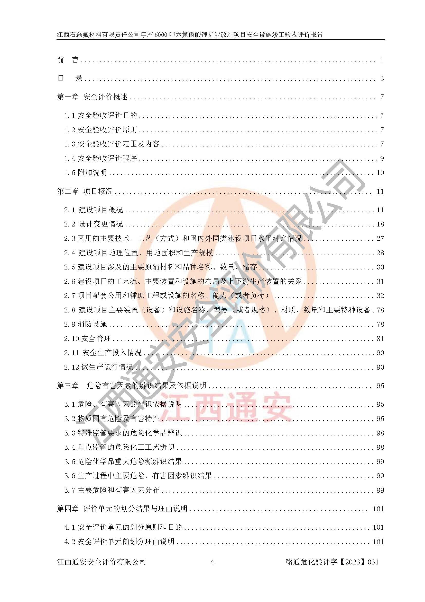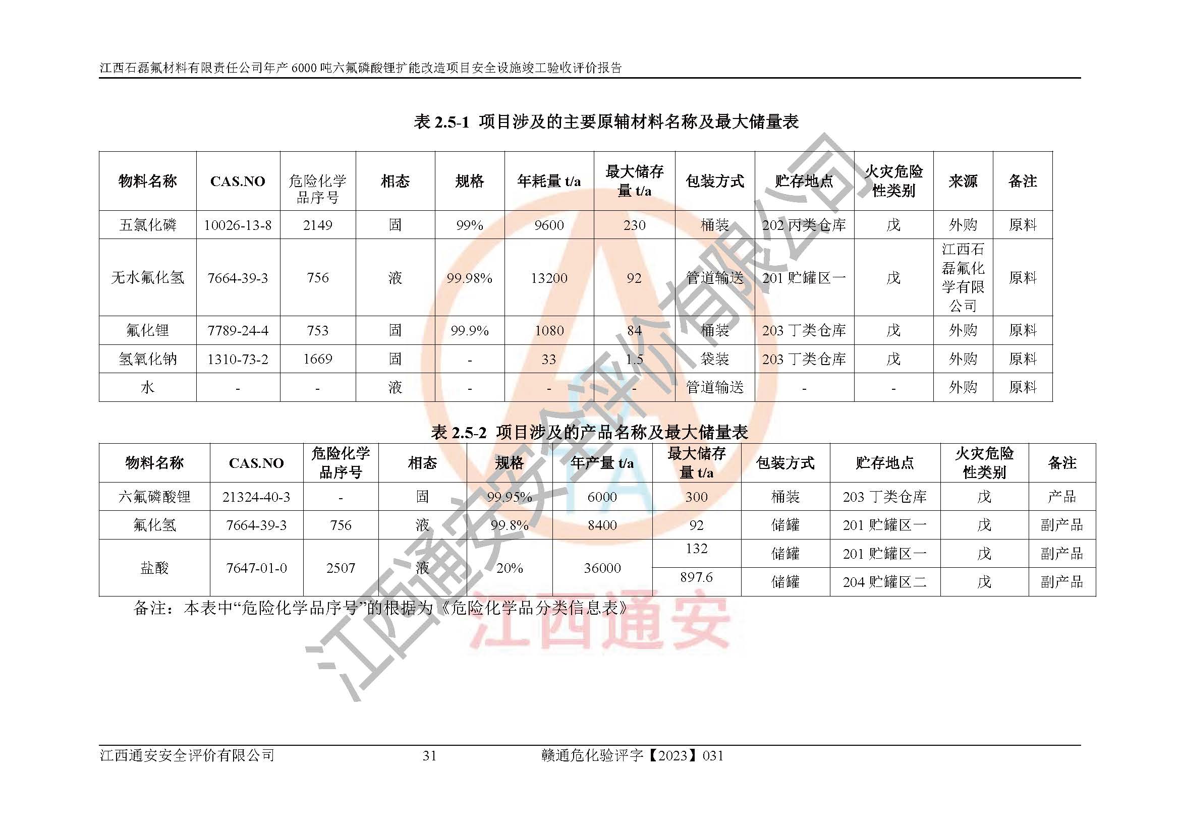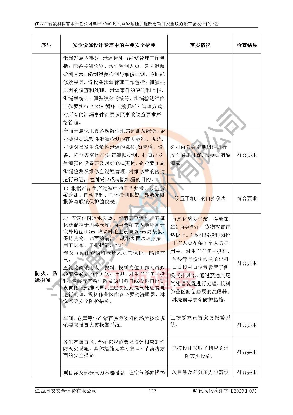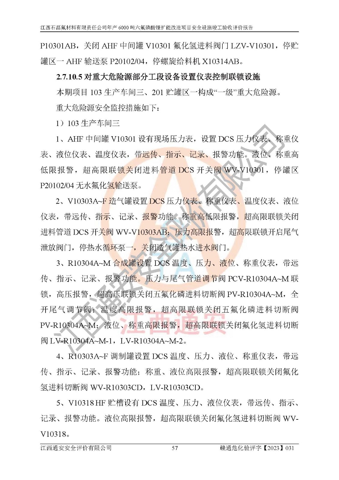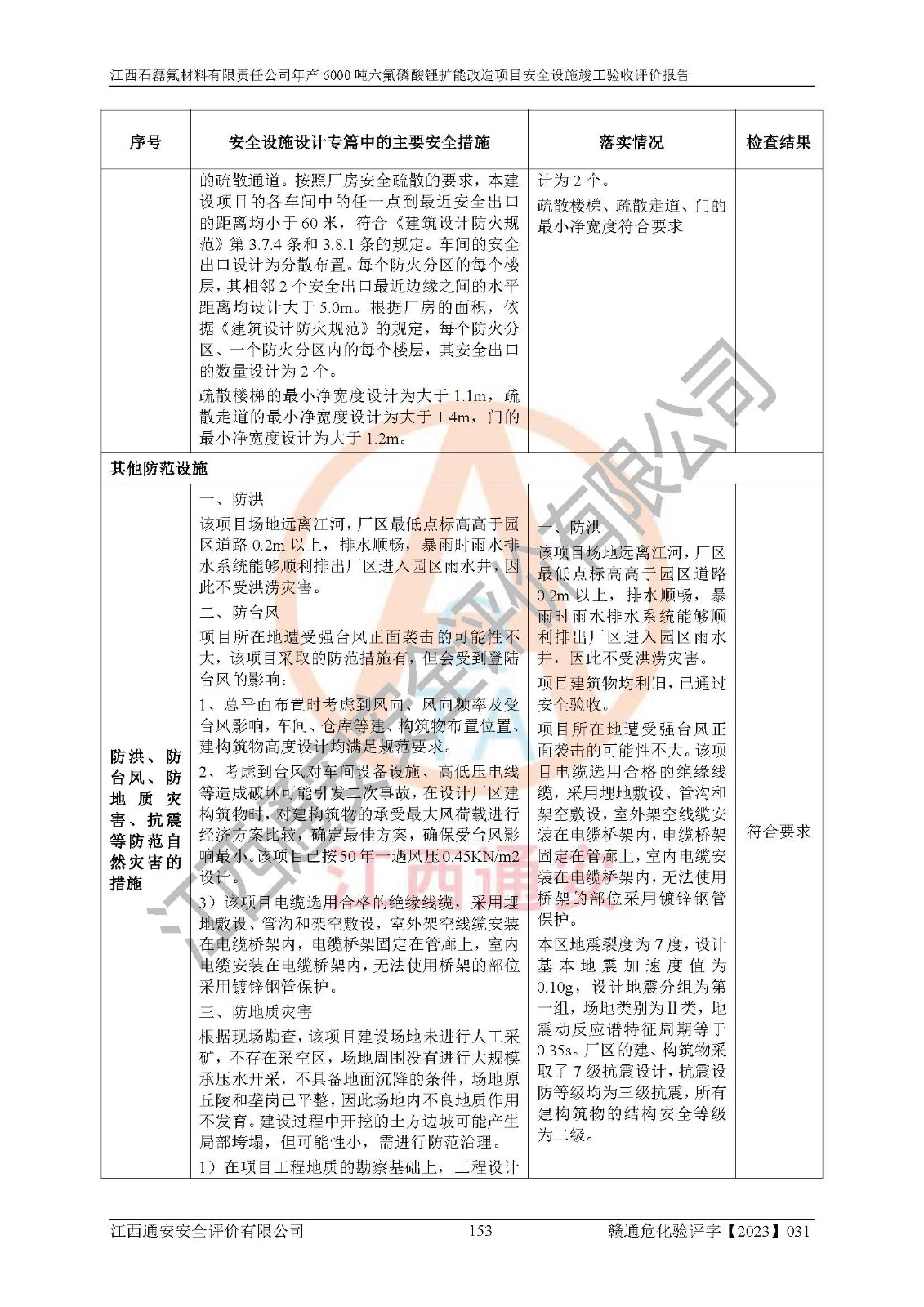 一、建设项目所在地的安全条件和与周边的安全防护距离 (1)该项目位于江西省赣州市会昌县氟盐化工产业基地,属于认定的化工园区,厂址选择合理,该项目与周边环境的防火间距符合规范的要求。 (2)重大危险源与“八类敏感场所及区域”的距离符合相关法律、法规的规定。 (3)该项目103生产车间三和201罐区一均构成**重大危险源。根据《危险化学品生产装置和储存设施外部安全防护距离确定方法》(GB/T 37243-2019)和《危险化学品生产装置和储存设施风险基准》(GB 36894-2018),该项目高敏感防护目标、重要防护目标、一般防护目标中的一类防护目标(<3×10-7)的外部安全防护距离包络线距离厂界*大值为76.36m,个人风险等值线范围内未出现该类防护目标;一般防护目标中的二类防护目标(<3×10-6)的外部安全防护距离包络线距离厂界*大值为51.62m,个人风险等值线范围内未涉及相应的防护目标;一般防护目标中的三类防护目标(<1×10-5)外部安全防护距离的包络线未出厂界。项目外部安全防护距离内无相应的防护目标,该项目不存在社会风险。 (4)该项目投产后在正常生产情况下,对其周边单位的生产、经营活动和居民的生活影响很小。在发生事故的情况下对周边单位的生产、经营活动和居民的生活存在影响。该项目周边单位的生产、经营活动和居民的生活对该项目投产后的正常生产影响很小。该项目所在地自然条件(不包括地震等破坏力**的自然灾害)的变化对该项目投产后的正常生产没有影响。 二、建设项目安全设施设计的采纳情况和已采用(取)的安全设施水平 该项目采用的主要安全设施包括了以下方面:检测、报警设施,设备安全防护设施,作业场所防护设施,安全警示标志,泄压和止逆设施,紧急处理设施,防止火灾蔓延设施,灭火设施,紧急个人处置设施,应急救援设施,劳动防护用品和装备等。 该项目在建设过程中采纳了《安全设施设计专篇》中的有关安全措施建议及要求,针对性的采取了相应的预防和控制措施,建设中未落实的安全措施,在试生产中已进行了整改。试生产表明该项目所采取的安全控制措施安全**,主要生产装置、设备运行平稳,安全可靠,安全水平较高,能够满足安全生产条件。 三、建设项目试生产(使用)后具备**现行有关安全生产法律、法规和部门规章及标准规定和要求的安全生产条件 1)法律法规等方面的符合性:该项目按照建设项目“三同时”要求,项目进行了备案、通过了安全条件审查、安全设施设计审查、试生产方案审查,立项审批手续齐全,安全设施设计、建设施工、施工监理均由有资质的单位承担,项目建设符合法律、法规规定的审批、施工、监理手续。项目建设期间,公司结合生产需要,增设了部分辅助设施和工艺管线,属于一般变更,试生产期间公司已委托河北英科石化工程有限公司进行了设计变更,作为已经审查通过的安全设施设计专篇的补充文件。 2)该项目与周边建构筑物的防火距离符合《精细化工企业工程设计防火标准》《建筑设计防火规范》的要求。根据《危险化学品生产装置和储存设施风险基准》GB36894-2018确定危险化学品单位周边重要目标和敏感场所承受的可容许个人风险和社会风险的定量风险评价。项目的个人风险计算结果表明,项目外部安全防护距离的包络线内无相应的防护目标。该软件未计算出社会风险。因此项目可容许个人风险和社会风险均在可接受范围内。 3)平面布置及常规防护设施措施的合理性:该项目生产场所、办公场所之间的间距满足安全要求,建筑结构、防火分区、防雷设施、安全出口的设置等满足安全生产的要求。消防道路的净宽度、净**、转弯半径均满足运输**及消防**通行。设置的常规防护设施、防止机械伤害、防急性中毒窒息的设施和措施符合要求。 4)设施、设备、装置及工艺方面的安全性:无**明令淘汰的工艺和 设备,该项目不涉及爆炸性危险区域划分。生产工艺操作和设置的安全设施满足安全需要,生产设施的布置能**人员疏散安全及操作方便。设施、设备、装置及工艺方面安全可靠。 5)特种设备、强制检测设备设施监督检验情况:该项目特种设备均进行了检验检测,并取得了检验报告;安全阀、压力表、有毒气体探头也进行了校验,校验结论合格,特种设备及安全附件符合《特种设备安全监察条例》 等相关法律法规、条例的规定。 6)公用工程、辅助设施的配套性:为该项目生产配套的供水、供电、 供气、供热等满足需要。 7)人员管理及安全培训方面充分性:公司现已建立了安全管理机构, 配备了专职安全管理人员。主要负责人王成具备化学工程与工艺专业本科学历,分管生产负责人曾中山具备化学工程与工艺专业本科学历,分管设备和技术负责人刘辉涛具备应用化学专业本科学历。专职安全管理人员共4人,配有一名注册安全工程师,专职安全管理人员均具有大专以上化工及安全专业相关学历。重点监管化工工艺的生产装置、储存设施操作人员具备高中及以上学历或化工类中等及以上职业教育水平。该公司制定了较完善的安全管理制度、岗位责任制、安全操作规程,制度执行情况较好。该公司已为从业职工交纳了工伤**。该公司对操作员工进行相关的培训和教育,经培训合格后上岗。 8)应急救援**性:企业根据自身实际情况,将该项目按照《生产经 营单位生产安全事故