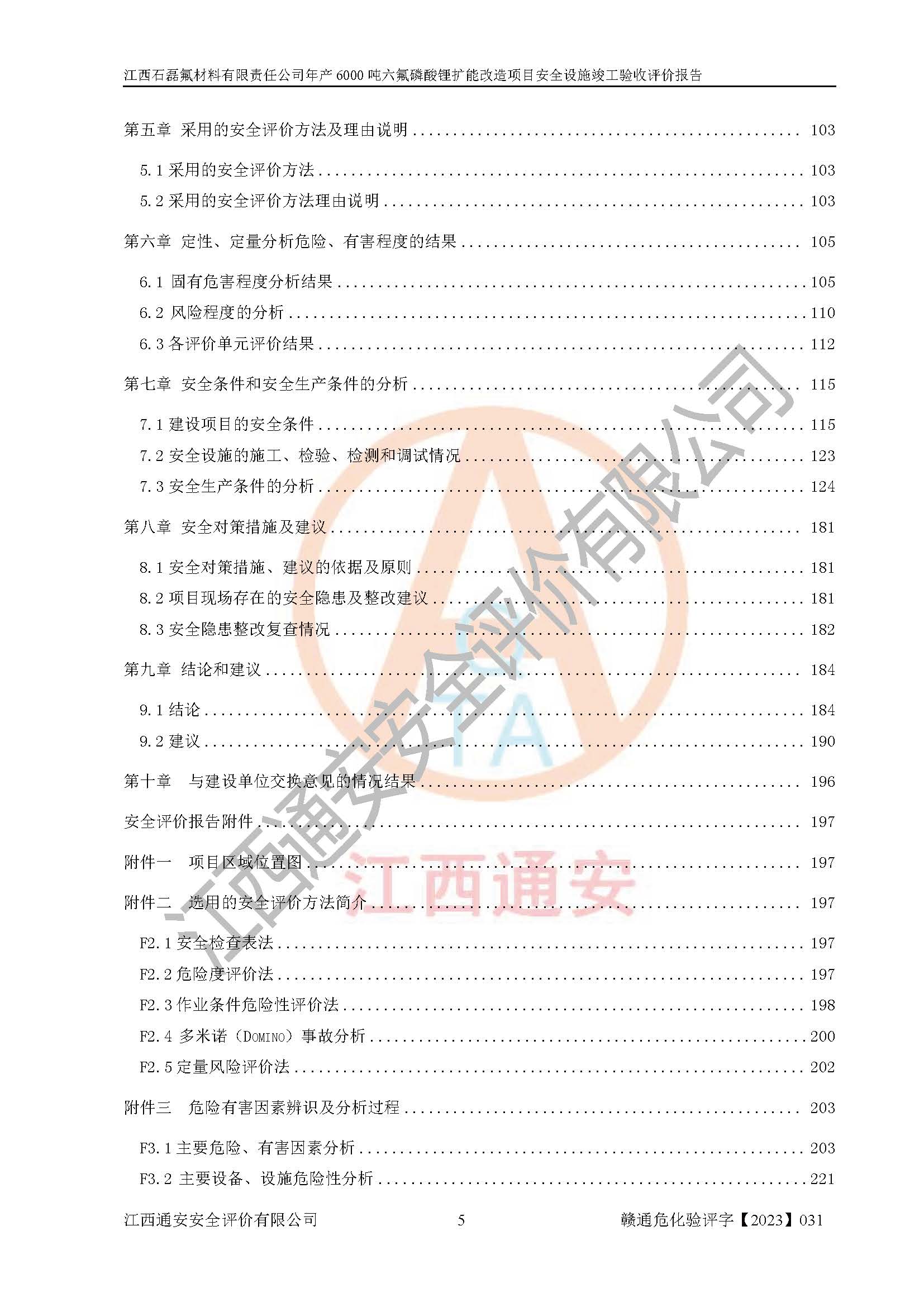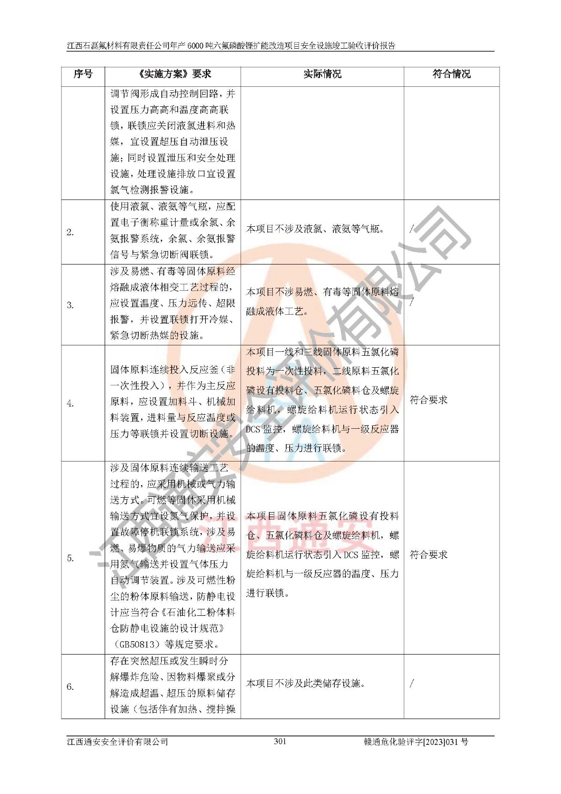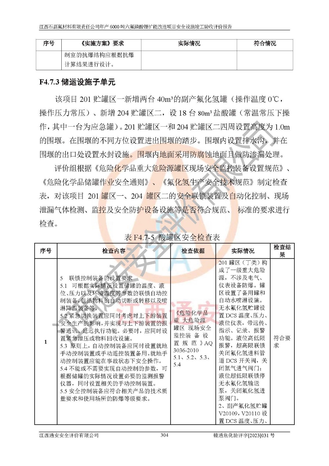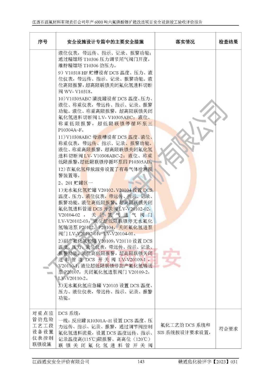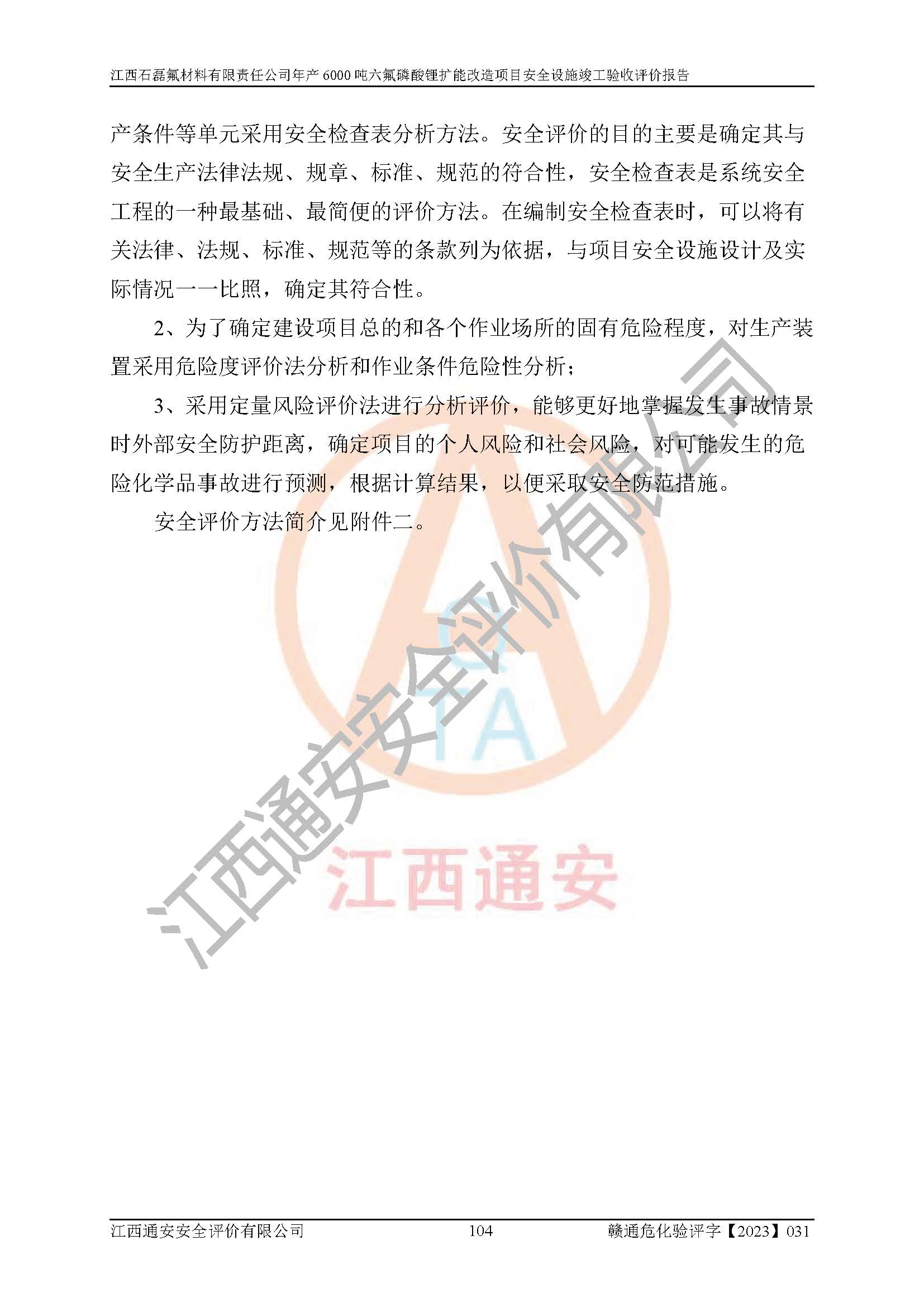 一、建设项目所在地的安全条件和与周边的安全防护距离 (1)该项目位于江西省赣州市会昌县氟盐化工产业基地,属于认定的化工园区,厂址选择合理,该项目与周边环境的防火间距符合规范的要求。 (2)重大危险源与“八类敏感场所及区域”的距离符合相关法律、法规的规定。 (3)该项目103生产车间三和201罐区一均构成**重大危险源。根据《危险化学品生产装置和储存设施外部安全防护距离确定方法》(GB/T 37243-2019)和《危险化学品生产装置和储存设施风险基准》(GB 36894-2018),该项目高敏感防护目标、重要防护目标、一般防护目标中的一类防护目标(<3×10-7)的外部安全防护距离包络线距离厂界*大值为76.36m,个人风险等值线范围内未出现该类防护目标;一般防护目标中的二类防护目标(<3×10-6)的外部安全防护距离包络线距离厂界*大值为51.62m,个人风险等值线范围内未涉及相应的防护目标;一般防护目标中的三类防护目标(<1×10-5)外部安全防护距离的包络线未出厂界。项目外部安全防护距离内无相应的防护目标,该项目不存在社会风险。 (4)该项目投产后在正常生产情况下,对其周边单位的生产、经营活动和居民的生活影响很小。在发生事故的情况下对周边单位的生产、经营活动和居民的生活存在影响。该项目周边单位的生产、经营活动和居民的生活对该项目投产后的正常生产影响很小。该项目所在地自然条件(不包括地震等破坏力**的自然灾害)的变化对该项目投产后的正常生产没有影响。 二、建设项目安全设施设计的采纳情况和已采用(取)的安全设施水平 该项目采用的主要安全设施包括了以下方面:检测、报警设施,设备安全防护设施,作业场所防护设施,安全警示标志,泄压和止逆设施,紧急处理设施,防止火灾蔓延设施,灭火设施,紧急个人处置设施,应急救援设施,劳动防护用品和装备等。 该项目在建设过程中采纳了《安全设施设计专篇》中的有关安全措施建议及要求,针对性的采取了相应的预防和控制措施,建设中未落实的安全措施,在试生产中已进行了整改。试生产表明该项目所采取的安全控制措施安全**,主要生产装置、设备运行平稳,安全可靠,安全水平较高,能够满足安全生产条件。 三、建设项目试生产(使用)后具备**现行有关安全生产法律、法规和部门规章及标准规定和要求的安全生产条件 1)法律法规等方面的符合性:该项目按照建设项目“三同时”要求,项目进行了备案、通过了安全条件审查、安全设施设计审查、试生产方案审查,立项审批手续齐全,安全设施设计、建设施工、施工监理均由有资质的单位承担,项目建设符合法律、法规规定的审批、施工、监理手续。项目建设期间,公司结合生产需要,增设了部分辅助设施和工艺管线,属于一般变更,试生产期间公司已委托河北英科石化工程有限公司进行了设计变更,作为已经审查通过的安全设施设计专篇的补充文件。 2)该项目与周边建构筑物的防火距离符合《精细化工企业工程设计防火标准》《建筑设计防火规范》的要求。根据《危险化学品生产装置和储存设施风险基准》GB36894-2018确定危险化学品单位周边重要目标和敏感场所承受的可容许个人风险和社会风险的定量风险评价。项目的个人风险计算结果表明,项目外部安全防护距离的包络线内无相应的防护目标。该软件未计算出社会风险。因此项目可容许个人风险和社会风险均在可接受范围内。 3)平面布置及常规防护设施措施的合理性:该项目生产场所、办公场所之间的间距满足安全要求,建筑结构、防火分区、防雷设施、安全出口的设置等满足安全生产的要求。消防道路的净宽度、净**、转弯半径均满足运输**及消防**通行。设置的常规防护设施、防止机械伤害、防急性中毒窒息的设施和措施符合要求。 4)设施、设备、装置及工艺方面的安全性:无**明令淘汰的工艺和 设备,该项目不涉及爆炸性危险区域划分。生产工艺操作和设置的安全设施满足安全需要,生产设施的布置能**人员疏散安全及操作方便。设施、设备、装置及工艺方面安全可靠。 5)特种设备、强制检测设备设施监督检验情况:该项目特种设备均进行了检验检测,并取得了检验报告;安全阀、压力表、有毒气体探头也进行了校验,校验结论合格,特种设备及安全附件符合《特种设备安全监察条例》 等相关法律法规、条例的规定。 6)公用工程、辅助设施的配套性:为该项目生产配套的供水、供电、 供气、供热等满足需要。 7)人员管理及安全培训方面充分性:公司现已建立了安全管理机构, 配备了专职安全管理人员。主要负责人王成具备化学工程与工艺专业本科学历,分管生产负责人曾中山具备化学工程与工艺专业本科学历,分管设备和技术负责人刘辉涛具备应用化学专业本科学历。专职安全管理人员共4人,配有一名注册安全工程师,专职安全管理人员均具有大专以上化工及安全专业相关学历。重点监管化工工艺的生产装置、储存设施操作人员具备高中及以上学历或化工类中等及以上职业教育水平。该公司制定了较完善的安全管理制度、岗位责任制、安全操作规程,制度执行情况较好。该公司已为从业职工交纳了工伤**。该公司对操作员工进行相关的培训和教育,经培训合格后上岗。 8)应急救援**性:企业根据自身实际情况,将该项目按照《生产经 营单位生产安全事故