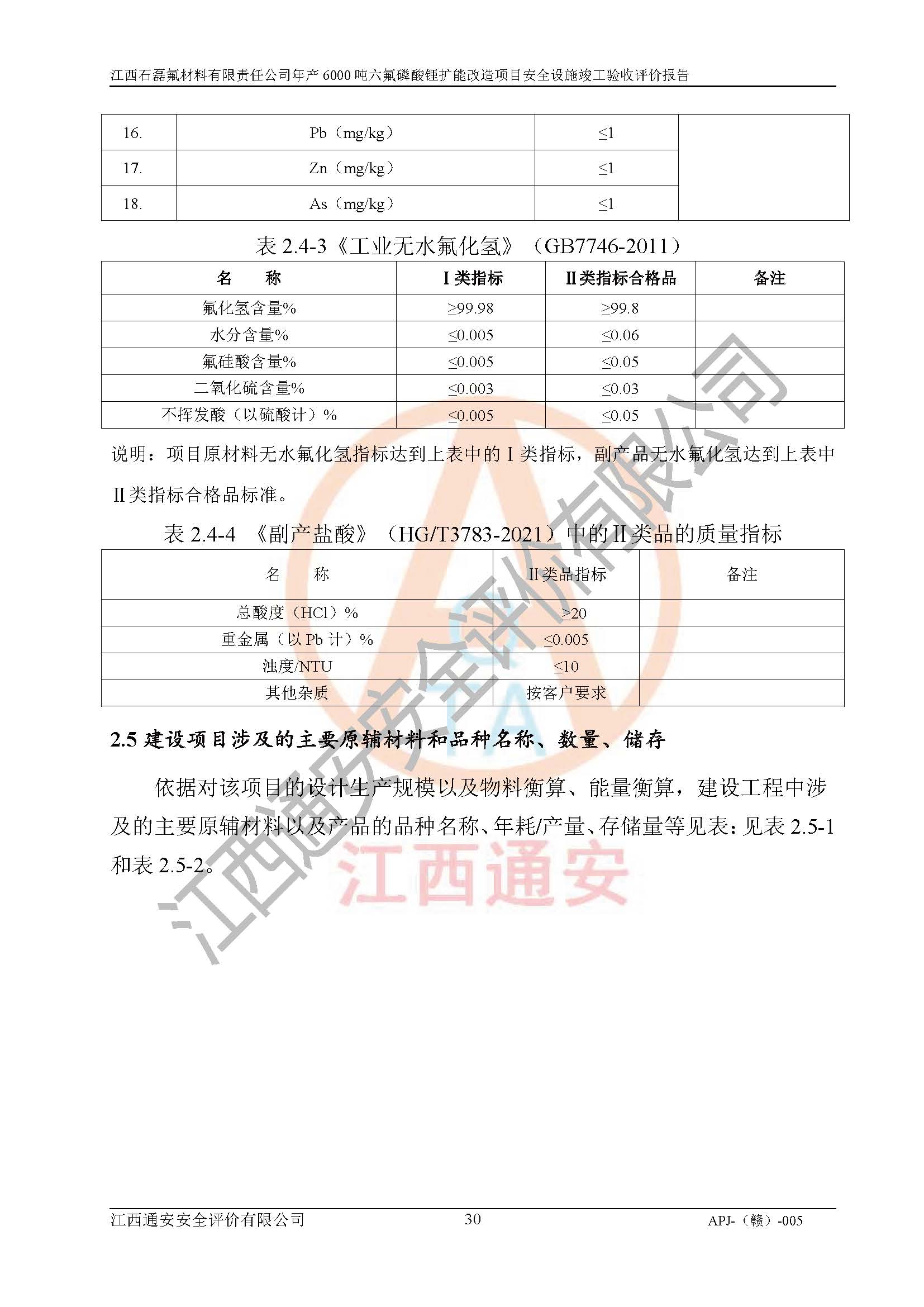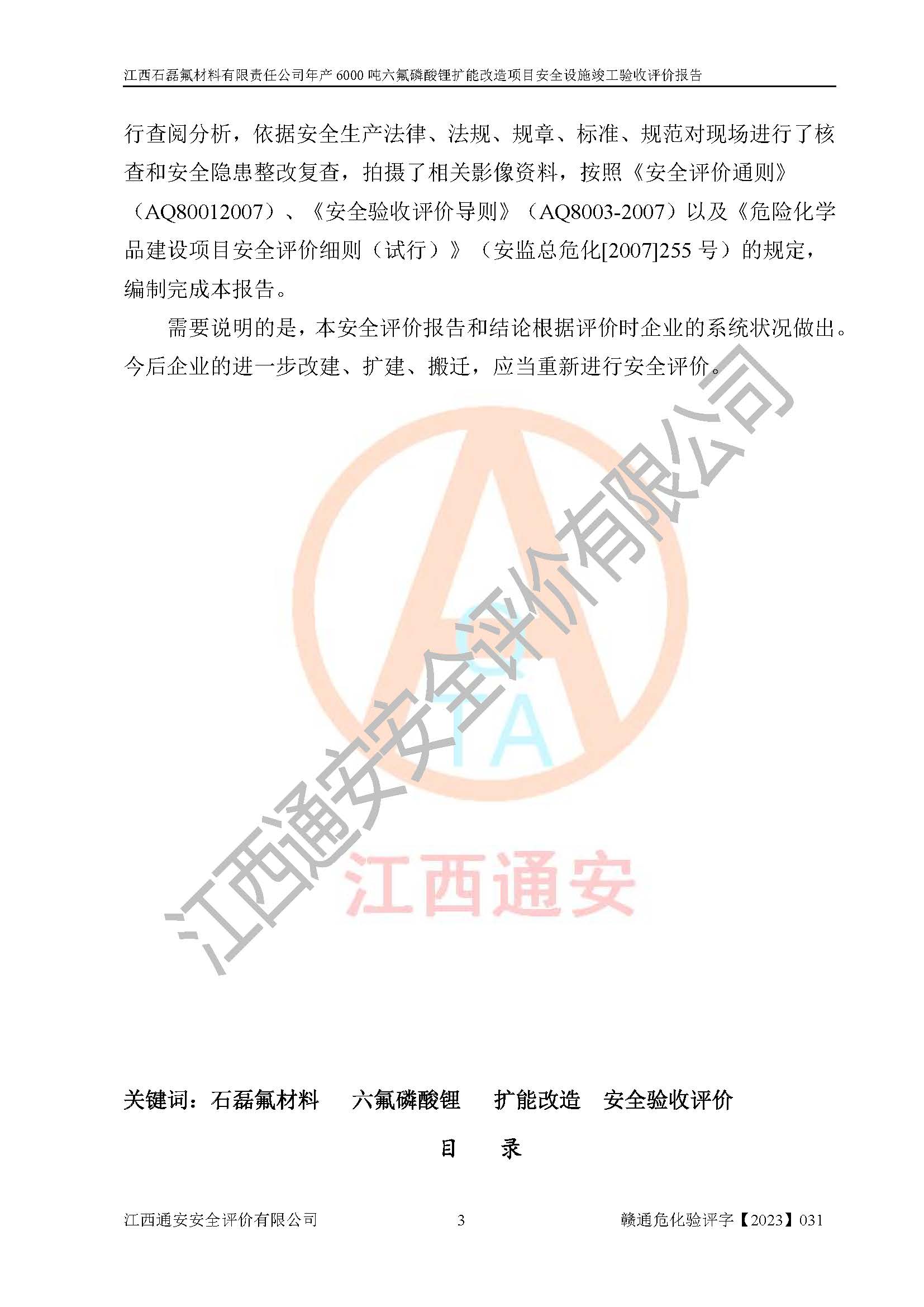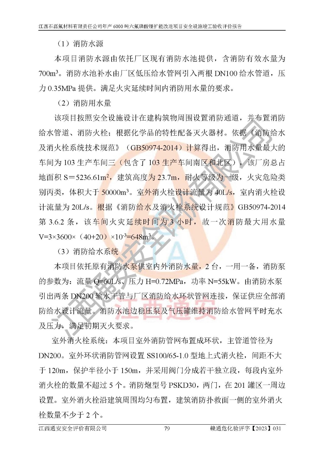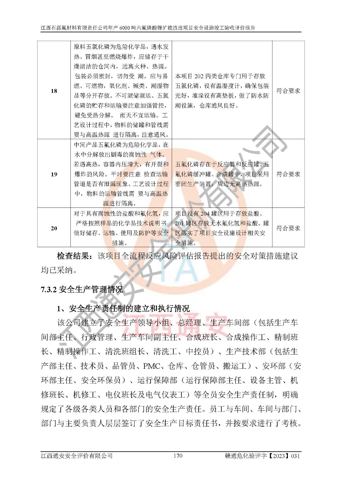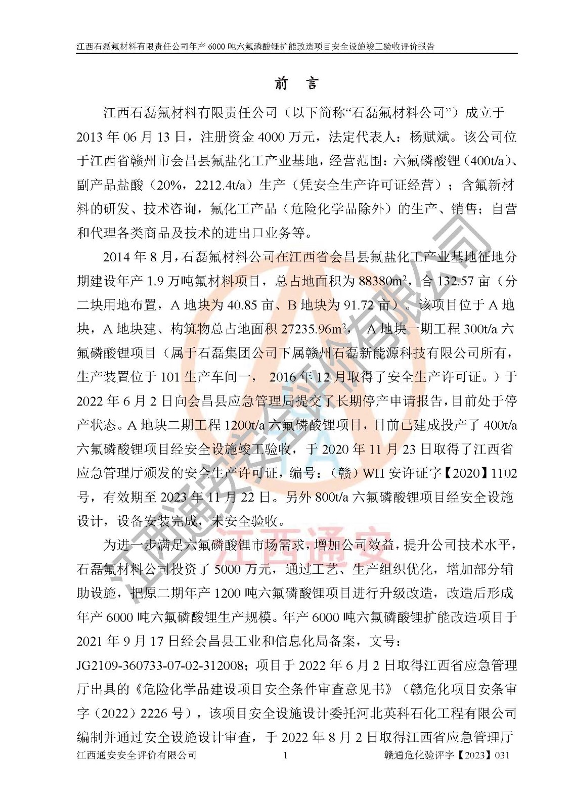 一、建设项目所在地的安全条件和与周边的安全防护距离 (1)该项目位于江西省赣州市会昌县氟盐化工产业基地,属于认定的化工园区,厂址选择合理,该项目与周边环境的防火间距符合规范的要求。 (2)重大危险源与“八类敏感场所及区域”的距离符合相关法律、法规的规定。 (3)该项目103生产车间三和201罐区一均构成**重大危险源。根据《危险化学品生产装置和储存设施外部安全防护距离确定方法》(GB/T 37243-2019)和《危险化学品生产装置和储存设施风险基准》(GB 36894-2018),该项目高敏感防护目标、重要防护目标、一般防护目标中的一类防护目标(<3×10-7)的外部安全防护距离包络线距离厂界*大值为76.36m,个人风险等值线范围内未出现该类防护目标;一般防护目标中的二类防护目标(<3×10-6)的外部安全防护距离包络线距离厂界*大值为51.62m,个人风险等值线范围内未涉及相应的防护目标;一般防护目标中的三类防护目标(<1×10-5)外部安全防护距离的包络线未出厂界。项目外部安全防护距离内无相应的防护目标,该项目不存在社会风险。 (4)该项目投产后在正常生产情况下,对其周边单位的生产、经营活动和居民的生活影响很小。在发生事故的情况下对周边单位的生产、经营活动和居民的生活存在影响。该项目周边单位的生产、经营活动和居民的生活对该项目投产后的正常生产影响很小。该项目所在地自然条件(不包括地震等破坏力**的自然灾害)的变化对该项目投产后的正常生产没有影响。 二、建设项目安全设施设计的采纳情况和已采用(取)的安全设施水平 该项目采用的主要安全设施包括了以下方面:检测、报警设施,设备安全防护设施,作业场所防护设施,安全警示标志,泄压和止逆设施,紧急处理设施,防止火灾蔓延设施,灭火设施,紧急个人处置设施,应急救援设施,劳动防护用品和装备等。 该项目在建设过程中采纳了《安全设施设计专篇》中的有关安全措施建议及要求,针对性的采取了相应的预防和控制措施,建设中未落实的安全措施,在试生产中已进行了整改。试生产表明该项目所采取的安全控制措施安全**,主要生产装置、设备运行平稳,安全可靠,安全水平较高,能够满足安全生产条件。 三、建设项目试生产(使用)后具备**现行有关安全生产法律、法规和部门规章及标准规定和要求的安全生产条件 1)法律法规等方面的符合性:该项目按照建设项目“三同时”要求,项目进行了备案、通过了安全条件审查、安全设施设计审查、试生产方案审查,立项审批手续齐全,安全设施设计、建设施工、施工监理均由有资质的单位承担,项目建设符合法律、法规规定的审批、施工、监理手续。项目建设期间,公司结合生产需要,增设了部分辅助设施和工艺管线,属于一般变更,试生产期间公司已委托河北英科石化工程有限公司进行了设计变更,作为已经审查通过的安全设施设计专篇的补充文件。 2)该项目与周边建构筑物的防火距离符合《精细化工企业工程设计防火标准》《建筑设计防火规范》的要求。根据《危险化学品生产装置和储存设施风险基准》GB36894-2018确定危险化学品单位周边重要目标和敏感场所承受的可容许个人风险和社会风险的定量风险评价。项目的个人风险计算结果表明,项目外部安全防护距离的包络线内无相应的防护目标。该软件未计算出社会风险。因此项目可容许个人风险和社会风险均在可接受范围内。 3)平面布置及常规防护设施措施的合理性:该项目生产场所、办公场所之间的间距满足安全要求,建筑结构、防火分区、防雷设施、安全出口的设置等满足安全生产的要求。消防道路的净宽度、净**、转弯半径均满足运输**及消防**通行。设置的常规防护设施、防止机械伤害、防急性中毒窒息的设施和措施符合要求。 4)设施、设备、装置及工艺方面的安全性:无**明令淘汰的工艺和 设备,该项目不涉及爆炸性危险区域划分。生产工艺操作和设置的安全设施满足安全需要,生产设施的布置能**人员疏散安全及操作方便。设施、设备、装置及工艺方面安全可靠。 5)特种设备、强制检测设备设施监督检验情况:该项目特种设备均进行了检验检测,并取得了检验报告;安全阀、压力表、有毒气体探头也进行了校验,校验结论合格,特种设备及安全附件符合《特种设备安全监察条例》 等相关法律法规、条例的规定。 6)公用工程、辅助设施的配套性:为该项目生产配套的供水、供电、 供气、供热等满足需要。 7)人员管理及安全培训方面充分性:公司现已建立了安全管理机构, 配备了专职安全管理人员。主要负责人王成具备化学工程与工艺专业本科学历,分管生产负责人曾中山具备化学工程与工艺专业本科学历,分管设备和技术负责人刘辉涛具备应用化学专业本科学历。专职安全管理人员共4人,配有一名注册安全工程师,专职安全管理人员均具有大专以上化工及安全专业相关学历。重点监管化工工艺的生产装置、储存设施操作人员具备高中及以上学历或化工类中等及以上职业教育水平。该公司制定了较完善的安全管理制度、岗位责任制、安全操作规程,制度执行情况较好。该公司已为从业职工交纳了工伤**。该公司对操作员工进行相关的培训和教育,经培训合格后上岗。 8)应急救援**性:企业根据自身实际情况,将该项目按照《生产经 营单位生产安全事故