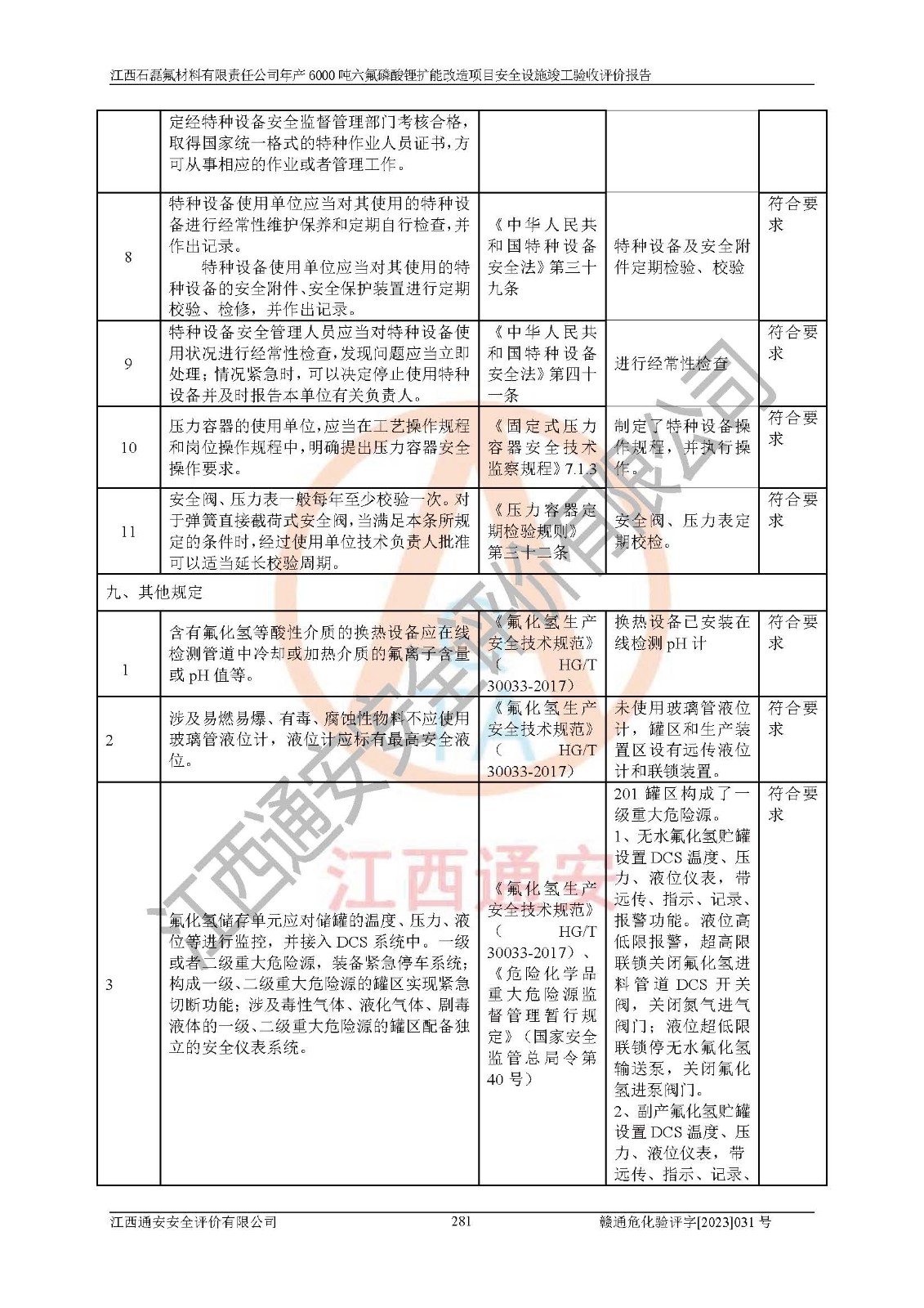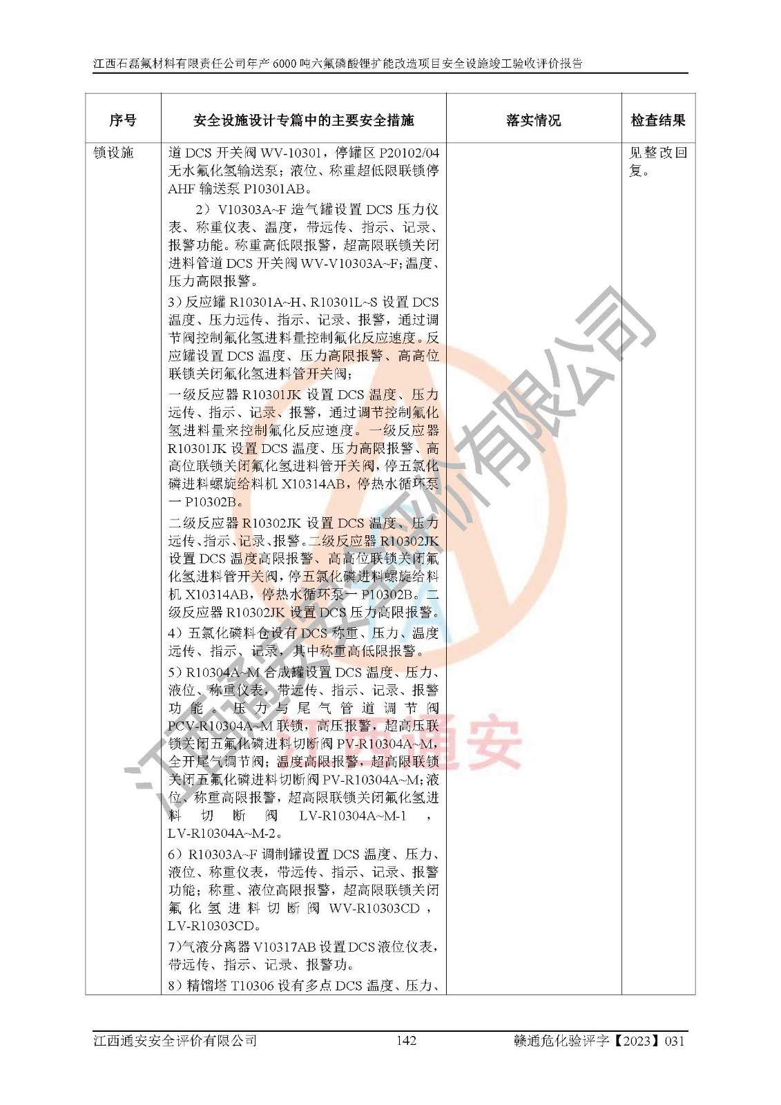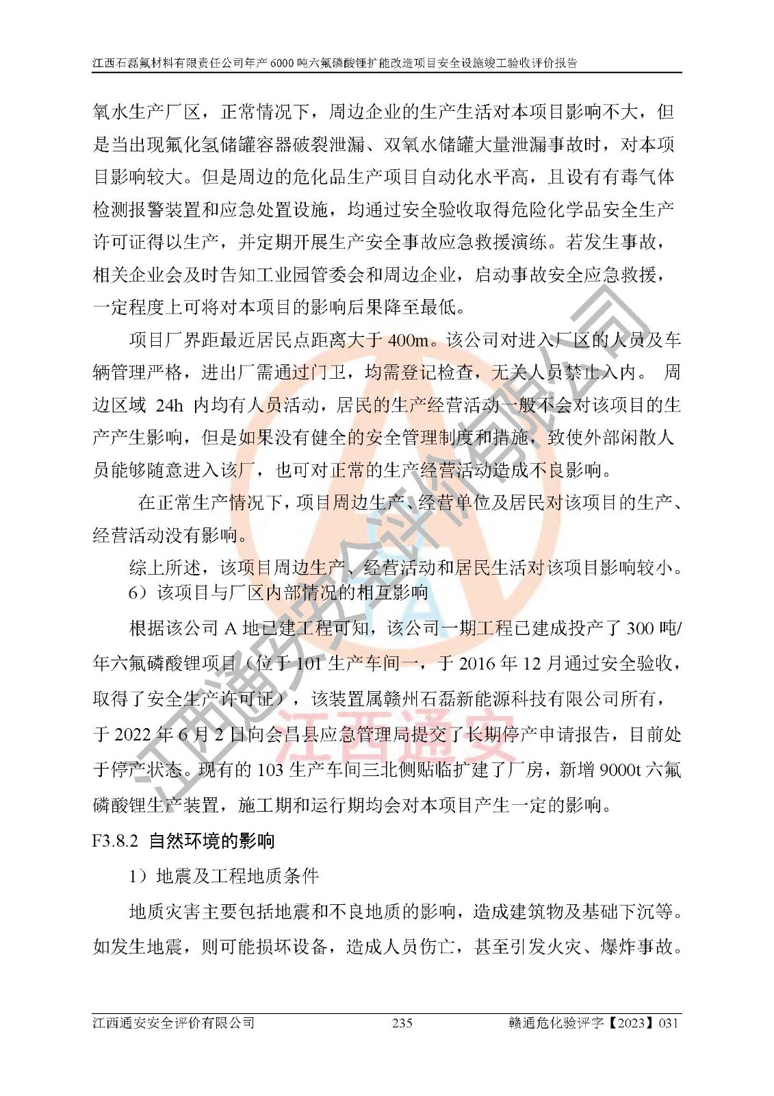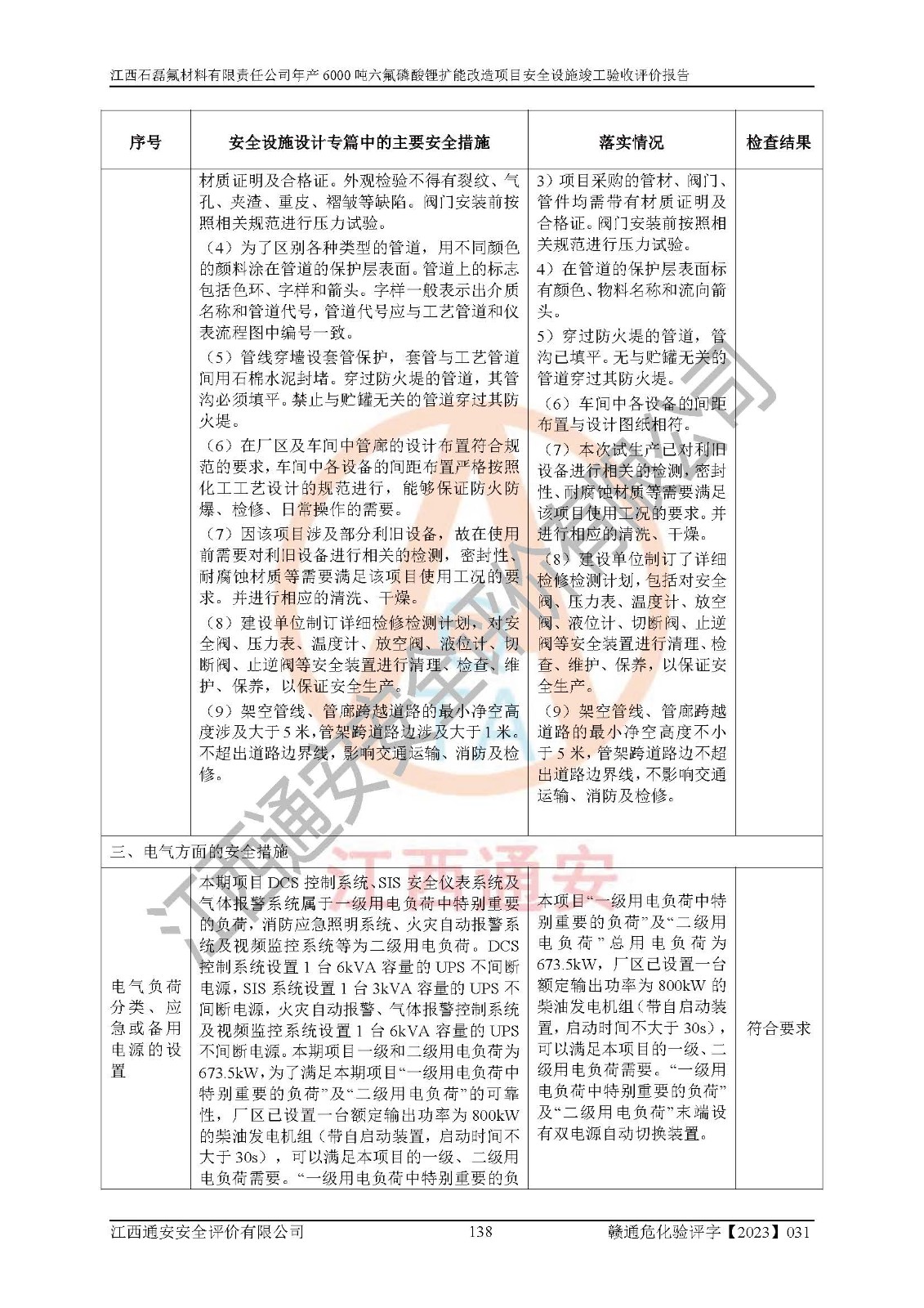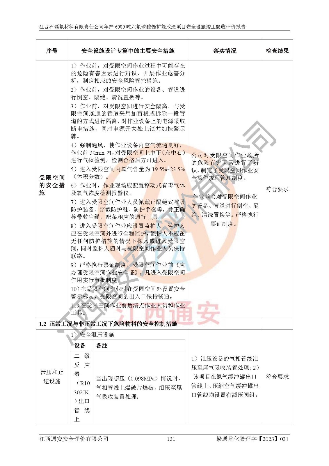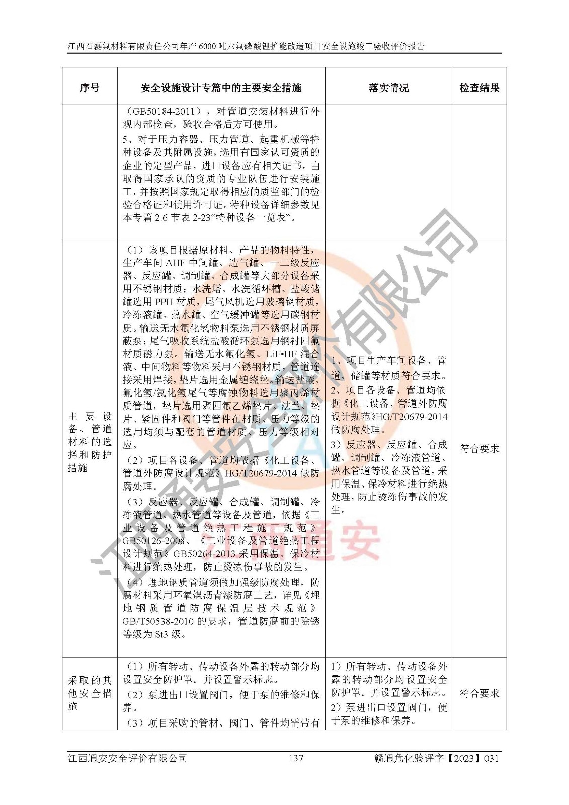 一、建设项目所在地的安全条件和与周边的安全防护距离 (1)该项目位于江西省赣州市会昌县氟盐化工产业基地,属于认定的化工园区,厂址选择合理,该项目与周边环境的防火间距符合规范的要求。 (2)重大危险源与“八类敏感场所及区域”的距离符合相关法律、法规的规定。 (3)该项目103生产车间三和201罐区一均构成**重大危险源。根据《危险化学品生产装置和储存设施外部安全防护距离确定方法》(GB/T 37243-2019)和《危险化学品生产装置和储存设施风险基准》(GB 36894-2018),该项目高敏感防护目标、重要防护目标、一般防护目标中的一类防护目标(<3×10-7)的外部安全防护距离包络线距离厂界*大值为76.36m,个人风险等值线范围内未出现该类防护目标;一般防护目标中的二类防护目标(<3×10-6)的外部安全防护距离包络线距离厂界*大值为51.62m,个人风险等值线范围内未涉及相应的防护目标;一般防护目标中的三类防护目标(<1×10-5)外部安全防护距离的包络线未出厂界。项目外部安全防护距离内无相应的防护目标,该项目不存在社会风险。 (4)该项目投产后在正常生产情况下,对其周边单位的生产、经营活动和居民的生活影响很小。在发生事故的情况下对周边单位的生产、经营活动和居民的生活存在影响。该项目周边单位的生产、经营活动和居民的生活对该项目投产后的正常生产影响很小。该项目所在地自然条件(不包括地震等破坏力**的自然灾害)的变化对该项目投产后的正常生产没有影响。 二、建设项目安全设施设计的采纳情况和已采用(取)的安全设施水平 该项目采用的主要安全设施包括了以下方面:检测、报警设施,设备安全防护设施,作业场所防护设施,安全警示标志,泄压和止逆设施,紧急处理设施,防止火灾蔓延设施,灭火设施,紧急个人处置设施,应急救援设施,劳动防护用品和装备等。 该项目在建设过程中采纳了《安全设施设计专篇》中的有关安全措施建议及要求,针对性的采取了相应的预防和控制措施,建设中未落实的安全措施,在试生产中已进行了整改。试生产表明该项目所采取的安全控制措施安全**,主要生产装置、设备运行平稳,安全可靠,安全水平较高,能够满足安全生产条件。 三、建设项目试生产(使用)后具备**现行有关安全生产法律、法规和部门规章及标准规定和要求的安全生产条件 1)法律法规等方面的符合性:该项目按照建设项目“三同时”要求,项目进行了备案、通过了安全条件审查、安全设施设计审查、试生产方案审查,立项审批手续齐全,安全设施设计、建设施工、施工监理均由有资质的单位承担,项目建设符合法律、法规规定的审批、施工、监理手续。项目建设期间,公司结合生产需要,增设了部分辅助设施和工艺管线,属于一般变更,试生产期间公司已委托河北英科石化工程有限公司进行了设计变更,作为已经审查通过的安全设施设计专篇的补充文件。 2)该项目与周边建构筑物的防火距离符合《精细化工企业工程设计防火标准》《建筑设计防火规范》的要求。根据《危险化学品生产装置和储存设施风险基准》GB36894-2018确定危险化学品单位周边重要目标和敏感场所承受的可容许个人风险和社会风险的定量风险评价。项目的个人风险计算结果表明,项目外部安全防护距离的包络线内无相应的防护目标。该软件未计算出社会风险。因此项目可容许个人风险和社会风险均在可接受范围内。 3)平面布置及常规防护设施措施的合理性:该项目生产场所、办公场所之间的间距满足安全要求,建筑结构、防火分区、防雷设施、安全出口的设置等满足安全生产的要求。消防道路的净宽度、净**、转弯半径均满足运输**及消防**通行。设置的常规防护设施、防止机械伤害、防急性中毒窒息的设施和措施符合要求。 4)设施、设备、装置及工艺方面的安全性:无**明令淘汰的工艺和 设备,该项目不涉及爆炸性危险区域划分。生产工艺操作和设置的安全设施满足安全需要,生产设施的布置能**人员疏散安全及操作方便。设施、设备、装置及工艺方面安全可靠。 5)特种设备、强制检测设备设施监督检验情况:该项目特种设备均进行了检验检测,并取得了检验报告;安全阀、压力表、有毒气体探头也进行了校验,校验结论合格,特种设备及安全附件符合《特种设备安全监察条例》 等相关法律法规、条例的规定。 6)公用工程、辅助设施的配套性:为该项目生产配套的供水、供电、 供气、供热等满足需要。 7)人员管理及安全培训方面充分性:公司现已建立了安全管理机构, 配备了专职安全管理人员。主要负责人王成具备化学工程与工艺专业本科学历,分管生产负责人曾中山具备化学工程与工艺专业本科学历,分管设备和技术负责人刘辉涛具备应用化学专业本科学历。专职安全管理人员共4人,配有一名注册安全工程师,专职安全管理人员均具有大专以上化工及安全专业相关学历。重点监管化工工艺的生产装置、储存设施操作人员具备高中及以上学历或化工类中等及以上职业教育水平。该公司制定了较完善的安全管理制度、岗位责任制、安全操作规程,制度执行情况较好。该公司已为从业职工交纳了工伤**。该公司对操作员工进行相关的培训和教育,经培训合格后上岗。 8)应急救援**性:企业根据自身实际情况,将该项目按照《生产经 营单位生产安全事故