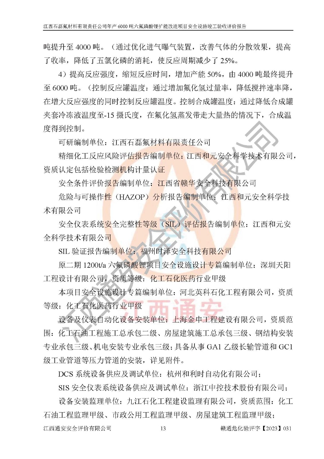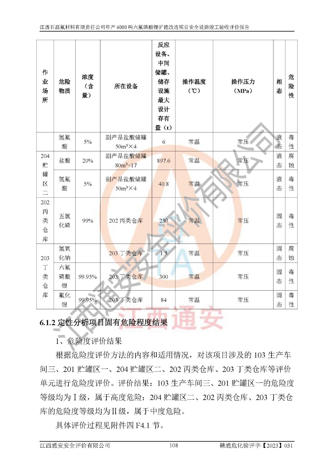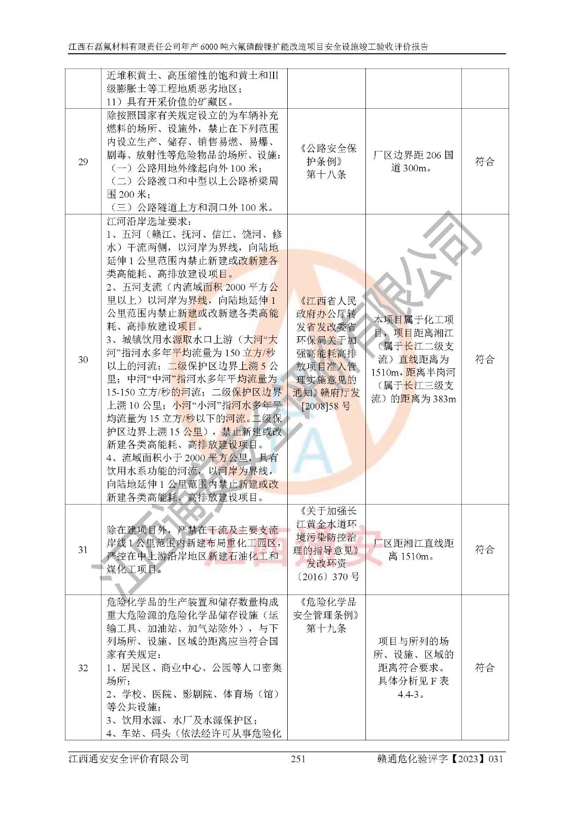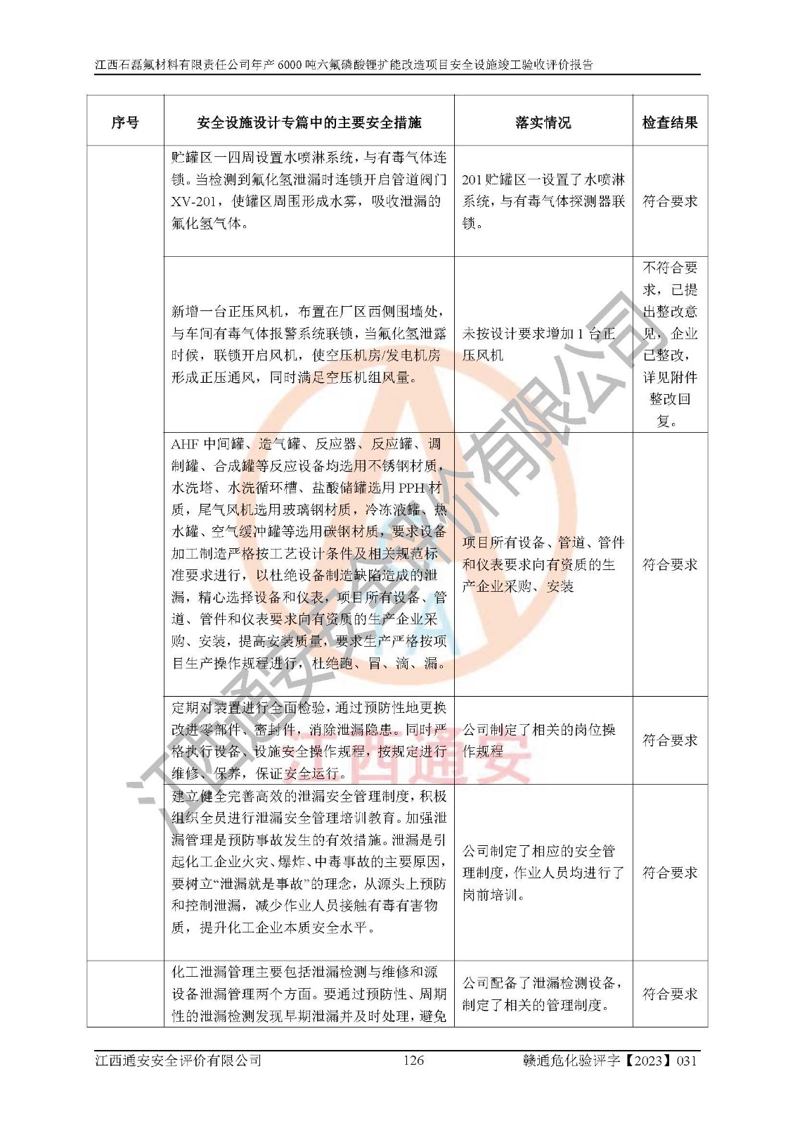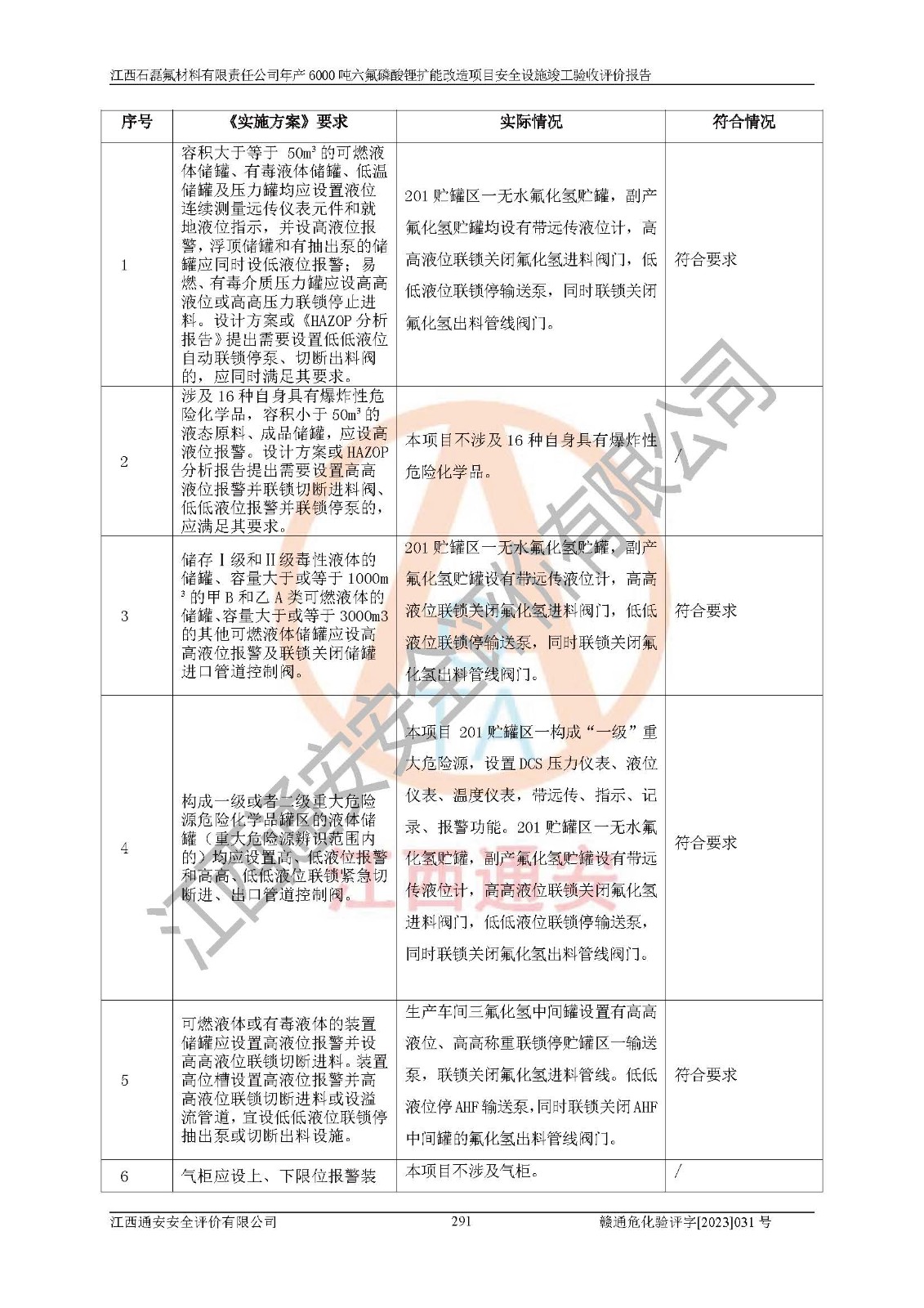 一、建设项目所在地的安全条件和与周边的安全防护距离 (1)该项目位于江西省赣州市会昌县氟盐化工产业基地,属于认定的化工园区,厂址选择合理,该项目与周边环境的防火间距符合规范的要求。 (2)重大危险源与“八类敏感场所及区域”的距离符合相关法律、法规的规定。 (3)该项目103生产车间三和201罐区一均构成**重大危险源。根据《危险化学品生产装置和储存设施外部安全防护距离确定方法》(GB/T 37243-2019)和《危险化学品生产装置和储存设施风险基准》(GB 36894-2018),该项目高敏感防护目标、重要防护目标、一般防护目标中的一类防护目标(<3×10-7)的外部安全防护距离包络线距离厂界*大值为76.36m,个人风险等值线范围内未出现该类防护目标;一般防护目标中的二类防护目标(<3×10-6)的外部安全防护距离包络线距离厂界*大值为51.62m,个人风险等值线范围内未涉及相应的防护目标;一般防护目标中的三类防护目标(<1×10-5)外部安全防护距离的包络线未出厂界。项目外部安全防护距离内无相应的防护目标,该项目不存在社会风险。 (4)该项目投产后在正常生产情况下,对其周边单位的生产、经营活动和居民的生活影响很小。在发生事故的情况下对周边单位的生产、经营活动和居民的生活存在影响。该项目周边单位的生产、经营活动和居民的生活对该项目投产后的正常生产影响很小。该项目所在地自然条件(不包括地震等破坏力**的自然灾害)的变化对该项目投产后的正常生产没有影响。 二、建设项目安全设施设计的采纳情况和已采用(取)的安全设施水平 该项目采用的主要安全设施包括了以下方面:检测、报警设施,设备安全防护设施,作业场所防护设施,安全警示标志,泄压和止逆设施,紧急处理设施,防止火灾蔓延设施,灭火设施,紧急个人处置设施,应急救援设施,劳动防护用品和装备等。 该项目在建设过程中采纳了《安全设施设计专篇》中的有关安全措施建议及要求,针对性的采取了相应的预防和控制措施,建设中未落实的安全措施,在试生产中已进行了整改。试生产表明该项目所采取的安全控制措施安全**,主要生产装置、设备运行平稳,安全可靠,安全水平较高,能够满足安全生产条件。 三、建设项目试生产(使用)后具备**现行有关安全生产法律、法规和部门规章及标准规定和要求的安全生产条件 1)法律法规等方面的符合性:该项目按照建设项目“三同时”要求,项目进行了备案、通过了安全条件审查、安全设施设计审查、试生产方案审查,立项审批手续齐全,安全设施设计、建设施工、施工监理均由有资质的单位承担,项目建设符合法律、法规规定的审批、施工、监理手续。项目建设期间,公司结合生产需要,增设了部分辅助设施和工艺管线,属于一般变更,试生产期间公司已委托河北英科石化工程有限公司进行了设计变更,作为已经审查通过的安全设施设计专篇的补充文件。 2)该项目与周边建构筑物的防火距离符合《精细化工企业工程设计防火标准》《建筑设计防火规范》的要求。根据《危险化学品生产装置和储存设施风险基准》GB36894-2018确定危险化学品单位周边重要目标和敏感场所承受的可容许个人风险和社会风险的定量风险评价。项目的个人风险计算结果表明,项目外部安全防护距离的包络线内无相应的防护目标。该软件未计算出社会风险。因此项目可容许个人风险和社会风险均在可接受范围内。 3)平面布置及常规防护设施措施的合理性:该项目生产场所、办公场所之间的间距满足安全要求,建筑结构、防火分区、防雷设施、安全出口的设置等满足安全生产的要求。消防道路的净宽度、净**、转弯半径均满足运输**及消防**通行。设置的常规防护设施、防止机械伤害、防急性中毒窒息的设施和措施符合要求。 4)设施、设备、装置及工艺方面的安全性:无**明令淘汰的工艺和 设备,该项目不涉及爆炸性危险区域划分。生产工艺操作和设置的安全设施满足安全需要,生产设施的布置能**人员疏散安全及操作方便。设施、设备、装置及工艺方面安全可靠。 5)特种设备、强制检测设备设施监督检验情况:该项目特种设备均进行了检验检测,并取得了检验报告;安全阀、压力表、有毒气体探头也进行了校验,校验结论合格,特种设备及安全附件符合《特种设备安全监察条例》 等相关法律法规、条例的规定。 6)公用工程、辅助设施的配套性:为该项目生产配套的供水、供电、 供气、供热等满足需要。 7)人员管理及安全培训方面充分性:公司现已建立了安全管理机构, 配备了专职安全管理人员。主要负责人王成具备化学工程与工艺专业本科学历,分管生产负责人曾中山具备化学工程与工艺专业本科学历,分管设备和技术负责人刘辉涛具备应用化学专业本科学历。专职安全管理人员共4人,配有一名注册安全工程师,专职安全管理人员均具有大专以上化工及安全专业相关学历。重点监管化工工艺的生产装置、储存设施操作人员具备高中及以上学历或化工类中等及以上职业教育水平。该公司制定了较完善的安全管理制度、岗位责任制、安全操作规程,制度执行情况较好。该公司已为从业职工交纳了工伤**。该公司对操作员工进行相关的培训和教育,经培训合格后上岗。 8)应急救援**性:企业根据自身实际情况,将该项目按照《生产经 营单位生产安全事故