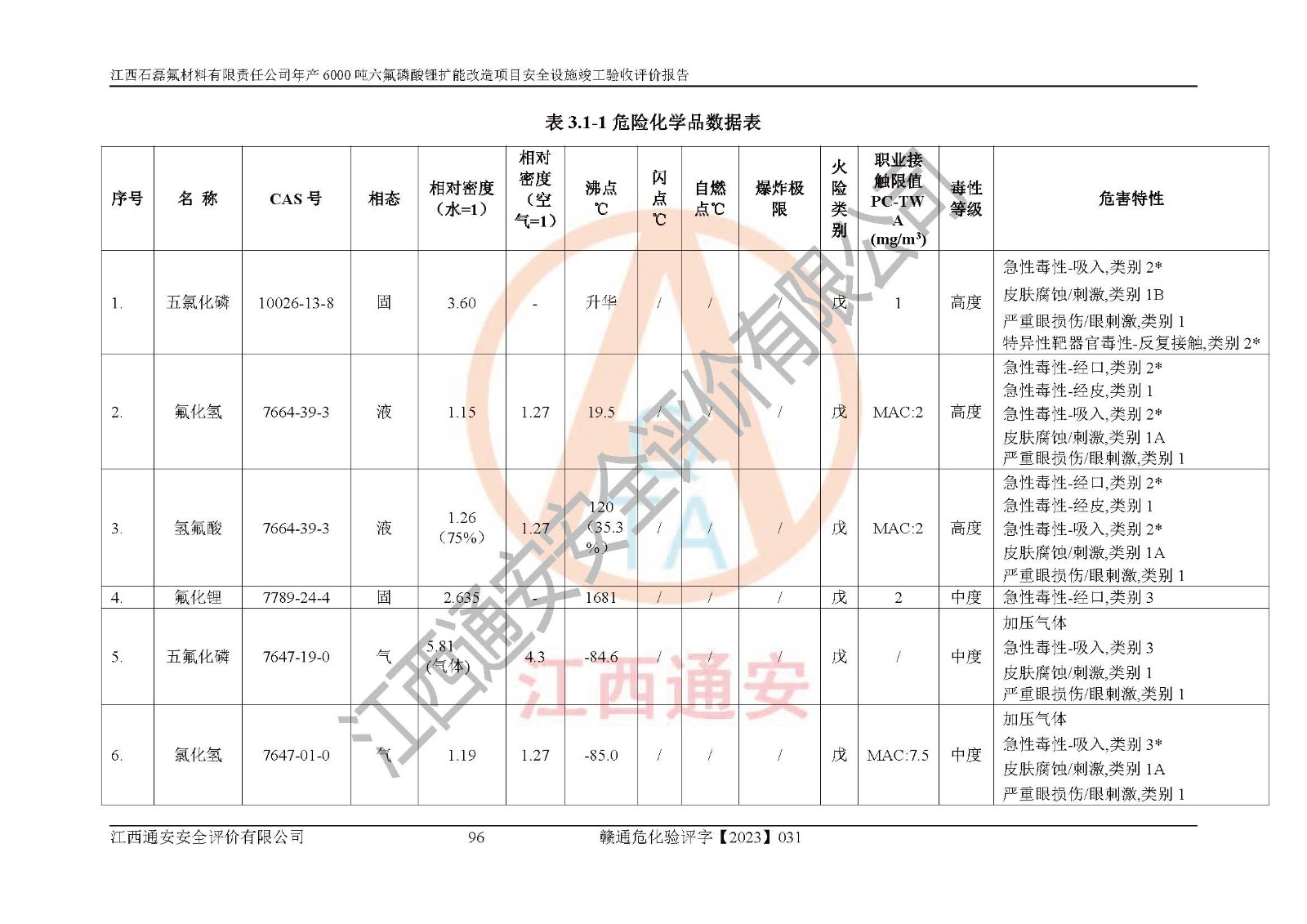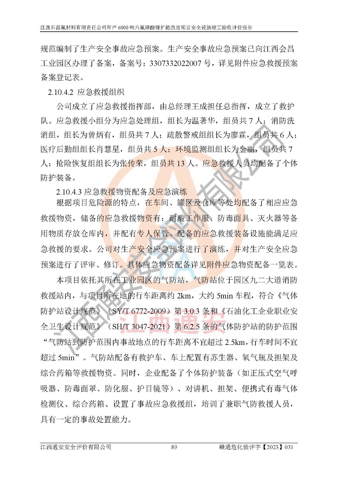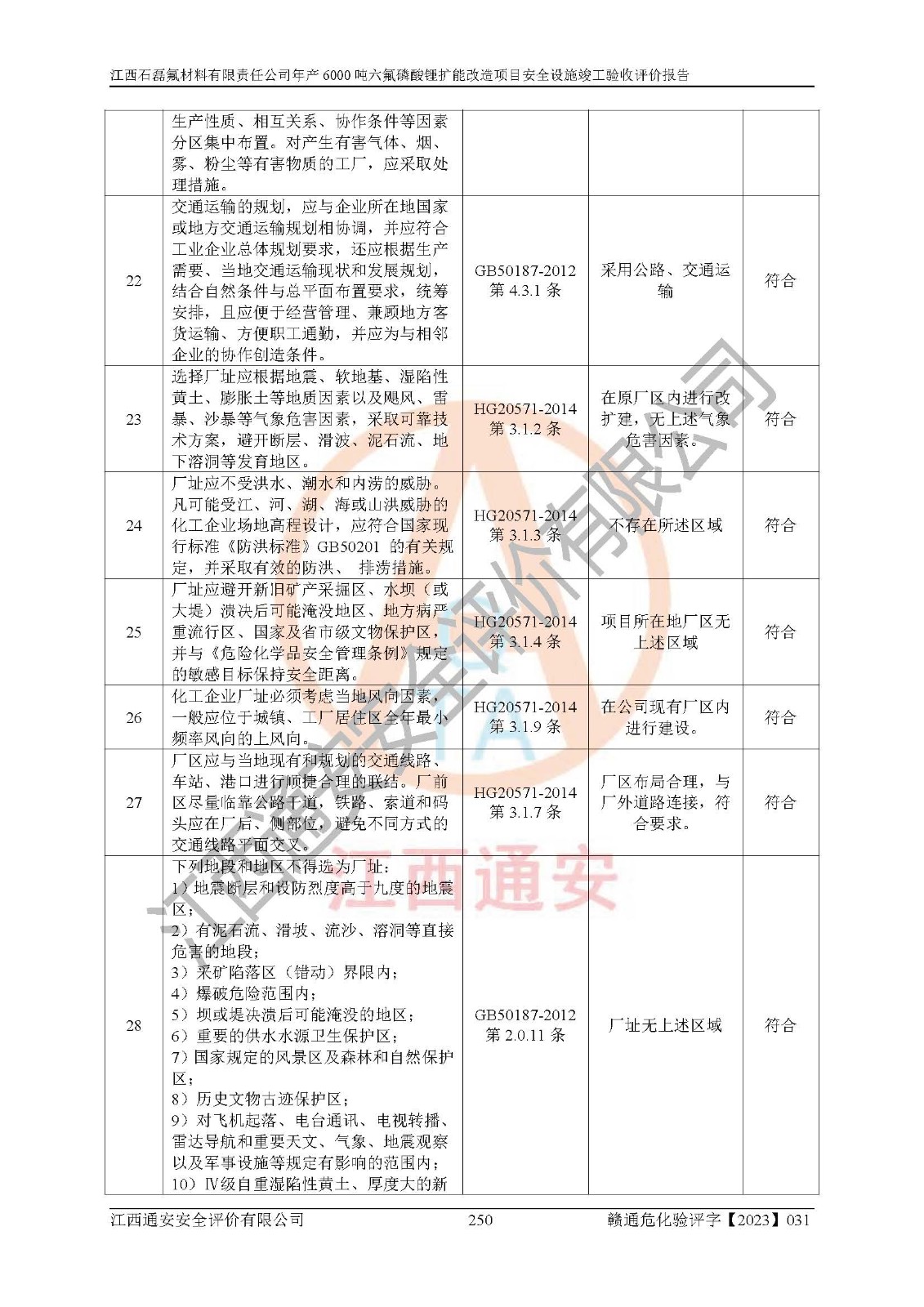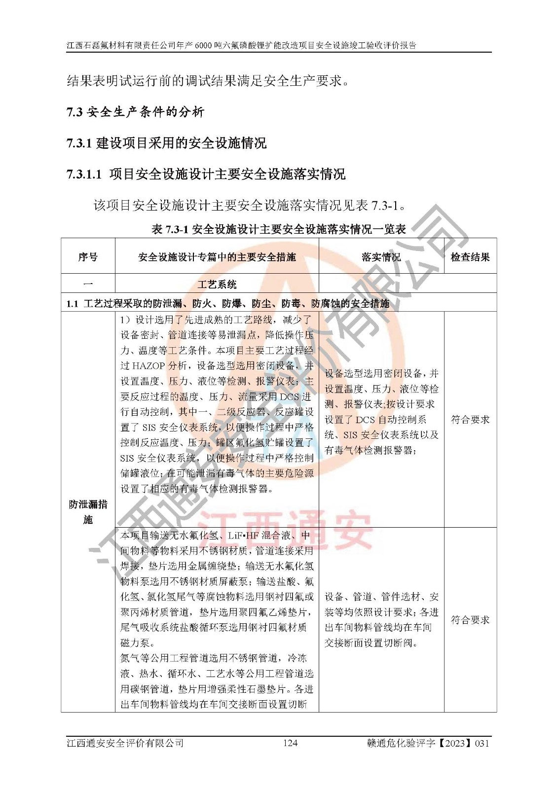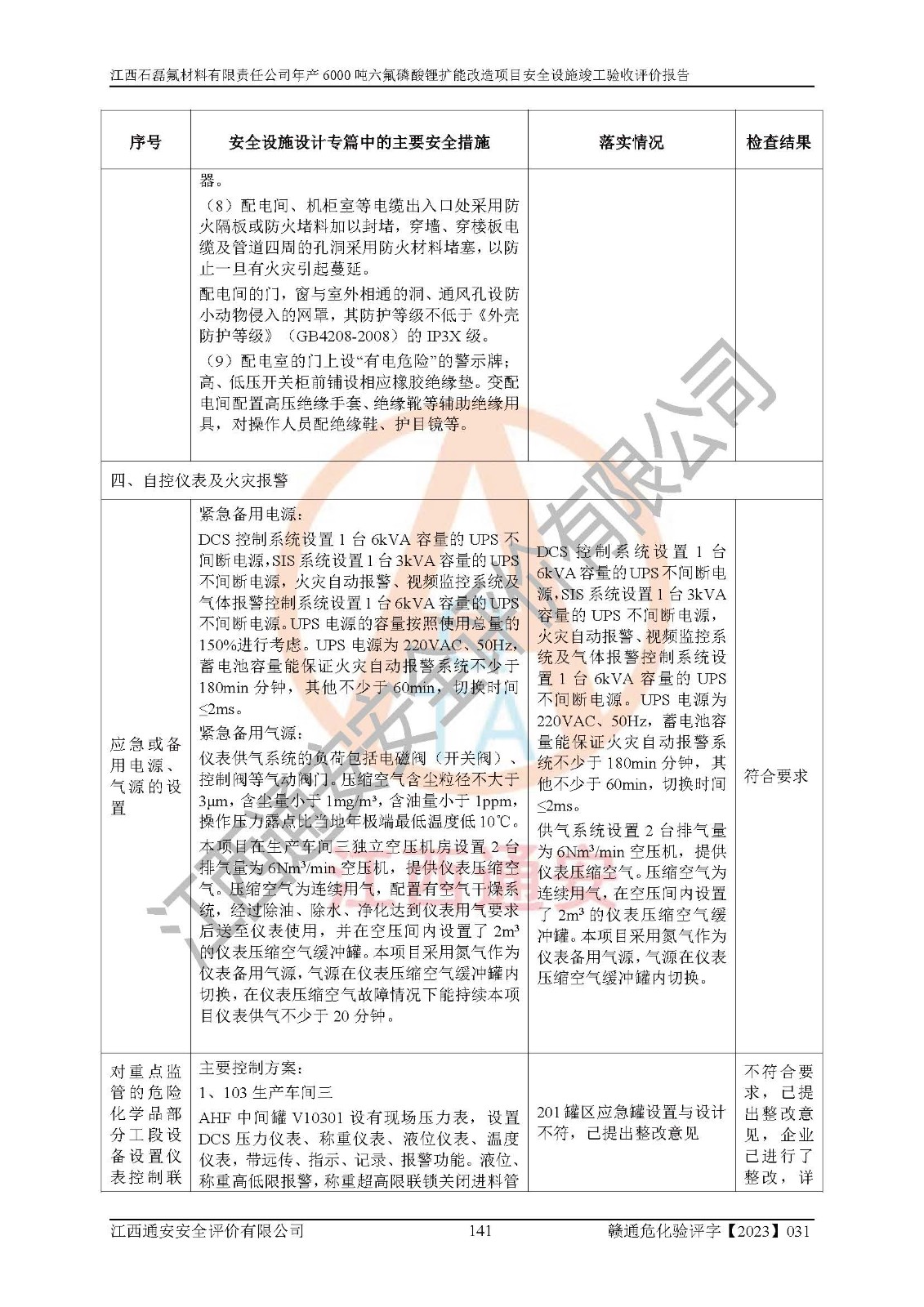 一、建设项目所在地的安全条件和与周边的安全防护距离 (1)该项目位于江西省赣州市会昌县氟盐化工产业基地,属于认定的化工园区,厂址选择合理,该项目与周边环境的防火间距符合规范的要求。 (2)重大危险源与“八类敏感场所及区域”的距离符合相关法律、法规的规定。 (3)该项目103生产车间三和201罐区一均构成**重大危险源。根据《危险化学品生产装置和储存设施外部安全防护距离确定方法》(GB/T 37243-2019)和《危险化学品生产装置和储存设施风险基准》(GB 36894-2018),该项目高敏感防护目标、重要防护目标、一般防护目标中的一类防护目标(<3×10-7)的外部安全防护距离包络线距离厂界*大值为76.36m,个人风险等值线范围内未出现该类防护目标;一般防护目标中的二类防护目标(<3×10-6)的外部安全防护距离包络线距离厂界*大值为51.62m,个人风险等值线范围内未涉及相应的防护目标;一般防护目标中的三类防护目标(<1×10-5)外部安全防护距离的包络线未出厂界。项目外部安全防护距离内无相应的防护目标,该项目不存在社会风险。 (4)该项目投产后在正常生产情况下,对其周边单位的生产、经营活动和居民的生活影响很小。在发生事故的情况下对周边单位的生产、经营活动和居民的生活存在影响。该项目周边单位的生产、经营活动和居民的生活对该项目投产后的正常生产影响很小。该项目所在地自然条件(不包括地震等破坏力**的自然灾害)的变化对该项目投产后的正常生产没有影响。 二、建设项目安全设施设计的采纳情况和已采用(取)的安全设施水平 该项目采用的主要安全设施包括了以下方面:检测、报警设施,设备安全防护设施,作业场所防护设施,安全警示标志,泄压和止逆设施,紧急处理设施,防止火灾蔓延设施,灭火设施,紧急个人处置设施,应急救援设施,劳动防护用品和装备等。 该项目在建设过程中采纳了《安全设施设计专篇》中的有关安全措施建议及要求,针对性的采取了相应的预防和控制措施,建设中未落实的安全措施,在试生产中已进行了整改。试生产表明该项目所采取的安全控制措施安全**,主要生产装置、设备运行平稳,安全可靠,安全水平较高,能够满足安全生产条件。 三、建设项目试生产(使用)后具备**现行有关安全生产法律、法规和部门规章及标准规定和要求的安全生产条件 1)法律法规等方面的符合性:该项目按照建设项目“三同时”要求,项目进行了备案、通过了安全条件审查、安全设施设计审查、试生产方案审查,立项审批手续齐全,安全设施设计、建设施工、施工监理均由有资质的单位承担,项目建设符合法律、法规规定的审批、施工、监理手续。项目建设期间,公司结合生产需要,增设了部分辅助设施和工艺管线,属于一般变更,试生产期间公司已委托河北英科石化工程有限公司进行了设计变更,作为已经审查通过的安全设施设计专篇的补充文件。 2)该项目与周边建构筑物的防火距离符合《精细化工企业工程设计防火标准》《建筑设计防火规范》的要求。根据《危险化学品生产装置和储存设施风险基准》GB36894-2018确定危险化学品单位周边重要目标和敏感场所承受的可容许个人风险和社会风险的定量风险评价。项目的个人风险计算结果表明,项目外部安全防护距离的包络线内无相应的防护目标。该软件未计算出社会风险。因此项目可容许个人风险和社会风险均在可接受范围内。 3)平面布置及常规防护设施措施的合理性:该项目生产场所、办公场所之间的间距满足安全要求,建筑结构、防火分区、防雷设施、安全出口的设置等满足安全生产的要求。消防道路的净宽度、净**、转弯半径均满足运输**及消防**通行。设置的常规防护设施、防止机械伤害、防急性中毒窒息的设施和措施符合要求。 4)设施、设备、装置及工艺方面的安全性:无**明令淘汰的工艺和 设备,该项目不涉及爆炸性危险区域划分。生产工艺操作和设置的安全设施满足安全需要,生产设施的布置能**人员疏散安全及操作方便。设施、设备、装置及工艺方面安全可靠。 5)特种设备、强制检测设备设施监督检验情况:该项目特种设备均进行了检验检测,并取得了检验报告;安全阀、压力表、有毒气体探头也进行了校验,校验结论合格,特种设备及安全附件符合《特种设备安全监察条例》 等相关法律法规、条例的规定。 6)公用工程、辅助设施的配套性:为该项目生产配套的供水、供电、 供气、供热等满足需要。 7)人员管理及安全培训方面充分性:公司现已建立了安全管理机构, 配备了专职安全管理人员。主要负责人王成具备化学工程与工艺专业本科学历,分管生产负责人曾中山具备化学工程与工艺专业本科学历,分管设备和技术负责人刘辉涛具备应用化学专业本科学历。专职安全管理人员共4人,配有一名注册安全工程师,专职安全管理人员均具有大专以上化工及安全专业相关学历。重点监管化工工艺的生产装置、储存设施操作人员具备高中及以上学历或化工类中等及以上职业教育水平。该公司制定了较完善的安全管理制度、岗位责任制、安全操作规程,制度执行情况较好。该公司已为从业职工交纳了工伤**。该公司对操作员工进行相关的培训和教育,经培训合格后上岗。 8)应急救援**性:企业根据自身实际情况,将该项目按照《生产经 营单位生产安全事故