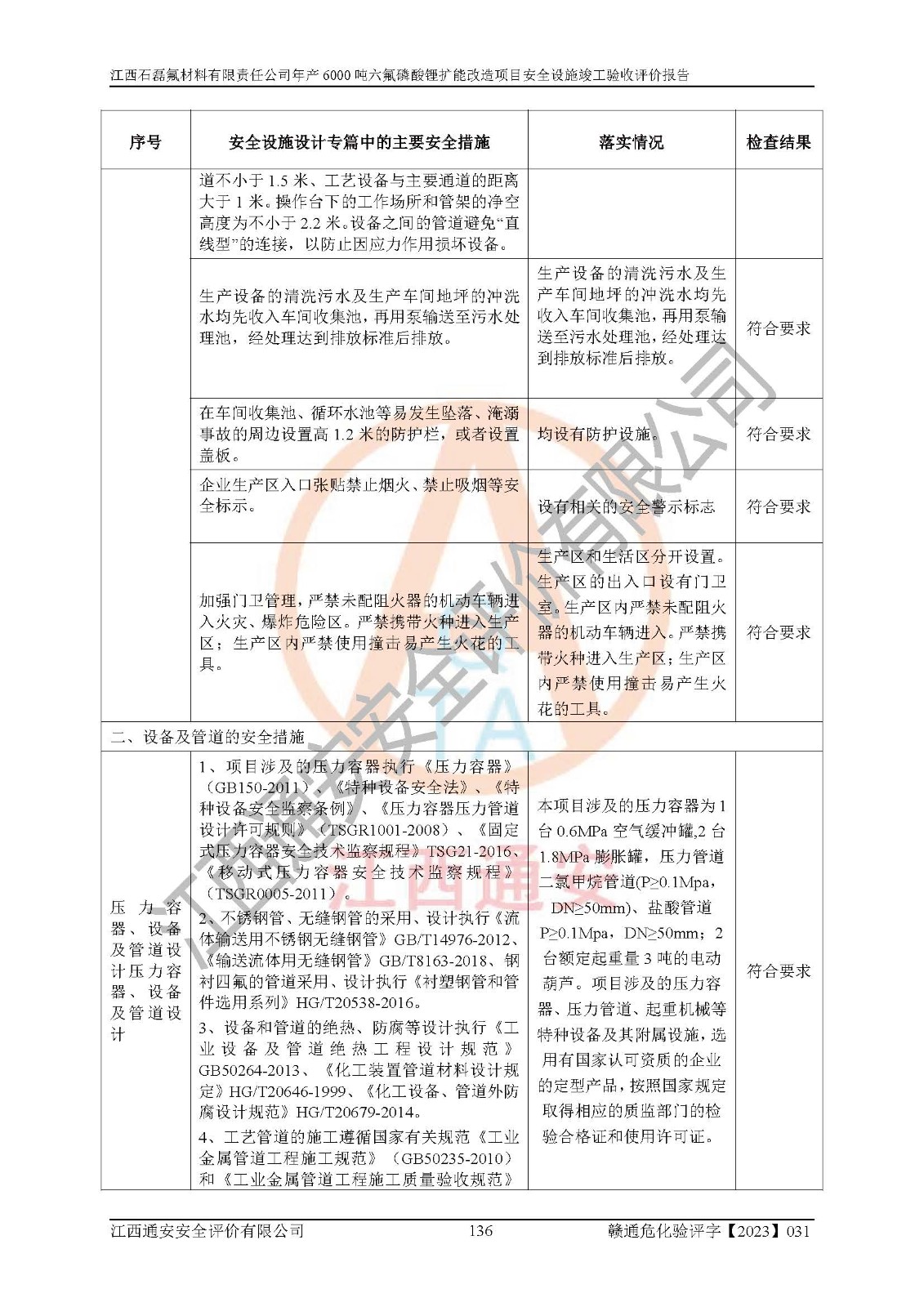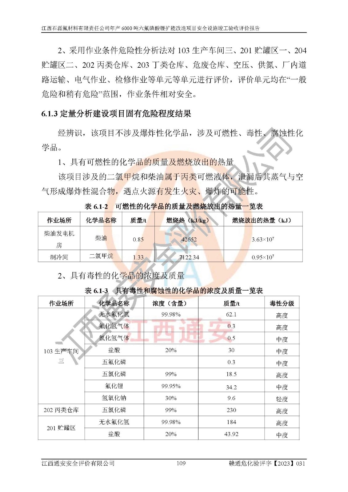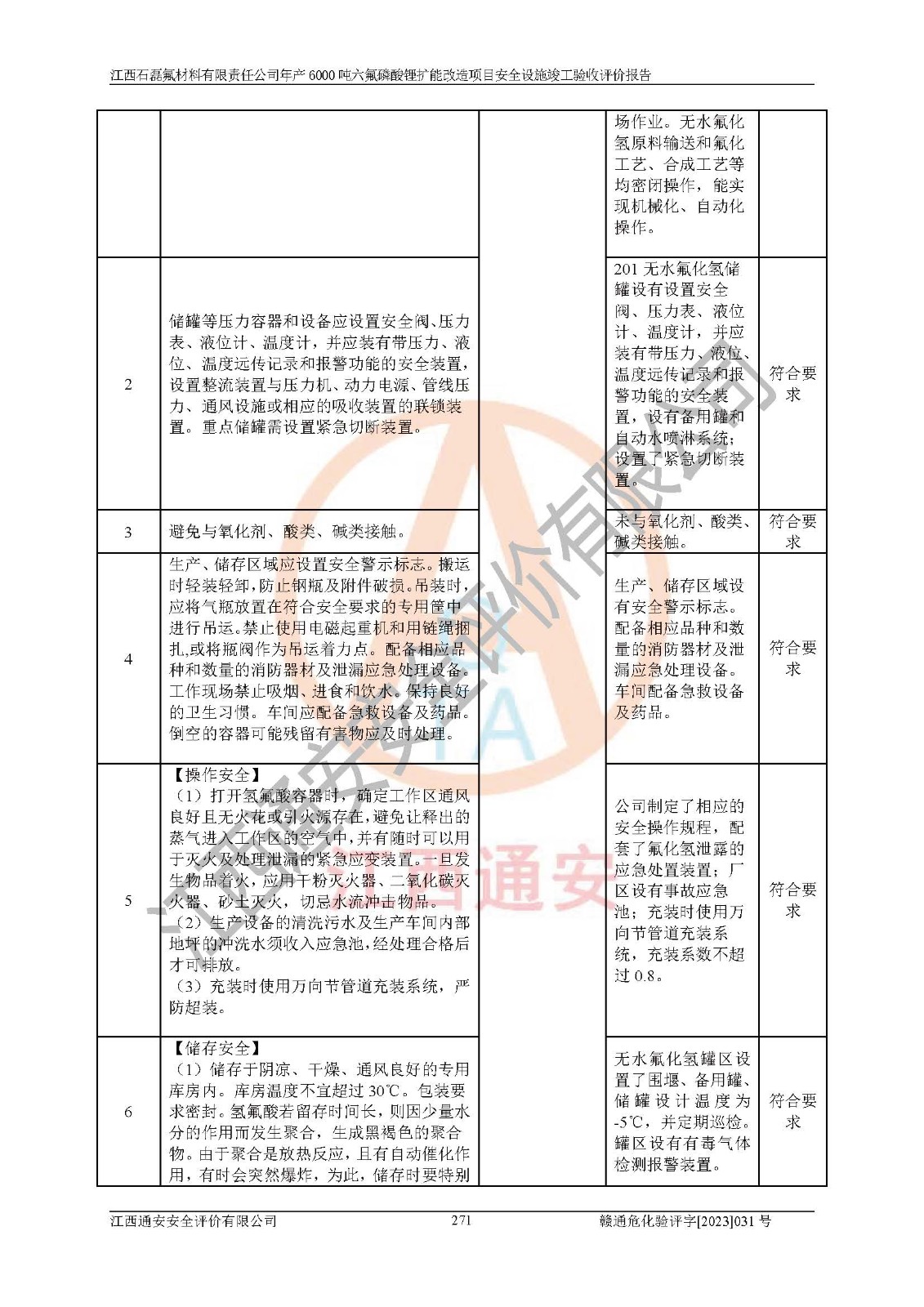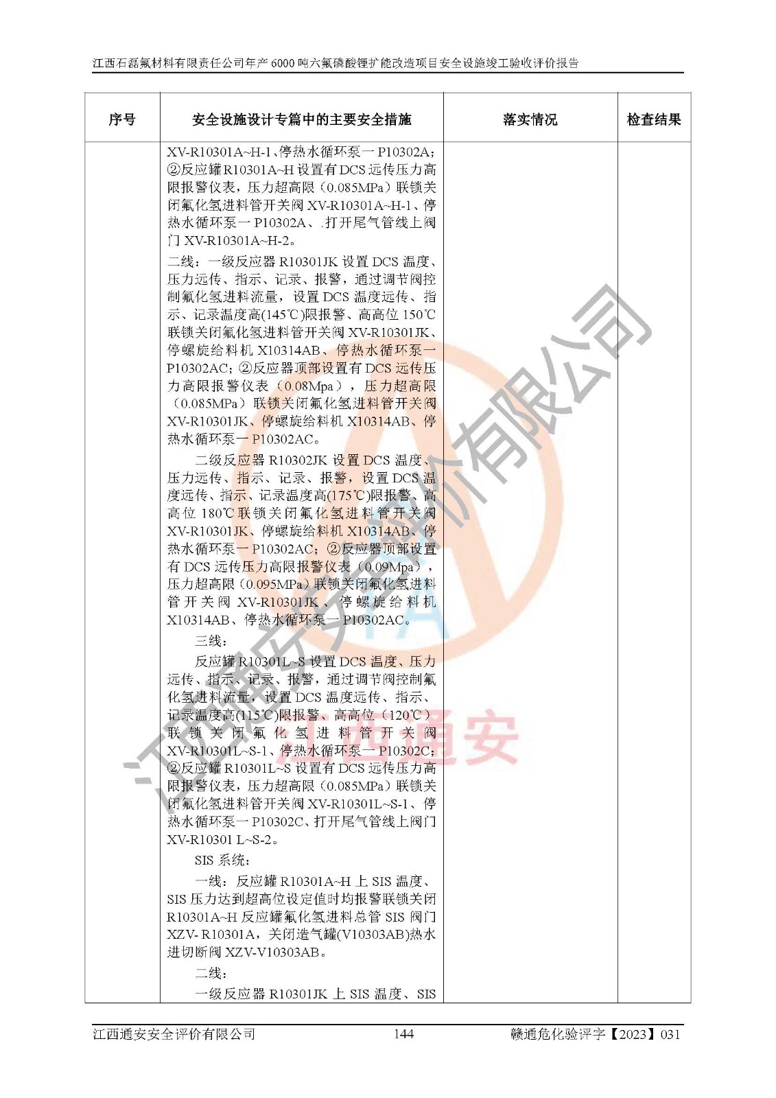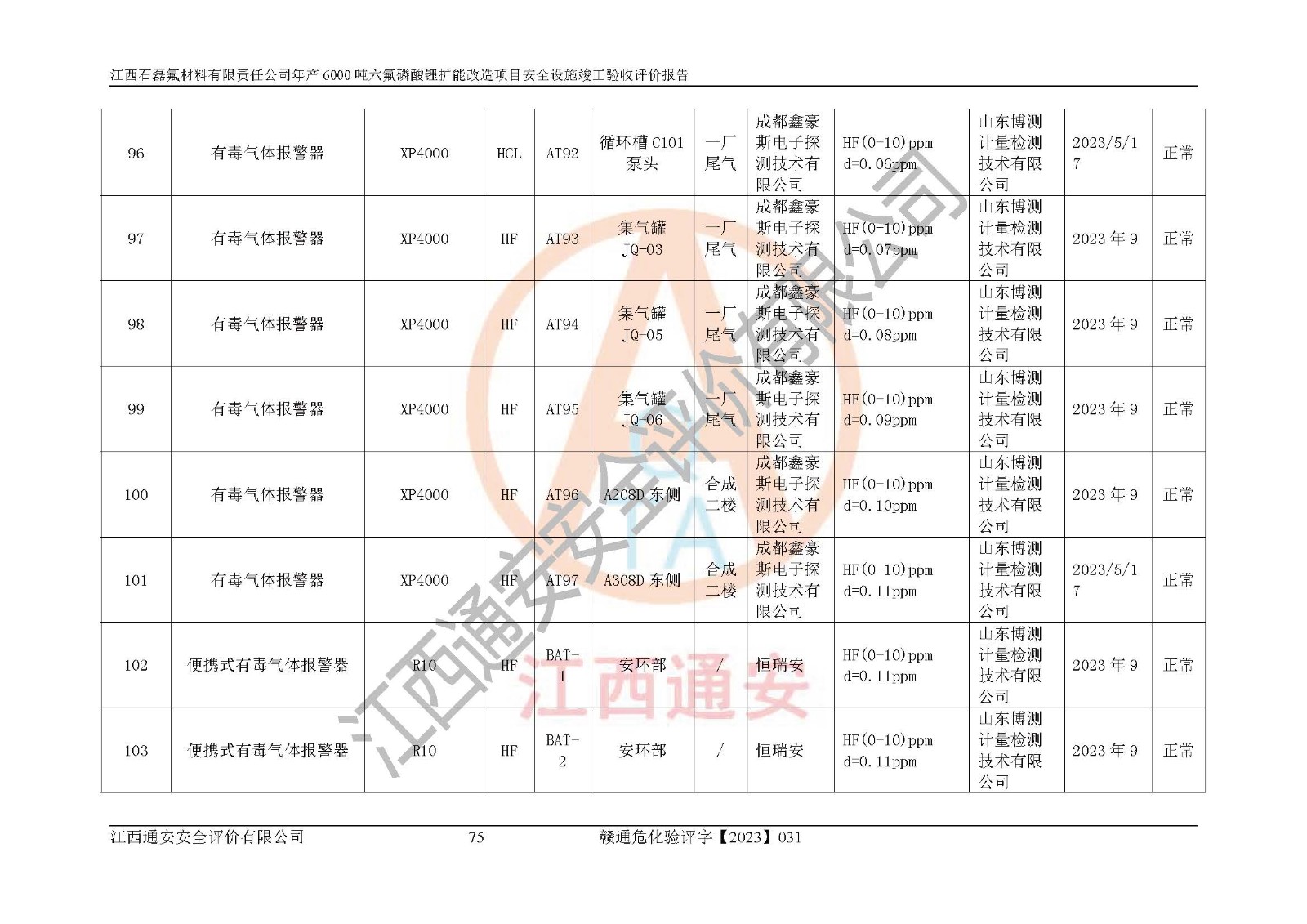 一、建设项目所在地的安全条件和与周边的安全防护距离 (1)该项目位于江西省赣州市会昌县氟盐化工产业基地,属于认定的化工园区,厂址选择合理,该项目与周边环境的防火间距符合规范的要求。 (2)重大危险源与“八类敏感场所及区域”的距离符合相关法律、法规的规定。 (3)该项目103生产车间三和201罐区一均构成**重大危险源。根据《危险化学品生产装置和储存设施外部安全防护距离确定方法》(GB/T 37243-2019)和《危险化学品生产装置和储存设施风险基准》(GB 36894-2018),该项目高敏感防护目标、重要防护目标、一般防护目标中的一类防护目标(<3×10-7)的外部安全防护距离包络线距离厂界*大值为76.36m,个人风险等值线范围内未出现该类防护目标;一般防护目标中的二类防护目标(<3×10-6)的外部安全防护距离包络线距离厂界*大值为51.62m,个人风险等值线范围内未涉及相应的防护目标;一般防护目标中的三类防护目标(<1×10-5)外部安全防护距离的包络线未出厂界。项目外部安全防护距离内无相应的防护目标,该项目不存在社会风险。 (4)该项目投产后在正常生产情况下,对其周边单位的生产、经营活动和居民的生活影响很小。在发生事故的情况下对周边单位的生产、经营活动和居民的生活存在影响。该项目周边单位的生产、经营活动和居民的生活对该项目投产后的正常生产影响很小。该项目所在地自然条件(不包括地震等破坏力**的自然灾害)的变化对该项目投产后的正常生产没有影响。 二、建设项目安全设施设计的采纳情况和已采用(取)的安全设施水平 该项目采用的主要安全设施包括了以下方面:检测、报警设施,设备安全防护设施,作业场所防护设施,安全警示标志,泄压和止逆设施,紧急处理设施,防止火灾蔓延设施,灭火设施,紧急个人处置设施,应急救援设施,劳动防护用品和装备等。 该项目在建设过程中采纳了《安全设施设计专篇》中的有关安全措施建议及要求,针对性的采取了相应的预防和控制措施,建设中未落实的安全措施,在试生产中已进行了整改。试生产表明该项目所采取的安全控制措施安全**,主要生产装置、设备运行平稳,安全可靠,安全水平较高,能够满足安全生产条件。 三、建设项目试生产(使用)后具备**现行有关安全生产法律、法规和部门规章及标准规定和要求的安全生产条件 1)法律法规等方面的符合性:该项目按照建设项目“三同时”要求,项目进行了备案、通过了安全条件审查、安全设施设计审查、试生产方案审查,立项审批手续齐全,安全设施设计、建设施工、施工监理均由有资质的单位承担,项目建设符合法律、法规规定的审批、施工、监理手续。项目建设期间,公司结合生产需要,增设了部分辅助设施和工艺管线,属于一般变更,试生产期间公司已委托河北英科石化工程有限公司进行了设计变更,作为已经审查通过的安全设施设计专篇的补充文件。 2)该项目与周边建构筑物的防火距离符合《精细化工企业工程设计防火标准》《建筑设计防火规范》的要求。根据《危险化学品生产装置和储存设施风险基准》GB36894-2018确定危险化学品单位周边重要目标和敏感场所承受的可容许个人风险和社会风险的定量风险评价。项目的个人风险计算结果表明,项目外部安全防护距离的包络线内无相应的防护目标。该软件未计算出社会风险。因此项目可容许个人风险和社会风险均在可接受范围内。 3)平面布置及常规防护设施措施的合理性:该项目生产场所、办公场所之间的间距满足安全要求,建筑结构、防火分区、防雷设施、安全出口的设置等满足安全生产的要求。消防道路的净宽度、净**、转弯半径均满足运输**及消防**通行。设置的常规防护设施、防止机械伤害、防急性中毒窒息的设施和措施符合要求。 4)设施、设备、装置及工艺方面的安全性:无**明令淘汰的工艺和 设备,该项目不涉及爆炸性危险区域划分。生产工艺操作和设置的安全设施满足安全需要,生产设施的布置能**人员疏散安全及操作方便。设施、设备、装置及工艺方面安全可靠。 5)特种设备、强制检测设备设施监督检验情况:该项目特种设备均进行了检验检测,并取得了检验报告;安全阀、压力表、有毒气体探头也进行了校验,校验结论合格,特种设备及安全附件符合《特种设备安全监察条例》 等相关法律法规、条例的规定。 6)公用工程、辅助设施的配套性:为该项目生产配套的供水、供电、 供气、供热等满足需要。 7)人员管理及安全培训方面充分性:公司现已建立了安全管理机构, 配备了专职安全管理人员。主要负责人王成具备化学工程与工艺专业本科学历,分管生产负责人曾中山具备化学工程与工艺专业本科学历,分管设备和技术负责人刘辉涛具备应用化学专业本科学历。专职安全管理人员共4人,配有一名注册安全工程师,专职安全管理人员均具有大专以上化工及安全专业相关学历。重点监管化工工艺的生产装置、储存设施操作人员具备高中及以上学历或化工类中等及以上职业教育水平。该公司制定了较完善的安全管理制度、岗位责任制、安全操作规程,制度执行情况较好。该公司已为从业职工交纳了工伤**。该公司对操作员工进行相关的培训和教育,经培训合格后上岗。 8)应急救援**性:企业根据自身实际情况,将该项目按照《生产经 营单位生产安全事故