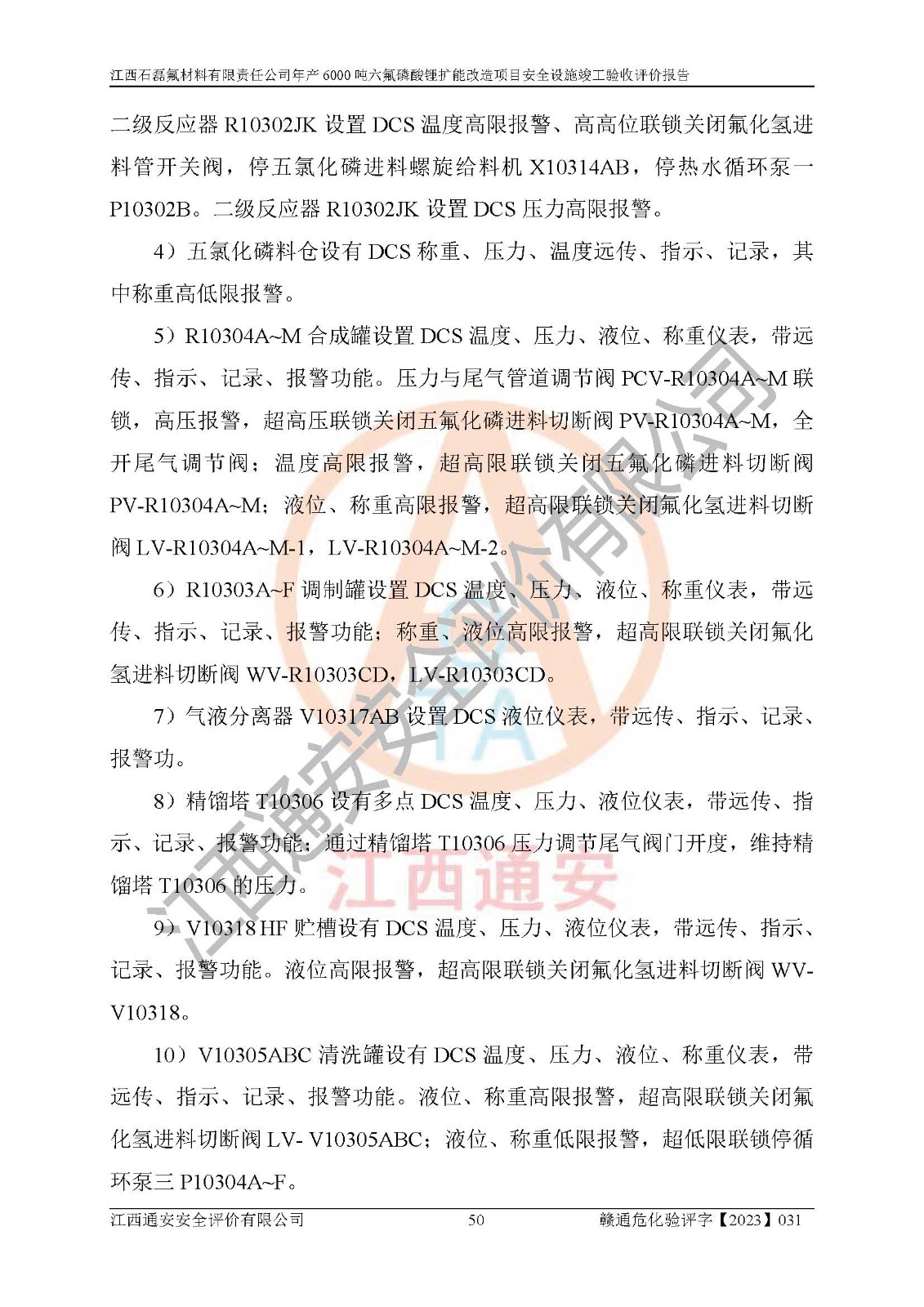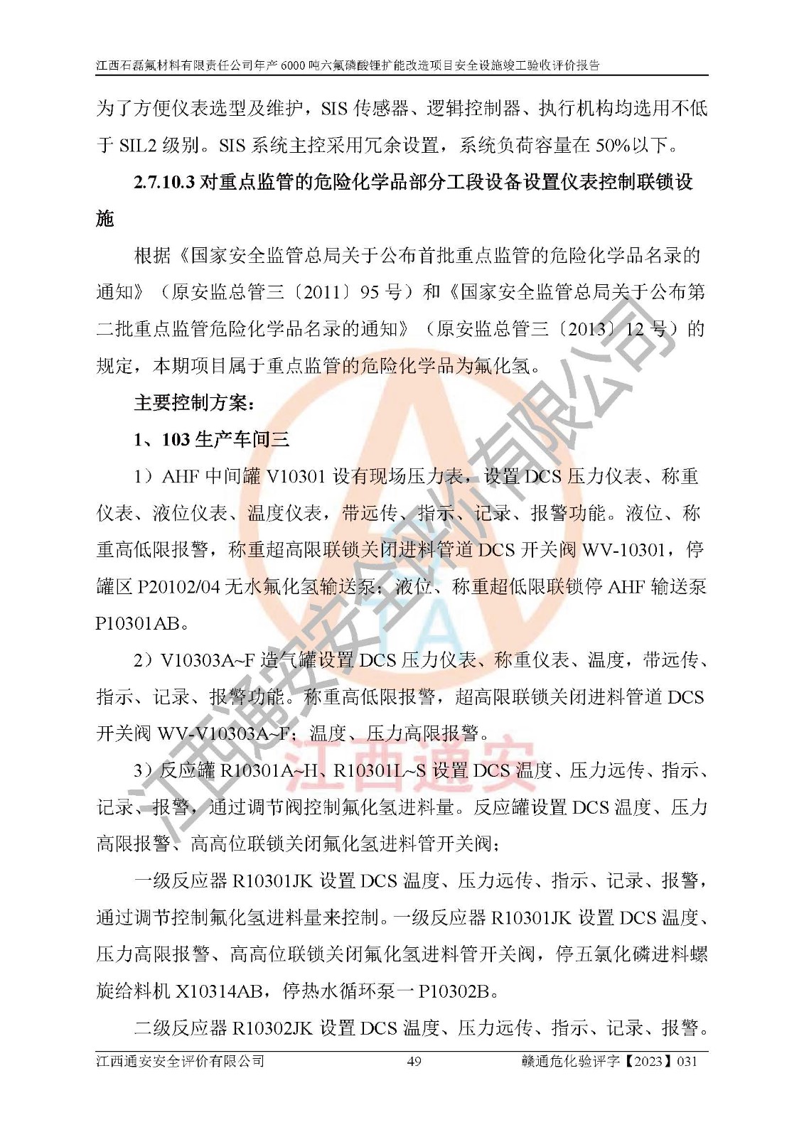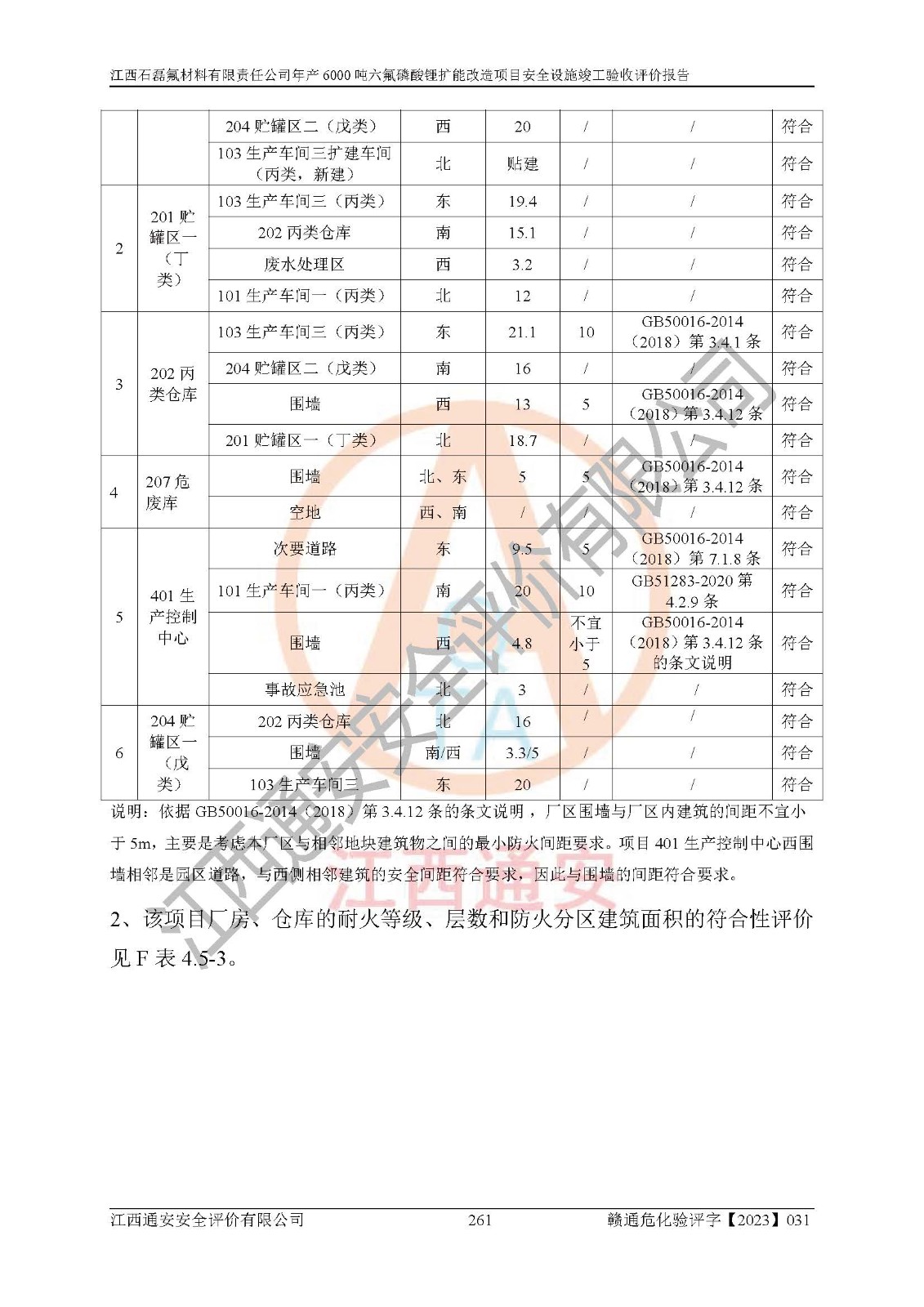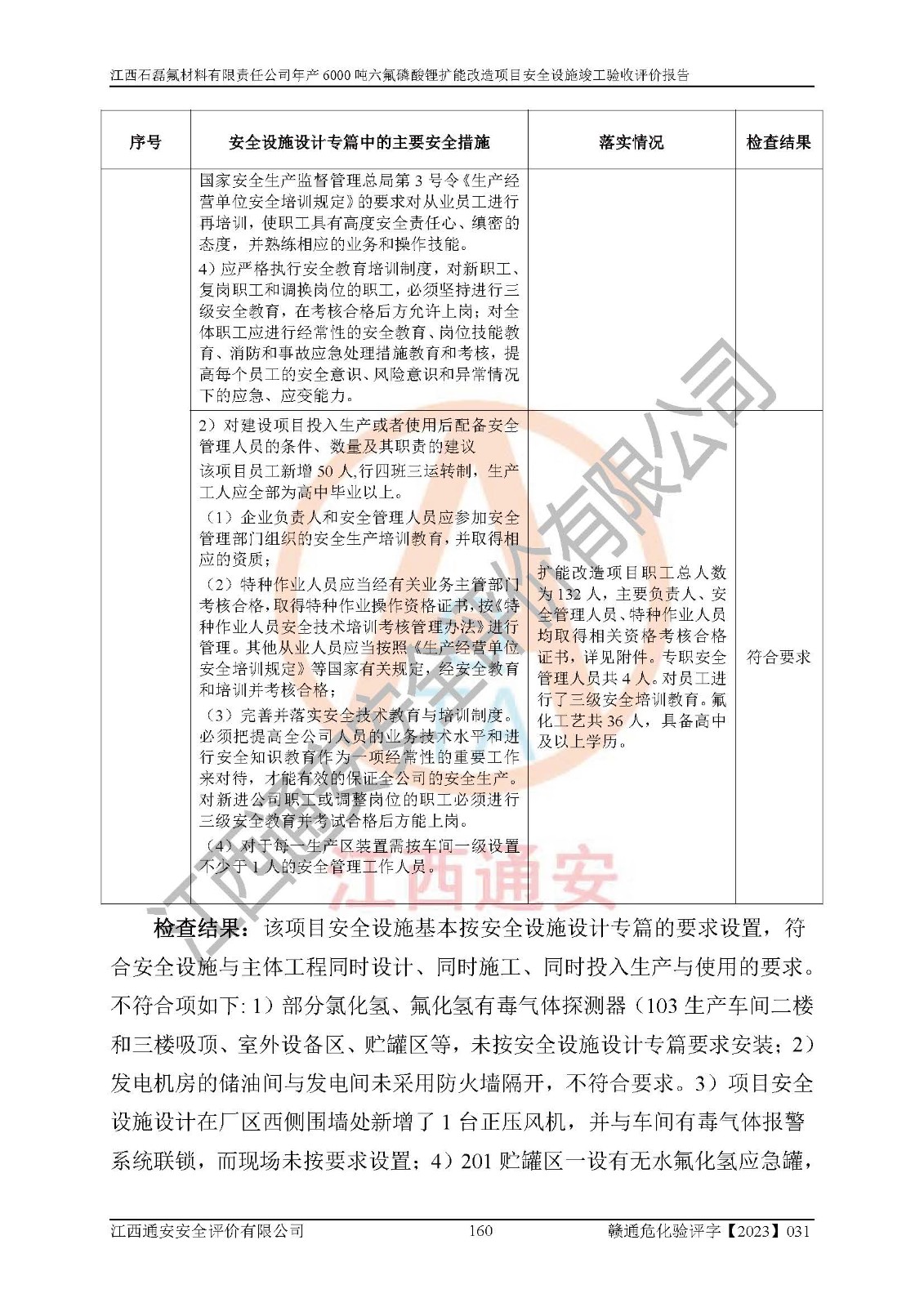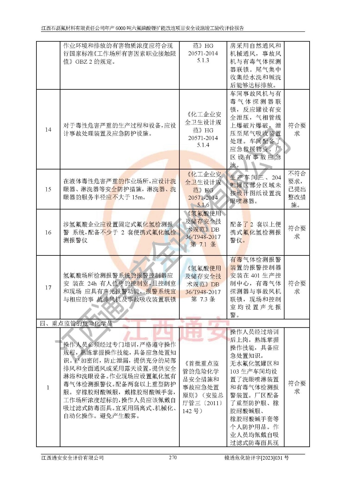 一、建设项目所在地的安全条件和与周边的安全防护距离 (1)该项目位于江西省赣州市会昌县氟盐化工产业基地,属于认定的化工园区,厂址选择合理,该项目与周边环境的防火间距符合规范的要求。 (2)重大危险源与“八类敏感场所及区域”的距离符合相关法律、法规的规定。 (3)该项目103生产车间三和201罐区一均构成**重大危险源。根据《危险化学品生产装置和储存设施外部安全防护距离确定方法》(GB/T 37243-2019)和《危险化学品生产装置和储存设施风险基准》(GB 36894-2018),该项目高敏感防护目标、重要防护目标、一般防护目标中的一类防护目标(<3×10-7)的外部安全防护距离包络线距离厂界*大值为76.36m,个人风险等值线范围内未出现该类防护目标;一般防护目标中的二类防护目标(<3×10-6)的外部安全防护距离包络线距离厂界*大值为51.62m,个人风险等值线范围内未涉及相应的防护目标;一般防护目标中的三类防护目标(<1×10-5)外部安全防护距离的包络线未出厂界。项目外部安全防护距离内无相应的防护目标,该项目不存在社会风险。 (4)该项目投产后在正常生产情况下,对其周边单位的生产、经营活动和居民的生活影响很小。在发生事故的情况下对周边单位的生产、经营活动和居民的生活存在影响。该项目周边单位的生产、经营活动和居民的生活对该项目投产后的正常生产影响很小。该项目所在地自然条件(不包括地震等破坏力**的自然灾害)的变化对该项目投产后的正常生产没有影响。 二、建设项目安全设施设计的采纳情况和已采用(取)的安全设施水平 该项目采用的主要安全设施包括了以下方面:检测、报警设施,设备安全防护设施,作业场所防护设施,安全警示标志,泄压和止逆设施,紧急处理设施,防止火灾蔓延设施,灭火设施,紧急个人处置设施,应急救援设施,劳动防护用品和装备等。 该项目在建设过程中采纳了《安全设施设计专篇》中的有关安全措施建议及要求,针对性的采取了相应的预防和控制措施,建设中未落实的安全措施,在试生产中已进行了整改。试生产表明该项目所采取的安全控制措施安全**,主要生产装置、设备运行平稳,安全可靠,安全水平较高,能够满足安全生产条件。 三、建设项目试生产(使用)后具备**现行有关安全生产法律、法规和部门规章及标准规定和要求的安全生产条件 1)法律法规等方面的符合性:该项目按照建设项目“三同时”要求,项目进行了备案、通过了安全条件审查、安全设施设计审查、试生产方案审查,立项审批手续齐全,安全设施设计、建设施工、施工监理均由有资质的单位承担,项目建设符合法律、法规规定的审批、施工、监理手续。项目建设期间,公司结合生产需要,增设了部分辅助设施和工艺管线,属于一般变更,试生产期间公司已委托河北英科石化工程有限公司进行了设计变更,作为已经审查通过的安全设施设计专篇的补充文件。 2)该项目与周边建构筑物的防火距离符合《精细化工企业工程设计防火标准》《建筑设计防火规范》的要求。根据《危险化学品生产装置和储存设施风险基准》GB36894-2018确定危险化学品单位周边重要目标和敏感场所承受的可容许个人风险和社会风险的定量风险评价。项目的个人风险计算结果表明,项目外部安全防护距离的包络线内无相应的防护目标。该软件未计算出社会风险。因此项目可容许个人风险和社会风险均在可接受范围内。 3)平面布置及常规防护设施措施的合理性:该项目生产场所、办公场所之间的间距满足安全要求,建筑结构、防火分区、防雷设施、安全出口的设置等满足安全生产的要求。消防道路的净宽度、净**、转弯半径均满足运输**及消防**通行。设置的常规防护设施、防止机械伤害、防急性中毒窒息的设施和措施符合要求。 4)设施、设备、装置及工艺方面的安全性:无**明令淘汰的工艺和 设备,该项目不涉及爆炸性危险区域划分。生产工艺操作和设置的安全设施满足安全需要,生产设施的布置能**人员疏散安全及操作方便。设施、设备、装置及工艺方面安全可靠。 5)特种设备、强制检测设备设施监督检验情况:该项目特种设备均进行了检验检测,并取得了检验报告;安全阀、压力表、有毒气体探头也进行了校验,校验结论合格,特种设备及安全附件符合《特种设备安全监察条例》 等相关法律法规、条例的规定。 6)公用工程、辅助设施的配套性:为该项目生产配套的供水、供电、 供气、供热等满足需要。 7)人员管理及安全培训方面充分性:公司现已建立了安全管理机构, 配备了专职安全管理人员。主要负责人王成具备化学工程与工艺专业本科学历,分管生产负责人曾中山具备化学工程与工艺专业本科学历,分管设备和技术负责人刘辉涛具备应用化学专业本科学历。专职安全管理人员共4人,配有一名注册安全工程师,专职安全管理人员均具有大专以上化工及安全专业相关学历。重点监管化工工艺的生产装置、储存设施操作人员具备高中及以上学历或化工类中等及以上职业教育水平。该公司制定了较完善的安全管理制度、岗位责任制、安全操作规程,制度执行情况较好。该公司已为从业职工交纳了工伤**。该公司对操作员工进行相关的培训和教育,经培训合格后上岗。 8)应急救援**性:企业根据自身实际情况,将该项目按照《生产经 营单位生产安全事故