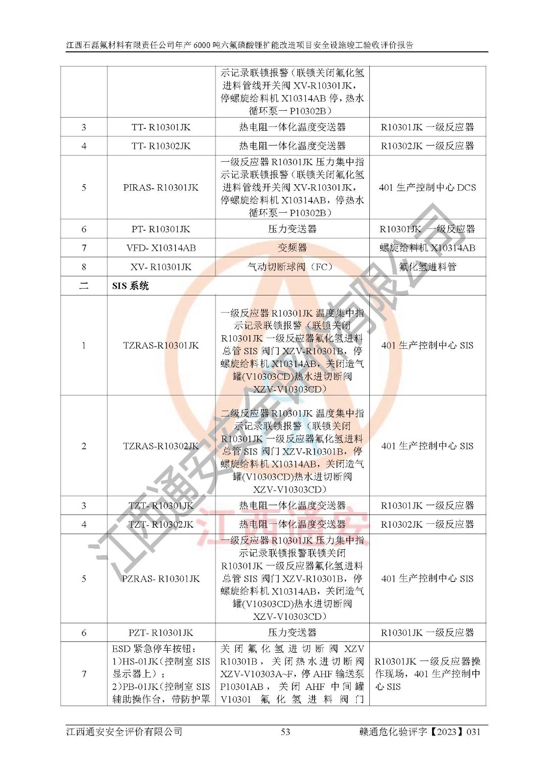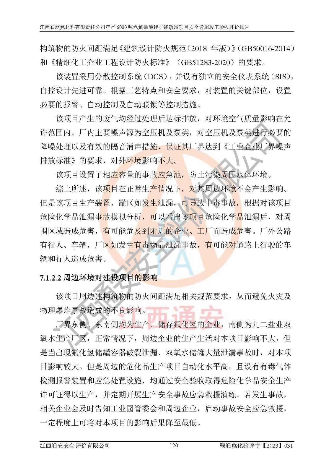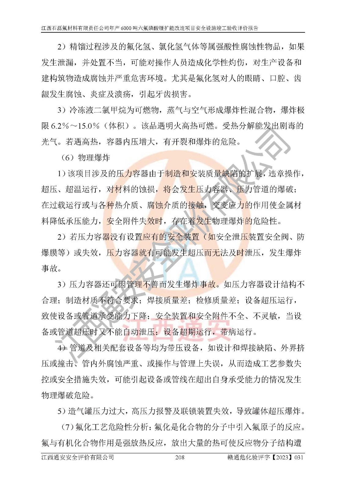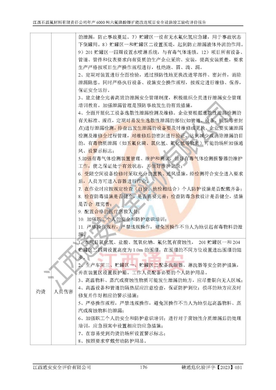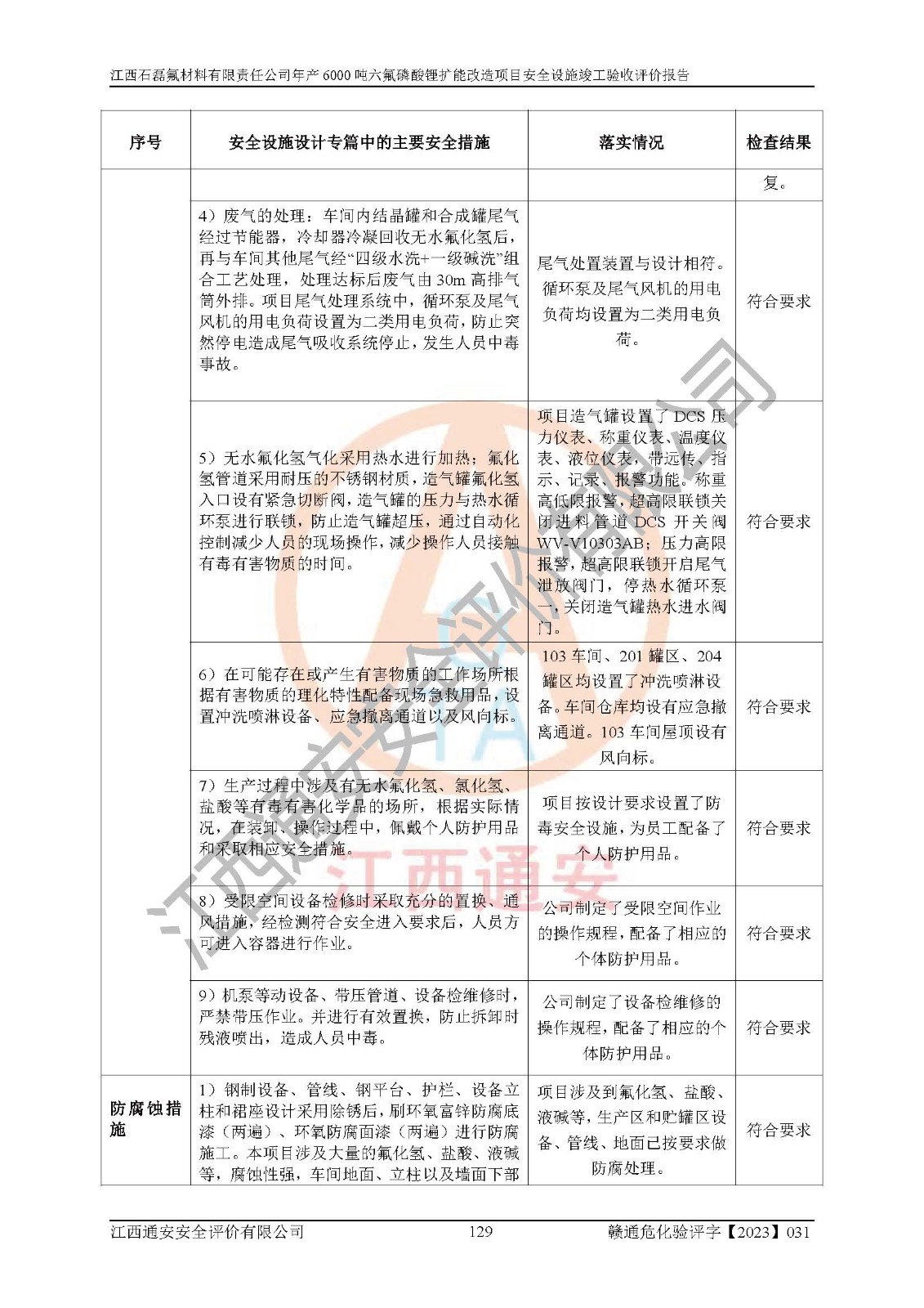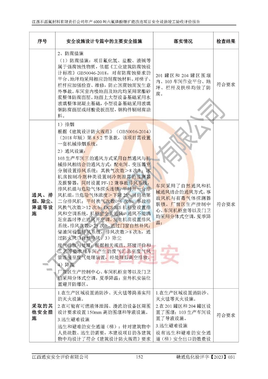 一、建设项目所在地的安全条件和与周边的安全防护距离 (1)该项目位于江西省赣州市会昌县氟盐化工产业基地,属于认定的化工园区,厂址选择合理,该项目与周边环境的防火间距符合规范的要求。 (2)重大危险源与“八类敏感场所及区域”的距离符合相关法律、法规的规定。 (3)该项目103生产车间三和201罐区一均构成**重大危险源。根据《危险化学品生产装置和储存设施外部安全防护距离确定方法》(GB/T 37243-2019)和《危险化学品生产装置和储存设施风险基准》(GB 36894-2018),该项目高敏感防护目标、重要防护目标、一般防护目标中的一类防护目标(<3×10-7)的外部安全防护距离包络线距离厂界*大值为76.36m,个人风险等值线范围内未出现该类防护目标;一般防护目标中的二类防护目标(<3×10-6)的外部安全防护距离包络线距离厂界*大值为51.62m,个人风险等值线范围内未涉及相应的防护目标;一般防护目标中的三类防护目标(<1×10-5)外部安全防护距离的包络线未出厂界。项目外部安全防护距离内无相应的防护目标,该项目不存在社会风险。 (4)该项目投产后在正常生产情况下,对其周边单位的生产、经营活动和居民的生活影响很小。在发生事故的情况下对周边单位的生产、经营活动和居民的生活存在影响。该项目周边单位的生产、经营活动和居民的生活对该项目投产后的正常生产影响很小。该项目所在地自然条件(不包括地震等破坏力**的自然灾害)的变化对该项目投产后的正常生产没有影响。 二、建设项目安全设施设计的采纳情况和已采用(取)的安全设施水平 该项目采用的主要安全设施包括了以下方面:检测、报警设施,设备安全防护设施,作业场所防护设施,安全警示标志,泄压和止逆设施,紧急处理设施,防止火灾蔓延设施,灭火设施,紧急个人处置设施,应急救援设施,劳动防护用品和装备等。 该项目在建设过程中采纳了《安全设施设计专篇》中的有关安全措施建议及要求,针对性的采取了相应的预防和控制措施,建设中未落实的安全措施,在试生产中已进行了整改。试生产表明该项目所采取的安全控制措施安全**,主要生产装置、设备运行平稳,安全可靠,安全水平较高,能够满足安全生产条件。 三、建设项目试生产(使用)后具备**现行有关安全生产法律、法规和部门规章及标准规定和要求的安全生产条件 1)法律法规等方面的符合性:该项目按照建设项目“三同时”要求,项目进行了备案、通过了安全条件审查、安全设施设计审查、试生产方案审查,立项审批手续齐全,安全设施设计、建设施工、施工监理均由有资质的单位承担,项目建设符合法律、法规规定的审批、施工、监理手续。项目建设期间,公司结合生产需要,增设了部分辅助设施和工艺管线,属于一般变更,试生产期间公司已委托河北英科石化工程有限公司进行了设计变更,作为已经审查通过的安全设施设计专篇的补充文件。 2)该项目与周边建构筑物的防火距离符合《精细化工企业工程设计防火标准》《建筑设计防火规范》的要求。根据《危险化学品生产装置和储存设施风险基准》GB36894-2018确定危险化学品单位周边重要目标和敏感场所承受的可容许个人风险和社会风险的定量风险评价。项目的个人风险计算结果表明,项目外部安全防护距离的包络线内无相应的防护目标。该软件未计算出社会风险。因此项目可容许个人风险和社会风险均在可接受范围内。 3)平面布置及常规防护设施措施的合理性:该项目生产场所、办公场所之间的间距满足安全要求,建筑结构、防火分区、防雷设施、安全出口的设置等满足安全生产的要求。消防道路的净宽度、净**、转弯半径均满足运输**及消防**通行。设置的常规防护设施、防止机械伤害、防急性中毒窒息的设施和措施符合要求。 4)设施、设备、装置及工艺方面的安全性:无**明令淘汰的工艺和 设备,该项目不涉及爆炸性危险区域划分。生产工艺操作和设置的安全设施满足安全需要,生产设施的布置能**人员疏散安全及操作方便。设施、设备、装置及工艺方面安全可靠。 5)特种设备、强制检测设备设施监督检验情况:该项目特种设备均进行了检验检测,并取得了检验报告;安全阀、压力表、有毒气体探头也进行了校验,校验结论合格,特种设备及安全附件符合《特种设备安全监察条例》 等相关法律法规、条例的规定。 6)公用工程、辅助设施的配套性:为该项目生产配套的供水、供电、 供气、供热等满足需要。 7)人员管理及安全培训方面充分性:公司现已建立了安全管理机构, 配备了专职安全管理人员。主要负责人王成具备化学工程与工艺专业本科学历,分管生产负责人曾中山具备化学工程与工艺专业本科学历,分管设备和技术负责人刘辉涛具备应用化学专业本科学历。专职安全管理人员共4人,配有一名注册安全工程师,专职安全管理人员均具有大专以上化工及安全专业相关学历。重点监管化工工艺的生产装置、储存设施操作人员具备高中及以上学历或化工类中等及以上职业教育水平。该公司制定了较完善的安全管理制度、岗位责任制、安全操作规程,制度执行情况较好。该公司已为从业职工交纳了工伤**。该公司对操作员工进行相关的培训和教育,经培训合格后上岗。 8)应急救援**性:企业根据自身实际情况,将该项目按照《生产经 营单位生产安全事故