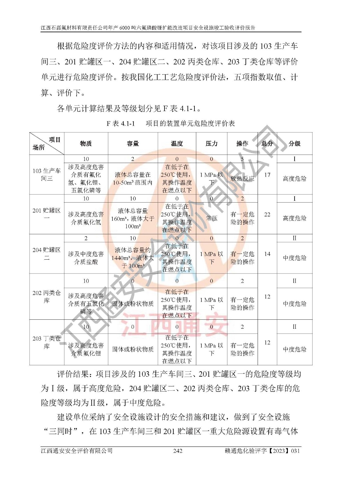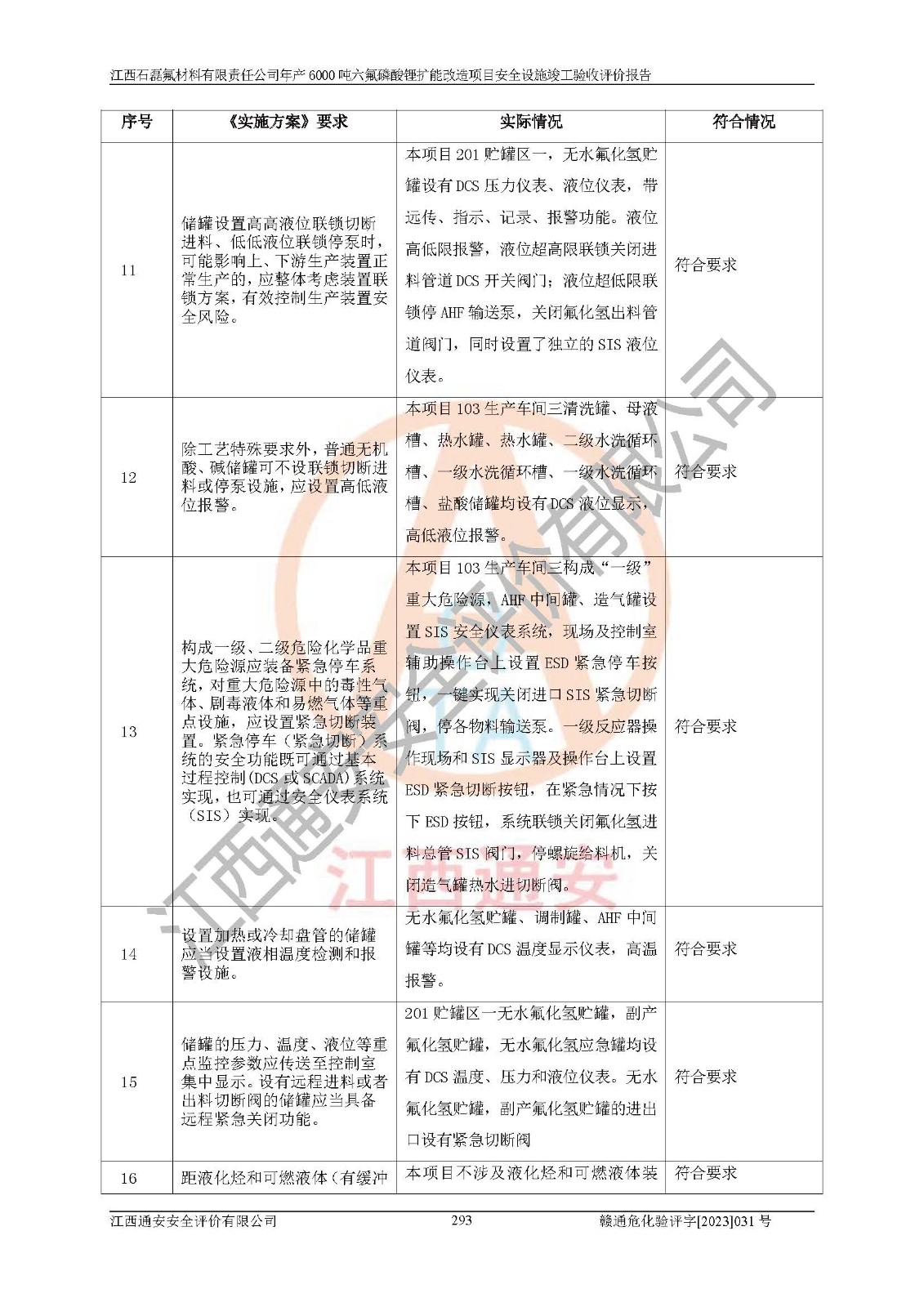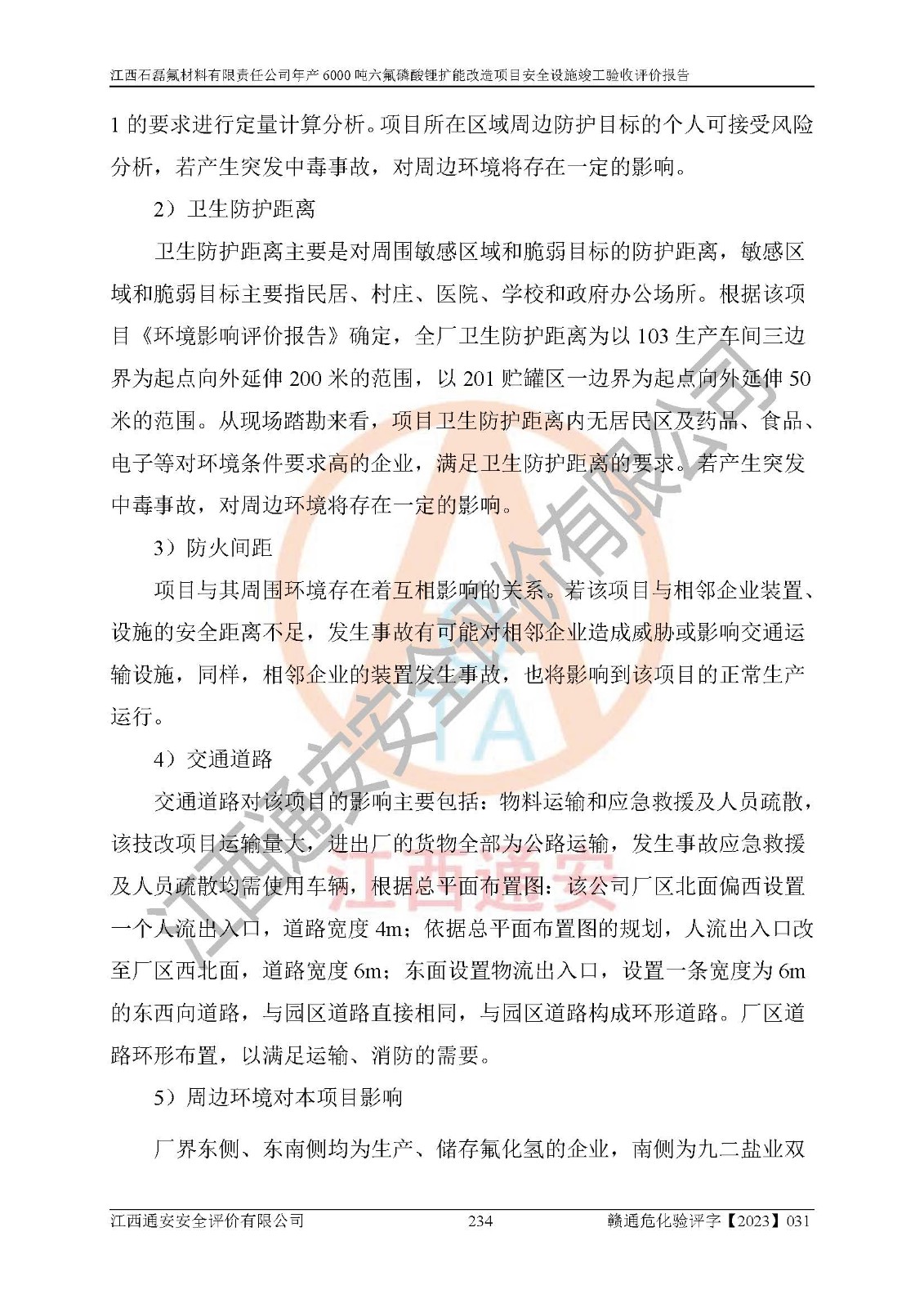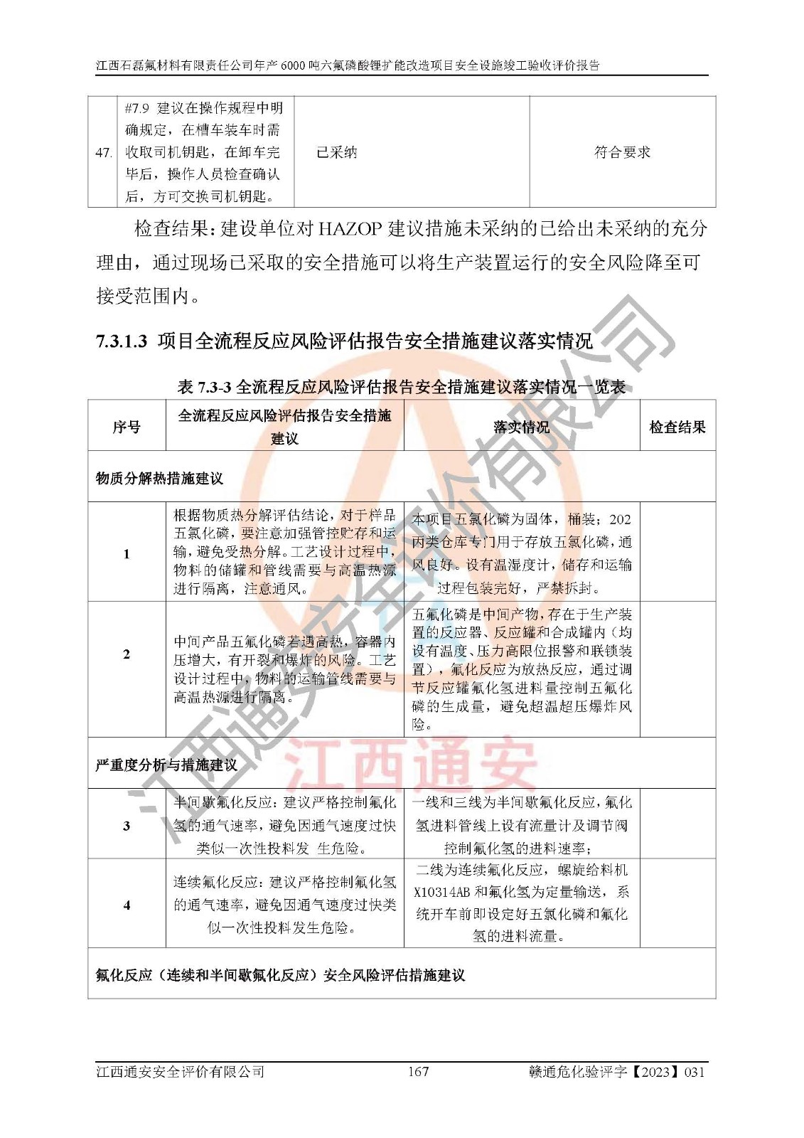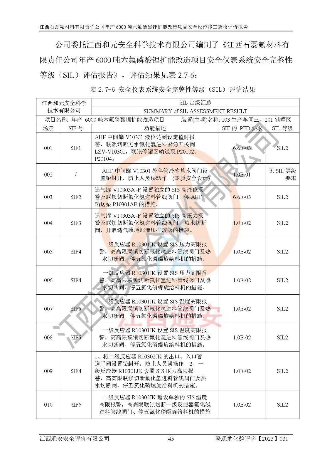一、建设项目所在地的安全条件和与周边的安全防护距离 (1)该项目位于江西省赣州市会昌县氟盐化工产业基地,属于认定的化工园区,厂址选择合理,该项目与周边环境的防火间距符合规范的要求。 (2)重大危险源与“八类敏感场所及区域”的距离符合相关法律、法规的规定。 (3)该项目103生产车间三和201罐区一均构成**重大危险源。根据《危险化学品生产装置和储存设施外部安全防护距离确定方法》(GB/T 37243-2019)和《危险化学品生产装置和储存设施风险基准》(GB 36894-2018),该项目高敏感防护目标、重要防护目标、一般防护目标中的一类防护目标(<3×10-7)的外部安全防护距离包络线距离厂界*大值为76.36m,个人风险等值线范围内未出现该类防护目标;一般防护目标中的二类防护目标(<3×10-6)的外部安全防护距离包络线距离厂界*大值为51.62m,个人风险等值线范围内未涉及相应的防护目标;一般防护目标中的三类防护目标(<1×10-5)外部安全防护距离的包络线未出厂界。项目外部安全防护距离内无相应的防护目标,该项目不存在社会风险。 (4)该项目投产后在正常生产情况下,对其周边单位的生产、经营活动和居民的生活影响很小。在发生事故的情况下对周边单位的生产、经营活动和居民的生活存在影响。该项目周边单位的生产、经营活动和居民的生活对该项目投产后的正常生产影响很小。该项目所在地自然条件(不包括地震等破坏力**的自然灾害)的变化对该项目投产后的正常生产没有影响。 二、建设项目安全设施设计的采纳情况和已采用(取)的安全设施水平 该项目采用的主要安全设施包括了以下方面:检测、报警设施,设备安全防护设施,作业场所防护设施,安全警示标志,泄压和止逆设施,紧急处理设施,防止火灾蔓延设施,灭火设施,紧急个人处置设施,应急救援设施,劳动防护用品和装备等。 该项目在建设过程中采纳了《安全设施设计专篇》中的有关安全措施建议及要求,针对性的采取了相应的预防和控制措施,建设中未落实的安全措施,在试生产中已进行了整改。试生产表明该项目所采取的安全控制措施安全**,主要生产装置、设备运行平稳,安全可靠,安全水平较高,能够满足安全生产条件。 三、建设项目试生产(使用)后具备**现行有关安全生产法律、法规和部门规章及标准规定和要求的安全生产条件 1)法律法规等方面的符合性:该项目按照建设项目“三同时”要求,项目进行了备案、通过了安全条件审查、安全设施设计审查、试生产方案审查,立项审批手续齐全,安全设施设计、建设施工、施工监理均由有资质的单位承担,项目建设符合法律、法规规定的审批、施工、监理手续。项目建设期间,公司结合生产需要,增设了部分辅助设施和工艺管线,属于一般变更,试生产期间公司已委托河北英科石化工程有限公司进行了设计变更,作为已经审查通过的安全设施设计专篇的补充文件。 2)该项目与周边建构筑物的防火距离符合《精细化工企业工程设计防火标准》《建筑设计防火规范》的要求。根据《危险化学品生产装置和储存设施风险基准》GB36894-2018确定危险化学品单位周边重要目标和敏感场所承受的可容许个人风险和社会风险的定量风险评价。项目的个人风险计算结果表明,项目外部安全防护距离的包络线内无相应的防护目标。该软件未计算出社会风险。因此项目可容许个人风险和社会风险均在可接受范围内。 3)平面布置及常规防护设施措施的合理性:该项目生产场所、办公场所之间的间距满足安全要求,建筑结构、防火分区、防雷设施、安全出口的设置等满足安全生产的要求。消防道路的净宽度、净**、转弯半径均满足运输**及消防**通行。设置的常规防护设施、防止机械伤害、防急性中毒窒息的设施和措施符合要求。 4)设施、设备、装置及工艺方面的安全性:无**明令淘汰的工艺和 设备,该项目不涉及爆炸性危险区域划分。生产工艺操作和设置的安全设施满足安全需要,生产设施的布置能**人员疏散安全及操作方便。设施、设备、装置及工艺方面安全可靠。 5)特种设备、强制检测设备设施监督检验情况:该项目特种设备均进行了检验检测,并取得了检验报告;安全阀、压力表、有毒气体探头也进行了校验,校验结论合格,特种设备及安全附件符合《特种设备安全监察条例》 等相关法律法规、条例的规定。 6)公用工程、辅助设施的配套性:为该项目生产配套的供水、供电、 供气、供热等满足需要。 7)人员管理及安全培训方面充分性:公司现已建立了安全管理机构, 配备了专职安全管理人员。主要负责人王成具备化学工程与工艺专业本科学历,分管生产负责人曾中山具备化学工程与工艺专业本科学历,分管设备和技术负责人刘辉涛具备应用化学专业本科学历。专职安全管理人员共4人,配有一名注册安全工程师,专职安全管理人员均具有大专以上化工及安全专业相关学历。重点监管化工工艺的生产装置、储存设施操作人员具备高中及以上学历或化工类中等及以上职业教育水平。该公司制定了较完善的安全管理制度、岗位责任制、安全操作规程,制度执行情况较好。该公司已为从业职工交纳了工伤**。该公司对操作员工进行相关的培训和教育,经培训合格后上岗。 8)应急救援**性:企业根据自身实际情况,将该项目按照《生产经 营单位生产安全事故
