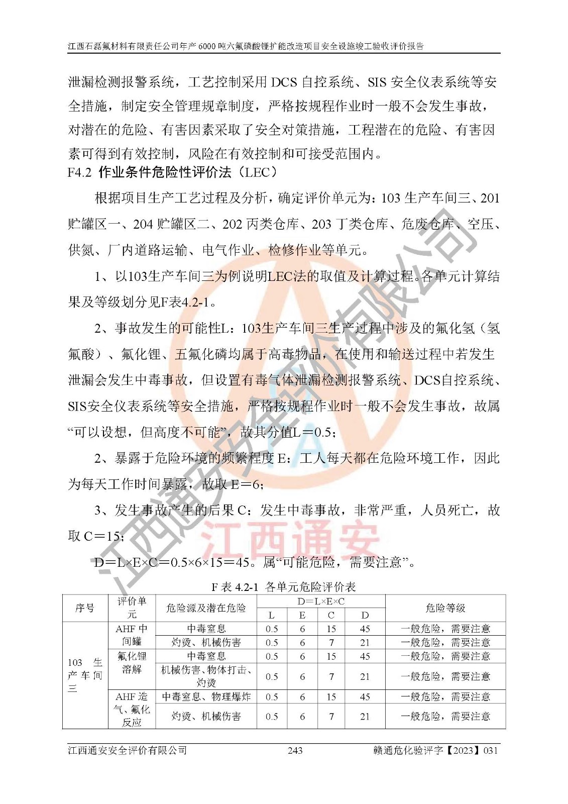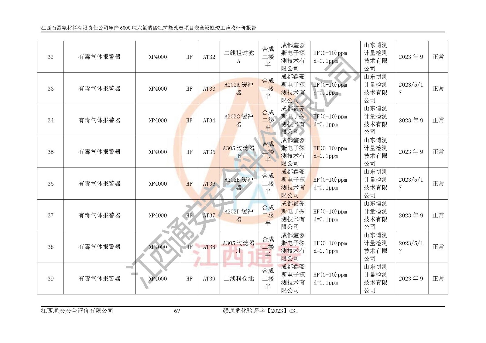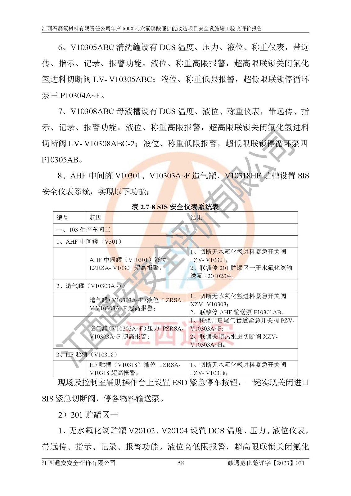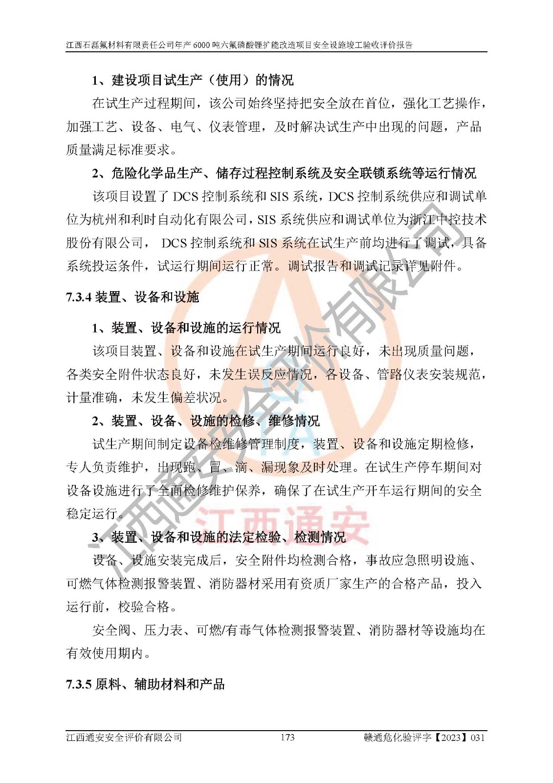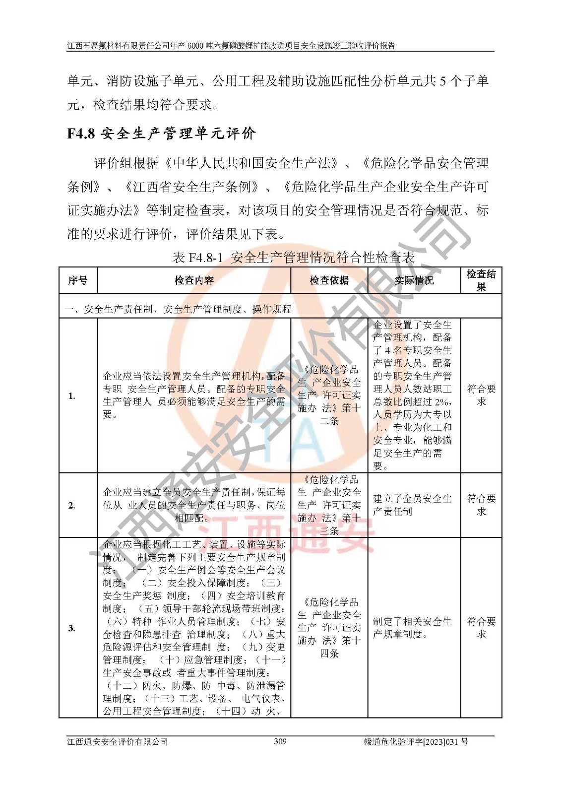一、建设项目所在地的安全条件和与周边的安全防护距离 (1)该项目位于江西省赣州市会昌县氟盐化工产业基地,属于认定的化工园区,厂址选择合理,该项目与周边环境的防火间距符合规范的要求。 (2)重大危险源与“八类敏感场所及区域”的距离符合相关法律、法规的规定。 (3)该项目103生产车间三和201罐区一均构成**重大危险源。根据《危险化学品生产装置和储存设施外部安全防护距离确定方法》(GB/T 37243-2019)和《危险化学品生产装置和储存设施风险基准》(GB 36894-2018),该项目高敏感防护目标、重要防护目标、一般防护目标中的一类防护目标(<3×10-7)的外部安全防护距离包络线距离厂界*大值为76.36m,个人风险等值线范围内未出现该类防护目标;一般防护目标中的二类防护目标(<3×10-6)的外部安全防护距离包络线距离厂界*大值为51.62m,个人风险等值线范围内未涉及相应的防护目标;一般防护目标中的三类防护目标(<1×10-5)外部安全防护距离的包络线未出厂界。项目外部安全防护距离内无相应的防护目标,该项目不存在社会风险。 (4)该项目投产后在正常生产情况下,对其周边单位的生产、经营活动和居民的生活影响很小。在发生事故的情况下对周边单位的生产、经营活动和居民的生活存在影响。该项目周边单位的生产、经营活动和居民的生活对该项目投产后的正常生产影响很小。该项目所在地自然条件(不包括地震等破坏力**的自然灾害)的变化对该项目投产后的正常生产没有影响。 二、建设项目安全设施设计的采纳情况和已采用(取)的安全设施水平 该项目采用的主要安全设施包括了以下方面:检测、报警设施,设备安全防护设施,作业场所防护设施,安全警示标志,泄压和止逆设施,紧急处理设施,防止火灾蔓延设施,灭火设施,紧急个人处置设施,应急救援设施,劳动防护用品和装备等。 该项目在建设过程中采纳了《安全设施设计专篇》中的有关安全措施建议及要求,针对性的采取了相应的预防和控制措施,建设中未落实的安全措施,在试生产中已进行了整改。试生产表明该项目所采取的安全控制措施安全**,主要生产装置、设备运行平稳,安全可靠,安全水平较高,能够满足安全生产条件。 三、建设项目试生产(使用)后具备**现行有关安全生产法律、法规和部门规章及标准规定和要求的安全生产条件 1)法律法规等方面的符合性:该项目按照建设项目“三同时”要求,项目进行了备案、通过了安全条件审查、安全设施设计审查、试生产方案审查,立项审批手续齐全,安全设施设计、建设施工、施工监理均由有资质的单位承担,项目建设符合法律、法规规定的审批、施工、监理手续。项目建设期间,公司结合生产需要,增设了部分辅助设施和工艺管线,属于一般变更,试生产期间公司已委托河北英科石化工程有限公司进行了设计变更,作为已经审查通过的安全设施设计专篇的补充文件。 2)该项目与周边建构筑物的防火距离符合《精细化工企业工程设计防火标准》《建筑设计防火规范》的要求。根据《危险化学品生产装置和储存设施风险基准》GB36894-2018确定危险化学品单位周边重要目标和敏感场所承受的可容许个人风险和社会风险的定量风险评价。项目的个人风险计算结果表明,项目外部安全防护距离的包络线内无相应的防护目标。该软件未计算出社会风险。因此项目可容许个人风险和社会风险均在可接受范围内。 3)平面布置及常规防护设施措施的合理性:该项目生产场所、办公场所之间的间距满足安全要求,建筑结构、防火分区、防雷设施、安全出口的设置等满足安全生产的要求。消防道路的净宽度、净**、转弯半径均满足运输**及消防**通行。设置的常规防护设施、防止机械伤害、防急性中毒窒息的设施和措施符合要求。 4)设施、设备、装置及工艺方面的安全性:无**明令淘汰的工艺和 设备,该项目不涉及爆炸性危险区域划分。生产工艺操作和设置的安全设施满足安全需要,生产设施的布置能**人员疏散安全及操作方便。设施、设备、装置及工艺方面安全可靠。 5)特种设备、强制检测设备设施监督检验情况:该项目特种设备均进行了检验检测,并取得了检验报告;安全阀、压力表、有毒气体探头也进行了校验,校验结论合格,特种设备及安全附件符合《特种设备安全监察条例》 等相关法律法规、条例的规定。 6)公用工程、辅助设施的配套性:为该项目生产配套的供水、供电、 供气、供热等满足需要。 7)人员管理及安全培训方面充分性:公司现已建立了安全管理机构, 配备了专职安全管理人员。主要负责人王成具备化学工程与工艺专业本科学历,分管生产负责人曾中山具备化学工程与工艺专业本科学历,分管设备和技术负责人刘辉涛具备应用化学专业本科学历。专职安全管理人员共4人,配有一名注册安全工程师,专职安全管理人员均具有大专以上化工及安全专业相关学历。重点监管化工工艺的生产装置、储存设施操作人员具备高中及以上学历或化工类中等及以上职业教育水平。该公司制定了较完善的安全管理制度、岗位责任制、安全操作规程,制度执行情况较好。该公司已为从业职工交纳了工伤**。该公司对操作员工进行相关的培训和教育,经培训合格后上岗。 8)应急救援**性:企业根据自身实际情况,将该项目按照《生产经 营单位生产安全事故