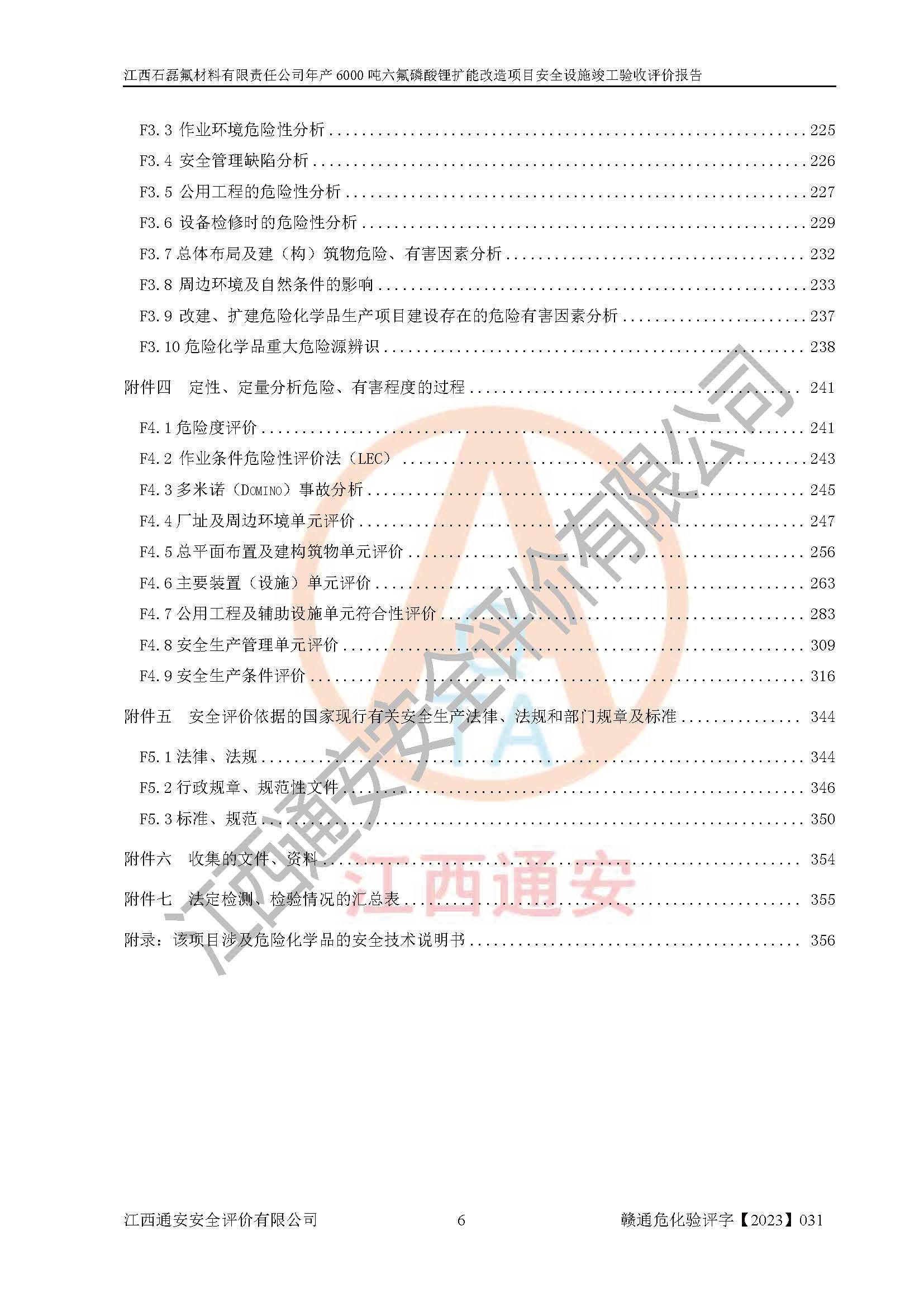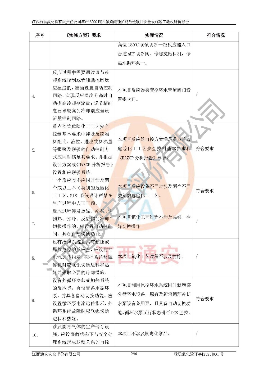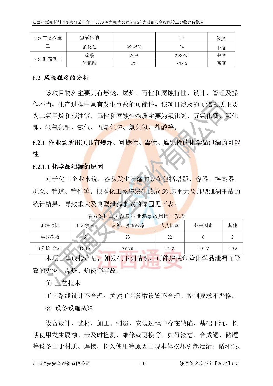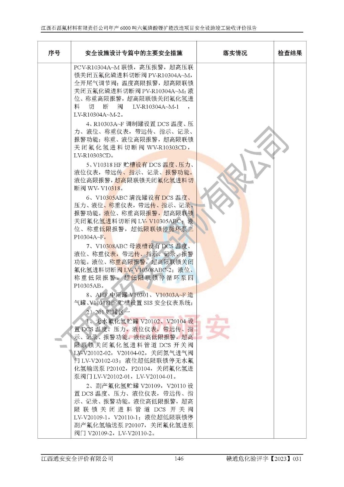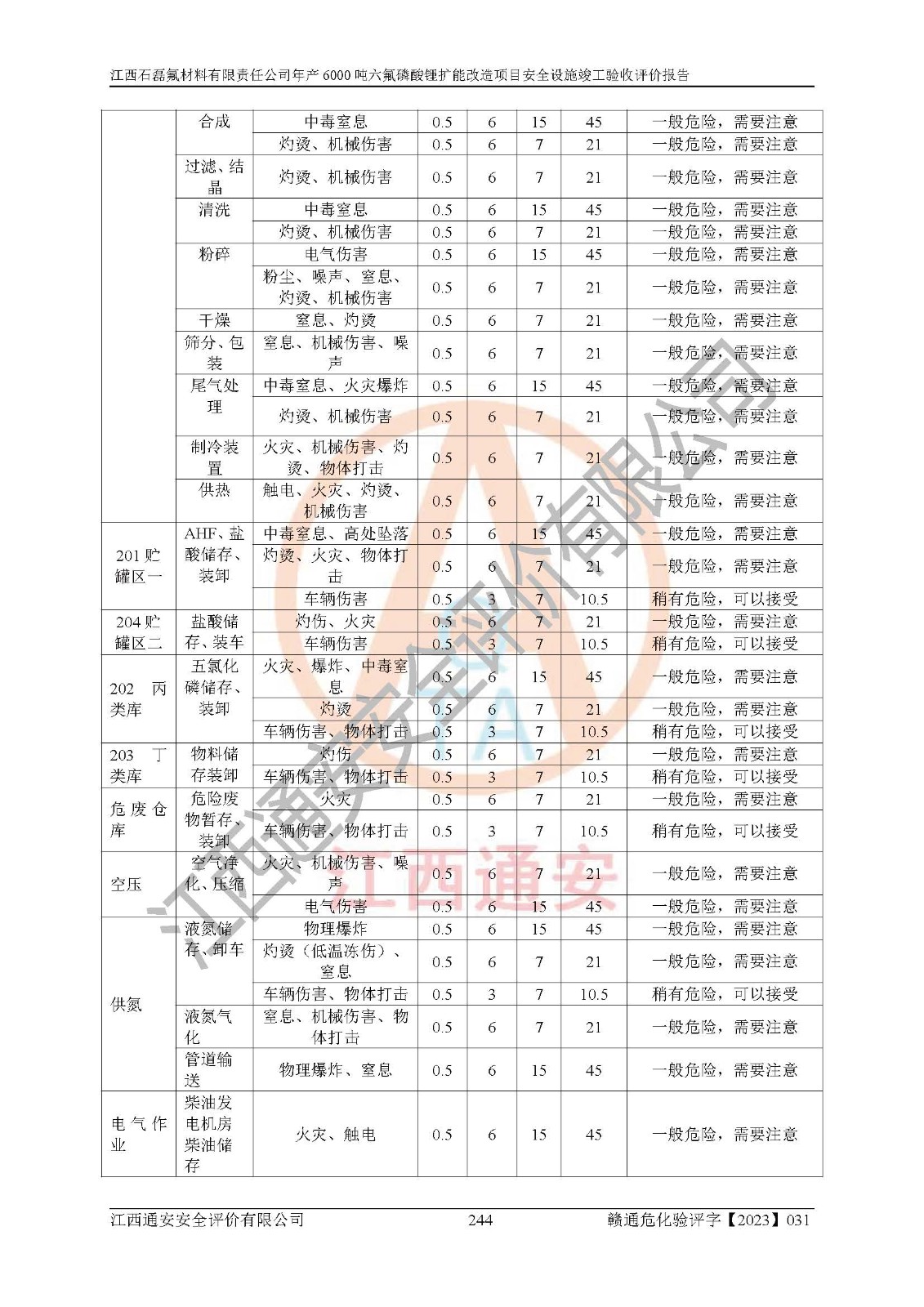 一、建设项目所在地的安全条件和与周边的安全防护距离 (1)该项目位于江西省赣州市会昌县氟盐化工产业基地,属于认定的化工园区,厂址选择合理,该项目与周边环境的防火间距符合规范的要求。 (2)重大危险源与“八类敏感场所及区域”的距离符合相关法律、法规的规定。 (3)该项目103生产车间三和201罐区一均构成**重大危险源。根据《危险化学品生产装置和储存设施外部安全防护距离确定方法》(GB/T 37243-2019)和《危险化学品生产装置和储存设施风险基准》(GB 36894-2018),该项目高敏感防护目标、重要防护目标、一般防护目标中的一类防护目标(<3×10-7)的外部安全防护距离包络线距离厂界*大值为76.36m,个人风险等值线范围内未出现该类防护目标;一般防护目标中的二类防护目标(<3×10-6)的外部安全防护距离包络线距离厂界*大值为51.62m,个人风险等值线范围内未涉及相应的防护目标;一般防护目标中的三类防护目标(<1×10-5)外部安全防护距离的包络线未出厂界。项目外部安全防护距离内无相应的防护目标,该项目不存在社会风险。 (4)该项目投产后在正常生产情况下,对其周边单位的生产、经营活动和居民的生活影响很小。在发生事故的情况下对周边单位的生产、经营活动和居民的生活存在影响。该项目周边单位的生产、经营活动和居民的生活对该项目投产后的正常生产影响很小。该项目所在地自然条件(不包括地震等破坏力**的自然灾害)的变化对该项目投产后的正常生产没有影响。 二、建设项目安全设施设计的采纳情况和已采用(取)的安全设施水平 该项目采用的主要安全设施包括了以下方面:检测、报警设施,设备安全防护设施,作业场所防护设施,安全警示标志,泄压和止逆设施,紧急处理设施,防止火灾蔓延设施,灭火设施,紧急个人处置设施,应急救援设施,劳动防护用品和装备等。 该项目在建设过程中采纳了《安全设施设计专篇》中的有关安全措施建议及要求,针对性的采取了相应的预防和控制措施,建设中未落实的安全措施,在试生产中已进行了整改。试生产表明该项目所采取的安全控制措施安全**,主要生产装置、设备运行平稳,安全可靠,安全水平较高,能够满足安全生产条件。 三、建设项目试生产(使用)后具备**现行有关安全生产法律、法规和部门规章及标准规定和要求的安全生产条件 1)法律法规等方面的符合性:该项目按照建设项目“三同时”要求,项目进行了备案、通过了安全条件审查、安全设施设计审查、试生产方案审查,立项审批手续齐全,安全设施设计、建设施工、施工监理均由有资质的单位承担,项目建设符合法律、法规规定的审批、施工、监理手续。项目建设期间,公司结合生产需要,增设了部分辅助设施和工艺管线,属于一般变更,试生产期间公司已委托河北英科石化工程有限公司进行了设计变更,作为已经审查通过的安全设施设计专篇的补充文件。 2)该项目与周边建构筑物的防火距离符合《精细化工企业工程设计防火标准》《建筑设计防火规范》的要求。根据《危险化学品生产装置和储存设施风险基准》GB36894-2018确定危险化学品单位周边重要目标和敏感场所承受的可容许个人风险和社会风险的定量风险评价。项目的个人风险计算结果表明,项目外部安全防护距离的包络线内无相应的防护目标。该软件未计算出社会风险。因此项目可容许个人风险和社会风险均在可接受范围内。 3)平面布置及常规防护设施措施的合理性:该项目生产场所、办公场所之间的间距满足安全要求,建筑结构、防火分区、防雷设施、安全出口的设置等满足安全生产的要求。消防道路的净宽度、净**、转弯半径均满足运输**及消防**通行。设置的常规防护设施、防止机械伤害、防急性中毒窒息的设施和措施符合要求。 4)设施、设备、装置及工艺方面的安全性:无**明令淘汰的工艺和 设备,该项目不涉及爆炸性危险区域划分。生产工艺操作和设置的安全设施满足安全需要,生产设施的布置能**人员疏散安全及操作方便。设施、设备、装置及工艺方面安全可靠。 5)特种设备、强制检测设备设施监督检验情况:该项目特种设备均进行了检验检测,并取得了检验报告;安全阀、压力表、有毒气体探头也进行了校验,校验结论合格,特种设备及安全附件符合《特种设备安全监察条例》 等相关法律法规、条例的规定。 6)公用工程、辅助设施的配套性:为该项目生产配套的供水、供电、 供气、供热等满足需要。 7)人员管理及安全培训方面充分性:公司现已建立了安全管理机构, 配备了专职安全管理人员。主要负责人王成具备化学工程与工艺专业本科学历,分管生产负责人曾中山具备化学工程与工艺专业本科学历,分管设备和技术负责人刘辉涛具备应用化学专业本科学历。专职安全管理人员共4人,配有一名注册安全工程师,专职安全管理人员均具有大专以上化工及安全专业相关学历。重点监管化工工艺的生产装置、储存设施操作人员具备高中及以上学历或化工类中等及以上职业教育水平。该公司制定了较完善的安全管理制度、岗位责任制、安全操作规程,制度执行情况较好。该公司已为从业职工交纳了工伤**。该公司对操作员工进行相关的培训和教育,经培训合格后上岗。 8)应急救援**性:企业根据自身实际情况,将该项目按照《生产经 营单位生产安全事故