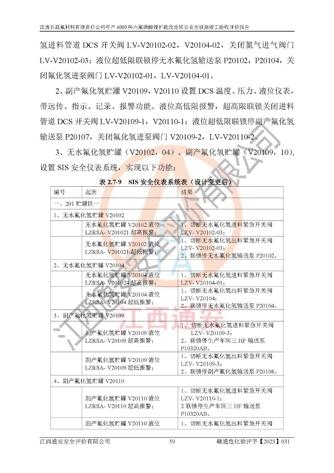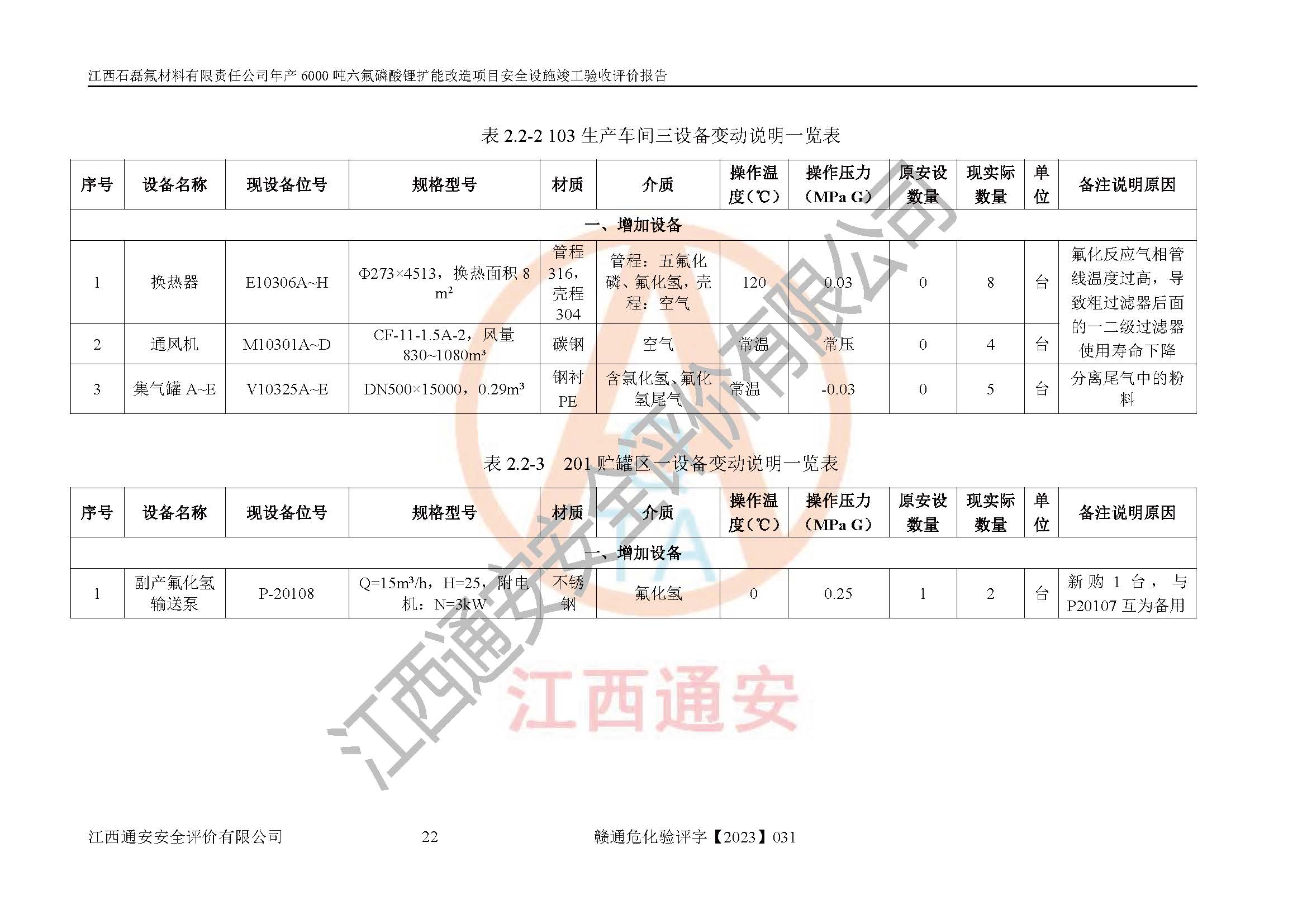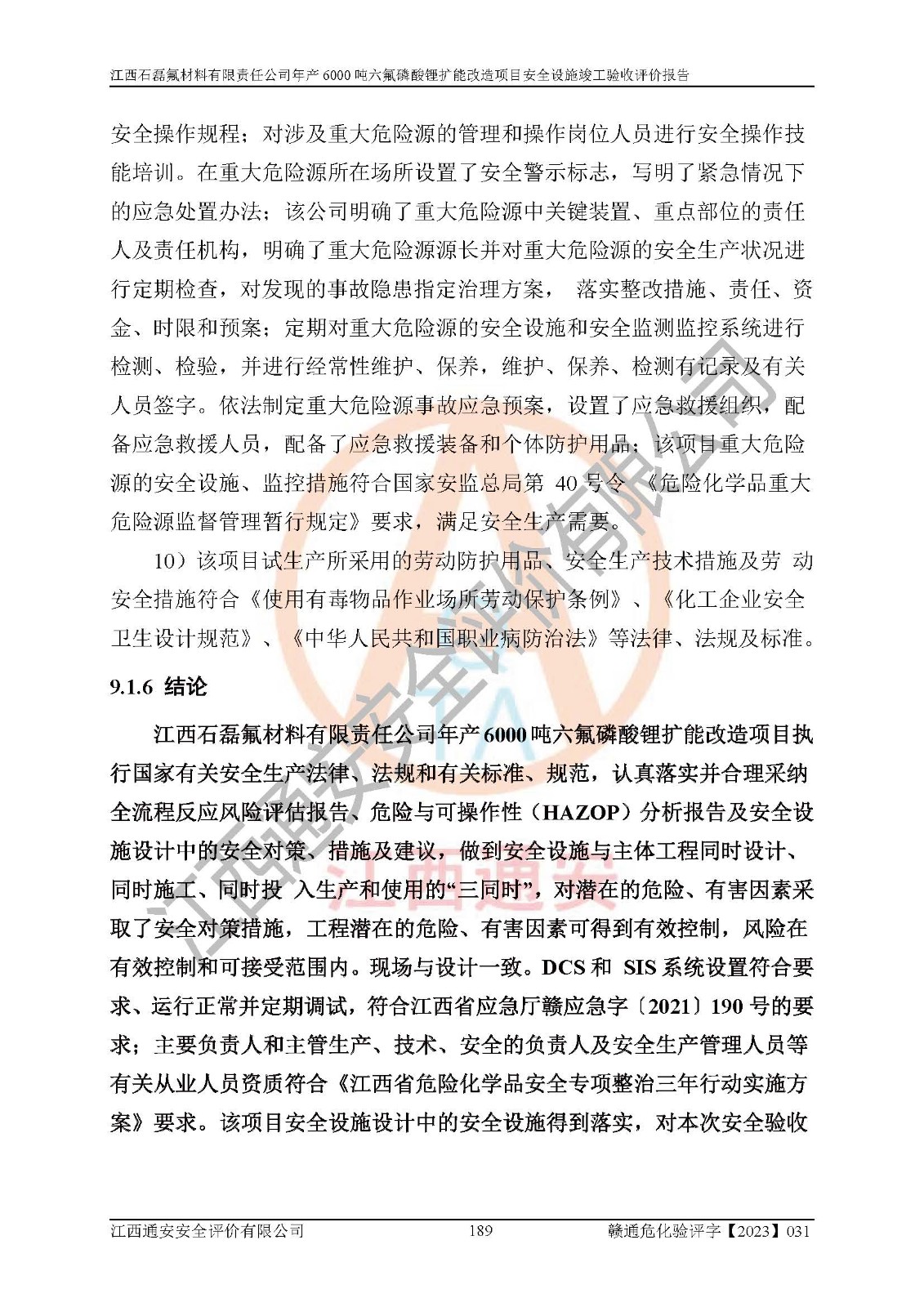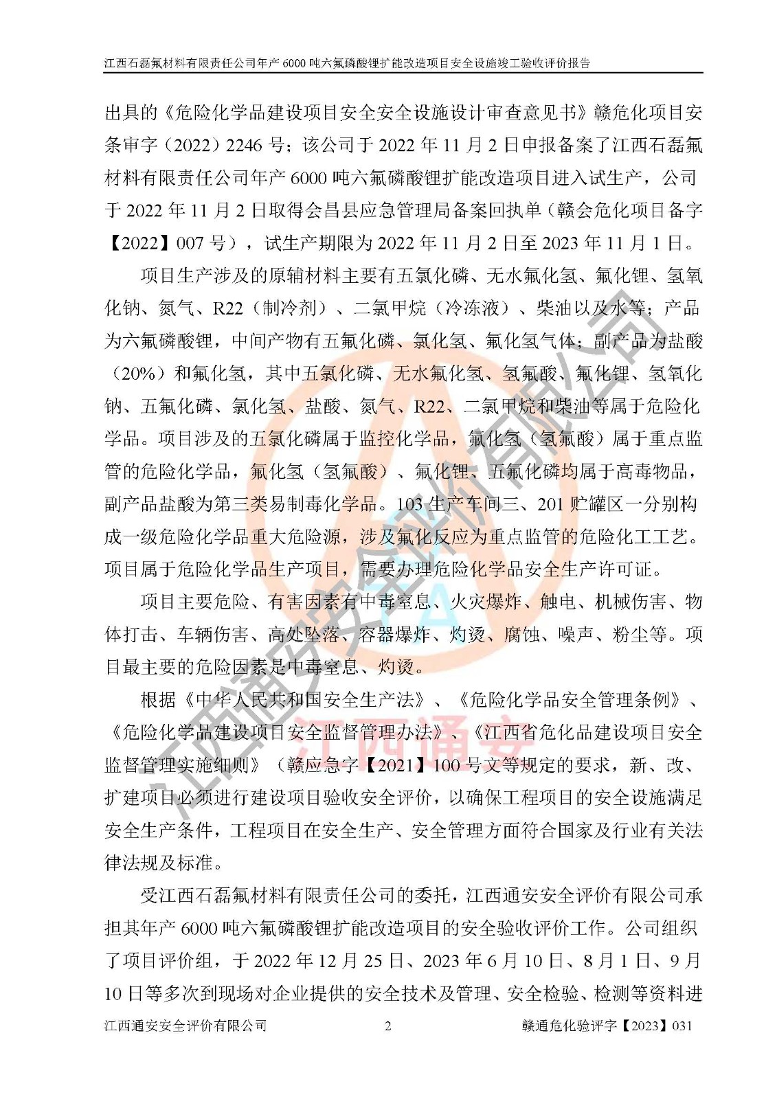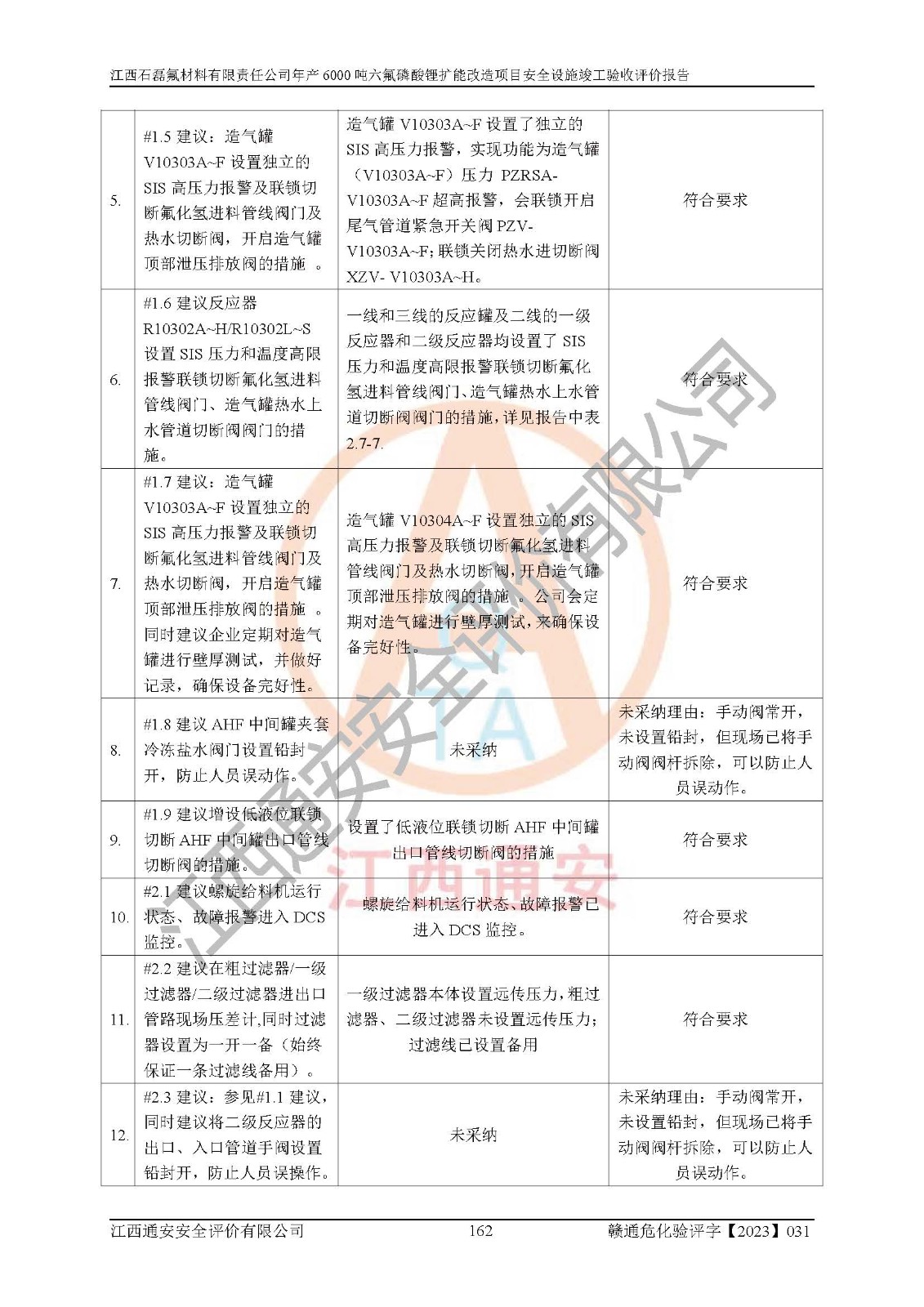 一、建设项目所在地的安全条件和与周边的安全防护距离 (1)该项目位于江西省赣州市会昌县氟盐化工产业基地,属于认定的化工园区,厂址选择合理,该项目与周边环境的防火间距符合规范的要求。 (2)重大危险源与“八类敏感场所及区域”的距离符合相关法律、法规的规定。 (3)该项目103生产车间三和201罐区一均构成**重大危险源。根据《危险化学品生产装置和储存设施外部安全防护距离确定方法》(GB/T 37243-2019)和《危险化学品生产装置和储存设施风险基准》(GB 36894-2018),该项目高敏感防护目标、重要防护目标、一般防护目标中的一类防护目标(<3×10-7)的外部安全防护距离包络线距离厂界*大值为76.36m,个人风险等值线范围内未出现该类防护目标;一般防护目标中的二类防护目标(<3×10-6)的外部安全防护距离包络线距离厂界*大值为51.62m,个人风险等值线范围内未涉及相应的防护目标;一般防护目标中的三类防护目标(<1×10-5)外部安全防护距离的包络线未出厂界。项目外部安全防护距离内无相应的防护目标,该项目不存在社会风险。 (4)该项目投产后在正常生产情况下,对其周边单位的生产、经营活动和居民的生活影响很小。在发生事故的情况下对周边单位的生产、经营活动和居民的生活存在影响。该项目周边单位的生产、经营活动和居民的生活对该项目投产后的正常生产影响很小。该项目所在地自然条件(不包括地震等破坏力**的自然灾害)的变化对该项目投产后的正常生产没有影响。 二、建设项目安全设施设计的采纳情况和已采用(取)的安全设施水平 该项目采用的主要安全设施包括了以下方面:检测、报警设施,设备安全防护设施,作业场所防护设施,安全警示标志,泄压和止逆设施,紧急处理设施,防止火灾蔓延设施,灭火设施,紧急个人处置设施,应急救援设施,劳动防护用品和装备等。 该项目在建设过程中采纳了《安全设施设计专篇》中的有关安全措施建议及要求,针对性的采取了相应的预防和控制措施,建设中未落实的安全措施,在试生产中已进行了整改。试生产表明该项目所采取的安全控制措施安全**,主要生产装置、设备运行平稳,安全可靠,安全水平较高,能够满足安全生产条件。 三、建设项目试生产(使用)后具备**现行有关安全生产法律、法规和部门规章及标准规定和要求的安全生产条件 1)法律法规等方面的符合性:该项目按照建设项目“三同时”要求,项目进行了备案、通过了安全条件审查、安全设施设计审查、试生产方案审查,立项审批手续齐全,安全设施设计、建设施工、施工监理均由有资质的单位承担,项目建设符合法律、法规规定的审批、施工、监理手续。项目建设期间,公司结合生产需要,增设了部分辅助设施和工艺管线,属于一般变更,试生产期间公司已委托河北英科石化工程有限公司进行了设计变更,作为已经审查通过的安全设施设计专篇的补充文件。 2)该项目与周边建构筑物的防火距离符合《精细化工企业工程设计防火标准》《建筑设计防火规范》的要求。根据《危险化学品生产装置和储存设施风险基准》GB36894-2018确定危险化学品单位周边重要目标和敏感场所承受的可容许个人风险和社会风险的定量风险评价。项目的个人风险计算结果表明,项目外部安全防护距离的包络线内无相应的防护目标。该软件未计算出社会风险。因此项目可容许个人风险和社会风险均在可接受范围内。 3)平面布置及常规防护设施措施的合理性:该项目生产场所、办公场所之间的间距满足安全要求,建筑结构、防火分区、防雷设施、安全出口的设置等满足安全生产的要求。消防道路的净宽度、净**、转弯半径均满足运输**及消防**通行。设置的常规防护设施、防止机械伤害、防急性中毒窒息的设施和措施符合要求。 4)设施、设备、装置及工艺方面的安全性:无**明令淘汰的工艺和 设备,该项目不涉及爆炸性危险区域划分。生产工艺操作和设置的安全设施满足安全需要,生产设施的布置能**人员疏散安全及操作方便。设施、设备、装置及工艺方面安全可靠。 5)特种设备、强制检测设备设施监督检验情况:该项目特种设备均进行了检验检测,并取得了检验报告;安全阀、压力表、有毒气体探头也进行了校验,校验结论合格,特种设备及安全附件符合《特种设备安全监察条例》 等相关法律法规、条例的规定。 6)公用工程、辅助设施的配套性:为该项目生产配套的供水、供电、 供气、供热等满足需要。 7)人员管理及安全培训方面充分性:公司现已建立了安全管理机构, 配备了专职安全管理人员。主要负责人王成具备化学工程与工艺专业本科学历,分管生产负责人曾中山具备化学工程与工艺专业本科学历,分管设备和技术负责人刘辉涛具备应用化学专业本科学历。专职安全管理人员共4人,配有一名注册安全工程师,专职安全管理人员均具有大专以上化工及安全专业相关学历。重点监管化工工艺的生产装置、储存设施操作人员具备高中及以上学历或化工类中等及以上职业教育水平。该公司制定了较完善的安全管理制度、岗位责任制、安全操作规程,制度执行情况较好。该公司已为从业职工交纳了工伤**。该公司对操作员工进行相关的培训和教育,经培训合格后上岗。 8)应急救援**性:企业根据自身实际情况,将该项目按照《生产经 营单位生产安全事故