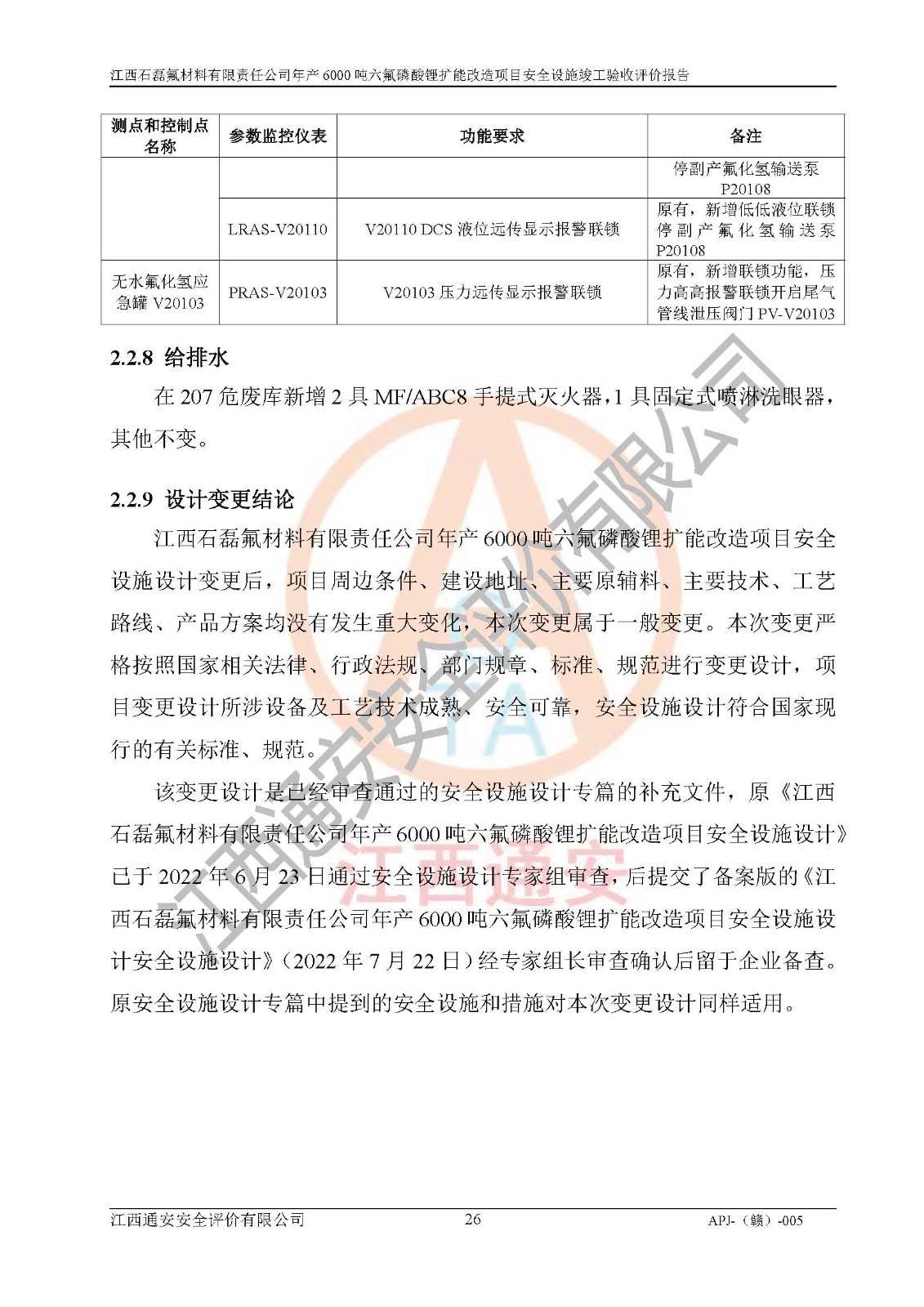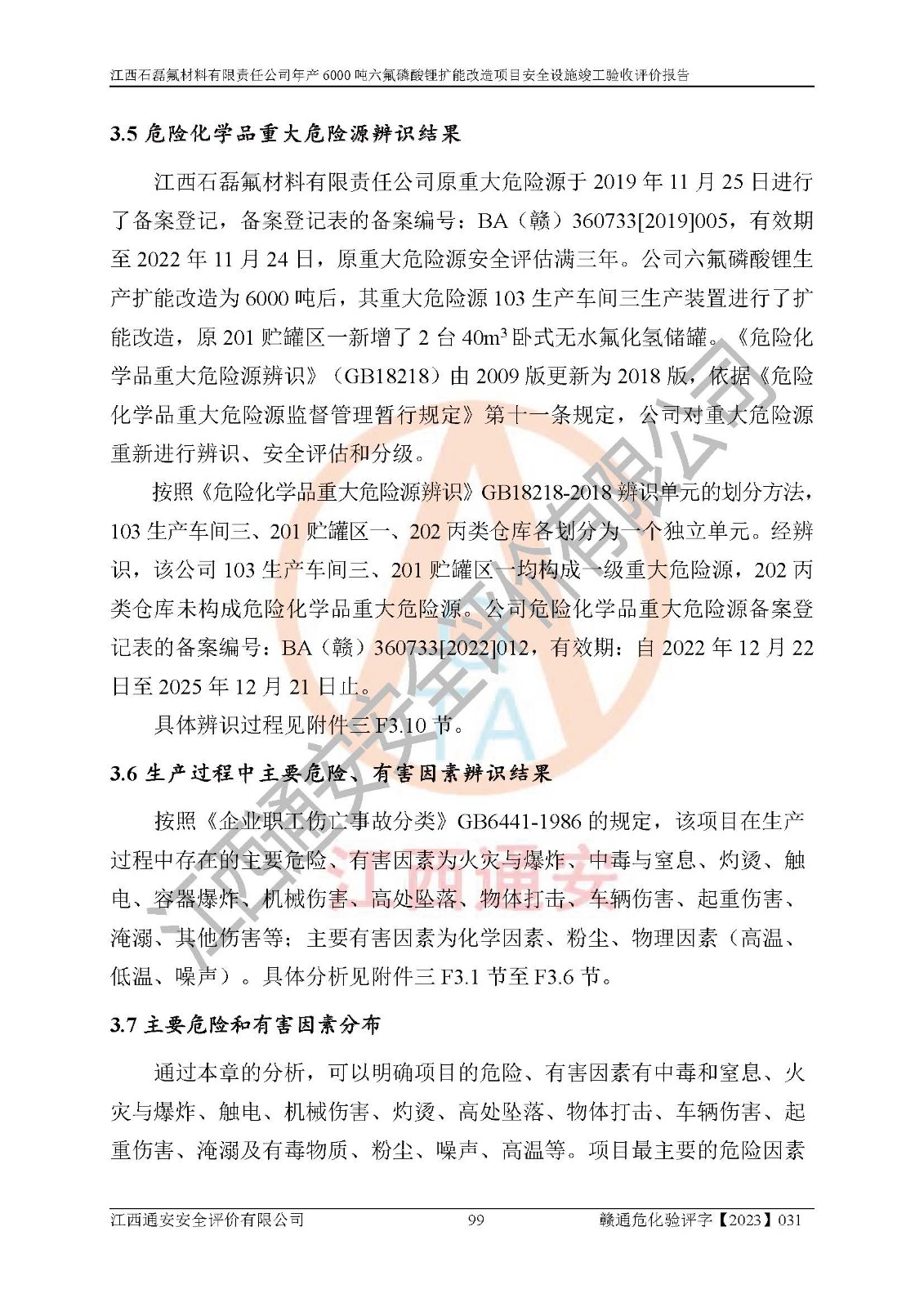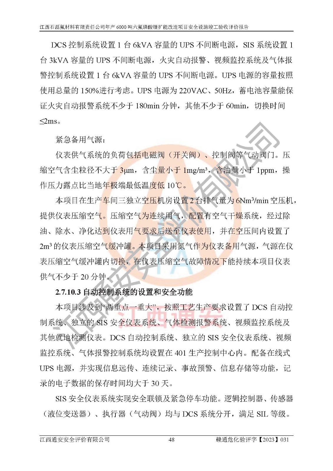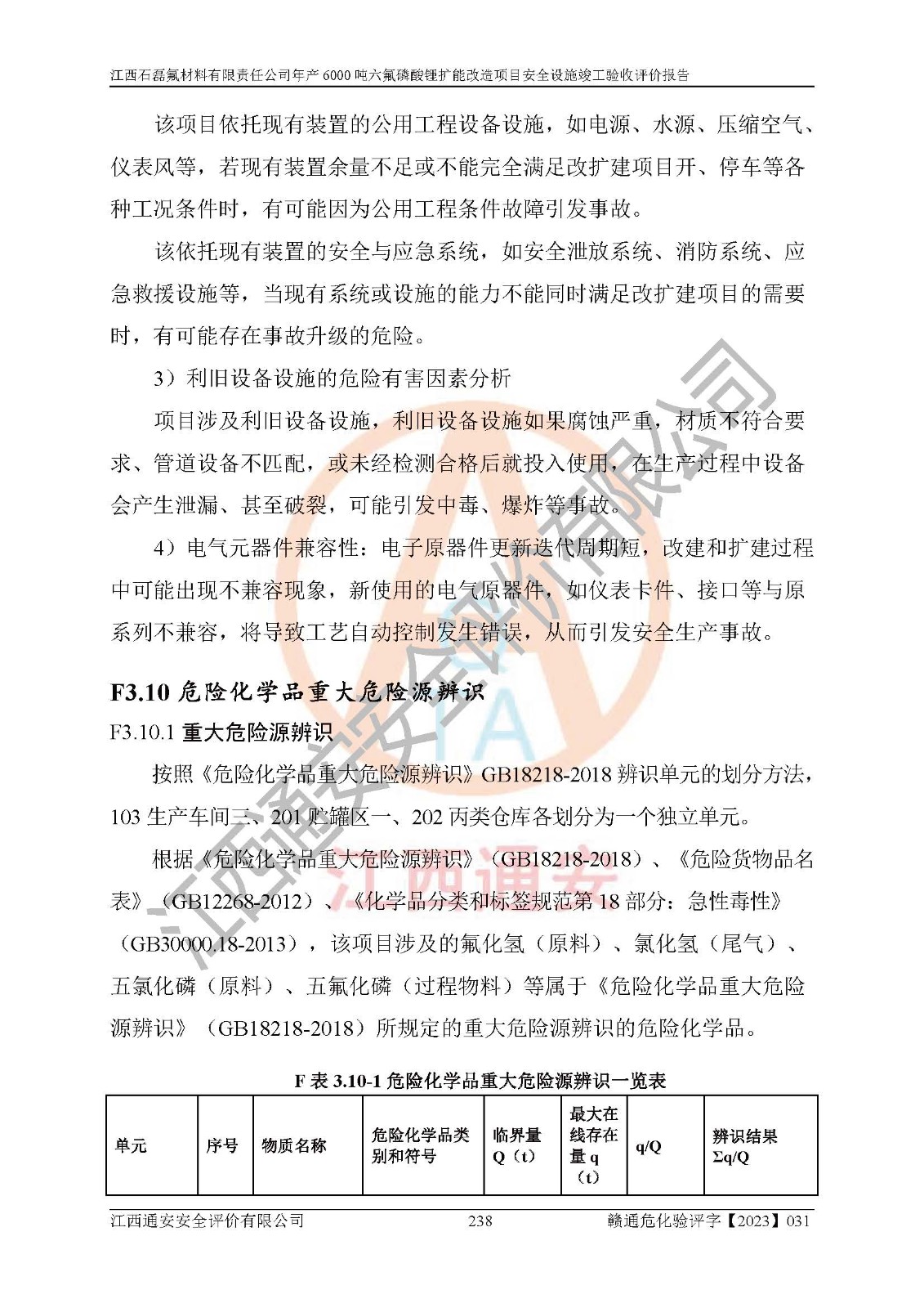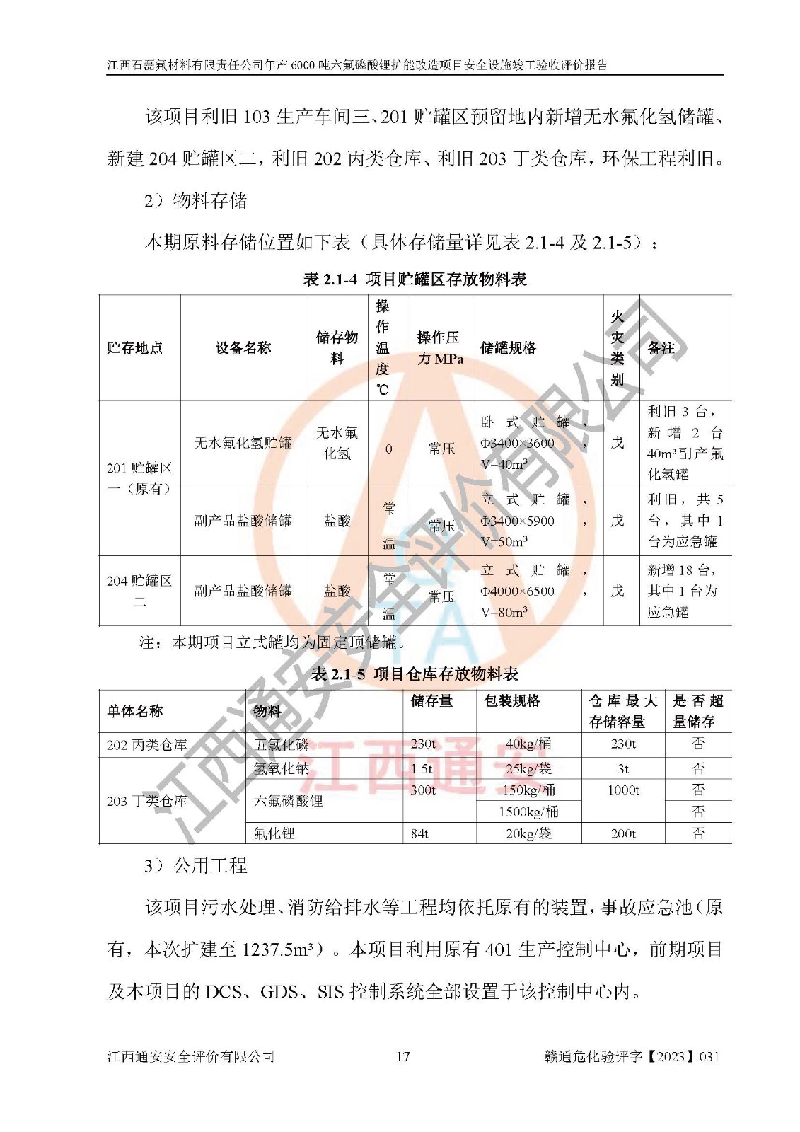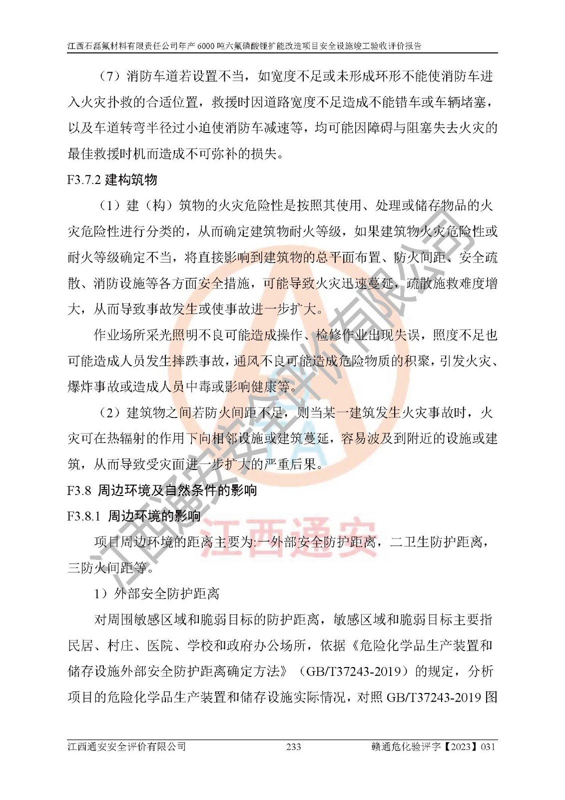 一、建设项目所在地的安全条件和与周边的安全防护距离 (1)该项目位于江西省赣州市会昌县氟盐化工产业基地,属于认定的化工园区,厂址选择合理,该项目与周边环境的防火间距符合规范的要求。 (2)重大危险源与“八类敏感场所及区域”的距离符合相关法律、法规的规定。 (3)该项目103生产车间三和201罐区一均构成**重大危险源。根据《危险化学品生产装置和储存设施外部安全防护距离确定方法》(GB/T 37243-2019)和《危险化学品生产装置和储存设施风险基准》(GB 36894-2018),该项目高敏感防护目标、重要防护目标、一般防护目标中的一类防护目标(<3×10-7)的外部安全防护距离包络线距离厂界*大值为76.36m,个人风险等值线范围内未出现该类防护目标;一般防护目标中的二类防护目标(<3×10-6)的外部安全防护距离包络线距离厂界*大值为51.62m,个人风险等值线范围内未涉及相应的防护目标;一般防护目标中的三类防护目标(<1×10-5)外部安全防护距离的包络线未出厂界。项目外部安全防护距离内无相应的防护目标,该项目不存在社会风险。 (4)该项目投产后在正常生产情况下,对其周边单位的生产、经营活动和居民的生活影响很小。在发生事故的情况下对周边单位的生产、经营活动和居民的生活存在影响。该项目周边单位的生产、经营活动和居民的生活对该项目投产后的正常生产影响很小。该项目所在地自然条件(不包括地震等破坏力**的自然灾害)的变化对该项目投产后的正常生产没有影响。 二、建设项目安全设施设计的采纳情况和已采用(取)的安全设施水平 该项目采用的主要安全设施包括了以下方面:检测、报警设施,设备安全防护设施,作业场所防护设施,安全警示标志,泄压和止逆设施,紧急处理设施,防止火灾蔓延设施,灭火设施,紧急个人处置设施,应急救援设施,劳动防护用品和装备等。 该项目在建设过程中采纳了《安全设施设计专篇》中的有关安全措施建议及要求,针对性的采取了相应的预防和控制措施,建设中未落实的安全措施,在试生产中已进行了整改。试生产表明该项目所采取的安全控制措施安全**,主要生产装置、设备运行平稳,安全可靠,安全水平较高,能够满足安全生产条件。 三、建设项目试生产(使用)后具备**现行有关安全生产法律、法规和部门规章及标准规定和要求的安全生产条件 1)法律法规等方面的符合性:该项目按照建设项目“三同时”要求,项目进行了备案、通过了安全条件审查、安全设施设计审查、试生产方案审查,立项审批手续齐全,安全设施设计、建设施工、施工监理均由有资质的单位承担,项目建设符合法律、法规规定的审批、施工、监理手续。项目建设期间,公司结合生产需要,增设了部分辅助设施和工艺管线,属于一般变更,试生产期间公司已委托河北英科石化工程有限公司进行了设计变更,作为已经审查通过的安全设施设计专篇的补充文件。 2)该项目与周边建构筑物的防火距离符合《精细化工企业工程设计防火标准》《建筑设计防火规范》的要求。根据《危险化学品生产装置和储存设施风险基准》GB36894-2018确定危险化学品单位周边重要目标和敏感场所承受的可容许个人风险和社会风险的定量风险评价。项目的个人风险计算结果表明,项目外部安全防护距离的包络线内无相应的防护目标。该软件未计算出社会风险。因此项目可容许个人风险和社会风险均在可接受范围内。 3)平面布置及常规防护设施措施的合理性:该项目生产场所、办公场所之间的间距满足安全要求,建筑结构、防火分区、防雷设施、安全出口的设置等满足安全生产的要求。消防道路的净宽度、净**、转弯半径均满足运输**及消防**通行。设置的常规防护设施、防止机械伤害、防急性中毒窒息的设施和措施符合要求。 4)设施、设备、装置及工艺方面的安全性:无**明令淘汰的工艺和 设备,该项目不涉及爆炸性危险区域划分。生产工艺操作和设置的安全设施满足安全需要,生产设施的布置能**人员疏散安全及操作方便。设施、设备、装置及工艺方面安全可靠。 5)特种设备、强制检测设备设施监督检验情况:该项目特种设备均进行了检验检测,并取得了检验报告;安全阀、压力表、有毒气体探头也进行了校验,校验结论合格,特种设备及安全附件符合《特种设备安全监察条例》 等相关法律法规、条例的规定。 6)公用工程、辅助设施的配套性:为该项目生产配套的供水、供电、 供气、供热等满足需要。 7)人员管理及安全培训方面充分性:公司现已建立了安全管理机构, 配备了专职安全管理人员。主要负责人王成具备化学工程与工艺专业本科学历,分管生产负责人曾中山具备化学工程与工艺专业本科学历,分管设备和技术负责人刘辉涛具备应用化学专业本科学历。专职安全管理人员共4人,配有一名注册安全工程师,专职安全管理人员均具有大专以上化工及安全专业相关学历。重点监管化工工艺的生产装置、储存设施操作人员具备高中及以上学历或化工类中等及以上职业教育水平。该公司制定了较完善的安全管理制度、岗位责任制、安全操作规程,制度执行情况较好。该公司已为从业职工交纳了工伤**。该公司对操作员工进行相关的培训和教育,经培训合格后上岗。 8)应急救援**性:企业根据自身实际情况,将该项目按照《生产经 营单位生产安全事故