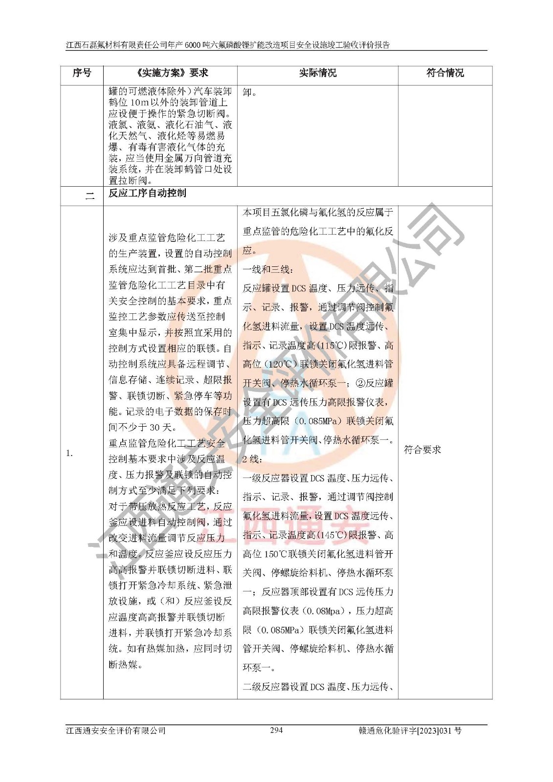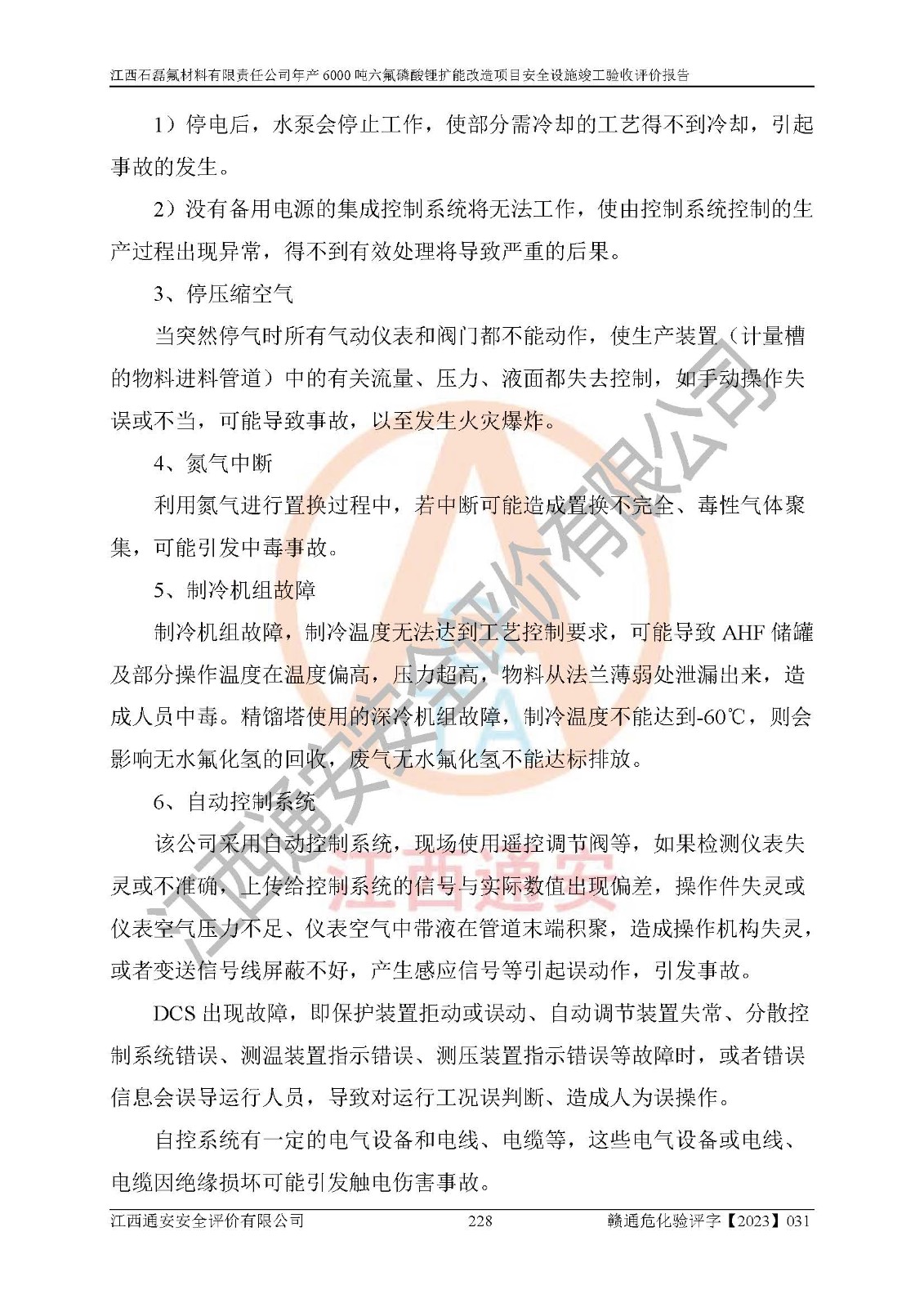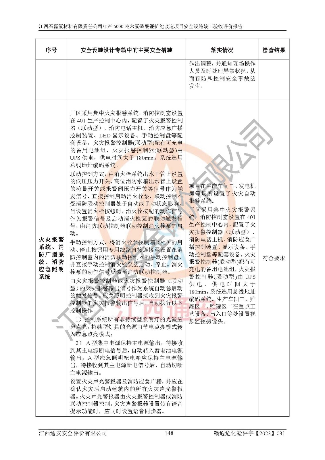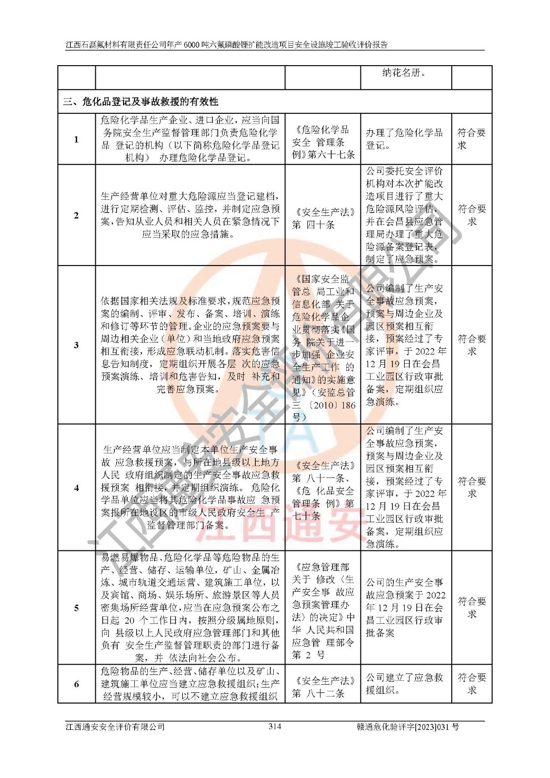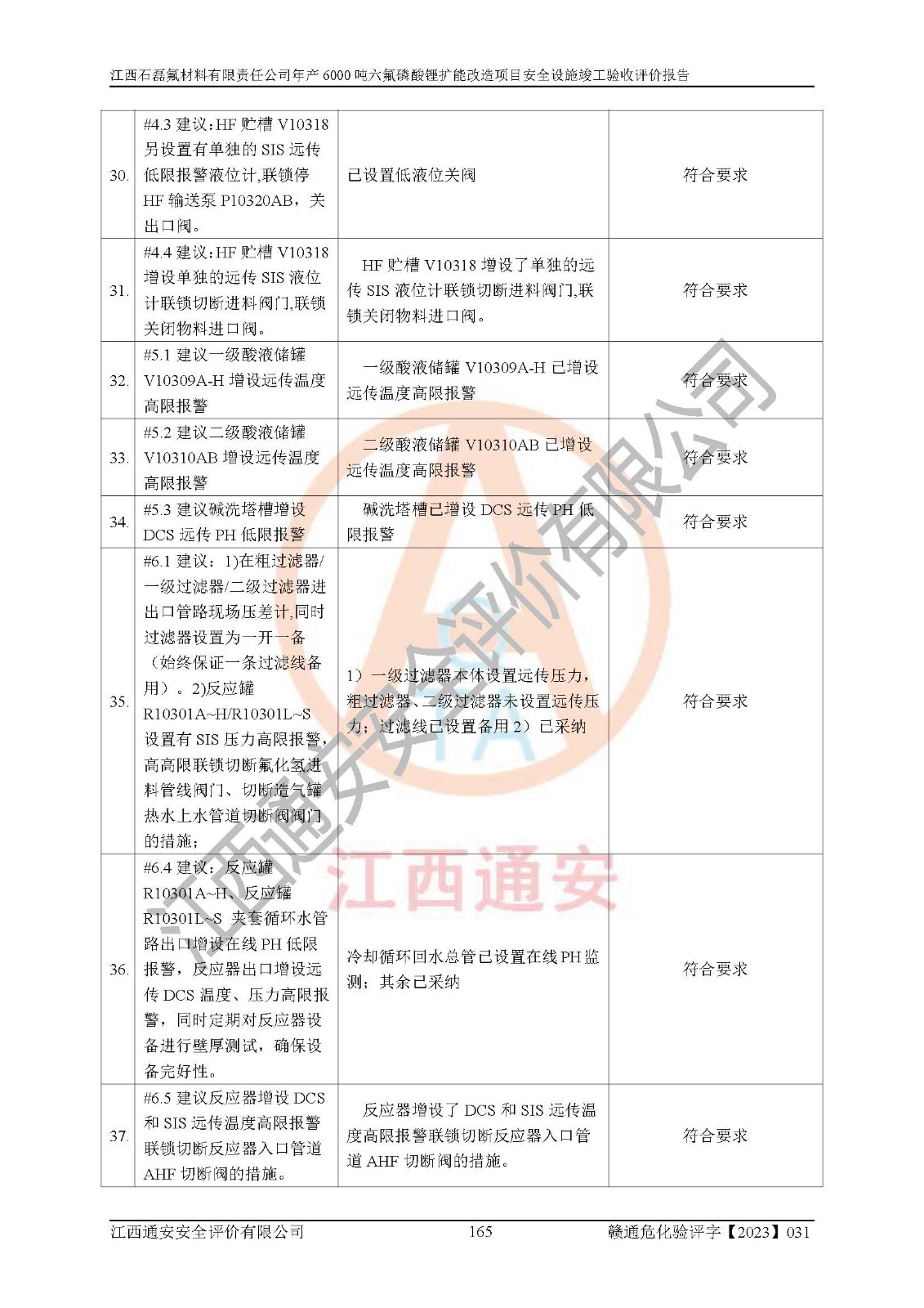 一、建设项目所在地的安全条件和与周边的安全防护距离 (1)该项目位于江西省赣州市会昌县氟盐化工产业基地,属于认定的化工园区,厂址选择合理,该项目与周边环境的防火间距符合规范的要求。 (2)重大危险源与“八类敏感场所及区域”的距离符合相关法律、法规的规定。 (3)该项目103生产车间三和201罐区一均构成**重大危险源。根据《危险化学品生产装置和储存设施外部安全防护距离确定方法》(GB/T 37243-2019)和《危险化学品生产装置和储存设施风险基准》(GB 36894-2018),该项目高敏感防护目标、重要防护目标、一般防护目标中的一类防护目标(<3×10-7)的外部安全防护距离包络线距离厂界*大值为76.36m,个人风险等值线范围内未出现该类防护目标;一般防护目标中的二类防护目标(<3×10-6)的外部安全防护距离包络线距离厂界*大值为51.62m,个人风险等值线范围内未涉及相应的防护目标;一般防护目标中的三类防护目标(<1×10-5)外部安全防护距离的包络线未出厂界。项目外部安全防护距离内无相应的防护目标,该项目不存在社会风险。 (4)该项目投产后在正常生产情况下,对其周边单位的生产、经营活动和居民的生活影响很小。在发生事故的情况下对周边单位的生产、经营活动和居民的生活存在影响。该项目周边单位的生产、经营活动和居民的生活对该项目投产后的正常生产影响很小。该项目所在地自然条件(不包括地震等破坏力**的自然灾害)的变化对该项目投产后的正常生产没有影响。 二、建设项目安全设施设计的采纳情况和已采用(取)的安全设施水平 该项目采用的主要安全设施包括了以下方面:检测、报警设施,设备安全防护设施,作业场所防护设施,安全警示标志,泄压和止逆设施,紧急处理设施,防止火灾蔓延设施,灭火设施,紧急个人处置设施,应急救援设施,劳动防护用品和装备等。 该项目在建设过程中采纳了《安全设施设计专篇》中的有关安全措施建议及要求,针对性的采取了相应的预防和控制措施,建设中未落实的安全措施,在试生产中已进行了整改。试生产表明该项目所采取的安全控制措施安全**,主要生产装置、设备运行平稳,安全可靠,安全水平较高,能够满足安全生产条件。 三、建设项目试生产(使用)后具备**现行有关安全生产法律、法规和部门规章及标准规定和要求的安全生产条件 1)法律法规等方面的符合性:该项目按照建设项目“三同时”要求,项目进行了备案、通过了安全条件审查、安全设施设计审查、试生产方案审查,立项审批手续齐全,安全设施设计、建设施工、施工监理均由有资质的单位承担,项目建设符合法律、法规规定的审批、施工、监理手续。项目建设期间,公司结合生产需要,增设了部分辅助设施和工艺管线,属于一般变更,试生产期间公司已委托河北英科石化工程有限公司进行了设计变更,作为已经审查通过的安全设施设计专篇的补充文件。 2)该项目与周边建构筑物的防火距离符合《精细化工企业工程设计防火标准》《建筑设计防火规范》的要求。根据《危险化学品生产装置和储存设施风险基准》GB36894-2018确定危险化学品单位周边重要目标和敏感场所承受的可容许个人风险和社会风险的定量风险评价。项目的个人风险计算结果表明,项目外部安全防护距离的包络线内无相应的防护目标。该软件未计算出社会风险。因此项目可容许个人风险和社会风险均在可接受范围内。 3)平面布置及常规防护设施措施的合理性:该项目生产场所、办公场所之间的间距满足安全要求,建筑结构、防火分区、防雷设施、安全出口的设置等满足安全生产的要求。消防道路的净宽度、净**、转弯半径均满足运输**及消防**通行。设置的常规防护设施、防止机械伤害、防急性中毒窒息的设施和措施符合要求。 4)设施、设备、装置及工艺方面的安全性:无**明令淘汰的工艺和 设备,该项目不涉及爆炸性危险区域划分。生产工艺操作和设置的安全设施满足安全需要,生产设施的布置能**人员疏散安全及操作方便。设施、设备、装置及工艺方面安全可靠。 5)特种设备、强制检测设备设施监督检验情况:该项目特种设备均进行了检验检测,并取得了检验报告;安全阀、压力表、有毒气体探头也进行了校验,校验结论合格,特种设备及安全附件符合《特种设备安全监察条例》 等相关法律法规、条例的规定。 6)公用工程、辅助设施的配套性:为该项目生产配套的供水、供电、 供气、供热等满足需要。 7)人员管理及安全培训方面充分性:公司现已建立了安全管理机构, 配备了专职安全管理人员。主要负责人王成具备化学工程与工艺专业本科学历,分管生产负责人曾中山具备化学工程与工艺专业本科学历,分管设备和技术负责人刘辉涛具备应用化学专业本科学历。专职安全管理人员共4人,配有一名注册安全工程师,专职安全管理人员均具有大专以上化工及安全专业相关学历。重点监管化工工艺的生产装置、储存设施操作人员具备高中及以上学历或化工类中等及以上职业教育水平。该公司制定了较完善的安全管理制度、岗位责任制、安全操作规程,制度执行情况较好。该公司已为从业职工交纳了工伤**。该公司对操作员工进行相关的培训和教育,经培训合格后上岗。 8)应急救援**性:企业根据自身实际情况,将该项目按照《生产经 营单位生产安全事故