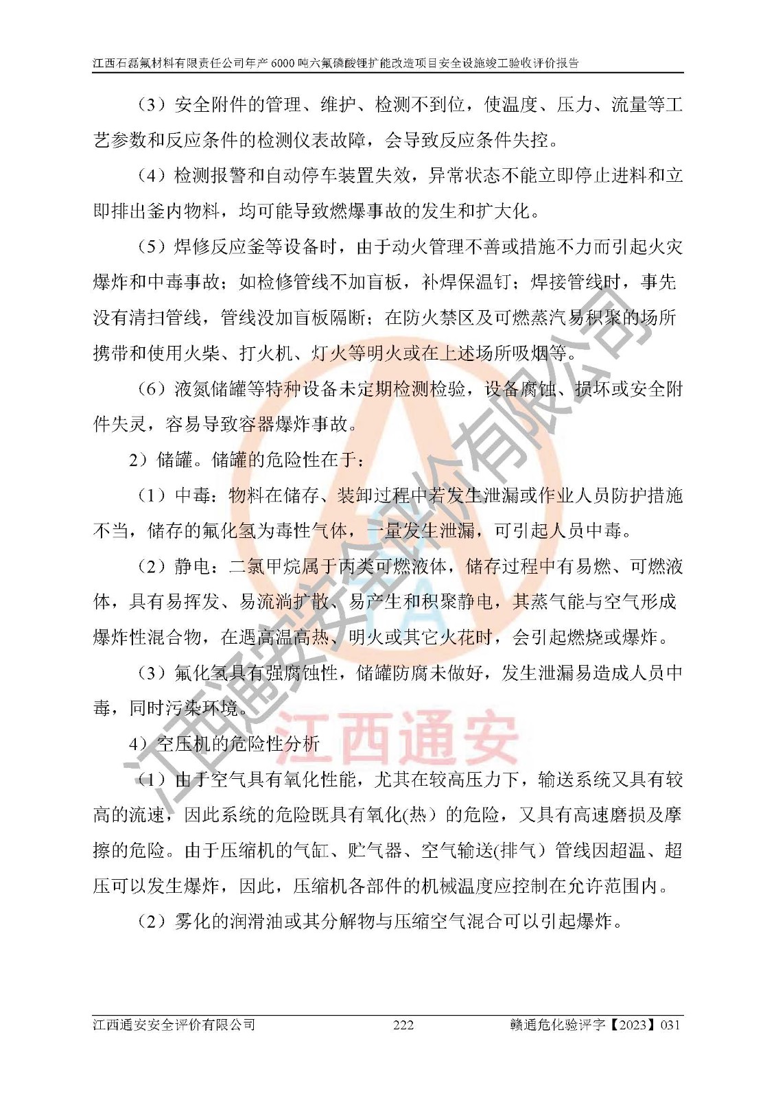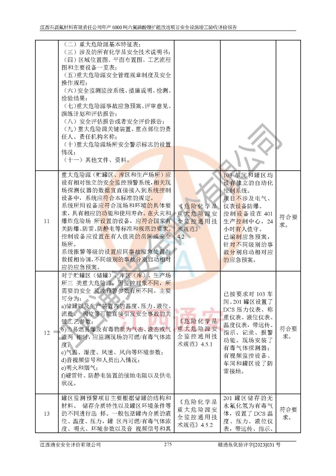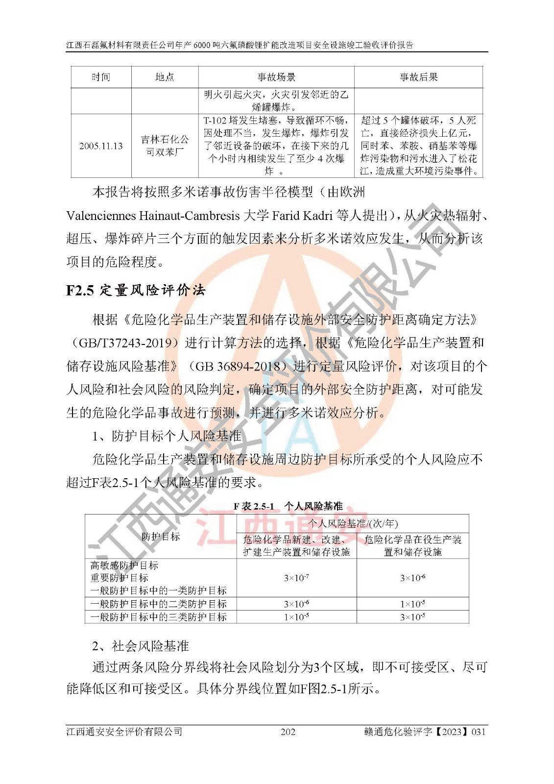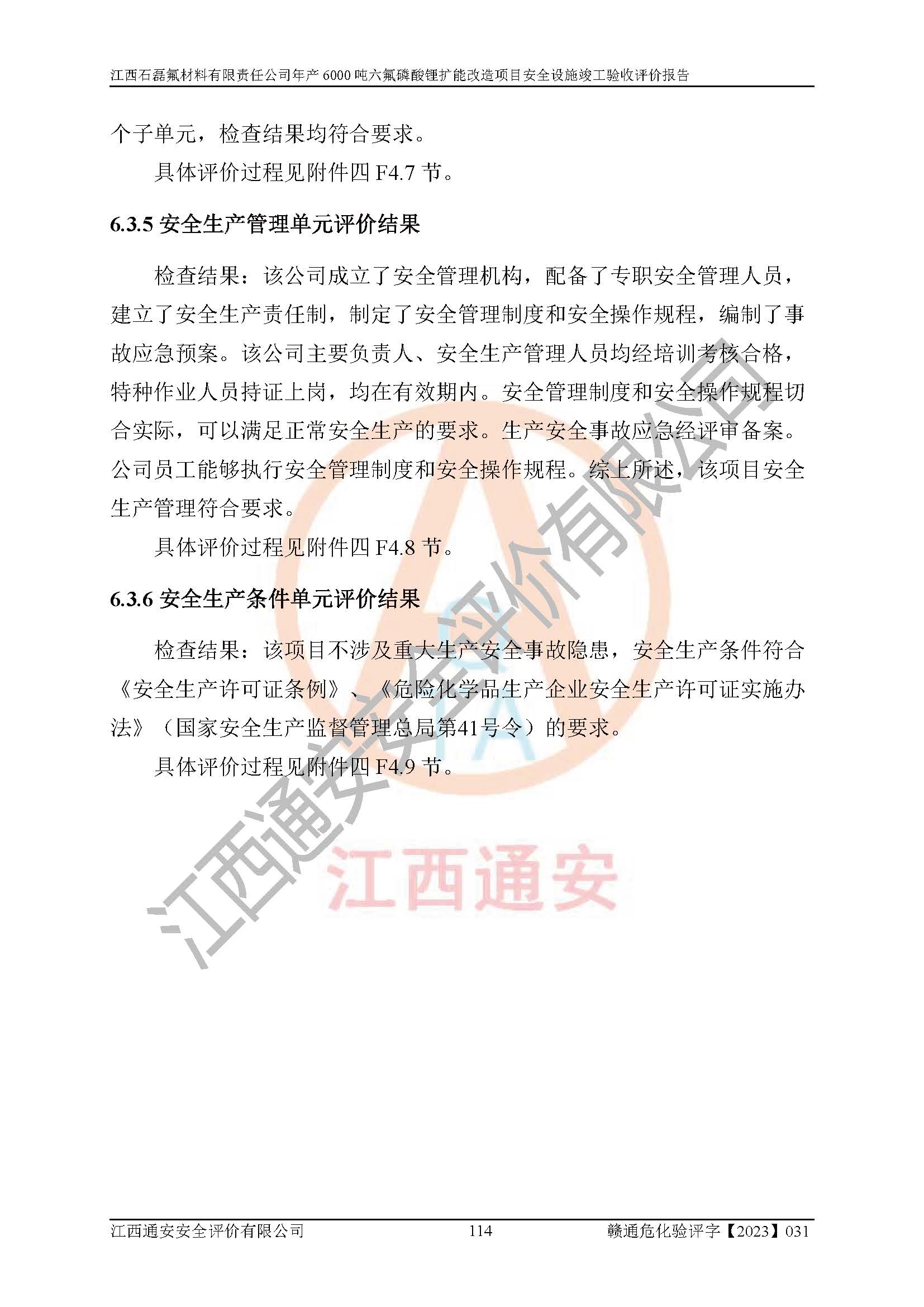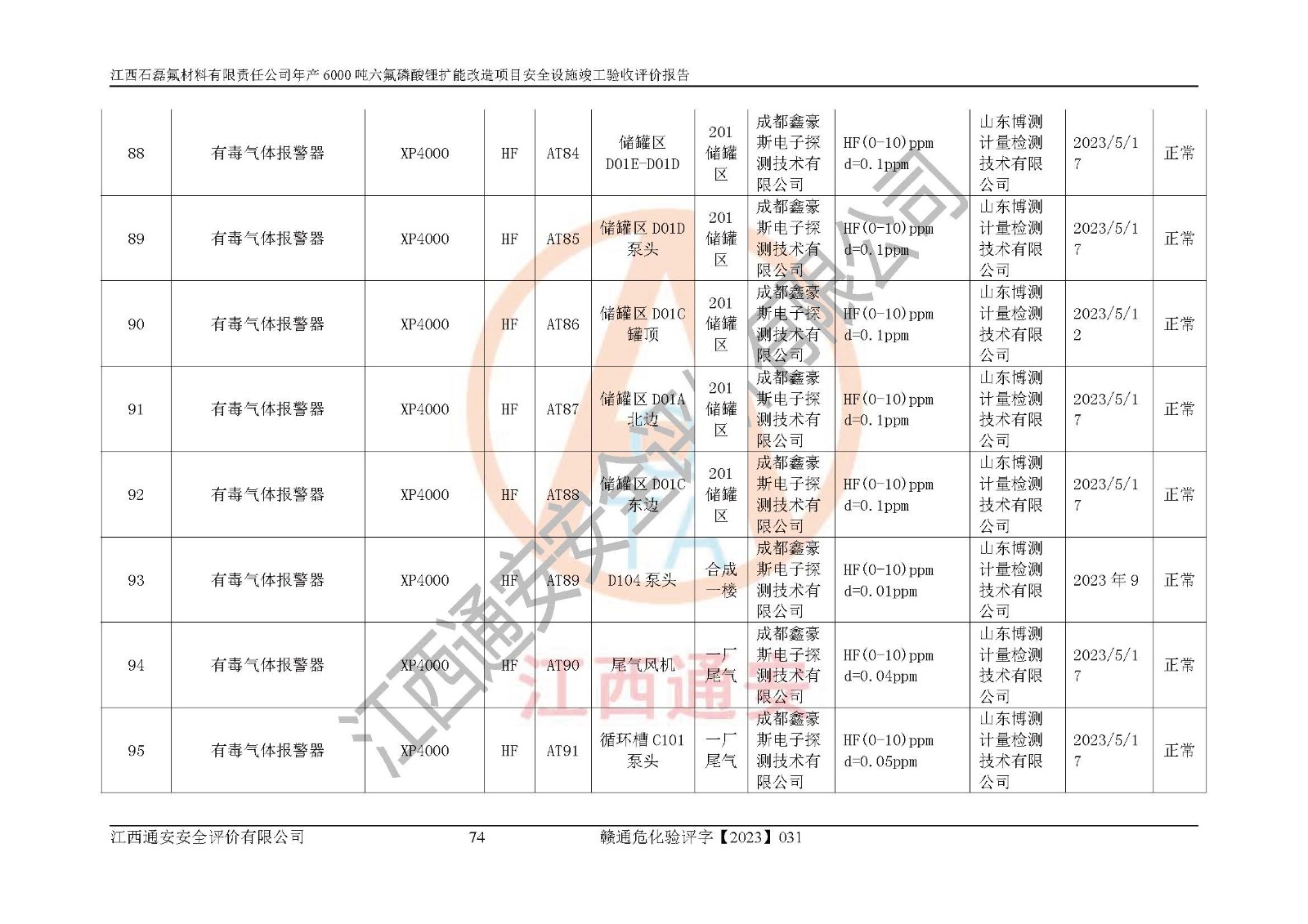 一、建设项目所在地的安全条件和与周边的安全防护距离 (1)该项目位于江西省赣州市会昌县氟盐化工产业基地,属于认定的化工园区,厂址选择合理,该项目与周边环境的防火间距符合规范的要求。 (2)重大危险源与“八类敏感场所及区域”的距离符合相关法律、法规的规定。 (3)该项目103生产车间三和201罐区一均构成**重大危险源。根据《危险化学品生产装置和储存设施外部安全防护距离确定方法》(GB/T 37243-2019)和《危险化学品生产装置和储存设施风险基准》(GB 36894-2018),该项目高敏感防护目标、重要防护目标、一般防护目标中的一类防护目标(<3×10-7)的外部安全防护距离包络线距离厂界*大值为76.36m,个人风险等值线范围内未出现该类防护目标;一般防护目标中的二类防护目标(<3×10-6)的外部安全防护距离包络线距离厂界*大值为51.62m,个人风险等值线范围内未涉及相应的防护目标;一般防护目标中的三类防护目标(<1×10-5)外部安全防护距离的包络线未出厂界。项目外部安全防护距离内无相应的防护目标,该项目不存在社会风险。 (4)该项目投产后在正常生产情况下,对其周边单位的生产、经营活动和居民的生活影响很小。在发生事故的情况下对周边单位的生产、经营活动和居民的生活存在影响。该项目周边单位的生产、经营活动和居民的生活对该项目投产后的正常生产影响很小。该项目所在地自然条件(不包括地震等破坏力**的自然灾害)的变化对该项目投产后的正常生产没有影响。 二、建设项目安全设施设计的采纳情况和已采用(取)的安全设施水平 该项目采用的主要安全设施包括了以下方面:检测、报警设施,设备安全防护设施,作业场所防护设施,安全警示标志,泄压和止逆设施,紧急处理设施,防止火灾蔓延设施,灭火设施,紧急个人处置设施,应急救援设施,劳动防护用品和装备等。 该项目在建设过程中采纳了《安全设施设计专篇》中的有关安全措施建议及要求,针对性的采取了相应的预防和控制措施,建设中未落实的安全措施,在试生产中已进行了整改。试生产表明该项目所采取的安全控制措施安全**,主要生产装置、设备运行平稳,安全可靠,安全水平较高,能够满足安全生产条件。 三、建设项目试生产(使用)后具备**现行有关安全生产法律、法规和部门规章及标准规定和要求的安全生产条件 1)法律法规等方面的符合性:该项目按照建设项目“三同时”要求,项目进行了备案、通过了安全条件审查、安全设施设计审查、试生产方案审查,立项审批手续齐全,安全设施设计、建设施工、施工监理均由有资质的单位承担,项目建设符合法律、法规规定的审批、施工、监理手续。项目建设期间,公司结合生产需要,增设了部分辅助设施和工艺管线,属于一般变更,试生产期间公司已委托河北英科石化工程有限公司进行了设计变更,作为已经审查通过的安全设施设计专篇的补充文件。 2)该项目与周边建构筑物的防火距离符合《精细化工企业工程设计防火标准》《建筑设计防火规范》的要求。根据《危险化学品生产装置和储存设施风险基准》GB36894-2018确定危险化学品单位周边重要目标和敏感场所承受的可容许个人风险和社会风险的定量风险评价。项目的个人风险计算结果表明,项目外部安全防护距离的包络线内无相应的防护目标。该软件未计算出社会风险。因此项目可容许个人风险和社会风险均在可接受范围内。 3)平面布置及常规防护设施措施的合理性:该项目生产场所、办公场所之间的间距满足安全要求,建筑结构、防火分区、防雷设施、安全出口的设置等满足安全生产的要求。消防道路的净宽度、净**、转弯半径均满足运输**及消防**通行。设置的常规防护设施、防止机械伤害、防急性中毒窒息的设施和措施符合要求。 4)设施、设备、装置及工艺方面的安全性:无**明令淘汰的工艺和 设备,该项目不涉及爆炸性危险区域划分。生产工艺操作和设置的安全设施满足安全需要,生产设施的布置能**人员疏散安全及操作方便。设施、设备、装置及工艺方面安全可靠。 5)特种设备、强制检测设备设施监督检验情况:该项目特种设备均进行了检验检测,并取得了检验报告;安全阀、压力表、有毒气体探头也进行了校验,校验结论合格,特种设备及安全附件符合《特种设备安全监察条例》 等相关法律法规、条例的规定。 6)公用工程、辅助设施的配套性:为该项目生产配套的供水、供电、 供气、供热等满足需要。 7)人员管理及安全培训方面充分性:公司现已建立了安全管理机构, 配备了专职安全管理人员。主要负责人王成具备化学工程与工艺专业本科学历,分管生产负责人曾中山具备化学工程与工艺专业本科学历,分管设备和技术负责人刘辉涛具备应用化学专业本科学历。专职安全管理人员共4人,配有一名注册安全工程师,专职安全管理人员均具有大专以上化工及安全专业相关学历。重点监管化工工艺的生产装置、储存设施操作人员具备高中及以上学历或化工类中等及以上职业教育水平。该公司制定了较完善的安全管理制度、岗位责任制、安全操作规程,制度执行情况较好。该公司已为从业职工交纳了工伤**。该公司对操作员工进行相关的培训和教育,经培训合格后上岗。 8)应急救援**性:企业根据自身实际情况,将该项目按照《生产经 营单位生产安全事故