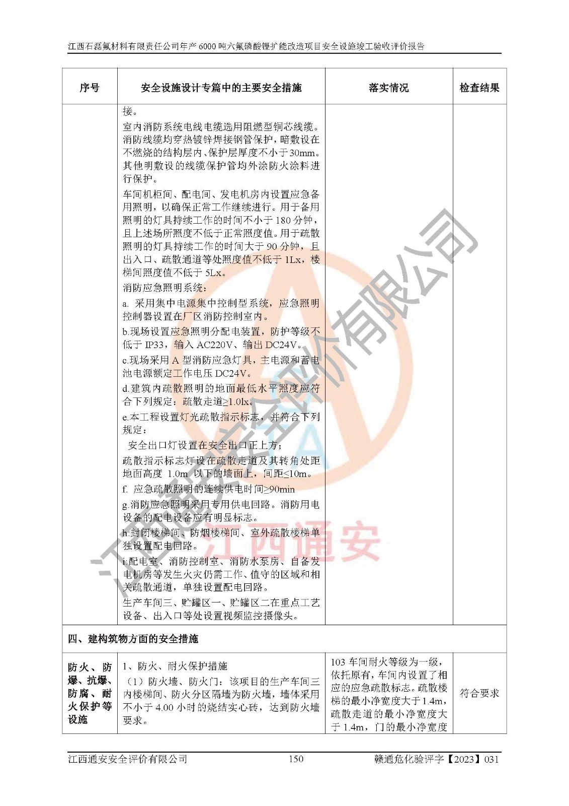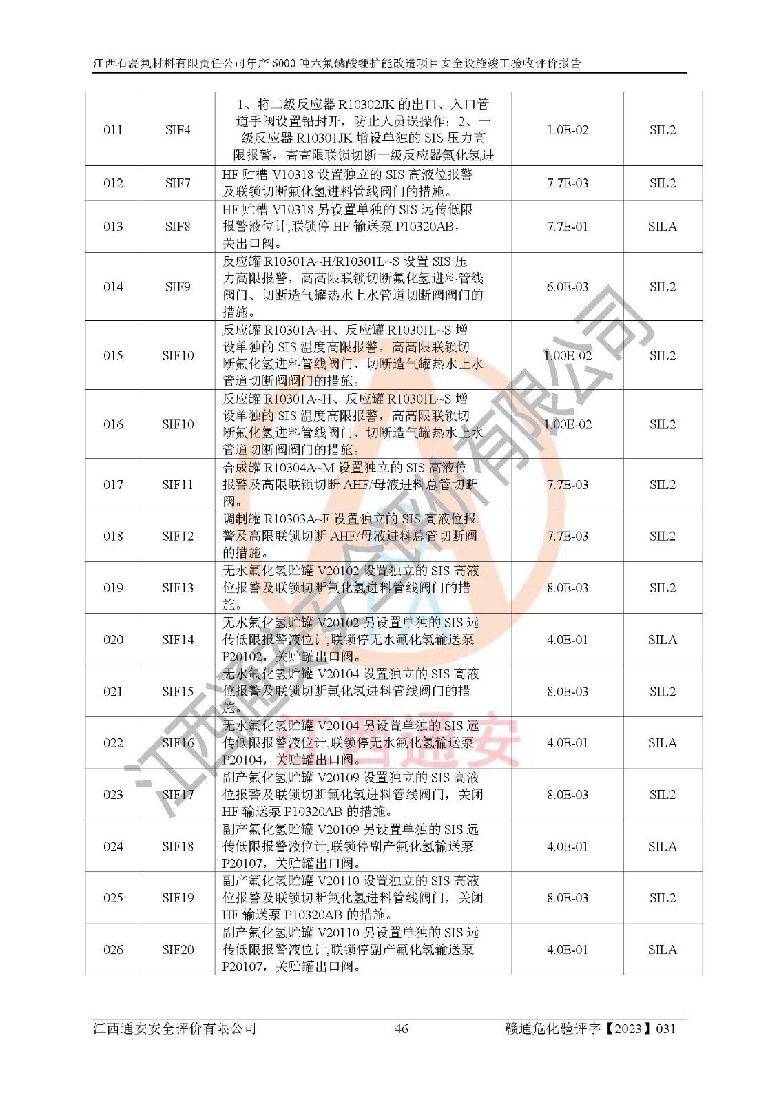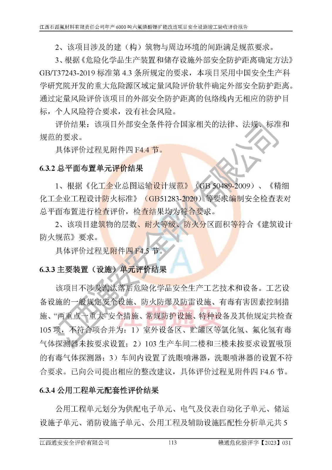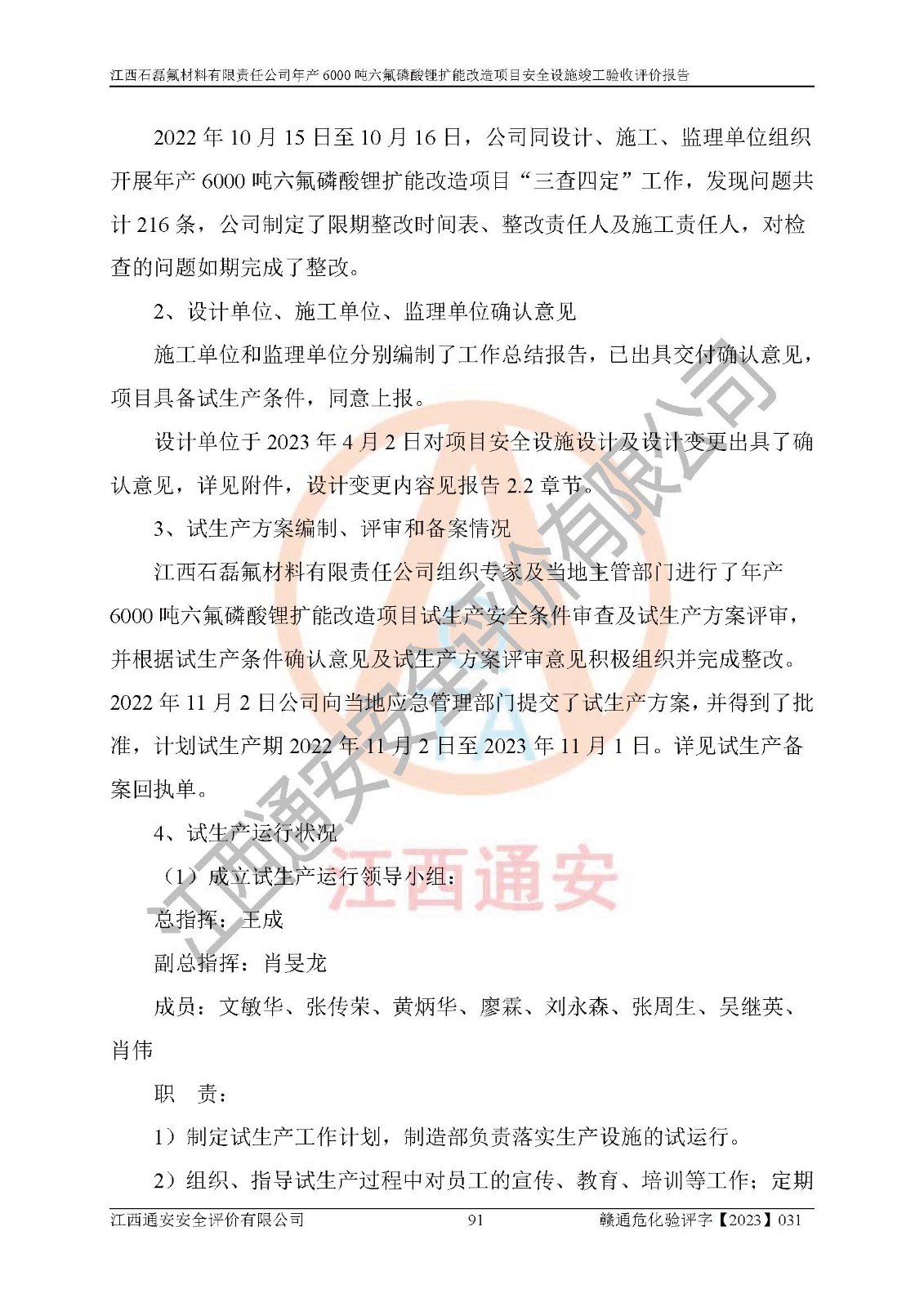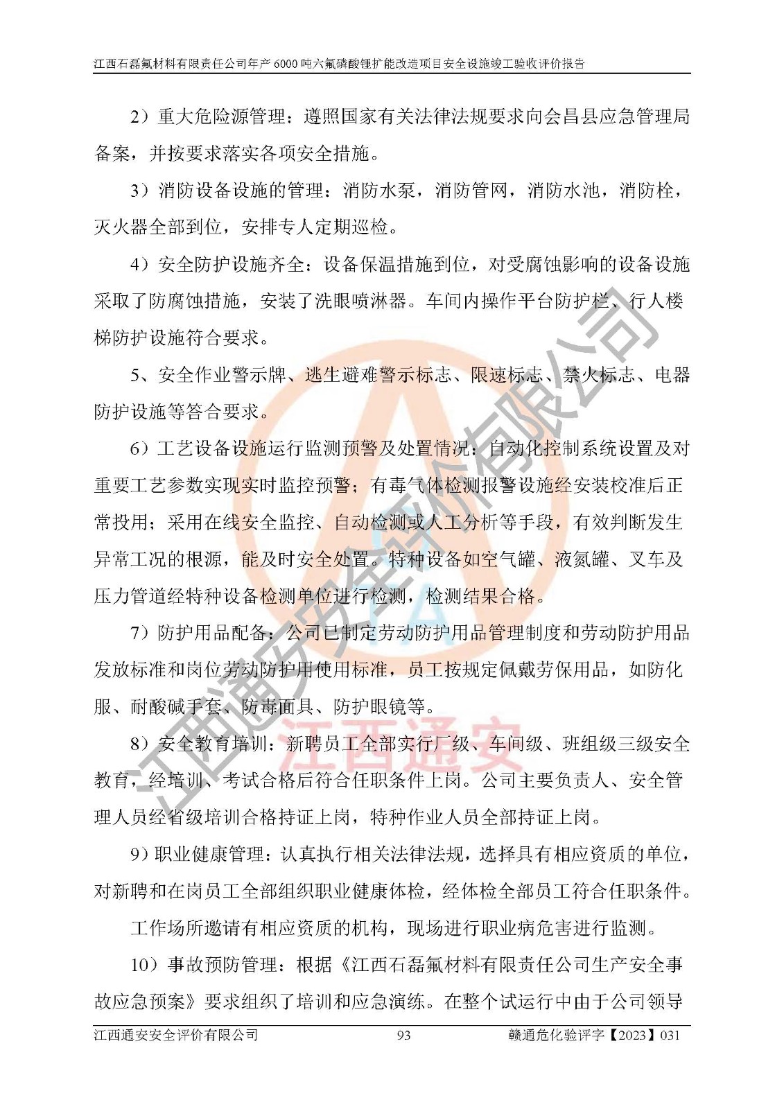 一、建设项目所在地的安全条件和与周边的安全防护距离 (1)该项目位于江西省赣州市会昌县氟盐化工产业基地,属于认定的化工园区,厂址选择合理,该项目与周边环境的防火间距符合规范的要求。 (2)重大危险源与“八类敏感场所及区域”的距离符合相关法律、法规的规定。 (3)该项目103生产车间三和201罐区一均构成**重大危险源。根据《危险化学品生产装置和储存设施外部安全防护距离确定方法》(GB/T 37243-2019)和《危险化学品生产装置和储存设施风险基准》(GB 36894-2018),该项目高敏感防护目标、重要防护目标、一般防护目标中的一类防护目标(<3×10-7)的外部安全防护距离包络线距离厂界*大值为76.36m,个人风险等值线范围内未出现该类防护目标;一般防护目标中的二类防护目标(<3×10-6)的外部安全防护距离包络线距离厂界*大值为51.62m,个人风险等值线范围内未涉及相应的防护目标;一般防护目标中的三类防护目标(<1×10-5)外部安全防护距离的包络线未出厂界。项目外部安全防护距离内无相应的防护目标,该项目不存在社会风险。 (4)该项目投产后在正常生产情况下,对其周边单位的生产、经营活动和居民的生活影响很小。在发生事故的情况下对周边单位的生产、经营活动和居民的生活存在影响。该项目周边单位的生产、经营活动和居民的生活对该项目投产后的正常生产影响很小。该项目所在地自然条件(不包括地震等破坏力**的自然灾害)的变化对该项目投产后的正常生产没有影响。 二、建设项目安全设施设计的采纳情况和已采用(取)的安全设施水平 该项目采用的主要安全设施包括了以下方面:检测、报警设施,设备安全防护设施,作业场所防护设施,安全警示标志,泄压和止逆设施,紧急处理设施,防止火灾蔓延设施,灭火设施,紧急个人处置设施,应急救援设施,劳动防护用品和装备等。 该项目在建设过程中采纳了《安全设施设计专篇》中的有关安全措施建议及要求,针对性的采取了相应的预防和控制措施,建设中未落实的安全措施,在试生产中已进行了整改。试生产表明该项目所采取的安全控制措施安全**,主要生产装置、设备运行平稳,安全可靠,安全水平较高,能够满足安全生产条件。 三、建设项目试生产(使用)后具备**现行有关安全生产法律、法规和部门规章及标准规定和要求的安全生产条件 1)法律法规等方面的符合性:该项目按照建设项目“三同时”要求,项目进行了备案、通过了安全条件审查、安全设施设计审查、试生产方案审查,立项审批手续齐全,安全设施设计、建设施工、施工监理均由有资质的单位承担,项目建设符合法律、法规规定的审批、施工、监理手续。项目建设期间,公司结合生产需要,增设了部分辅助设施和工艺管线,属于一般变更,试生产期间公司已委托河北英科石化工程有限公司进行了设计变更,作为已经审查通过的安全设施设计专篇的补充文件。 2)该项目与周边建构筑物的防火距离符合《精细化工企业工程设计防火标准》《建筑设计防火规范》的要求。根据《危险化学品生产装置和储存设施风险基准》GB36894-2018确定危险化学品单位周边重要目标和敏感场所承受的可容许个人风险和社会风险的定量风险评价。项目的个人风险计算结果表明,项目外部安全防护距离的包络线内无相应的防护目标。该软件未计算出社会风险。因此项目可容许个人风险和社会风险均在可接受范围内。 3)平面布置及常规防护设施措施的合理性:该项目生产场所、办公场所之间的间距满足安全要求,建筑结构、防火分区、防雷设施、安全出口的设置等满足安全生产的要求。消防道路的净宽度、净**、转弯半径均满足运输**及消防**通行。设置的常规防护设施、防止机械伤害、防急性中毒窒息的设施和措施符合要求。 4)设施、设备、装置及工艺方面的安全性:无**明令淘汰的工艺和 设备,该项目不涉及爆炸性危险区域划分。生产工艺操作和设置的安全设施满足安全需要,生产设施的布置能**人员疏散安全及操作方便。设施、设备、装置及工艺方面安全可靠。 5)特种设备、强制检测设备设施监督检验情况:该项目特种设备均进行了检验检测,并取得了检验报告;安全阀、压力表、有毒气体探头也进行了校验,校验结论合格,特种设备及安全附件符合《特种设备安全监察条例》 等相关法律法规、条例的规定。 6)公用工程、辅助设施的配套性:为该项目生产配套的供水、供电、 供气、供热等满足需要。 7)人员管理及安全培训方面充分性:公司现已建立了安全管理机构, 配备了专职安全管理人员。主要负责人王成具备化学工程与工艺专业本科学历,分管生产负责人曾中山具备化学工程与工艺专业本科学历,分管设备和技术负责人刘辉涛具备应用化学专业本科学历。专职安全管理人员共4人,配有一名注册安全工程师,专职安全管理人员均具有大专以上化工及安全专业相关学历。重点监管化工工艺的生产装置、储存设施操作人员具备高中及以上学历或化工类中等及以上职业教育水平。该公司制定了较完善的安全管理制度、岗位责任制、安全操作规程,制度执行情况较好。该公司已为从业职工交纳了工伤**。该公司对操作员工进行相关的培训和教育,经培训合格后上岗。 8)应急救援**性:企业根据自身实际情况,将该项目按照《生产经 营单位生产安全事故