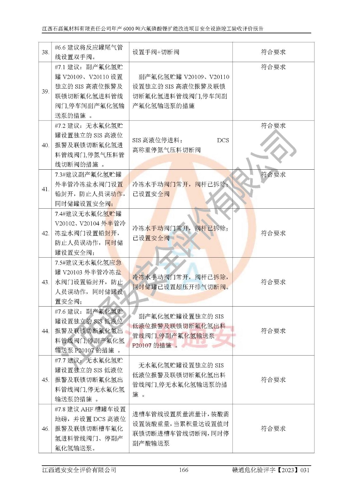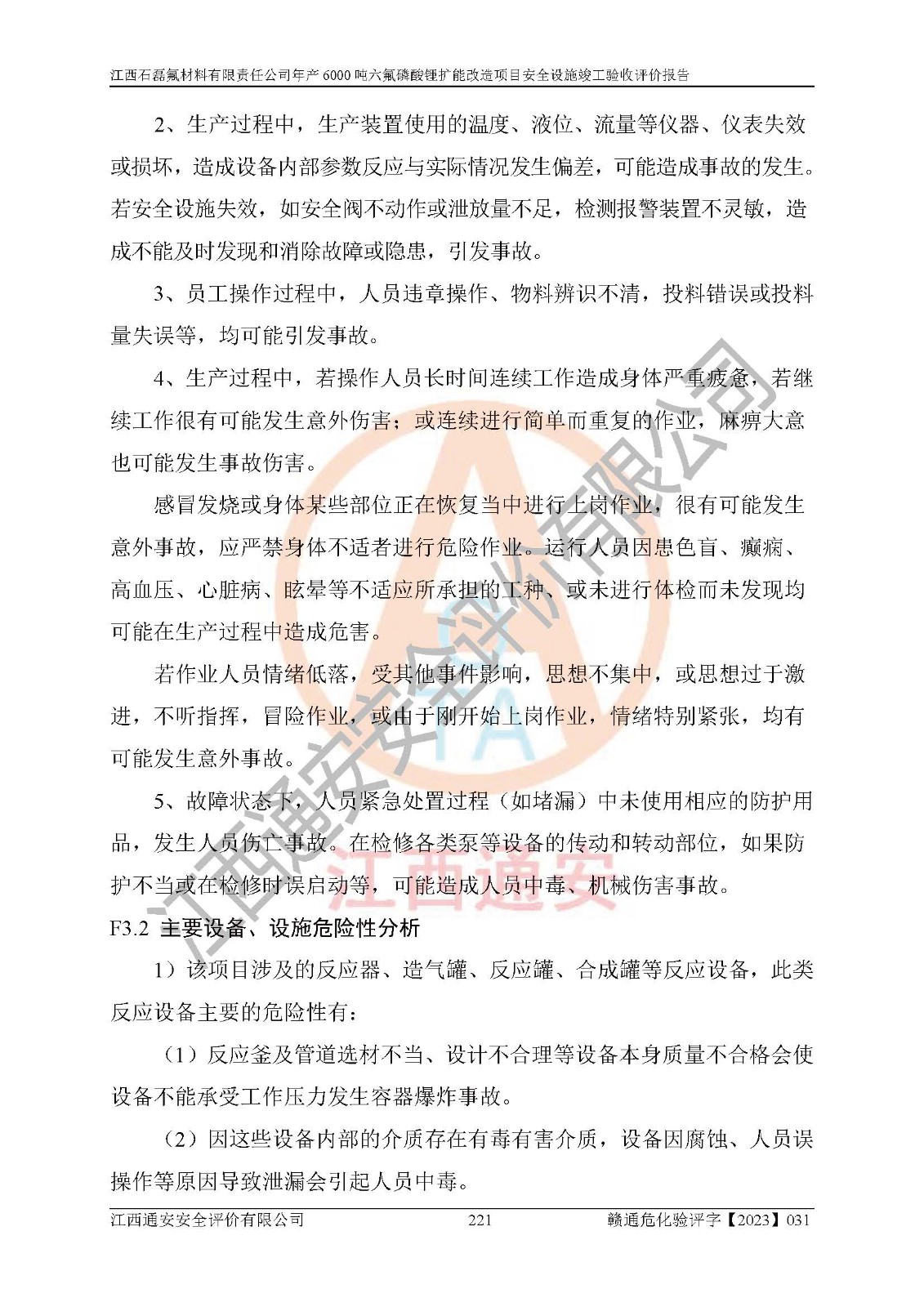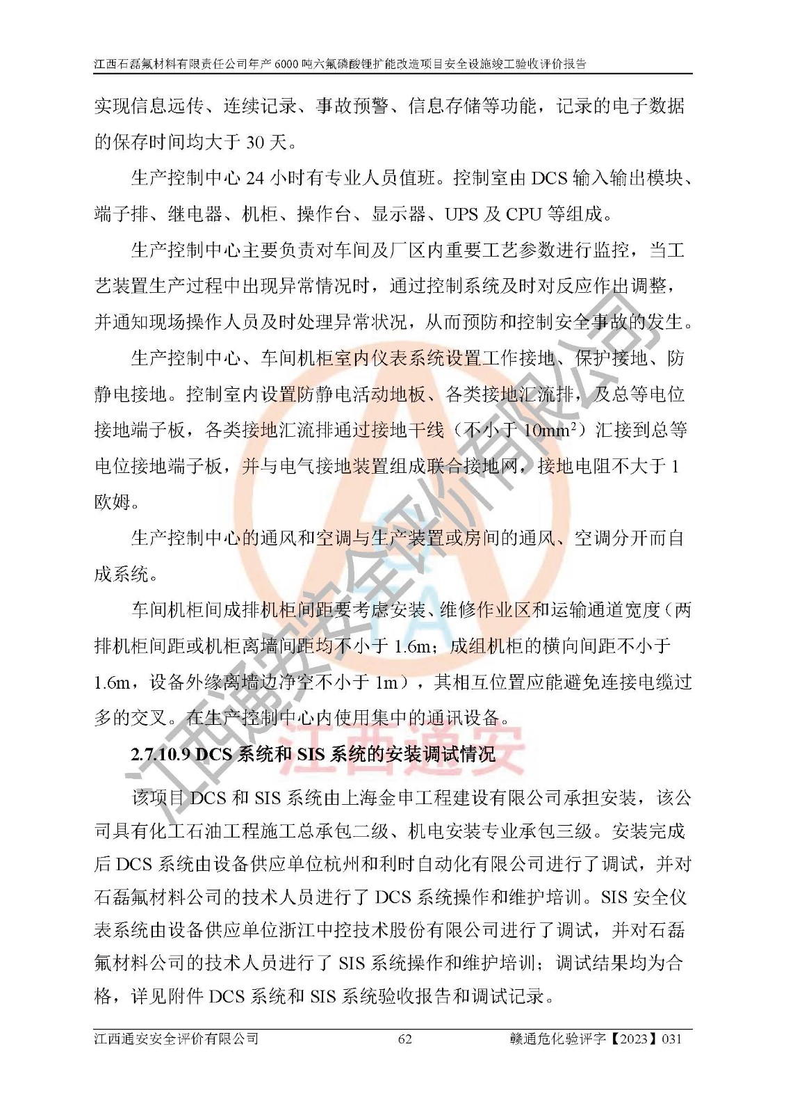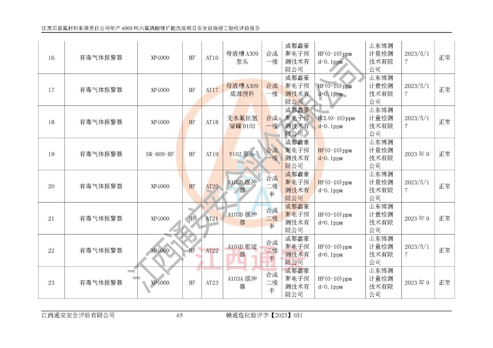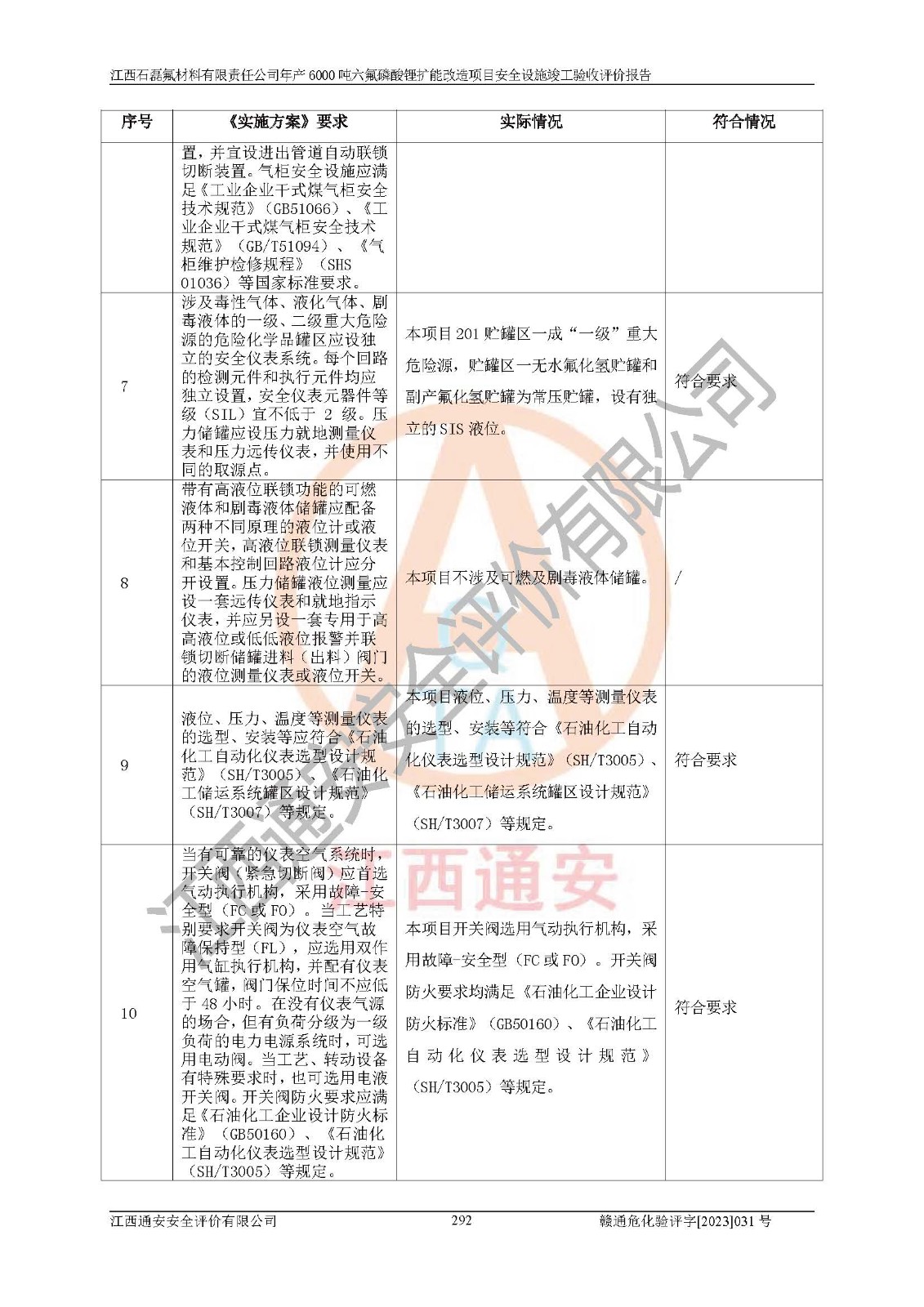 一、建设项目所在地的安全条件和与周边的安全防护距离 (1)该项目位于江西省赣州市会昌县氟盐化工产业基地,属于认定的化工园区,厂址选择合理,该项目与周边环境的防火间距符合规范的要求。 (2)重大危险源与“八类敏感场所及区域”的距离符合相关法律、法规的规定。 (3)该项目103生产车间三和201罐区一均构成**重大危险源。根据《危险化学品生产装置和储存设施外部安全防护距离确定方法》(GB/T 37243-2019)和《危险化学品生产装置和储存设施风险基准》(GB 36894-2018),该项目高敏感防护目标、重要防护目标、一般防护目标中的一类防护目标(<3×10-7)的外部安全防护距离包络线距离厂界*大值为76.36m,个人风险等值线范围内未出现该类防护目标;一般防护目标中的二类防护目标(<3×10-6)的外部安全防护距离包络线距离厂界*大值为51.62m,个人风险等值线范围内未涉及相应的防护目标;一般防护目标中的三类防护目标(<1×10-5)外部安全防护距离的包络线未出厂界。项目外部安全防护距离内无相应的防护目标,该项目不存在社会风险。 (4)该项目投产后在正常生产情况下,对其周边单位的生产、经营活动和居民的生活影响很小。在发生事故的情况下对周边单位的生产、经营活动和居民的生活存在影响。该项目周边单位的生产、经营活动和居民的生活对该项目投产后的正常生产影响很小。该项目所在地自然条件(不包括地震等破坏力**的自然灾害)的变化对该项目投产后的正常生产没有影响。 二、建设项目安全设施设计的采纳情况和已采用(取)的安全设施水平 该项目采用的主要安全设施包括了以下方面:检测、报警设施,设备安全防护设施,作业场所防护设施,安全警示标志,泄压和止逆设施,紧急处理设施,防止火灾蔓延设施,灭火设施,紧急个人处置设施,应急救援设施,劳动防护用品和装备等。 该项目在建设过程中采纳了《安全设施设计专篇》中的有关安全措施建议及要求,针对性的采取了相应的预防和控制措施,建设中未落实的安全措施,在试生产中已进行了整改。试生产表明该项目所采取的安全控制措施安全**,主要生产装置、设备运行平稳,安全可靠,安全水平较高,能够满足安全生产条件。 三、建设项目试生产(使用)后具备**现行有关安全生产法律、法规和部门规章及标准规定和要求的安全生产条件 1)法律法规等方面的符合性:该项目按照建设项目“三同时”要求,项目进行了备案、通过了安全条件审查、安全设施设计审查、试生产方案审查,立项审批手续齐全,安全设施设计、建设施工、施工监理均由有资质的单位承担,项目建设符合法律、法规规定的审批、施工、监理手续。项目建设期间,公司结合生产需要,增设了部分辅助设施和工艺管线,属于一般变更,试生产期间公司已委托河北英科石化工程有限公司进行了设计变更,作为已经审查通过的安全设施设计专篇的补充文件。 2)该项目与周边建构筑物的防火距离符合《精细化工企业工程设计防火标准》《建筑设计防火规范》的要求。根据《危险化学品生产装置和储存设施风险基准》GB36894-2018确定危险化学品单位周边重要目标和敏感场所承受的可容许个人风险和社会风险的定量风险评价。项目的个人风险计算结果表明,项目外部安全防护距离的包络线内无相应的防护目标。该软件未计算出社会风险。因此项目可容许个人风险和社会风险均在可接受范围内。 3)平面布置及常规防护设施措施的合理性:该项目生产场所、办公场所之间的间距满足安全要求,建筑结构、防火分区、防雷设施、安全出口的设置等满足安全生产的要求。消防道路的净宽度、净**、转弯半径均满足运输**及消防**通行。设置的常规防护设施、防止机械伤害、防急性中毒窒息的设施和措施符合要求。 4)设施、设备、装置及工艺方面的安全性:无**明令淘汰的工艺和 设备,该项目不涉及爆炸性危险区域划分。生产工艺操作和设置的安全设施满足安全需要,生产设施的布置能**人员疏散安全及操作方便。设施、设备、装置及工艺方面安全可靠。 5)特种设备、强制检测设备设施监督检验情况:该项目特种设备均进行了检验检测,并取得了检验报告;安全阀、压力表、有毒气体探头也进行了校验,校验结论合格,特种设备及安全附件符合《特种设备安全监察条例》 等相关法律法规、条例的规定。 6)公用工程、辅助设施的配套性:为该项目生产配套的供水、供电、 供气、供热等满足需要。 7)人员管理及安全培训方面充分性:公司现已建立了安全管理机构, 配备了专职安全管理人员。主要负责人王成具备化学工程与工艺专业本科学历,分管生产负责人曾中山具备化学工程与工艺专业本科学历,分管设备和技术负责人刘辉涛具备应用化学专业本科学历。专职安全管理人员共4人,配有一名注册安全工程师,专职安全管理人员均具有大专以上化工及安全专业相关学历。重点监管化工工艺的生产装置、储存设施操作人员具备高中及以上学历或化工类中等及以上职业教育水平。该公司制定了较完善的安全管理制度、岗位责任制、安全操作规程,制度执行情况较好。该公司已为从业职工交纳了工伤**。该公司对操作员工进行相关的培训和教育,经培训合格后上岗。 8)应急救援**性:企业根据自身实际情况,将该项目按照《生产经 营单位生产安全事故