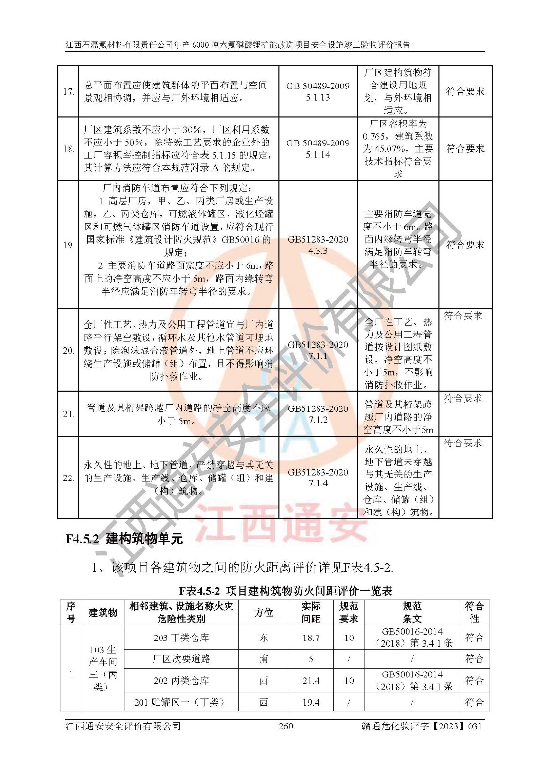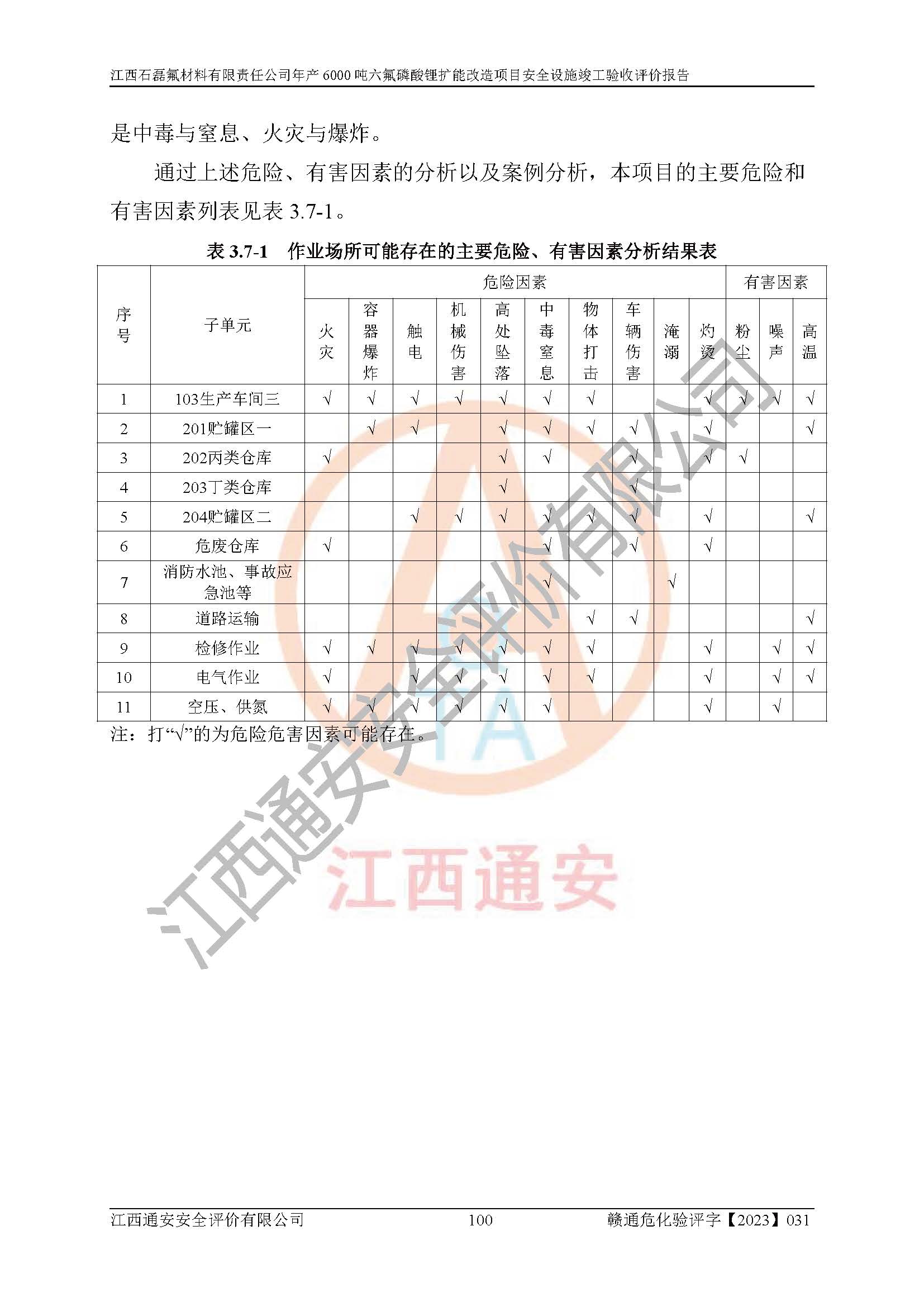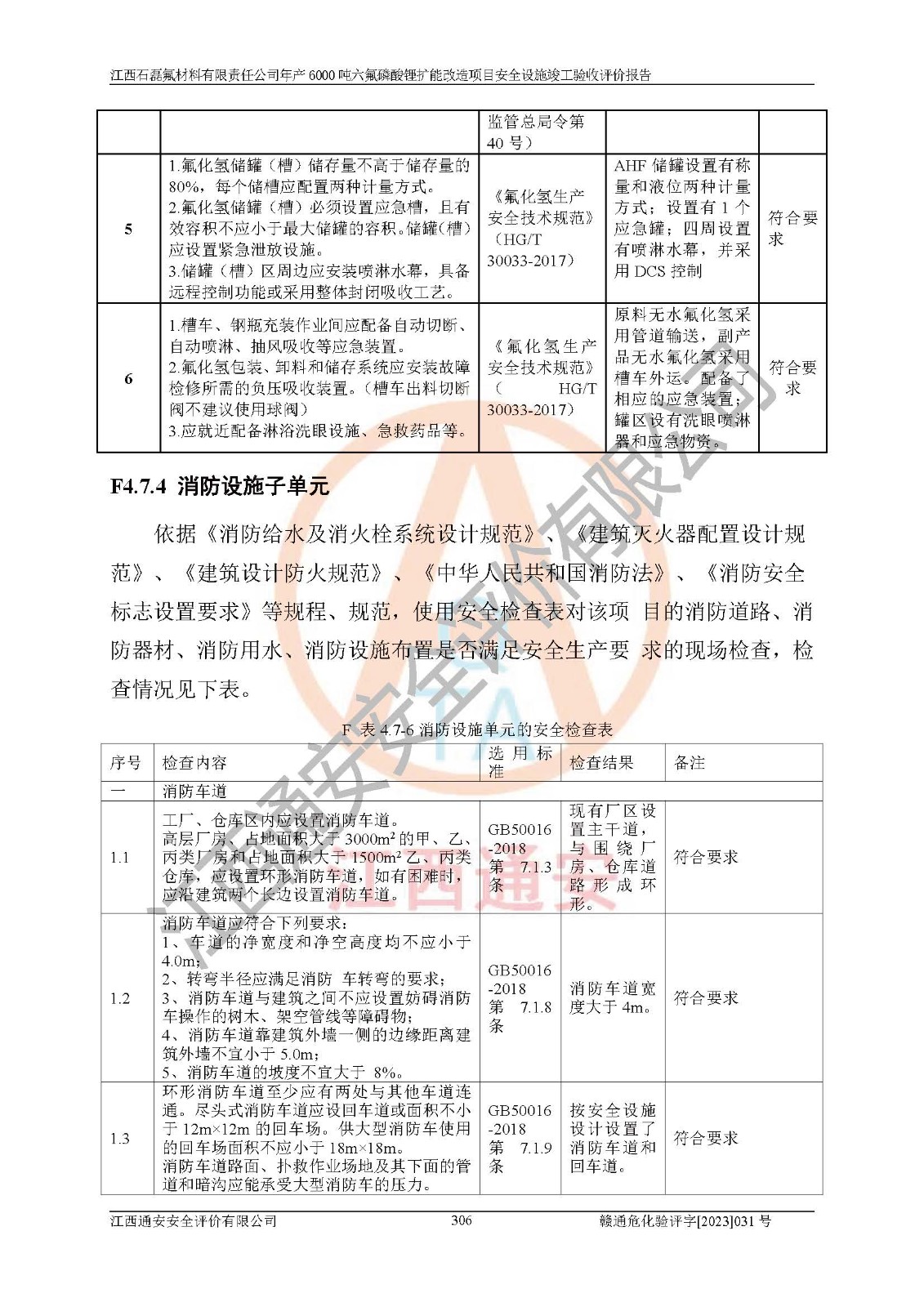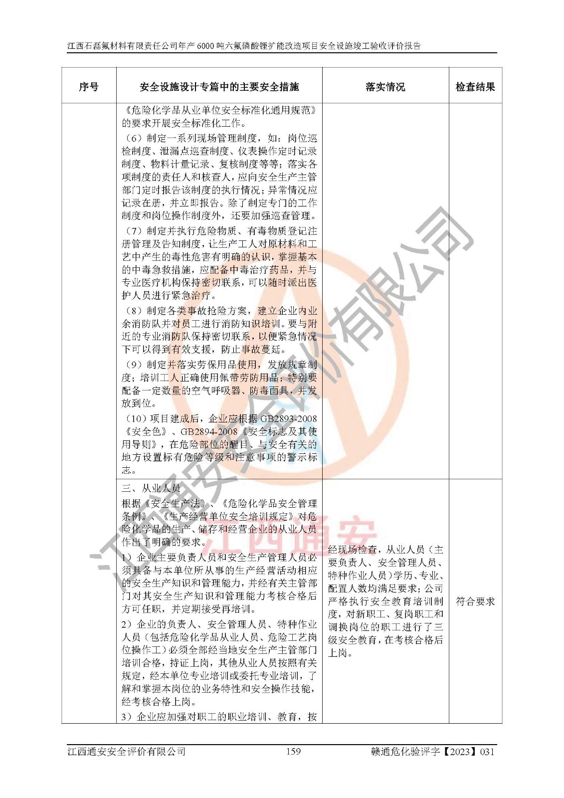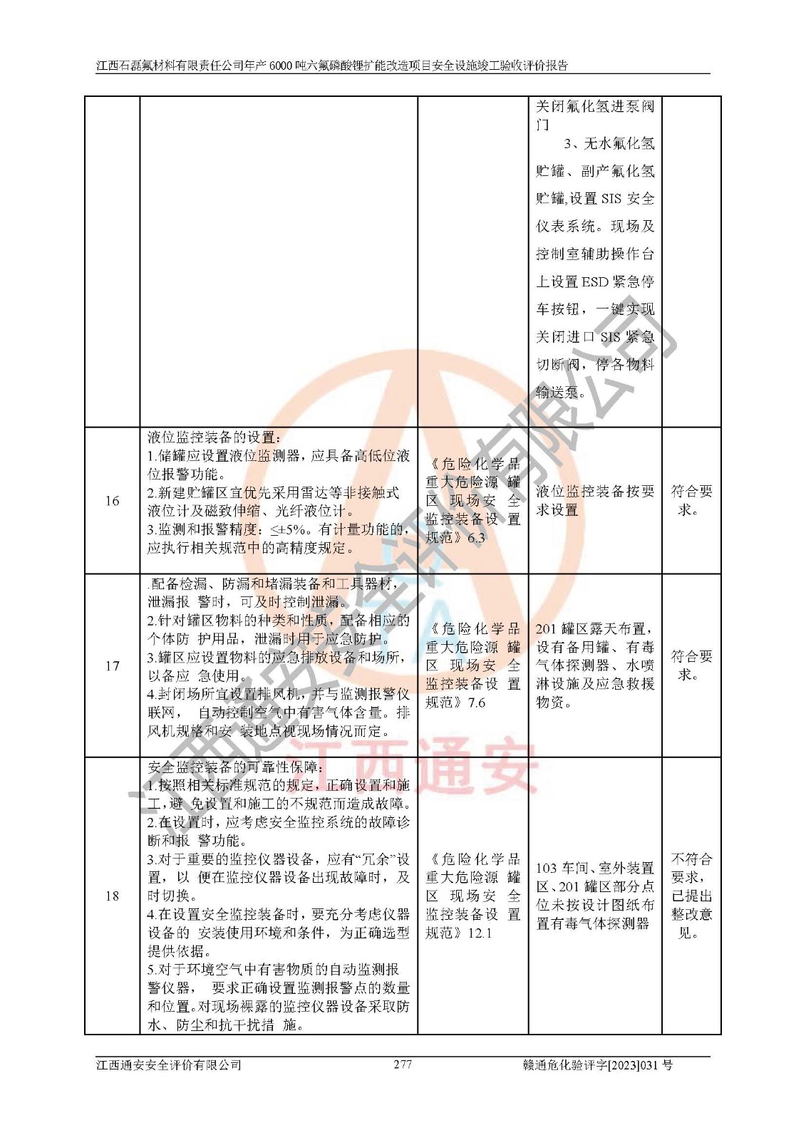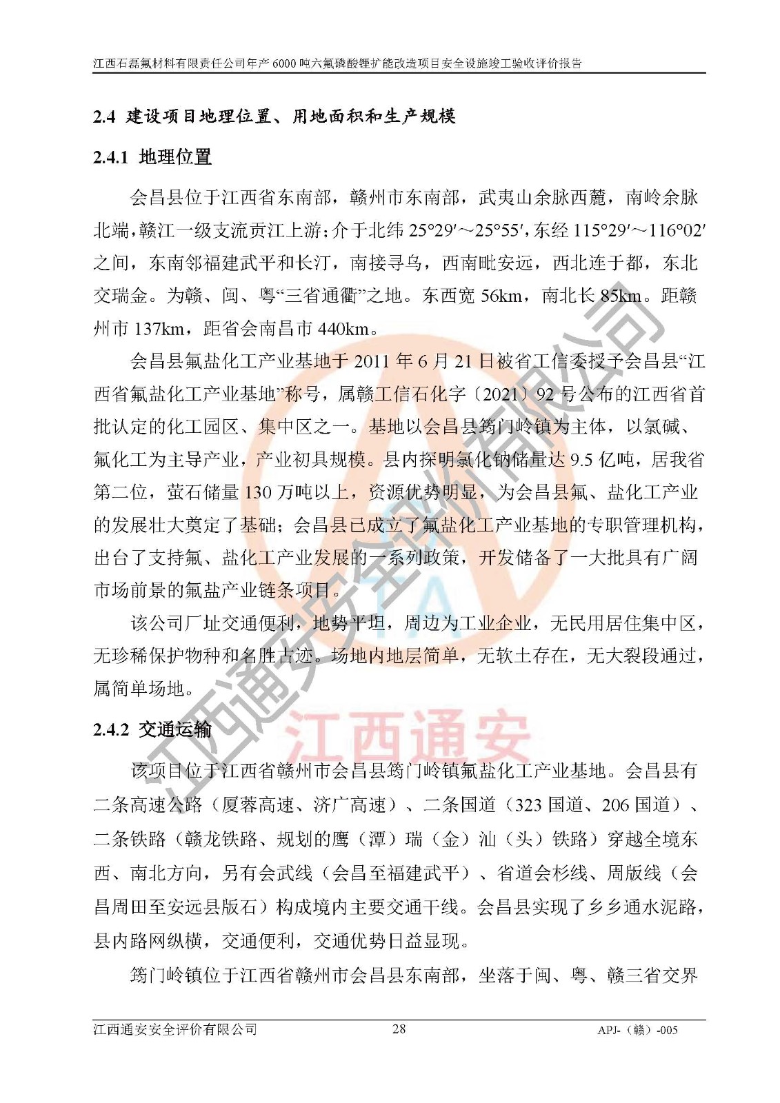 一、建设项目所在地的安全条件和与周边的安全防护距离 (1)该项目位于江西省赣州市会昌县氟盐化工产业基地,属于认定的化工园区,厂址选择合理,该项目与周边环境的防火间距符合规范的要求。 (2)重大危险源与“八类敏感场所及区域”的距离符合相关法律、法规的规定。 (3)该项目103生产车间三和201罐区一均构成**重大危险源。根据《危险化学品生产装置和储存设施外部安全防护距离确定方法》(GB/T 37243-2019)和《危险化学品生产装置和储存设施风险基准》(GB 36894-2018),该项目高敏感防护目标、重要防护目标、一般防护目标中的一类防护目标(<3×10-7)的外部安全防护距离包络线距离厂界*大值为76.36m,个人风险等值线范围内未出现该类防护目标;一般防护目标中的二类防护目标(<3×10-6)的外部安全防护距离包络线距离厂界*大值为51.62m,个人风险等值线范围内未涉及相应的防护目标;一般防护目标中的三类防护目标(<1×10-5)外部安全防护距离的包络线未出厂界。项目外部安全防护距离内无相应的防护目标,该项目不存在社会风险。 (4)该项目投产后在正常生产情况下,对其周边单位的生产、经营活动和居民的生活影响很小。在发生事故的情况下对周边单位的生产、经营活动和居民的生活存在影响。该项目周边单位的生产、经营活动和居民的生活对该项目投产后的正常生产影响很小。该项目所在地自然条件(不包括地震等破坏力**的自然灾害)的变化对该项目投产后的正常生产没有影响。 二、建设项目安全设施设计的采纳情况和已采用(取)的安全设施水平 该项目采用的主要安全设施包括了以下方面:检测、报警设施,设备安全防护设施,作业场所防护设施,安全警示标志,泄压和止逆设施,紧急处理设施,防止火灾蔓延设施,灭火设施,紧急个人处置设施,应急救援设施,劳动防护用品和装备等。 该项目在建设过程中采纳了《安全设施设计专篇》中的有关安全措施建议及要求,针对性的采取了相应的预防和控制措施,建设中未落实的安全措施,在试生产中已进行了整改。试生产表明该项目所采取的安全控制措施安全**,主要生产装置、设备运行平稳,安全可靠,安全水平较高,能够满足安全生产条件。 三、建设项目试生产(使用)后具备**现行有关安全生产法律、法规和部门规章及标准规定和要求的安全生产条件 1)法律法规等方面的符合性:该项目按照建设项目“三同时”要求,项目进行了备案、通过了安全条件审查、安全设施设计审查、试生产方案审查,立项审批手续齐全,安全设施设计、建设施工、施工监理均由有资质的单位承担,项目建设符合法律、法规规定的审批、施工、监理手续。项目建设期间,公司结合生产需要,增设了部分辅助设施和工艺管线,属于一般变更,试生产期间公司已委托河北英科石化工程有限公司进行了设计变更,作为已经审查通过的安全设施设计专篇的补充文件。 2)该项目与周边建构筑物的防火距离符合《精细化工企业工程设计防火标准》《建筑设计防火规范》的要求。根据《危险化学品生产装置和储存设施风险基准》GB36894-2018确定危险化学品单位周边重要目标和敏感场所承受的可容许个人风险和社会风险的定量风险评价。项目的个人风险计算结果表明,项目外部安全防护距离的包络线内无相应的防护目标。该软件未计算出社会风险。因此项目可容许个人风险和社会风险均在可接受范围内。 3)平面布置及常规防护设施措施的合理性:该项目生产场所、办公场所之间的间距满足安全要求,建筑结构、防火分区、防雷设施、安全出口的设置等满足安全生产的要求。消防道路的净宽度、净**、转弯半径均满足运输**及消防**通行。设置的常规防护设施、防止机械伤害、防急性中毒窒息的设施和措施符合要求。 4)设施、设备、装置及工艺方面的安全性:无**明令淘汰的工艺和 设备,该项目不涉及爆炸性危险区域划分。生产工艺操作和设置的安全设施满足安全需要,生产设施的布置能**人员疏散安全及操作方便。设施、设备、装置及工艺方面安全可靠。 5)特种设备、强制检测设备设施监督检验情况:该项目特种设备均进行了检验检测,并取得了检验报告;安全阀、压力表、有毒气体探头也进行了校验,校验结论合格,特种设备及安全附件符合《特种设备安全监察条例》 等相关法律法规、条例的规定。 6)公用工程、辅助设施的配套性:为该项目生产配套的供水、供电、 供气、供热等满足需要。 7)人员管理及安全培训方面充分性:公司现已建立了安全管理机构, 配备了专职安全管理人员。主要负责人王成具备化学工程与工艺专业本科学历,分管生产负责人曾中山具备化学工程与工艺专业本科学历,分管设备和技术负责人刘辉涛具备应用化学专业本科学历。专职安全管理人员共4人,配有一名注册安全工程师,专职安全管理人员均具有大专以上化工及安全专业相关学历。重点监管化工工艺的生产装置、储存设施操作人员具备高中及以上学历或化工类中等及以上职业教育水平。该公司制定了较完善的安全管理制度、岗位责任制、安全操作规程,制度执行情况较好。该公司已为从业职工交纳了工伤**。该公司对操作员工进行相关的培训和教育,经培训合格后上岗。 8)应急救援**性:企业根据自身实际情况,将该项目按照《生产经 营单位生产安全事故