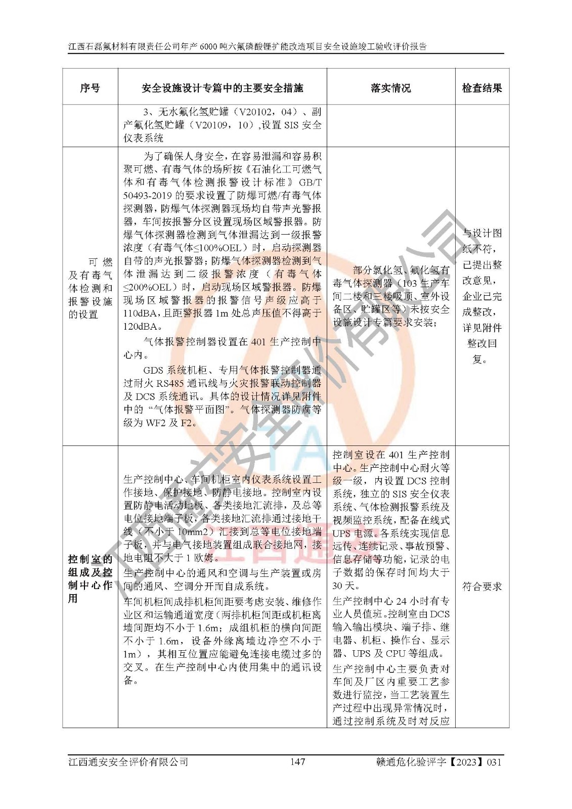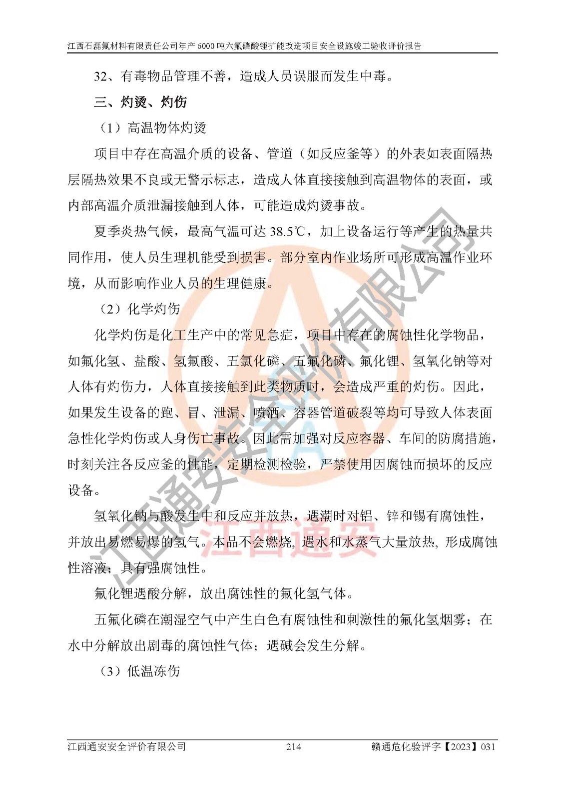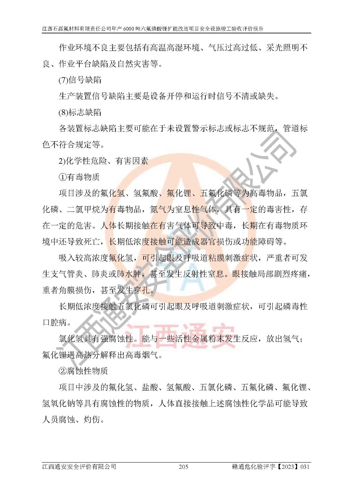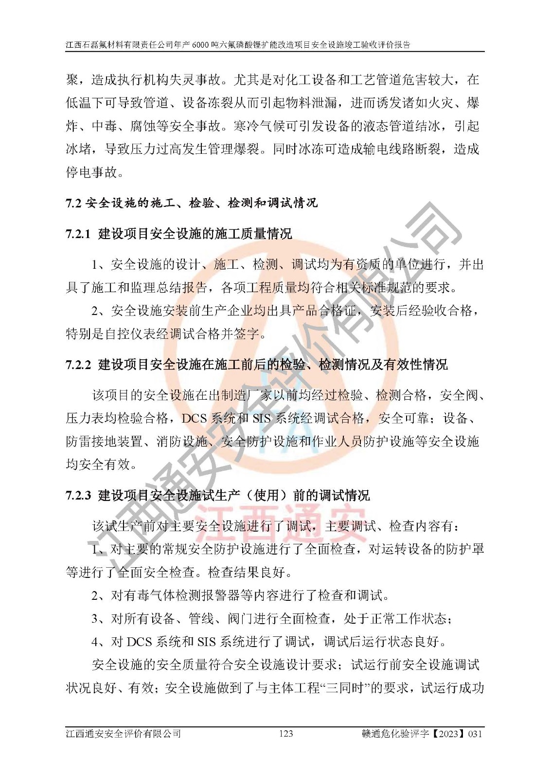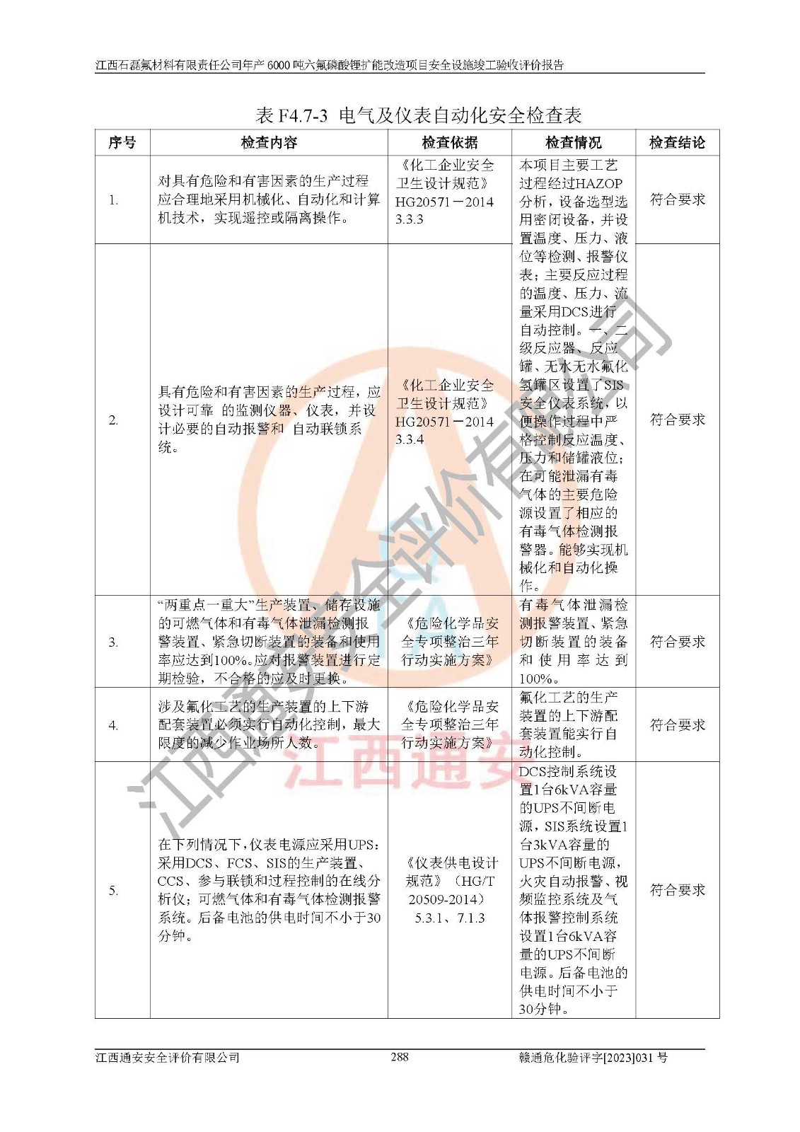 一、建设项目所在地的安全条件和与周边的安全防护距离 (1)该项目位于江西省赣州市会昌县氟盐化工产业基地,属于认定的化工园区,厂址选择合理,该项目与周边环境的防火间距符合规范的要求。 (2)重大危险源与“八类敏感场所及区域”的距离符合相关法律、法规的规定。 (3)该项目103生产车间三和201罐区一均构成**重大危险源。根据《危险化学品生产装置和储存设施外部安全防护距离确定方法》(GB/T 37243-2019)和《危险化学品生产装置和储存设施风险基准》(GB 36894-2018),该项目高敏感防护目标、重要防护目标、一般防护目标中的一类防护目标(<3×10-7)的外部安全防护距离包络线距离厂界*大值为76.36m,个人风险等值线范围内未出现该类防护目标;一般防护目标中的二类防护目标(<3×10-6)的外部安全防护距离包络线距离厂界*大值为51.62m,个人风险等值线范围内未涉及相应的防护目标;一般防护目标中的三类防护目标(<1×10-5)外部安全防护距离的包络线未出厂界。项目外部安全防护距离内无相应的防护目标,该项目不存在社会风险。 (4)该项目投产后在正常生产情况下,对其周边单位的生产、经营活动和居民的生活影响很小。在发生事故的情况下对周边单位的生产、经营活动和居民的生活存在影响。该项目周边单位的生产、经营活动和居民的生活对该项目投产后的正常生产影响很小。该项目所在地自然条件(不包括地震等破坏力**的自然灾害)的变化对该项目投产后的正常生产没有影响。 二、建设项目安全设施设计的采纳情况和已采用(取)的安全设施水平 该项目采用的主要安全设施包括了以下方面:检测、报警设施,设备安全防护设施,作业场所防护设施,安全警示标志,泄压和止逆设施,紧急处理设施,防止火灾蔓延设施,灭火设施,紧急个人处置设施,应急救援设施,劳动防护用品和装备等。 该项目在建设过程中采纳了《安全设施设计专篇》中的有关安全措施建议及要求,针对性的采取了相应的预防和控制措施,建设中未落实的安全措施,在试生产中已进行了整改。试生产表明该项目所采取的安全控制措施安全**,主要生产装置、设备运行平稳,安全可靠,安全水平较高,能够满足安全生产条件。 三、建设项目试生产(使用)后具备**现行有关安全生产法律、法规和部门规章及标准规定和要求的安全生产条件 1)法律法规等方面的符合性:该项目按照建设项目“三同时”要求,项目进行了备案、通过了安全条件审查、安全设施设计审查、试生产方案审查,立项审批手续齐全,安全设施设计、建设施工、施工监理均由有资质的单位承担,项目建设符合法律、法规规定的审批、施工、监理手续。项目建设期间,公司结合生产需要,增设了部分辅助设施和工艺管线,属于一般变更,试生产期间公司已委托河北英科石化工程有限公司进行了设计变更,作为已经审查通过的安全设施设计专篇的补充文件。 2)该项目与周边建构筑物的防火距离符合《精细化工企业工程设计防火标准》《建筑设计防火规范》的要求。根据《危险化学品生产装置和储存设施风险基准》GB36894-2018确定危险化学品单位周边重要目标和敏感场所承受的可容许个人风险和社会风险的定量风险评价。项目的个人风险计算结果表明,项目外部安全防护距离的包络线内无相应的防护目标。该软件未计算出社会风险。因此项目可容许个人风险和社会风险均在可接受范围内。 3)平面布置及常规防护设施措施的合理性:该项目生产场所、办公场所之间的间距满足安全要求,建筑结构、防火分区、防雷设施、安全出口的设置等满足安全生产的要求。消防道路的净宽度、净**、转弯半径均满足运输**及消防**通行。设置的常规防护设施、防止机械伤害、防急性中毒窒息的设施和措施符合要求。 4)设施、设备、装置及工艺方面的安全性:无**明令淘汰的工艺和 设备,该项目不涉及爆炸性危险区域划分。生产工艺操作和设置的安全设施满足安全需要,生产设施的布置能**人员疏散安全及操作方便。设施、设备、装置及工艺方面安全可靠。 5)特种设备、强制检测设备设施监督检验情况:该项目特种设备均进行了检验检测,并取得了检验报告;安全阀、压力表、有毒气体探头也进行了校验,校验结论合格,特种设备及安全附件符合《特种设备安全监察条例》 等相关法律法规、条例的规定。 6)公用工程、辅助设施的配套性:为该项目生产配套的供水、供电、 供气、供热等满足需要。 7)人员管理及安全培训方面充分性:公司现已建立了安全管理机构, 配备了专职安全管理人员。主要负责人王成具备化学工程与工艺专业本科学历,分管生产负责人曾中山具备化学工程与工艺专业本科学历,分管设备和技术负责人刘辉涛具备应用化学专业本科学历。专职安全管理人员共4人,配有一名注册安全工程师,专职安全管理人员均具有大专以上化工及安全专业相关学历。重点监管化工工艺的生产装置、储存设施操作人员具备高中及以上学历或化工类中等及以上职业教育水平。该公司制定了较完善的安全管理制度、岗位责任制、安全操作规程,制度执行情况较好。该公司已为从业职工交纳了工伤**。该公司对操作员工进行相关的培训和教育,经培训合格后上岗。 8)应急救援**性:企业根据自身实际情况,将该项目按照《生产经 营单位生产安全事故