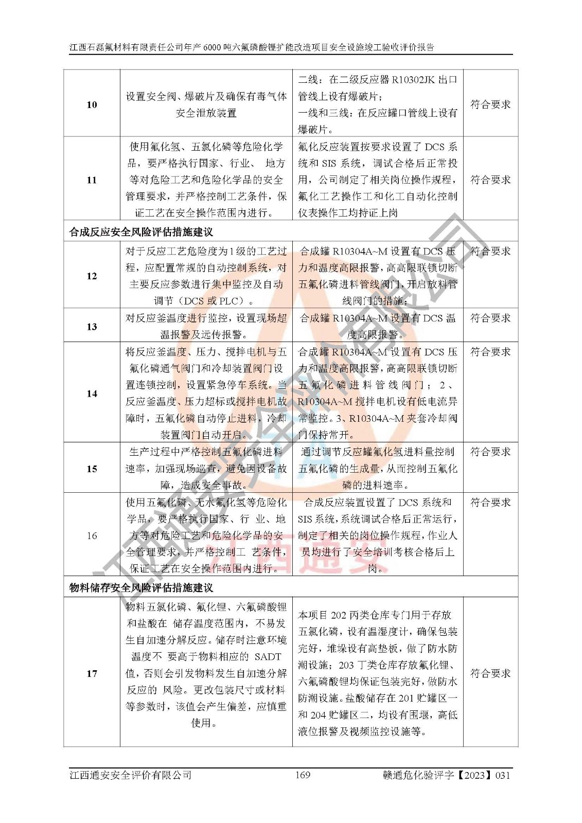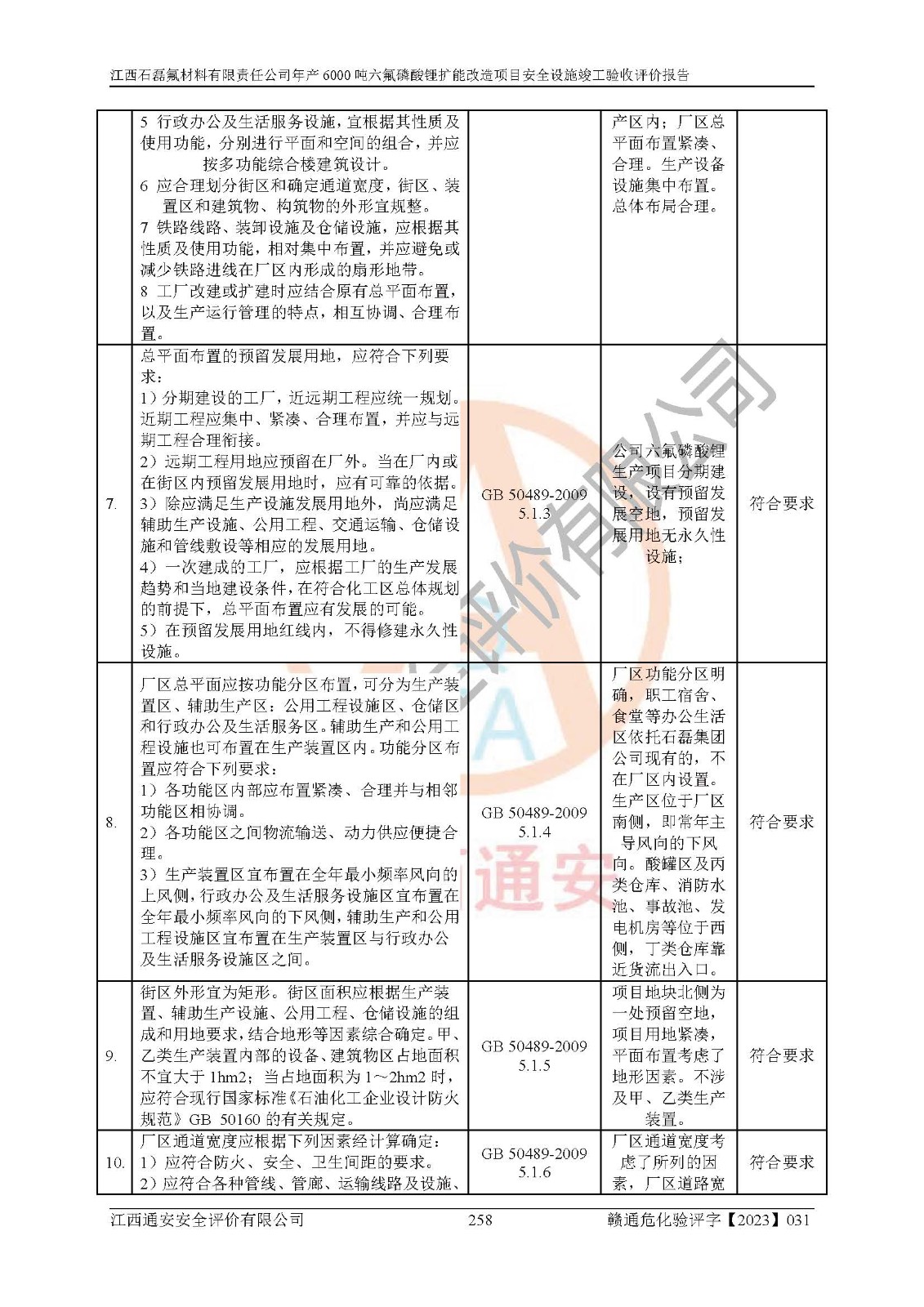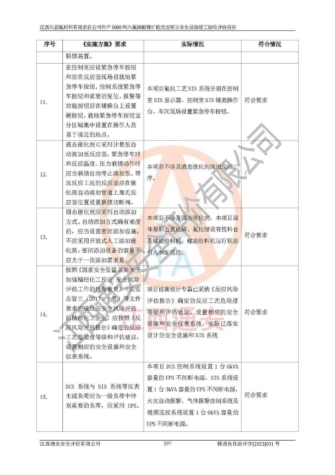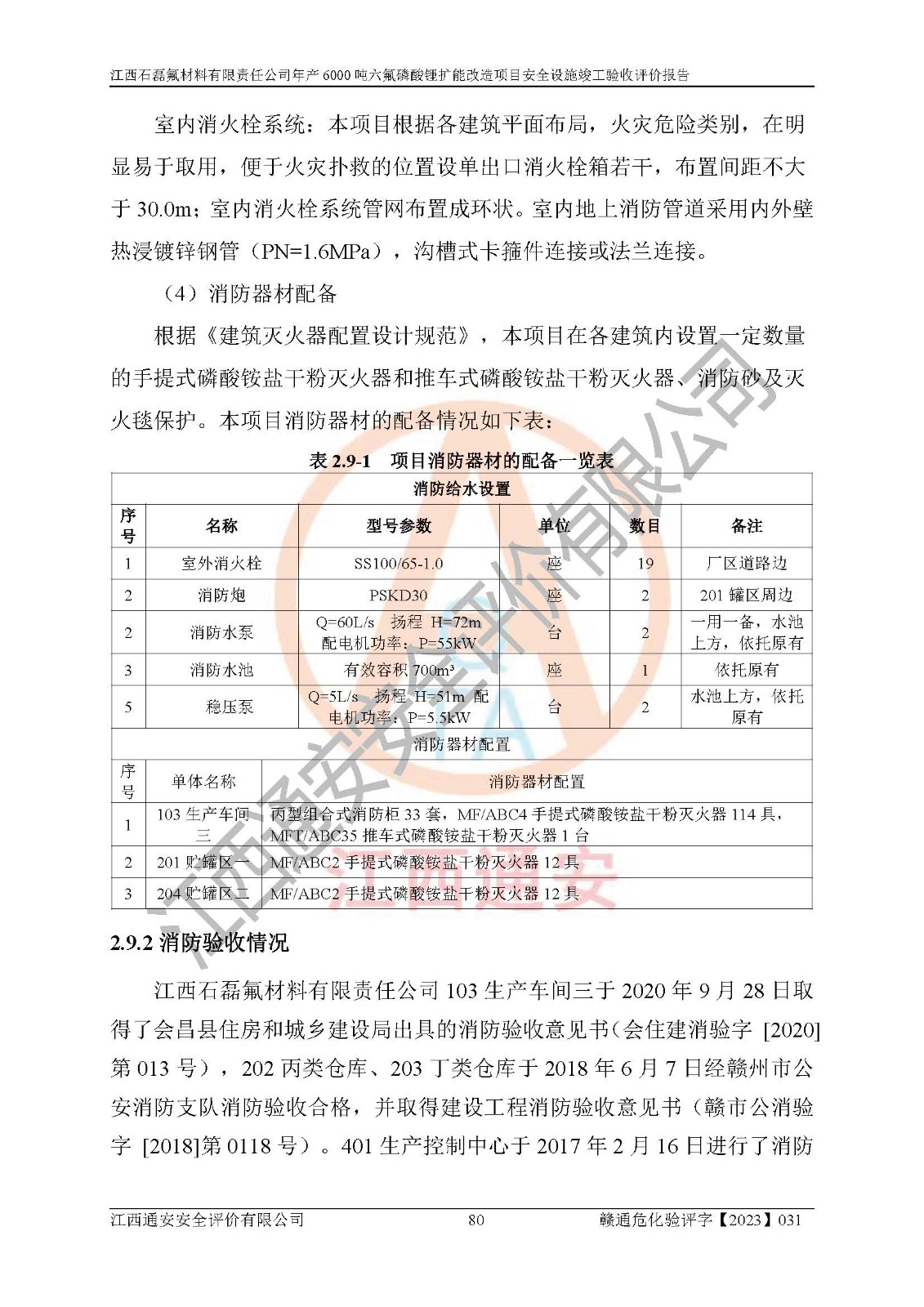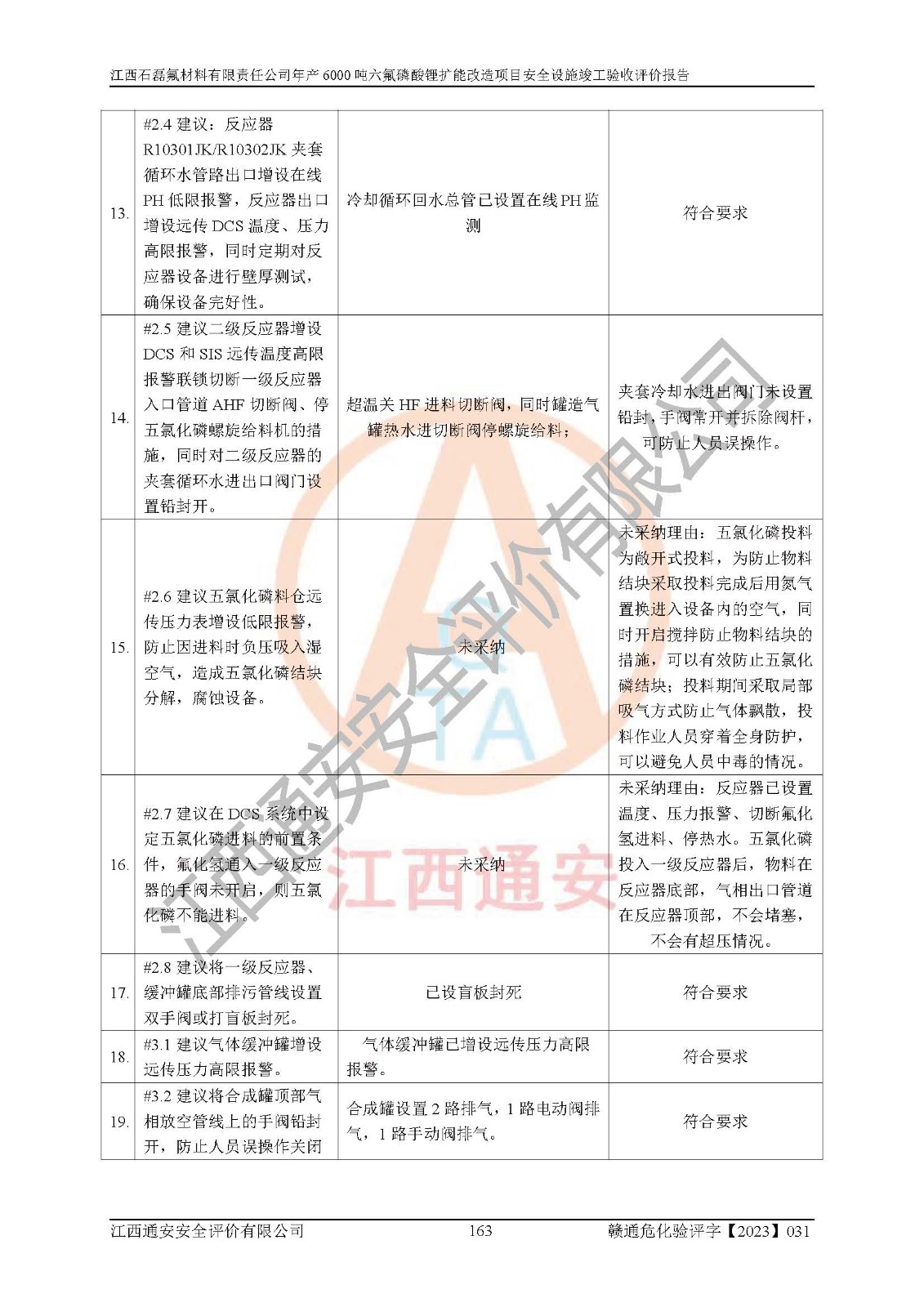 一、建设项目所在地的安全条件和与周边的安全防护距离 (1)该项目位于江西省赣州市会昌县氟盐化工产业基地,属于认定的化工园区,厂址选择合理,该项目与周边环境的防火间距符合规范的要求。 (2)重大危险源与“八类敏感场所及区域”的距离符合相关法律、法规的规定。 (3)该项目103生产车间三和201罐区一均构成**重大危险源。根据《危险化学品生产装置和储存设施外部安全防护距离确定方法》(GB/T 37243-2019)和《危险化学品生产装置和储存设施风险基准》(GB 36894-2018),该项目高敏感防护目标、重要防护目标、一般防护目标中的一类防护目标(<3×10-7)的外部安全防护距离包络线距离厂界*大值为76.36m,个人风险等值线范围内未出现该类防护目标;一般防护目标中的二类防护目标(<3×10-6)的外部安全防护距离包络线距离厂界*大值为51.62m,个人风险等值线范围内未涉及相应的防护目标;一般防护目标中的三类防护目标(<1×10-5)外部安全防护距离的包络线未出厂界。项目外部安全防护距离内无相应的防护目标,该项目不存在社会风险。 (4)该项目投产后在正常生产情况下,对其周边单位的生产、经营活动和居民的生活影响很小。在发生事故的情况下对周边单位的生产、经营活动和居民的生活存在影响。该项目周边单位的生产、经营活动和居民的生活对该项目投产后的正常生产影响很小。该项目所在地自然条件(不包括地震等破坏力**的自然灾害)的变化对该项目投产后的正常生产没有影响。 二、建设项目安全设施设计的采纳情况和已采用(取)的安全设施水平 该项目采用的主要安全设施包括了以下方面:检测、报警设施,设备安全防护设施,作业场所防护设施,安全警示标志,泄压和止逆设施,紧急处理设施,防止火灾蔓延设施,灭火设施,紧急个人处置设施,应急救援设施,劳动防护用品和装备等。 该项目在建设过程中采纳了《安全设施设计专篇》中的有关安全措施建议及要求,针对性的采取了相应的预防和控制措施,建设中未落实的安全措施,在试生产中已进行了整改。试生产表明该项目所采取的安全控制措施安全**,主要生产装置、设备运行平稳,安全可靠,安全水平较高,能够满足安全生产条件。 三、建设项目试生产(使用)后具备**现行有关安全生产法律、法规和部门规章及标准规定和要求的安全生产条件 1)法律法规等方面的符合性:该项目按照建设项目“三同时”要求,项目进行了备案、通过了安全条件审查、安全设施设计审查、试生产方案审查,立项审批手续齐全,安全设施设计、建设施工、施工监理均由有资质的单位承担,项目建设符合法律、法规规定的审批、施工、监理手续。项目建设期间,公司结合生产需要,增设了部分辅助设施和工艺管线,属于一般变更,试生产期间公司已委托河北英科石化工程有限公司进行了设计变更,作为已经审查通过的安全设施设计专篇的补充文件。 2)该项目与周边建构筑物的防火距离符合《精细化工企业工程设计防火标准》《建筑设计防火规范》的要求。根据《危险化学品生产装置和储存设施风险基准》GB36894-2018确定危险化学品单位周边重要目标和敏感场所承受的可容许个人风险和社会风险的定量风险评价。项目的个人风险计算结果表明,项目外部安全防护距离的包络线内无相应的防护目标。该软件未计算出社会风险。因此项目可容许个人风险和社会风险均在可接受范围内。 3)平面布置及常规防护设施措施的合理性:该项目生产场所、办公场所之间的间距满足安全要求,建筑结构、防火分区、防雷设施、安全出口的设置等满足安全生产的要求。消防道路的净宽度、净**、转弯半径均满足运输**及消防**通行。设置的常规防护设施、防止机械伤害、防急性中毒窒息的设施和措施符合要求。 4)设施、设备、装置及工艺方面的安全性:无**明令淘汰的工艺和 设备,该项目不涉及爆炸性危险区域划分。生产工艺操作和设置的安全设施满足安全需要,生产设施的布置能**人员疏散安全及操作方便。设施、设备、装置及工艺方面安全可靠。 5)特种设备、强制检测设备设施监督检验情况:该项目特种设备均进行了检验检测,并取得了检验报告;安全阀、压力表、有毒气体探头也进行了校验,校验结论合格,特种设备及安全附件符合《特种设备安全监察条例》 等相关法律法规、条例的规定。 6)公用工程、辅助设施的配套性:为该项目生产配套的供水、供电、 供气、供热等满足需要。 7)人员管理及安全培训方面充分性:公司现已建立了安全管理机构, 配备了专职安全管理人员。主要负责人王成具备化学工程与工艺专业本科学历,分管生产负责人曾中山具备化学工程与工艺专业本科学历,分管设备和技术负责人刘辉涛具备应用化学专业本科学历。专职安全管理人员共4人,配有一名注册安全工程师,专职安全管理人员均具有大专以上化工及安全专业相关学历。重点监管化工工艺的生产装置、储存设施操作人员具备高中及以上学历或化工类中等及以上职业教育水平。该公司制定了较完善的安全管理制度、岗位责任制、安全操作规程,制度执行情况较好。该公司已为从业职工交纳了工伤**。该公司对操作员工进行相关的培训和教育,经培训合格后上岗。 8)应急救援**性:企业根据自身实际情况,将该项目按照《生产经 营单位生产安全事故