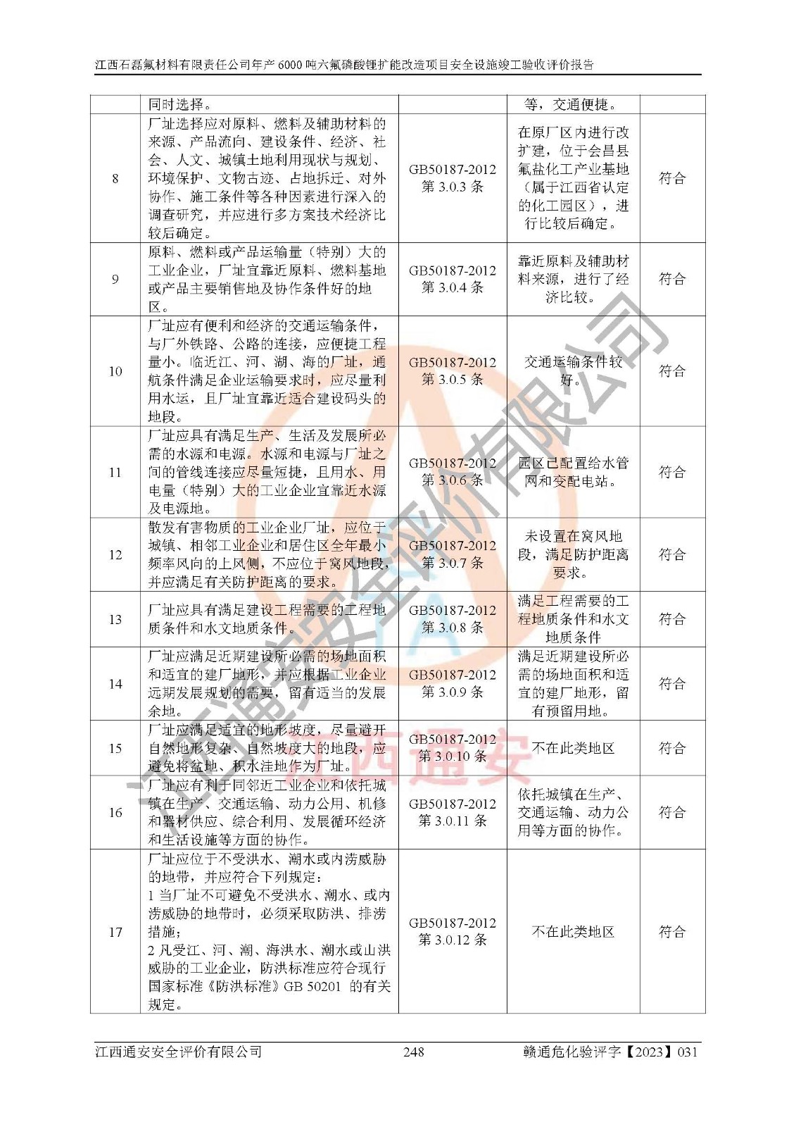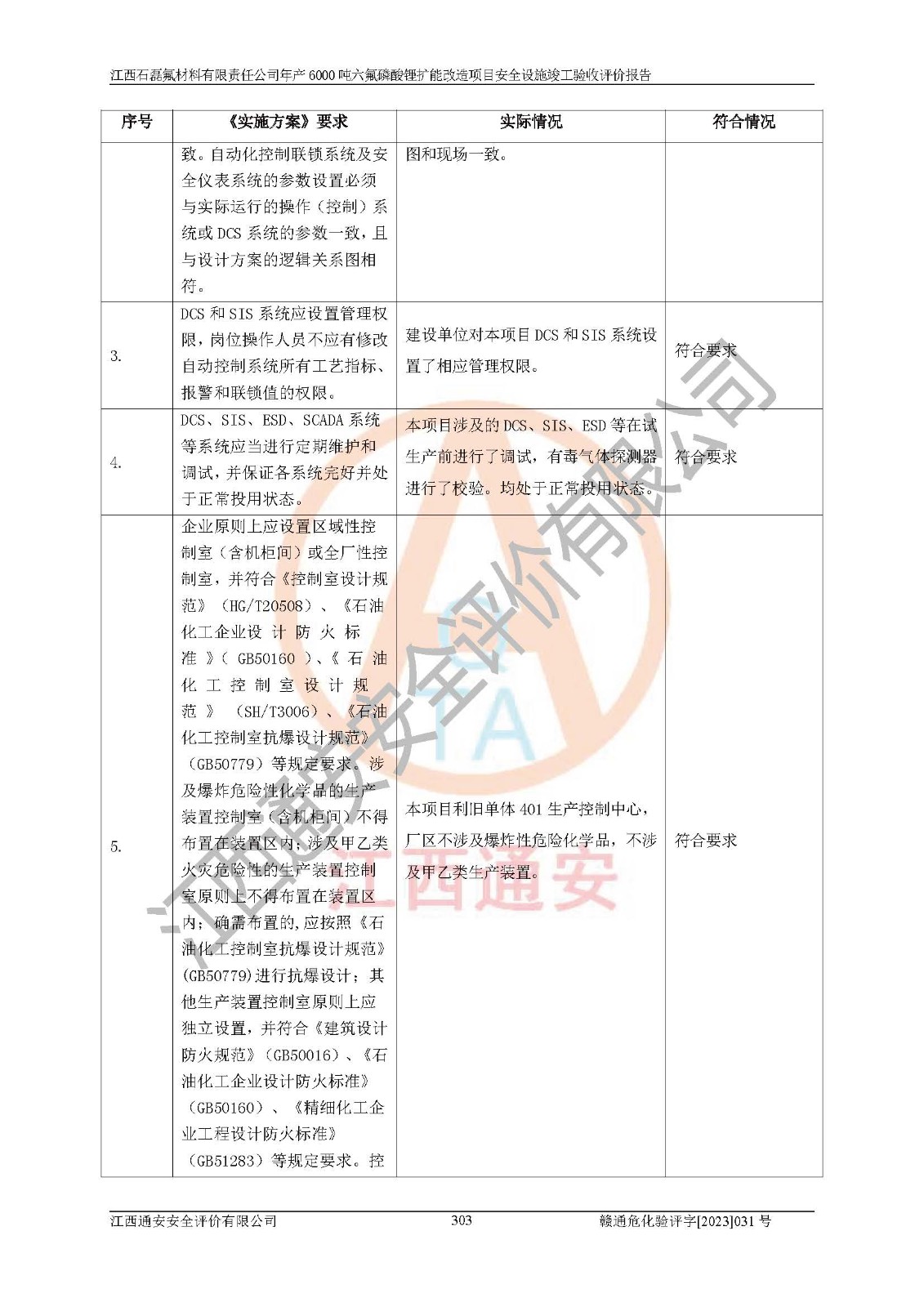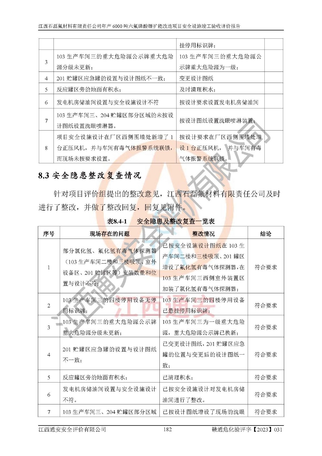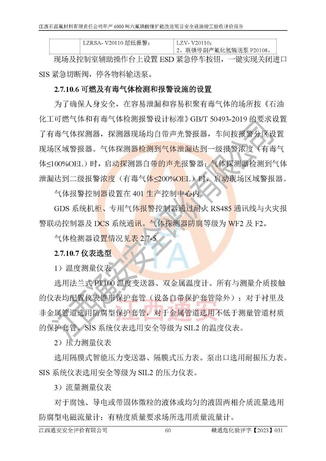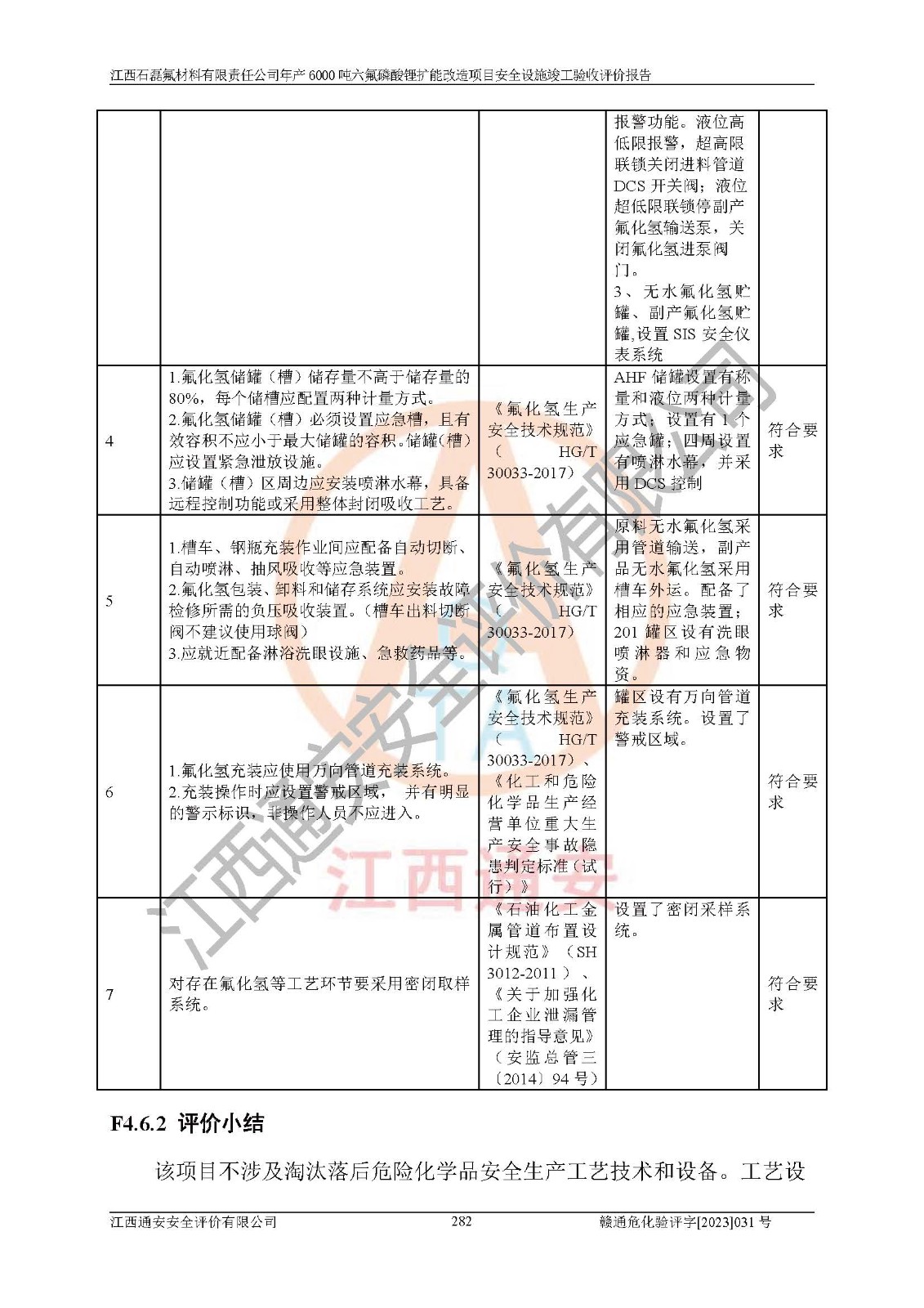 一、建设项目所在地的安全条件和与周边的安全防护距离 (1)该项目位于江西省赣州市会昌县氟盐化工产业基地,属于认定的化工园区,厂址选择合理,该项目与周边环境的防火间距符合规范的要求。 (2)重大危险源与“八类敏感场所及区域”的距离符合相关法律、法规的规定。 (3)该项目103生产车间三和201罐区一均构成**重大危险源。根据《危险化学品生产装置和储存设施外部安全防护距离确定方法》(GB/T 37243-2019)和《危险化学品生产装置和储存设施风险基准》(GB 36894-2018),该项目高敏感防护目标、重要防护目标、一般防护目标中的一类防护目标(<3×10-7)的外部安全防护距离包络线距离厂界*大值为76.36m,个人风险等值线范围内未出现该类防护目标;一般防护目标中的二类防护目标(<3×10-6)的外部安全防护距离包络线距离厂界*大值为51.62m,个人风险等值线范围内未涉及相应的防护目标;一般防护目标中的三类防护目标(<1×10-5)外部安全防护距离的包络线未出厂界。项目外部安全防护距离内无相应的防护目标,该项目不存在社会风险。 (4)该项目投产后在正常生产情况下,对其周边单位的生产、经营活动和居民的生活影响很小。在发生事故的情况下对周边单位的生产、经营活动和居民的生活存在影响。该项目周边单位的生产、经营活动和居民的生活对该项目投产后的正常生产影响很小。该项目所在地自然条件(不包括地震等破坏力**的自然灾害)的变化对该项目投产后的正常生产没有影响。 二、建设项目安全设施设计的采纳情况和已采用(取)的安全设施水平 该项目采用的主要安全设施包括了以下方面:检测、报警设施,设备安全防护设施,作业场所防护设施,安全警示标志,泄压和止逆设施,紧急处理设施,防止火灾蔓延设施,灭火设施,紧急个人处置设施,应急救援设施,劳动防护用品和装备等。 该项目在建设过程中采纳了《安全设施设计专篇》中的有关安全措施建议及要求,针对性的采取了相应的预防和控制措施,建设中未落实的安全措施,在试生产中已进行了整改。试生产表明该项目所采取的安全控制措施安全**,主要生产装置、设备运行平稳,安全可靠,安全水平较高,能够满足安全生产条件。 三、建设项目试生产(使用)后具备**现行有关安全生产法律、法规和部门规章及标准规定和要求的安全生产条件 1)法律法规等方面的符合性:该项目按照建设项目“三同时”要求,项目进行了备案、通过了安全条件审查、安全设施设计审查、试生产方案审查,立项审批手续齐全,安全设施设计、建设施工、施工监理均由有资质的单位承担,项目建设符合法律、法规规定的审批、施工、监理手续。项目建设期间,公司结合生产需要,增设了部分辅助设施和工艺管线,属于一般变更,试生产期间公司已委托河北英科石化工程有限公司进行了设计变更,作为已经审查通过的安全设施设计专篇的补充文件。 2)该项目与周边建构筑物的防火距离符合《精细化工企业工程设计防火标准》《建筑设计防火规范》的要求。根据《危险化学品生产装置和储存设施风险基准》GB36894-2018确定危险化学品单位周边重要目标和敏感场所承受的可容许个人风险和社会风险的定量风险评价。项目的个人风险计算结果表明,项目外部安全防护距离的包络线内无相应的防护目标。该软件未计算出社会风险。因此项目可容许个人风险和社会风险均在可接受范围内。 3)平面布置及常规防护设施措施的合理性:该项目生产场所、办公场所之间的间距满足安全要求,建筑结构、防火分区、防雷设施、安全出口的设置等满足安全生产的要求。消防道路的净宽度、净**、转弯半径均满足运输**及消防**通行。设置的常规防护设施、防止机械伤害、防急性中毒窒息的设施和措施符合要求。 4)设施、设备、装置及工艺方面的安全性:无**明令淘汰的工艺和 设备,该项目不涉及爆炸性危险区域划分。生产工艺操作和设置的安全设施满足安全需要,生产设施的布置能**人员疏散安全及操作方便。设施、设备、装置及工艺方面安全可靠。 5)特种设备、强制检测设备设施监督检验情况:该项目特种设备均进行了检验检测,并取得了检验报告;安全阀、压力表、有毒气体探头也进行了校验,校验结论合格,特种设备及安全附件符合《特种设备安全监察条例》 等相关法律法规、条例的规定。 6)公用工程、辅助设施的配套性:为该项目生产配套的供水、供电、 供气、供热等满足需要。 7)人员管理及安全培训方面充分性:公司现已建立了安全管理机构, 配备了专职安全管理人员。主要负责人王成具备化学工程与工艺专业本科学历,分管生产负责人曾中山具备化学工程与工艺专业本科学历,分管设备和技术负责人刘辉涛具备应用化学专业本科学历。专职安全管理人员共4人,配有一名注册安全工程师,专职安全管理人员均具有大专以上化工及安全专业相关学历。重点监管化工工艺的生产装置、储存设施操作人员具备高中及以上学历或化工类中等及以上职业教育水平。该公司制定了较完善的安全管理制度、岗位责任制、安全操作规程,制度执行情况较好。该公司已为从业职工交纳了工伤**。该公司对操作员工进行相关的培训和教育,经培训合格后上岗。 8)应急救援**性:企业根据自身实际情况,将该项目按照《生产经 营单位生产安全事故