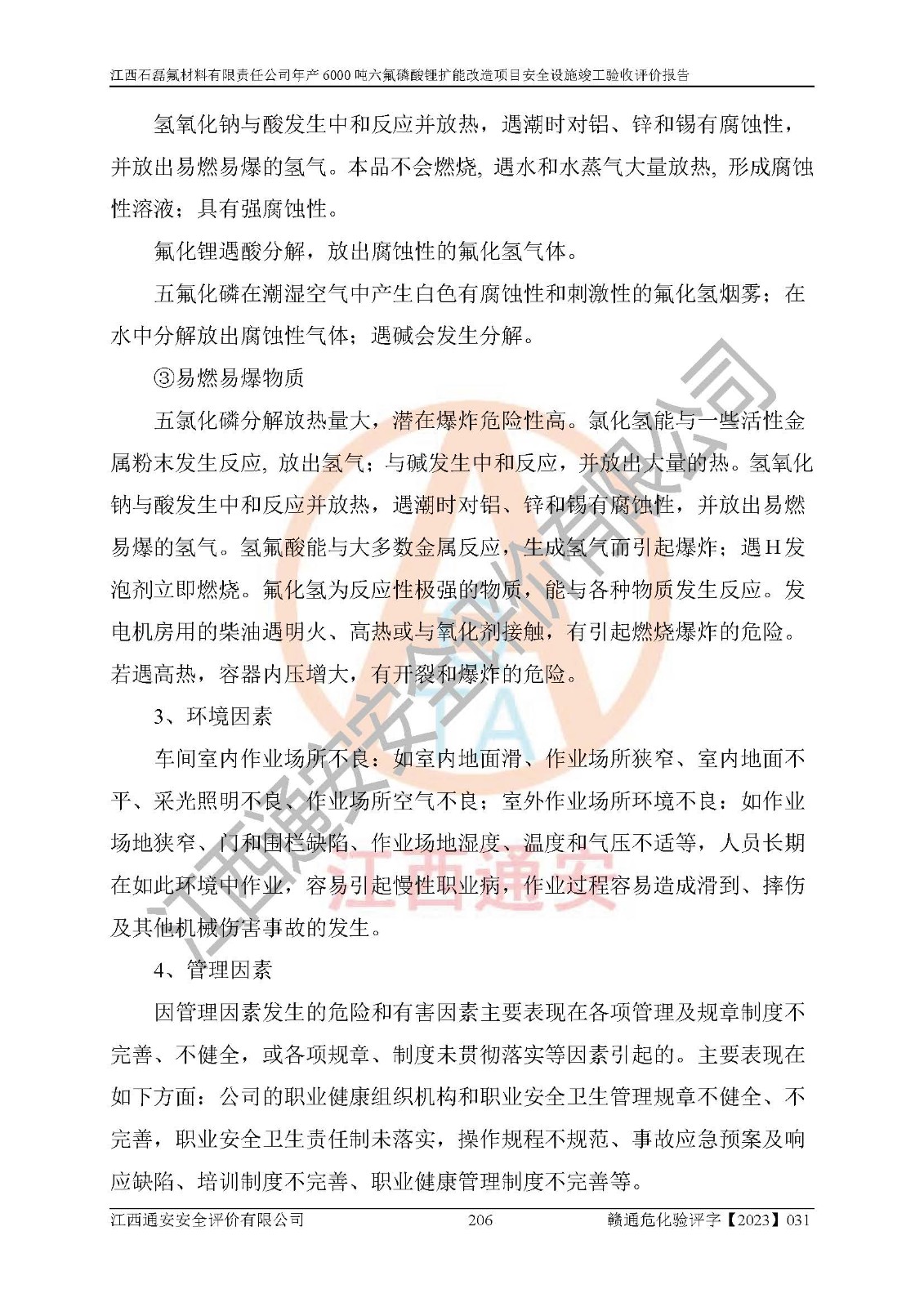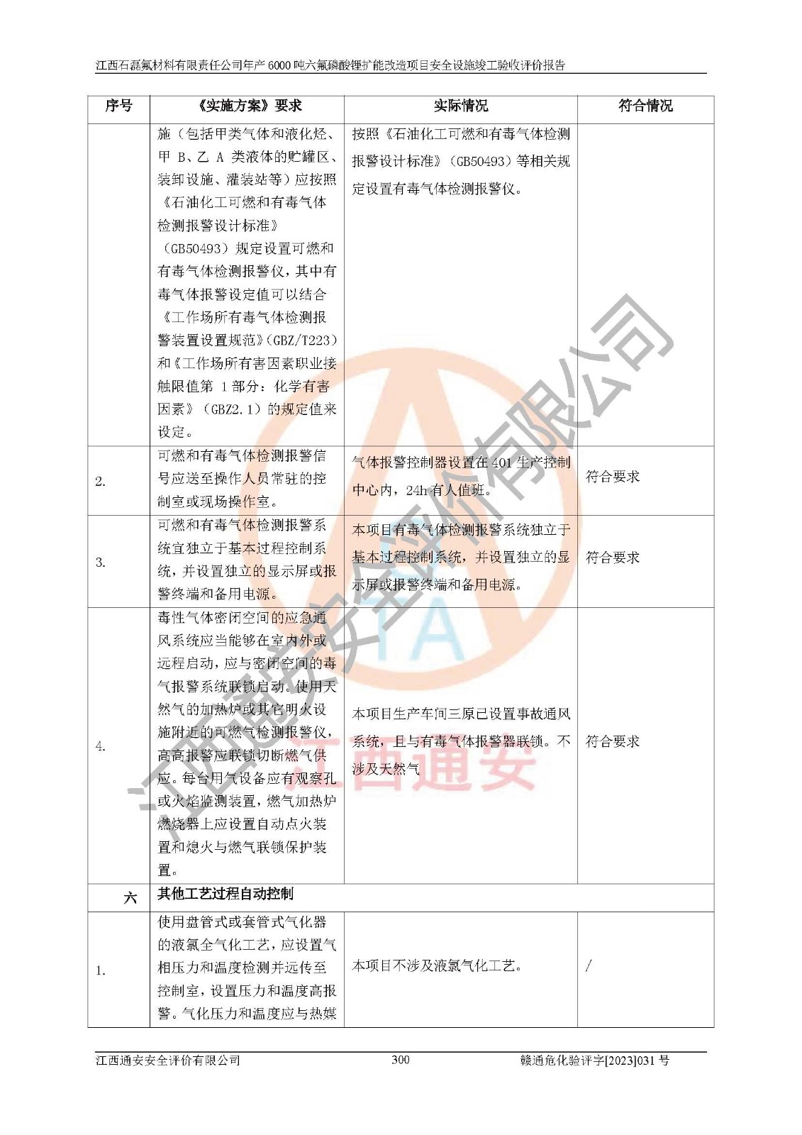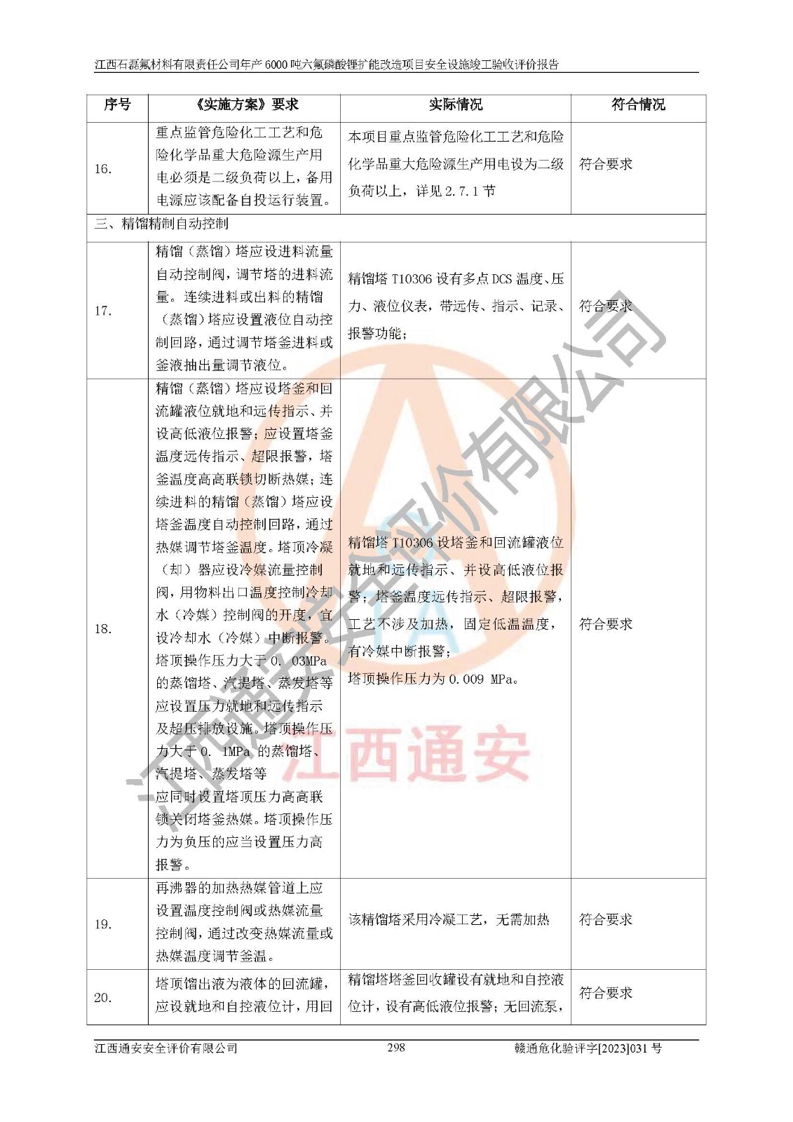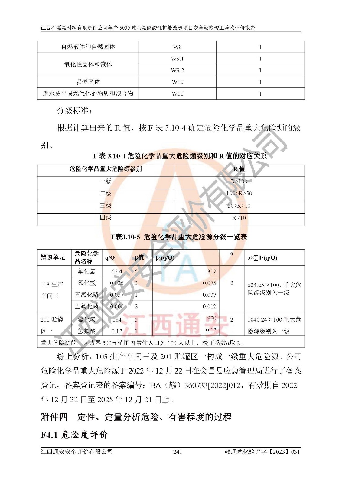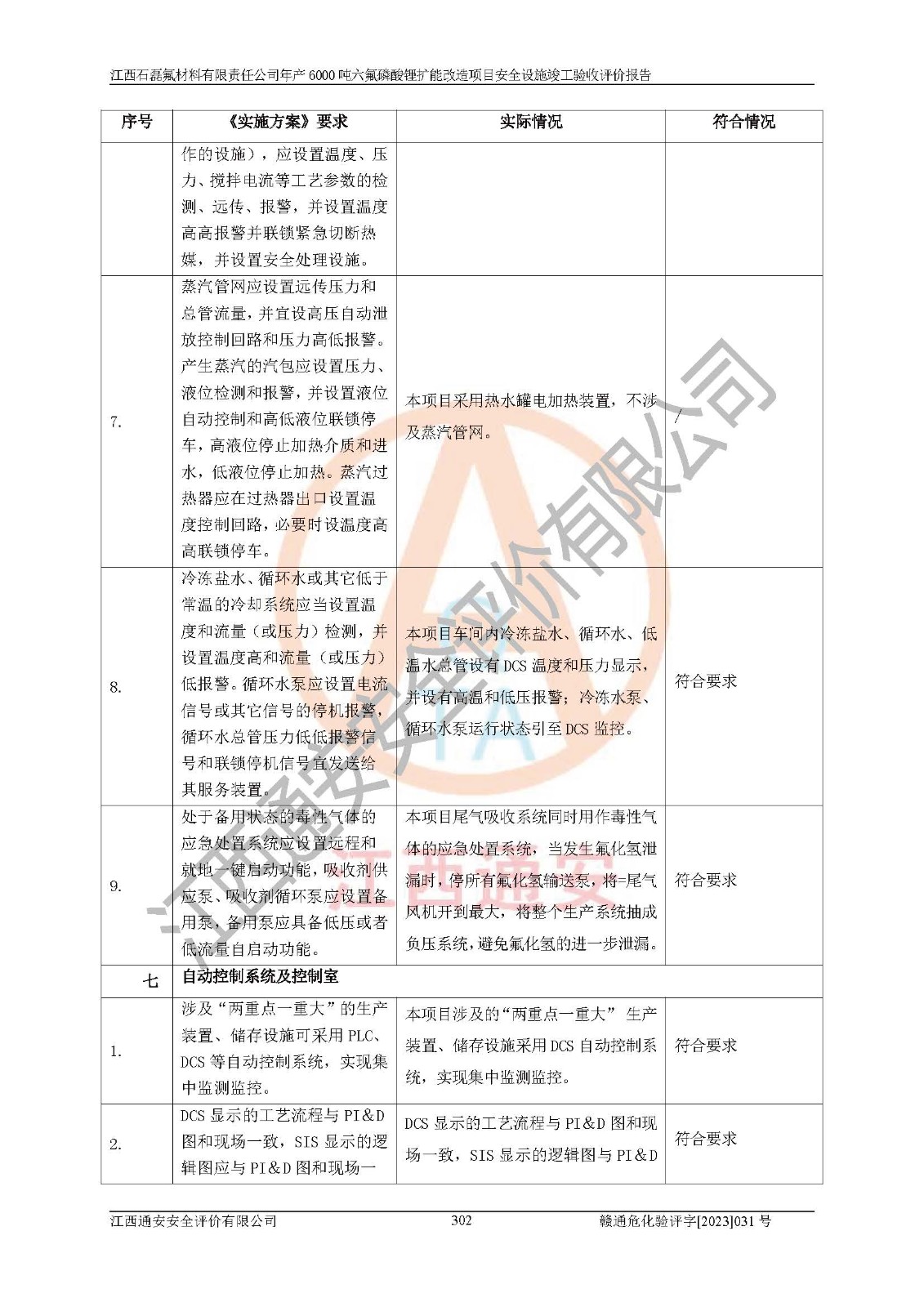 一、建设项目所在地的安全条件和与周边的安全防护距离 (1)该项目位于江西省赣州市会昌县氟盐化工产业基地,属于认定的化工园区,厂址选择合理,该项目与周边环境的防火间距符合规范的要求。 (2)重大危险源与“八类敏感场所及区域”的距离符合相关法律、法规的规定。 (3)该项目103生产车间三和201罐区一均构成**重大危险源。根据《危险化学品生产装置和储存设施外部安全防护距离确定方法》(GB/T 37243-2019)和《危险化学品生产装置和储存设施风险基准》(GB 36894-2018),该项目高敏感防护目标、重要防护目标、一般防护目标中的一类防护目标(<3×10-7)的外部安全防护距离包络线距离厂界*大值为76.36m,个人风险等值线范围内未出现该类防护目标;一般防护目标中的二类防护目标(<3×10-6)的外部安全防护距离包络线距离厂界*大值为51.62m,个人风险等值线范围内未涉及相应的防护目标;一般防护目标中的三类防护目标(<1×10-5)外部安全防护距离的包络线未出厂界。项目外部安全防护距离内无相应的防护目标,该项目不存在社会风险。 (4)该项目投产后在正常生产情况下,对其周边单位的生产、经营活动和居民的生活影响很小。在发生事故的情况下对周边单位的生产、经营活动和居民的生活存在影响。该项目周边单位的生产、经营活动和居民的生活对该项目投产后的正常生产影响很小。该项目所在地自然条件(不包括地震等破坏力**的自然灾害)的变化对该项目投产后的正常生产没有影响。 二、建设项目安全设施设计的采纳情况和已采用(取)的安全设施水平 该项目采用的主要安全设施包括了以下方面:检测、报警设施,设备安全防护设施,作业场所防护设施,安全警示标志,泄压和止逆设施,紧急处理设施,防止火灾蔓延设施,灭火设施,紧急个人处置设施,应急救援设施,劳动防护用品和装备等。 该项目在建设过程中采纳了《安全设施设计专篇》中的有关安全措施建议及要求,针对性的采取了相应的预防和控制措施,建设中未落实的安全措施,在试生产中已进行了整改。试生产表明该项目所采取的安全控制措施安全**,主要生产装置、设备运行平稳,安全可靠,安全水平较高,能够满足安全生产条件。 三、建设项目试生产(使用)后具备**现行有关安全生产法律、法规和部门规章及标准规定和要求的安全生产条件 1)法律法规等方面的符合性:该项目按照建设项目“三同时”要求,项目进行了备案、通过了安全条件审查、安全设施设计审查、试生产方案审查,立项审批手续齐全,安全设施设计、建设施工、施工监理均由有资质的单位承担,项目建设符合法律、法规规定的审批、施工、监理手续。项目建设期间,公司结合生产需要,增设了部分辅助设施和工艺管线,属于一般变更,试生产期间公司已委托河北英科石化工程有限公司进行了设计变更,作为已经审查通过的安全设施设计专篇的补充文件。 2)该项目与周边建构筑物的防火距离符合《精细化工企业工程设计防火标准》《建筑设计防火规范》的要求。根据《危险化学品生产装置和储存设施风险基准》GB36894-2018确定危险化学品单位周边重要目标和敏感场所承受的可容许个人风险和社会风险的定量风险评价。项目的个人风险计算结果表明,项目外部安全防护距离的包络线内无相应的防护目标。该软件未计算出社会风险。因此项目可容许个人风险和社会风险均在可接受范围内。 3)平面布置及常规防护设施措施的合理性:该项目生产场所、办公场所之间的间距满足安全要求,建筑结构、防火分区、防雷设施、安全出口的设置等满足安全生产的要求。消防道路的净宽度、净**、转弯半径均满足运输**及消防**通行。设置的常规防护设施、防止机械伤害、防急性中毒窒息的设施和措施符合要求。 4)设施、设备、装置及工艺方面的安全性:无**明令淘汰的工艺和 设备,该项目不涉及爆炸性危险区域划分。生产工艺操作和设置的安全设施满足安全需要,生产设施的布置能**人员疏散安全及操作方便。设施、设备、装置及工艺方面安全可靠。 5)特种设备、强制检测设备设施监督检验情况:该项目特种设备均进行了检验检测,并取得了检验报告;安全阀、压力表、有毒气体探头也进行了校验,校验结论合格,特种设备及安全附件符合《特种设备安全监察条例》 等相关法律法规、条例的规定。 6)公用工程、辅助设施的配套性:为该项目生产配套的供水、供电、 供气、供热等满足需要。 7)人员管理及安全培训方面充分性:公司现已建立了安全管理机构, 配备了专职安全管理人员。主要负责人王成具备化学工程与工艺专业本科学历,分管生产负责人曾中山具备化学工程与工艺专业本科学历,分管设备和技术负责人刘辉涛具备应用化学专业本科学历。专职安全管理人员共4人,配有一名注册安全工程师,专职安全管理人员均具有大专以上化工及安全专业相关学历。重点监管化工工艺的生产装置、储存设施操作人员具备高中及以上学历或化工类中等及以上职业教育水平。该公司制定了较完善的安全管理制度、岗位责任制、安全操作规程,制度执行情况较好。该公司已为从业职工交纳了工伤**。该公司对操作员工进行相关的培训和教育,经培训合格后上岗。 8)应急救援**性:企业根据自身实际情况,将该项目按照《生产经 营单位生产安全事故