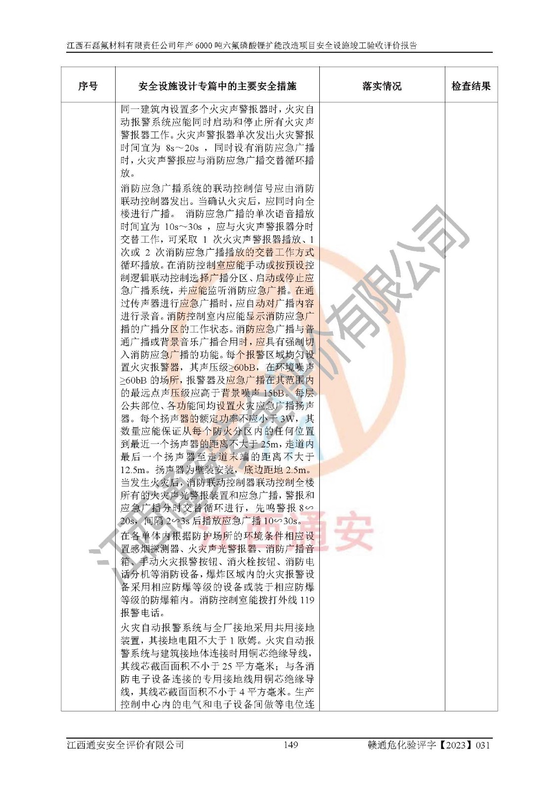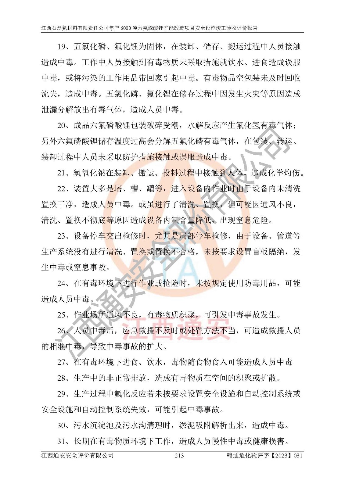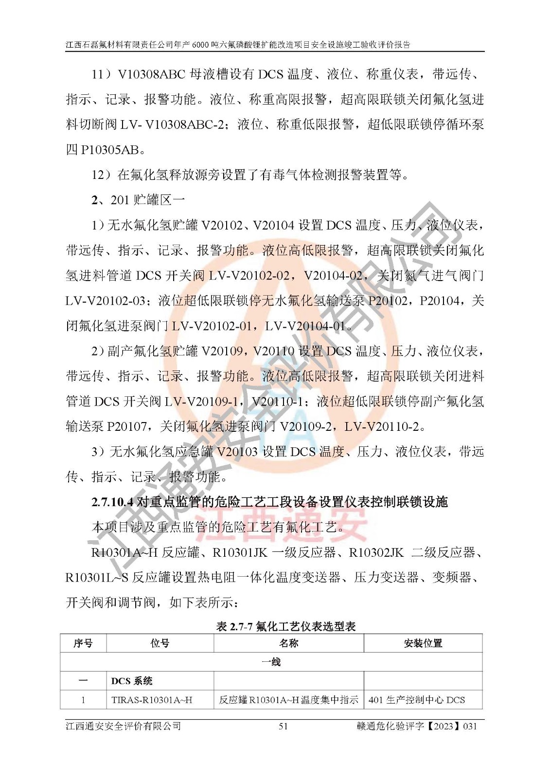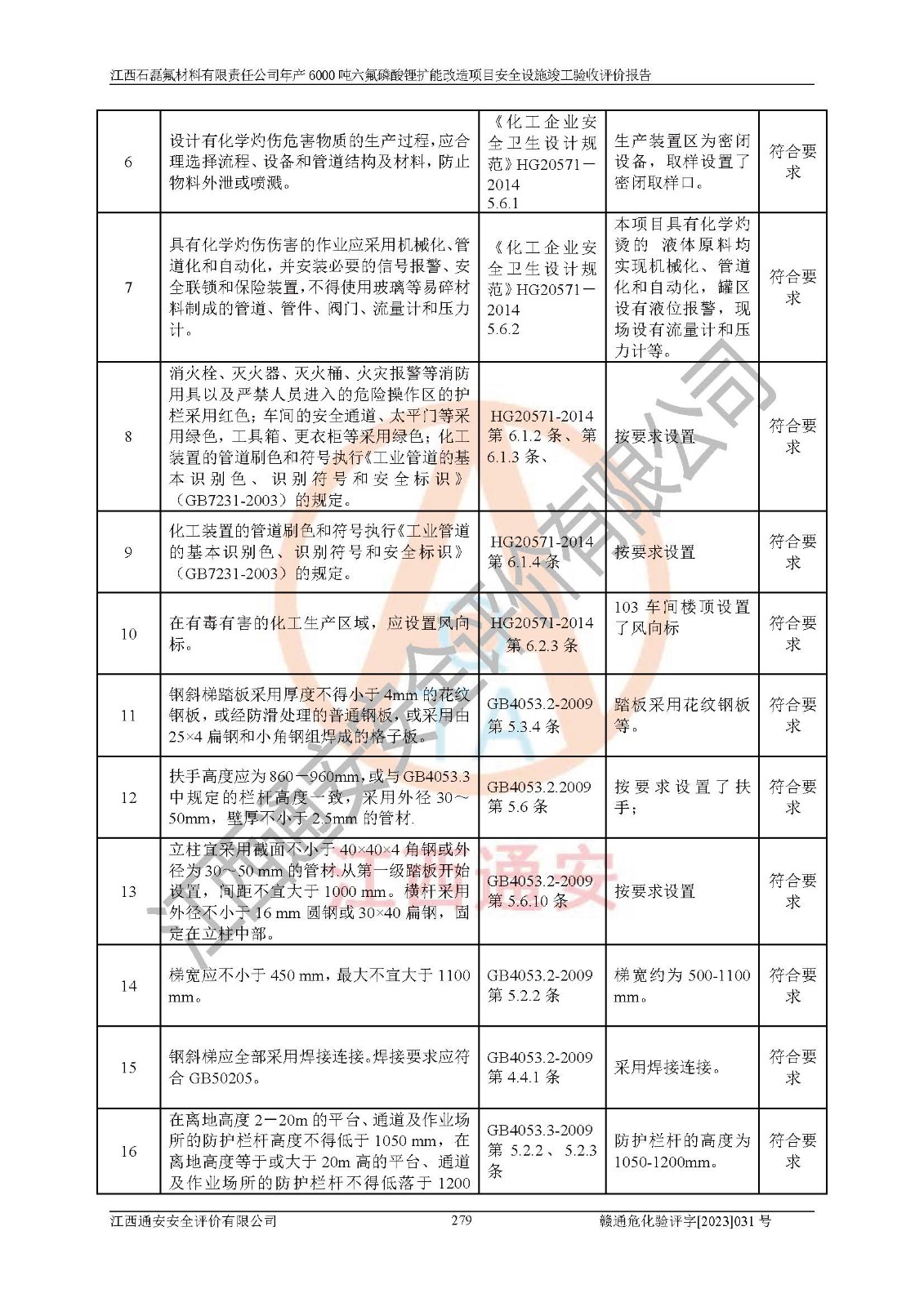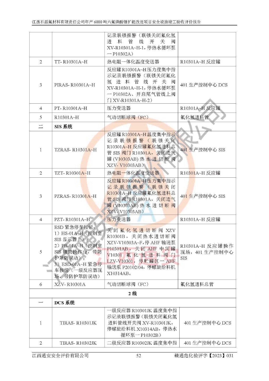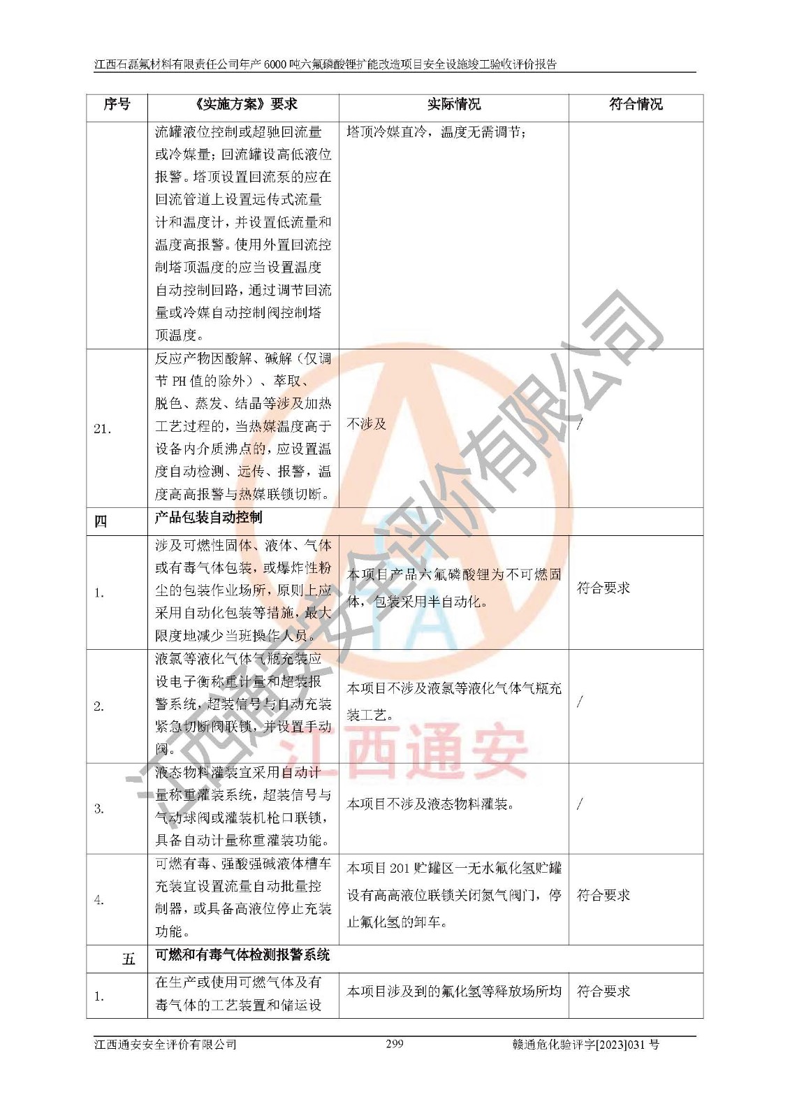 一、建设项目所在地的安全条件和与周边的安全防护距离 (1)该项目位于江西省赣州市会昌县氟盐化工产业基地,属于认定的化工园区,厂址选择合理,该项目与周边环境的防火间距符合规范的要求。 (2)重大危险源与“八类敏感场所及区域”的距离符合相关法律、法规的规定。 (3)该项目103生产车间三和201罐区一均构成**重大危险源。根据《危险化学品生产装置和储存设施外部安全防护距离确定方法》(GB/T 37243-2019)和《危险化学品生产装置和储存设施风险基准》(GB 36894-2018),该项目高敏感防护目标、重要防护目标、一般防护目标中的一类防护目标(<3×10-7)的外部安全防护距离包络线距离厂界*大值为76.36m,个人风险等值线范围内未出现该类防护目标;一般防护目标中的二类防护目标(<3×10-6)的外部安全防护距离包络线距离厂界*大值为51.62m,个人风险等值线范围内未涉及相应的防护目标;一般防护目标中的三类防护目标(<1×10-5)外部安全防护距离的包络线未出厂界。项目外部安全防护距离内无相应的防护目标,该项目不存在社会风险。 (4)该项目投产后在正常生产情况下,对其周边单位的生产、经营活动和居民的生活影响很小。在发生事故的情况下对周边单位的生产、经营活动和居民的生活存在影响。该项目周边单位的生产、经营活动和居民的生活对该项目投产后的正常生产影响很小。该项目所在地自然条件(不包括地震等破坏力**的自然灾害)的变化对该项目投产后的正常生产没有影响。 二、建设项目安全设施设计的采纳情况和已采用(取)的安全设施水平 该项目采用的主要安全设施包括了以下方面:检测、报警设施,设备安全防护设施,作业场所防护设施,安全警示标志,泄压和止逆设施,紧急处理设施,防止火灾蔓延设施,灭火设施,紧急个人处置设施,应急救援设施,劳动防护用品和装备等。 该项目在建设过程中采纳了《安全设施设计专篇》中的有关安全措施建议及要求,针对性的采取了相应的预防和控制措施,建设中未落实的安全措施,在试生产中已进行了整改。试生产表明该项目所采取的安全控制措施安全**,主要生产装置、设备运行平稳,安全可靠,安全水平较高,能够满足安全生产条件。 三、建设项目试生产(使用)后具备**现行有关安全生产法律、法规和部门规章及标准规定和要求的安全生产条件 1)法律法规等方面的符合性:该项目按照建设项目“三同时”要求,项目进行了备案、通过了安全条件审查、安全设施设计审查、试生产方案审查,立项审批手续齐全,安全设施设计、建设施工、施工监理均由有资质的单位承担,项目建设符合法律、法规规定的审批、施工、监理手续。项目建设期间,公司结合生产需要,增设了部分辅助设施和工艺管线,属于一般变更,试生产期间公司已委托河北英科石化工程有限公司进行了设计变更,作为已经审查通过的安全设施设计专篇的补充文件。 2)该项目与周边建构筑物的防火距离符合《精细化工企业工程设计防火标准》《建筑设计防火规范》的要求。根据《危险化学品生产装置和储存设施风险基准》GB36894-2018确定危险化学品单位周边重要目标和敏感场所承受的可容许个人风险和社会风险的定量风险评价。项目的个人风险计算结果表明,项目外部安全防护距离的包络线内无相应的防护目标。该软件未计算出社会风险。因此项目可容许个人风险和社会风险均在可接受范围内。 3)平面布置及常规防护设施措施的合理性:该项目生产场所、办公场所之间的间距满足安全要求,建筑结构、防火分区、防雷设施、安全出口的设置等满足安全生产的要求。消防道路的净宽度、净**、转弯半径均满足运输**及消防**通行。设置的常规防护设施、防止机械伤害、防急性中毒窒息的设施和措施符合要求。 4)设施、设备、装置及工艺方面的安全性:无**明令淘汰的工艺和 设备,该项目不涉及爆炸性危险区域划分。生产工艺操作和设置的安全设施满足安全需要,生产设施的布置能**人员疏散安全及操作方便。设施、设备、装置及工艺方面安全可靠。 5)特种设备、强制检测设备设施监督检验情况:该项目特种设备均进行了检验检测,并取得了检验报告;安全阀、压力表、有毒气体探头也进行了校验,校验结论合格,特种设备及安全附件符合《特种设备安全监察条例》 等相关法律法规、条例的规定。 6)公用工程、辅助设施的配套性:为该项目生产配套的供水、供电、 供气、供热等满足需要。 7)人员管理及安全培训方面充分性:公司现已建立了安全管理机构, 配备了专职安全管理人员。主要负责人王成具备化学工程与工艺专业本科学历,分管生产负责人曾中山具备化学工程与工艺专业本科学历,分管设备和技术负责人刘辉涛具备应用化学专业本科学历。专职安全管理人员共4人,配有一名注册安全工程师,专职安全管理人员均具有大专以上化工及安全专业相关学历。重点监管化工工艺的生产装置、储存设施操作人员具备高中及以上学历或化工类中等及以上职业教育水平。该公司制定了较完善的安全管理制度、岗位责任制、安全操作规程,制度执行情况较好。该公司已为从业职工交纳了工伤**。该公司对操作员工进行相关的培训和教育,经培训合格后上岗。 8)应急救援**性:企业根据自身实际情况,将该项目按照《生产经 营单位生产安全事故