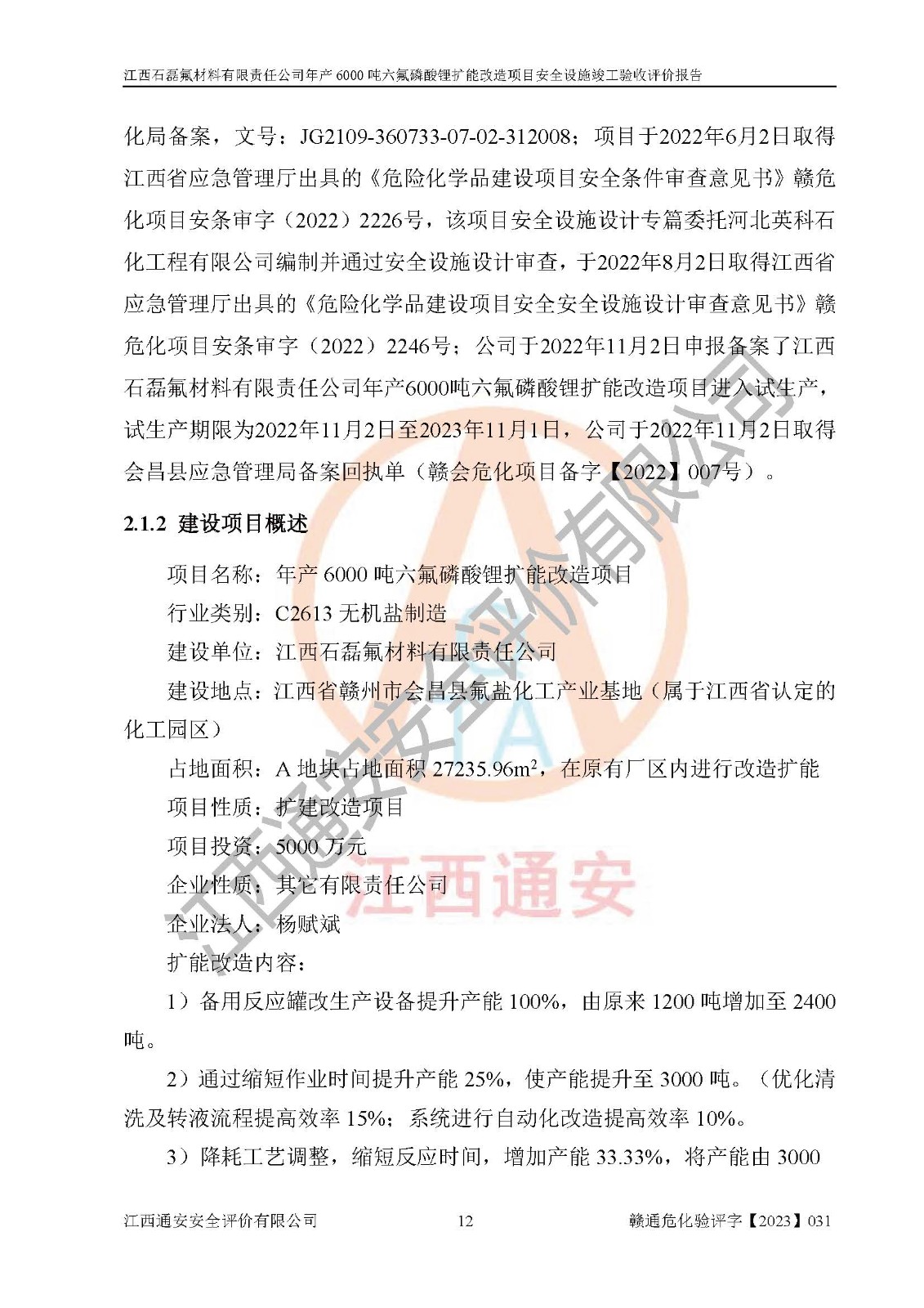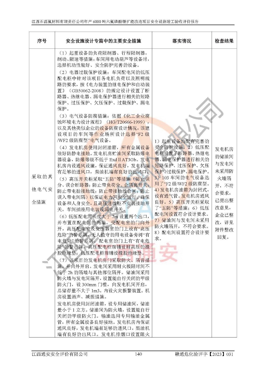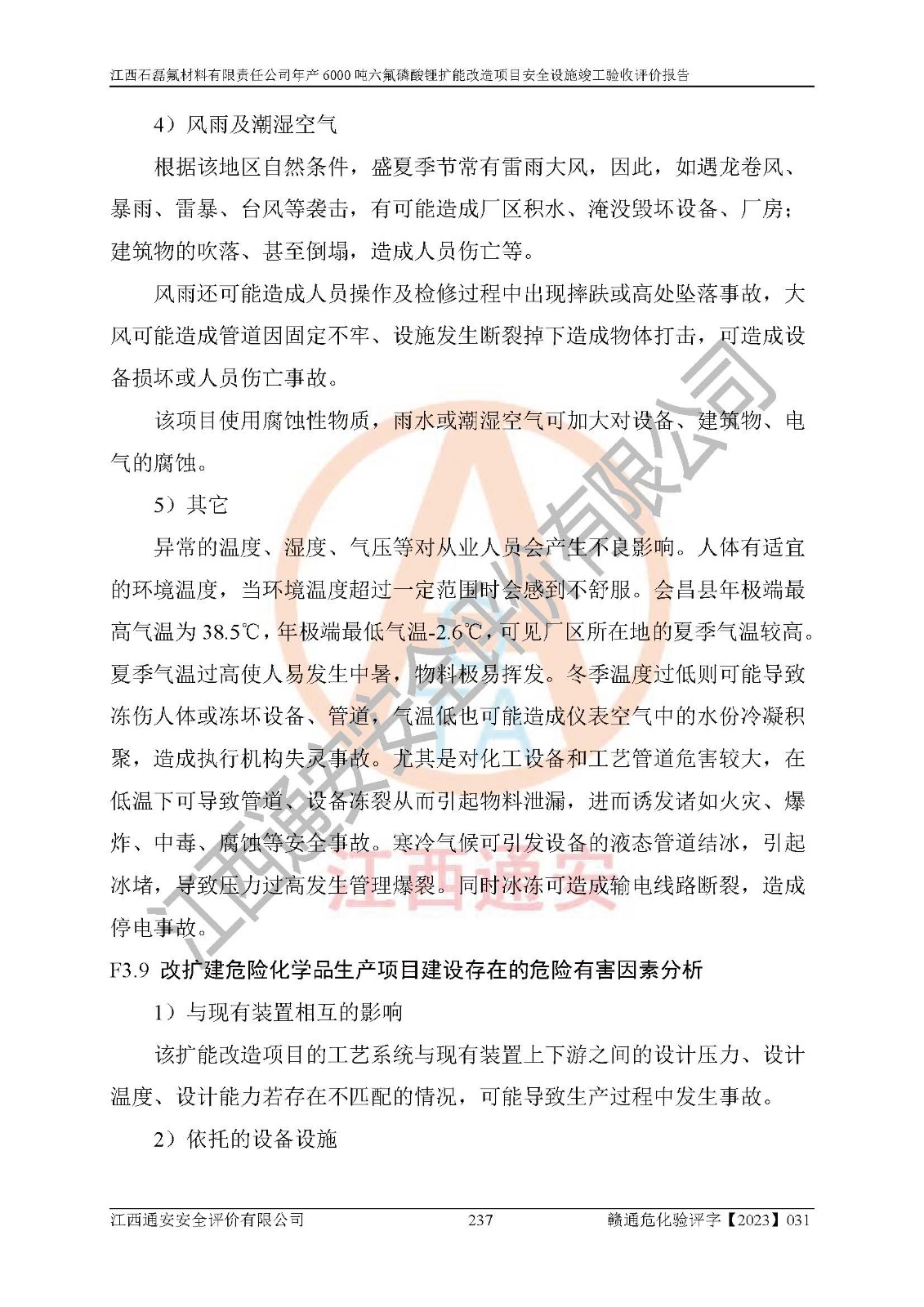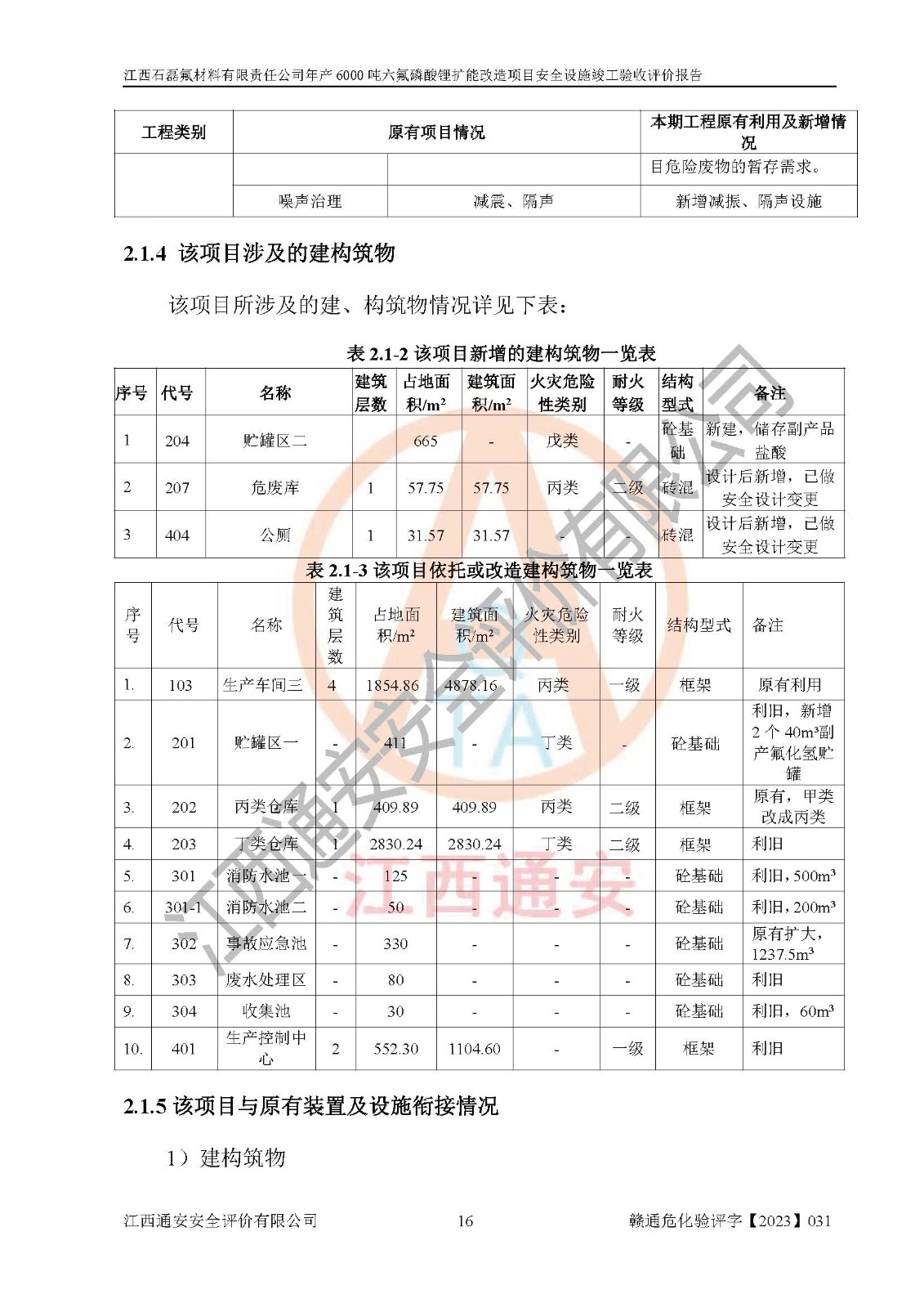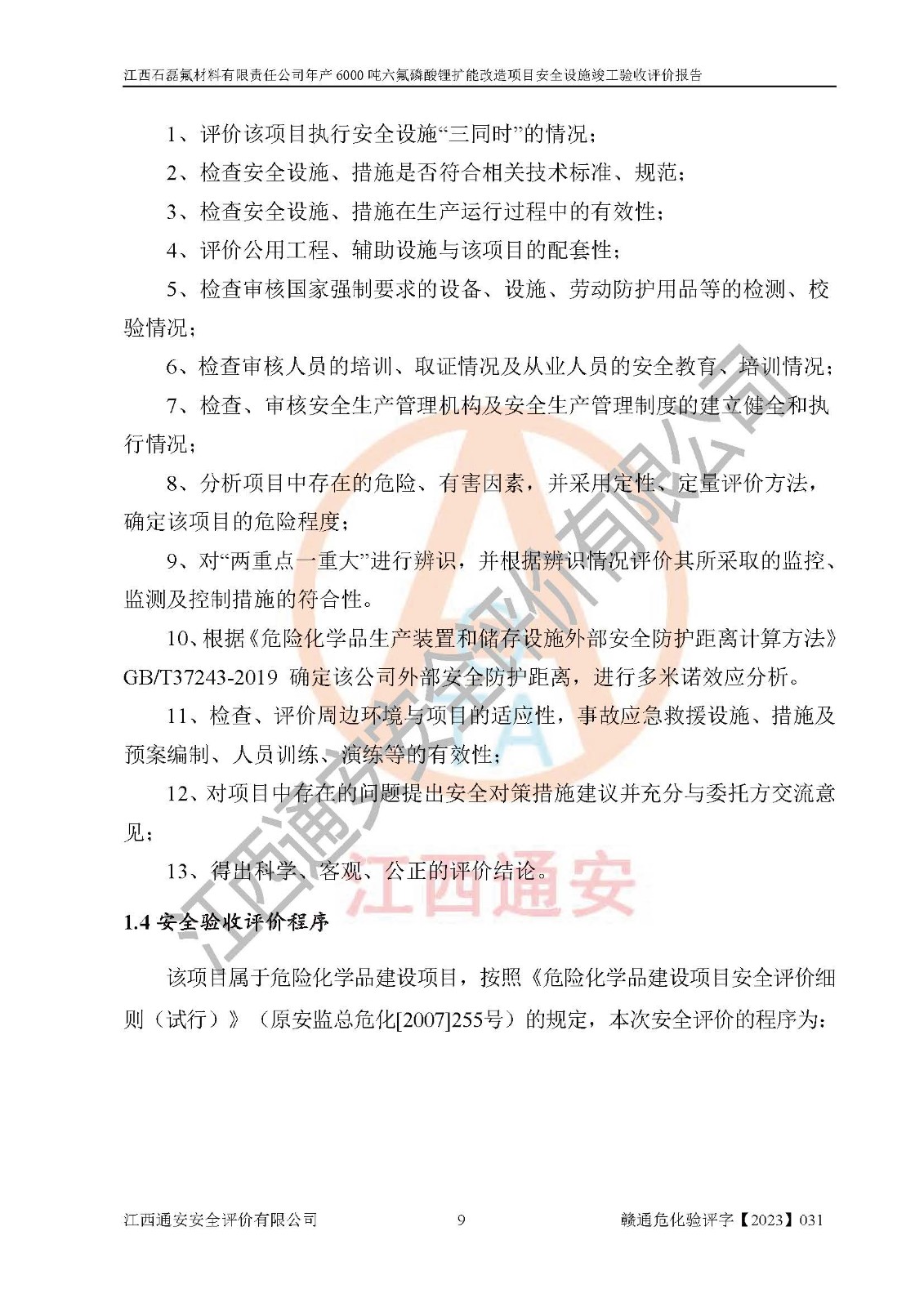 一、建设项目所在地的安全条件和与周边的安全防护距离 (1)该项目位于江西省赣州市会昌县氟盐化工产业基地,属于认定的化工园区,厂址选择合理,该项目与周边环境的防火间距符合规范的要求。 (2)重大危险源与“八类敏感场所及区域”的距离符合相关法律、法规的规定。 (3)该项目103生产车间三和201罐区一均构成**重大危险源。根据《危险化学品生产装置和储存设施外部安全防护距离确定方法》(GB/T 37243-2019)和《危险化学品生产装置和储存设施风险基准》(GB 36894-2018),该项目高敏感防护目标、重要防护目标、一般防护目标中的一类防护目标(<3×10-7)的外部安全防护距离包络线距离厂界*大值为76.36m,个人风险等值线范围内未出现该类防护目标;一般防护目标中的二类防护目标(<3×10-6)的外部安全防护距离包络线距离厂界*大值为51.62m,个人风险等值线范围内未涉及相应的防护目标;一般防护目标中的三类防护目标(<1×10-5)外部安全防护距离的包络线未出厂界。项目外部安全防护距离内无相应的防护目标,该项目不存在社会风险。 (4)该项目投产后在正常生产情况下,对其周边单位的生产、经营活动和居民的生活影响很小。在发生事故的情况下对周边单位的生产、经营活动和居民的生活存在影响。该项目周边单位的生产、经营活动和居民的生活对该项目投产后的正常生产影响很小。该项目所在地自然条件(不包括地震等破坏力**的自然灾害)的变化对该项目投产后的正常生产没有影响。 二、建设项目安全设施设计的采纳情况和已采用(取)的安全设施水平 该项目采用的主要安全设施包括了以下方面:检测、报警设施,设备安全防护设施,作业场所防护设施,安全警示标志,泄压和止逆设施,紧急处理设施,防止火灾蔓延设施,灭火设施,紧急个人处置设施,应急救援设施,劳动防护用品和装备等。 该项目在建设过程中采纳了《安全设施设计专篇》中的有关安全措施建议及要求,针对性的采取了相应的预防和控制措施,建设中未落实的安全措施,在试生产中已进行了整改。试生产表明该项目所采取的安全控制措施安全**,主要生产装置、设备运行平稳,安全可靠,安全水平较高,能够满足安全生产条件。 三、建设项目试生产(使用)后具备**现行有关安全生产法律、法规和部门规章及标准规定和要求的安全生产条件 1)法律法规等方面的符合性:该项目按照建设项目“三同时”要求,项目进行了备案、通过了安全条件审查、安全设施设计审查、试生产方案审查,立项审批手续齐全,安全设施设计、建设施工、施工监理均由有资质的单位承担,项目建设符合法律、法规规定的审批、施工、监理手续。项目建设期间,公司结合生产需要,增设了部分辅助设施和工艺管线,属于一般变更,试生产期间公司已委托河北英科石化工程有限公司进行了设计变更,作为已经审查通过的安全设施设计专篇的补充文件。 2)该项目与周边建构筑物的防火距离符合《精细化工企业工程设计防火标准》《建筑设计防火规范》的要求。根据《危险化学品生产装置和储存设施风险基准》GB36894-2018确定危险化学品单位周边重要目标和敏感场所承受的可容许个人风险和社会风险的定量风险评价。项目的个人风险计算结果表明,项目外部安全防护距离的包络线内无相应的防护目标。该软件未计算出社会风险。因此项目可容许个人风险和社会风险均在可接受范围内。 3)平面布置及常规防护设施措施的合理性:该项目生产场所、办公场所之间的间距满足安全要求,建筑结构、防火分区、防雷设施、安全出口的设置等满足安全生产的要求。消防道路的净宽度、净**、转弯半径均满足运输**及消防**通行。设置的常规防护设施、防止机械伤害、防急性中毒窒息的设施和措施符合要求。 4)设施、设备、装置及工艺方面的安全性:无**明令淘汰的工艺和 设备,该项目不涉及爆炸性危险区域划分。生产工艺操作和设置的安全设施满足安全需要,生产设施的布置能**人员疏散安全及操作方便。设施、设备、装置及工艺方面安全可靠。 5)特种设备、强制检测设备设施监督检验情况:该项目特种设备均进行了检验检测,并取得了检验报告;安全阀、压力表、有毒气体探头也进行了校验,校验结论合格,特种设备及安全附件符合《特种设备安全监察条例》 等相关法律法规、条例的规定。 6)公用工程、辅助设施的配套性:为该项目生产配套的供水、供电、 供气、供热等满足需要。 7)人员管理及安全培训方面充分性:公司现已建立了安全管理机构, 配备了专职安全管理人员。主要负责人王成具备化学工程与工艺专业本科学历,分管生产负责人曾中山具备化学工程与工艺专业本科学历,分管设备和技术负责人刘辉涛具备应用化学专业本科学历。专职安全管理人员共4人,配有一名注册安全工程师,专职安全管理人员均具有大专以上化工及安全专业相关学历。重点监管化工工艺的生产装置、储存设施操作人员具备高中及以上学历或化工类中等及以上职业教育水平。该公司制定了较完善的安全管理制度、岗位责任制、安全操作规程,制度执行情况较好。该公司已为从业职工交纳了工伤**。该公司对操作员工进行相关的培训和教育,经培训合格后上岗。 8)应急救援**性:企业根据自身实际情况,将该项目按照《生产经 营单位生产安全事故