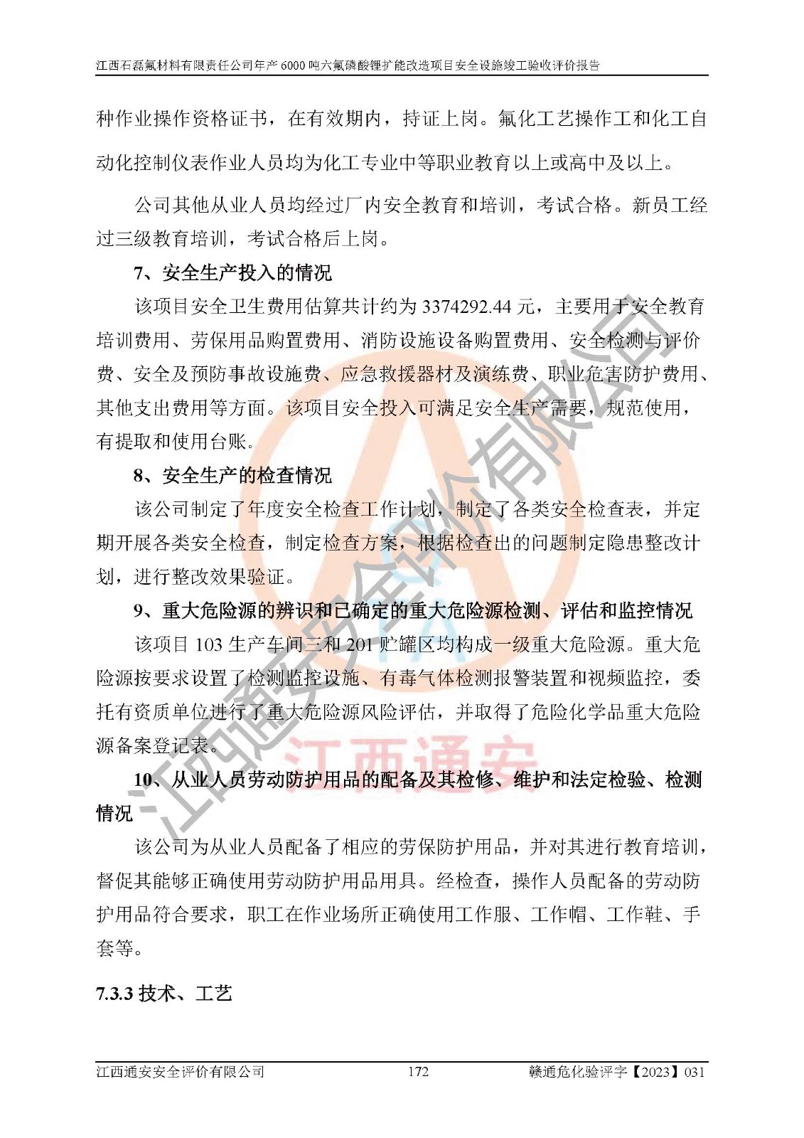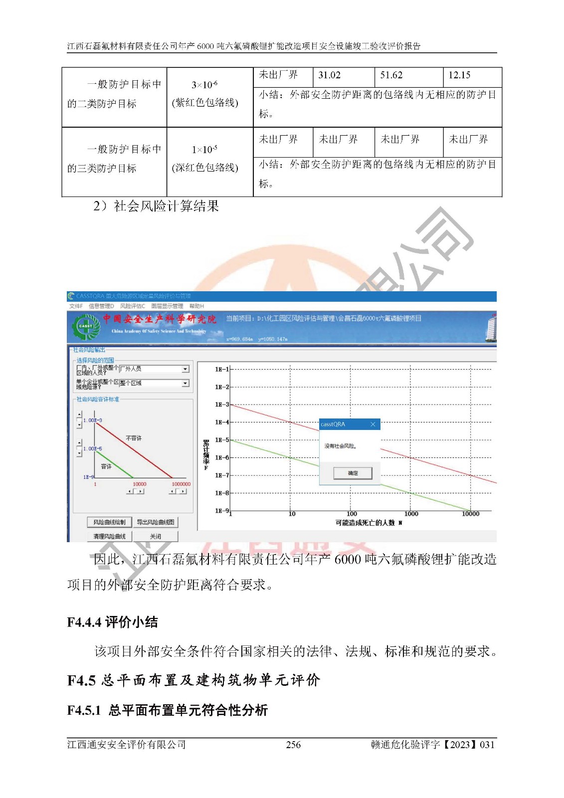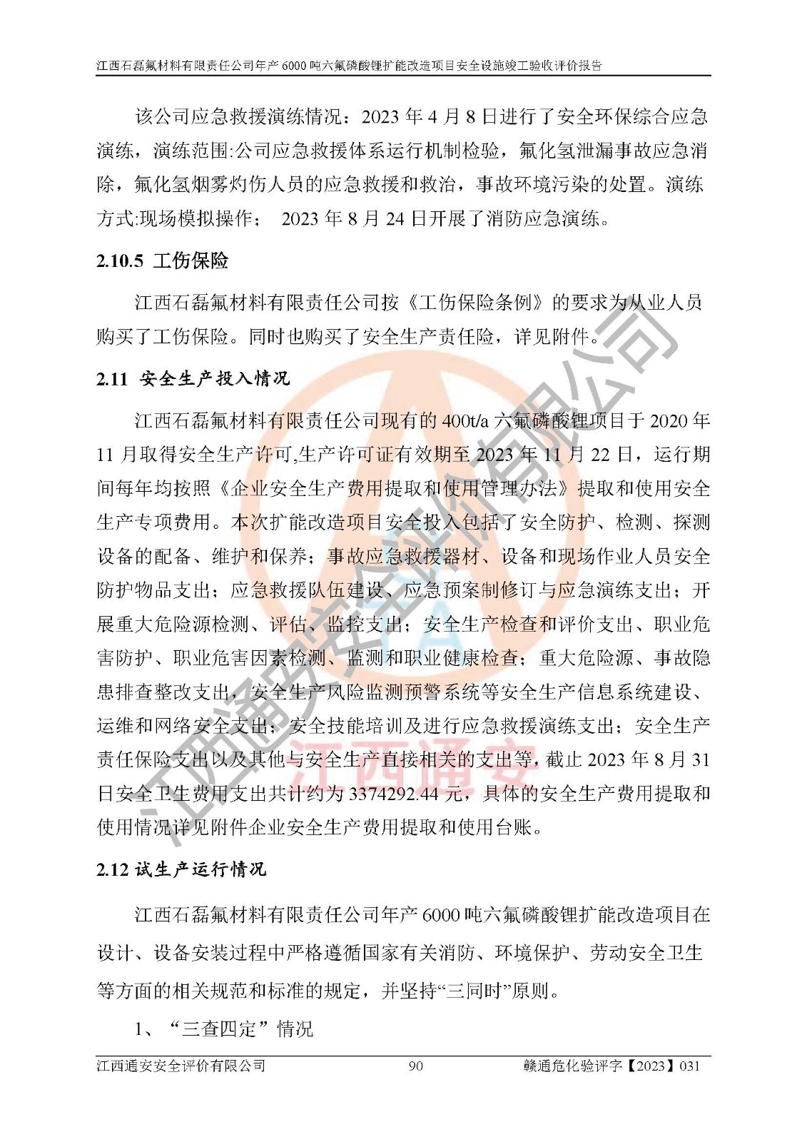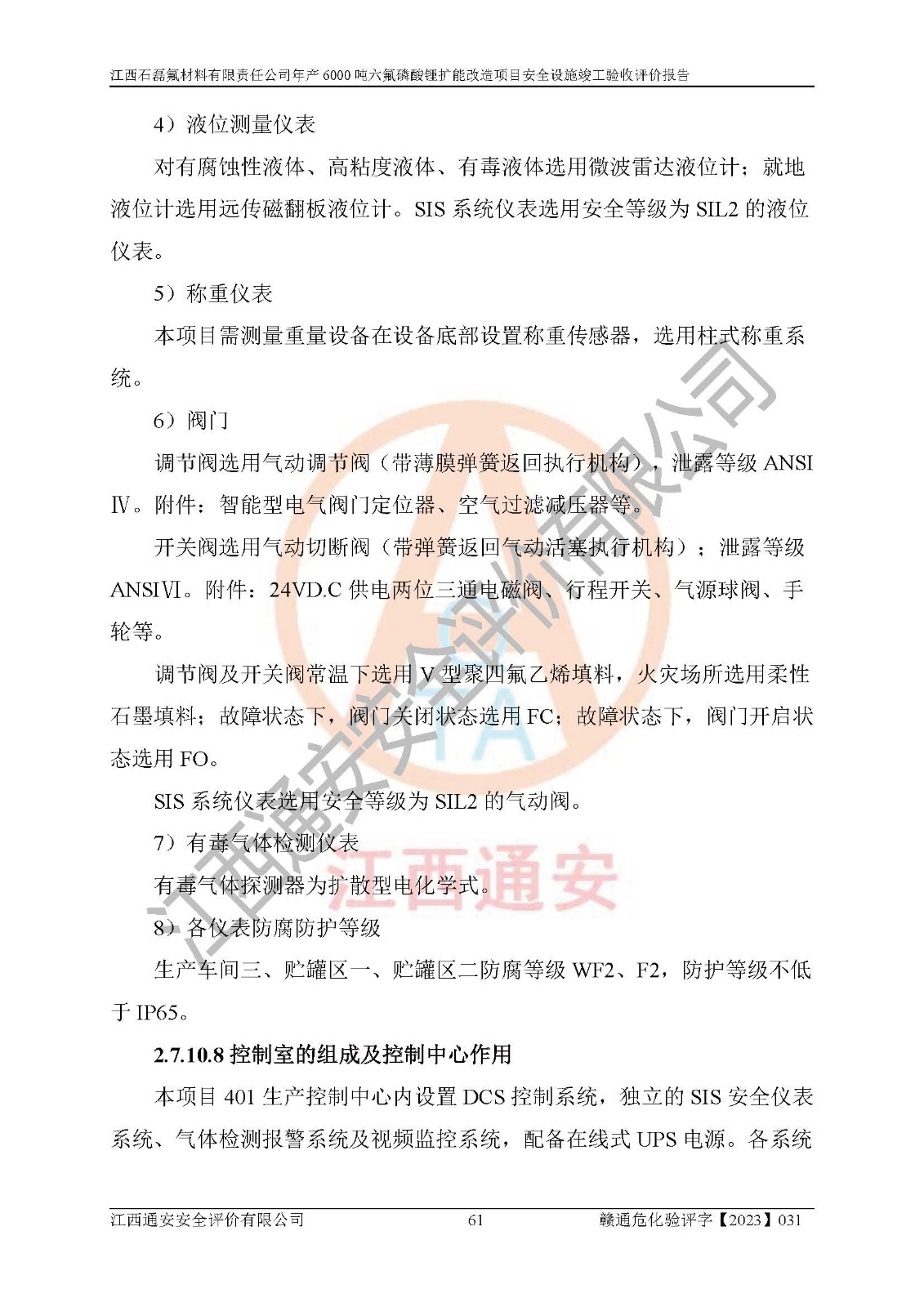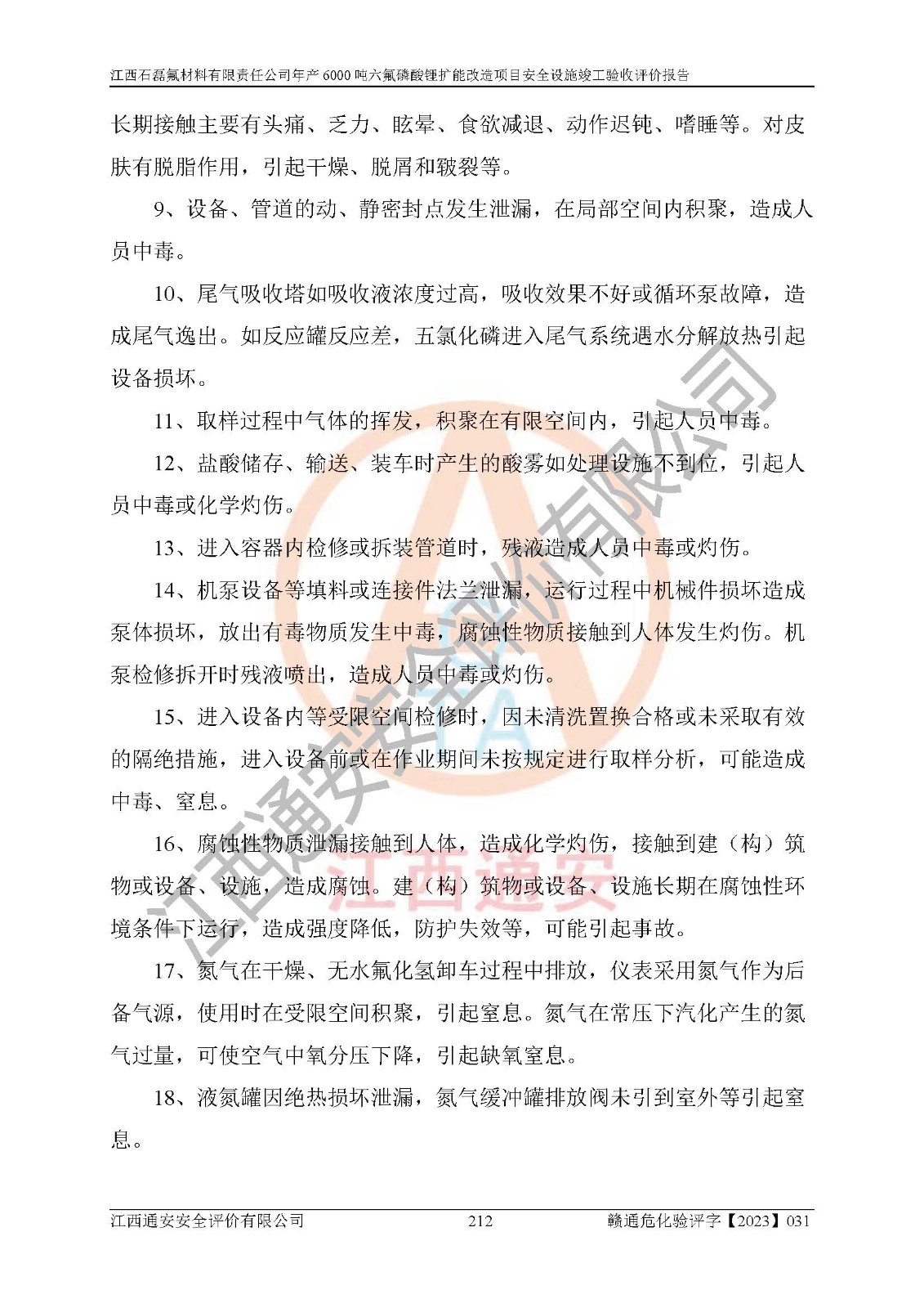 一、建设项目所在地的安全条件和与周边的安全防护距离 (1)该项目位于江西省赣州市会昌县氟盐化工产业基地,属于认定的化工园区,厂址选择合理,该项目与周边环境的防火间距符合规范的要求。 (2)重大危险源与“八类敏感场所及区域”的距离符合相关法律、法规的规定。 (3)该项目103生产车间三和201罐区一均构成**重大危险源。根据《危险化学品生产装置和储存设施外部安全防护距离确定方法》(GB/T 37243-2019)和《危险化学品生产装置和储存设施风险基准》(GB 36894-2018),该项目高敏感防护目标、重要防护目标、一般防护目标中的一类防护目标(<3×10-7)的外部安全防护距离包络线距离厂界*大值为76.36m,个人风险等值线范围内未出现该类防护目标;一般防护目标中的二类防护目标(<3×10-6)的外部安全防护距离包络线距离厂界*大值为51.62m,个人风险等值线范围内未涉及相应的防护目标;一般防护目标中的三类防护目标(<1×10-5)外部安全防护距离的包络线未出厂界。项目外部安全防护距离内无相应的防护目标,该项目不存在社会风险。 (4)该项目投产后在正常生产情况下,对其周边单位的生产、经营活动和居民的生活影响很小。在发生事故的情况下对周边单位的生产、经营活动和居民的生活存在影响。该项目周边单位的生产、经营活动和居民的生活对该项目投产后的正常生产影响很小。该项目所在地自然条件(不包括地震等破坏力**的自然灾害)的变化对该项目投产后的正常生产没有影响。 二、建设项目安全设施设计的采纳情况和已采用(取)的安全设施水平 该项目采用的主要安全设施包括了以下方面:检测、报警设施,设备安全防护设施,作业场所防护设施,安全警示标志,泄压和止逆设施,紧急处理设施,防止火灾蔓延设施,灭火设施,紧急个人处置设施,应急救援设施,劳动防护用品和装备等。 该项目在建设过程中采纳了《安全设施设计专篇》中的有关安全措施建议及要求,针对性的采取了相应的预防和控制措施,建设中未落实的安全措施,在试生产中已进行了整改。试生产表明该项目所采取的安全控制措施安全**,主要生产装置、设备运行平稳,安全可靠,安全水平较高,能够满足安全生产条件。 三、建设项目试生产(使用)后具备**现行有关安全生产法律、法规和部门规章及标准规定和要求的安全生产条件 1)法律法规等方面的符合性:该项目按照建设项目“三同时”要求,项目进行了备案、通过了安全条件审查、安全设施设计审查、试生产方案审查,立项审批手续齐全,安全设施设计、建设施工、施工监理均由有资质的单位承担,项目建设符合法律、法规规定的审批、施工、监理手续。项目建设期间,公司结合生产需要,增设了部分辅助设施和工艺管线,属于一般变更,试生产期间公司已委托河北英科石化工程有限公司进行了设计变更,作为已经审查通过的安全设施设计专篇的补充文件。 2)该项目与周边建构筑物的防火距离符合《精细化工企业工程设计防火标准》《建筑设计防火规范》的要求。根据《危险化学品生产装置和储存设施风险基准》GB36894-2018确定危险化学品单位周边重要目标和敏感场所承受的可容许个人风险和社会风险的定量风险评价。项目的个人风险计算结果表明,项目外部安全防护距离的包络线内无相应的防护目标。该软件未计算出社会风险。因此项目可容许个人风险和社会风险均在可接受范围内。 3)平面布置及常规防护设施措施的合理性:该项目生产场所、办公场所之间的间距满足安全要求,建筑结构、防火分区、防雷设施、安全出口的设置等满足安全生产的要求。消防道路的净宽度、净**、转弯半径均满足运输**及消防**通行。设置的常规防护设施、防止机械伤害、防急性中毒窒息的设施和措施符合要求。 4)设施、设备、装置及工艺方面的安全性:无**明令淘汰的工艺和 设备,该项目不涉及爆炸性危险区域划分。生产工艺操作和设置的安全设施满足安全需要,生产设施的布置能**人员疏散安全及操作方便。设施、设备、装置及工艺方面安全可靠。 5)特种设备、强制检测设备设施监督检验情况:该项目特种设备均进行了检验检测,并取得了检验报告;安全阀、压力表、有毒气体探头也进行了校验,校验结论合格,特种设备及安全附件符合《特种设备安全监察条例》 等相关法律法规、条例的规定。 6)公用工程、辅助设施的配套性:为该项目生产配套的供水、供电、 供气、供热等满足需要。 7)人员管理及安全培训方面充分性:公司现已建立了安全管理机构, 配备了专职安全管理人员。主要负责人王成具备化学工程与工艺专业本科学历,分管生产负责人曾中山具备化学工程与工艺专业本科学历,分管设备和技术负责人刘辉涛具备应用化学专业本科学历。专职安全管理人员共4人,配有一名注册安全工程师,专职安全管理人员均具有大专以上化工及安全专业相关学历。重点监管化工工艺的生产装置、储存设施操作人员具备高中及以上学历或化工类中等及以上职业教育水平。该公司制定了较完善的安全管理制度、岗位责任制、安全操作规程,制度执行情况较好。该公司已为从业职工交纳了工伤**。该公司对操作员工进行相关的培训和教育,经培训合格后上岗。 8)应急救援**性:企业根据自身实际情况,将该项目按照《生产经 营单位生产安全事故