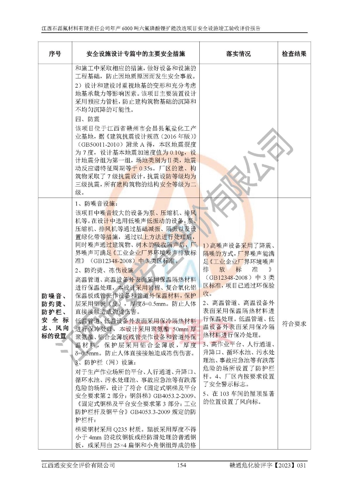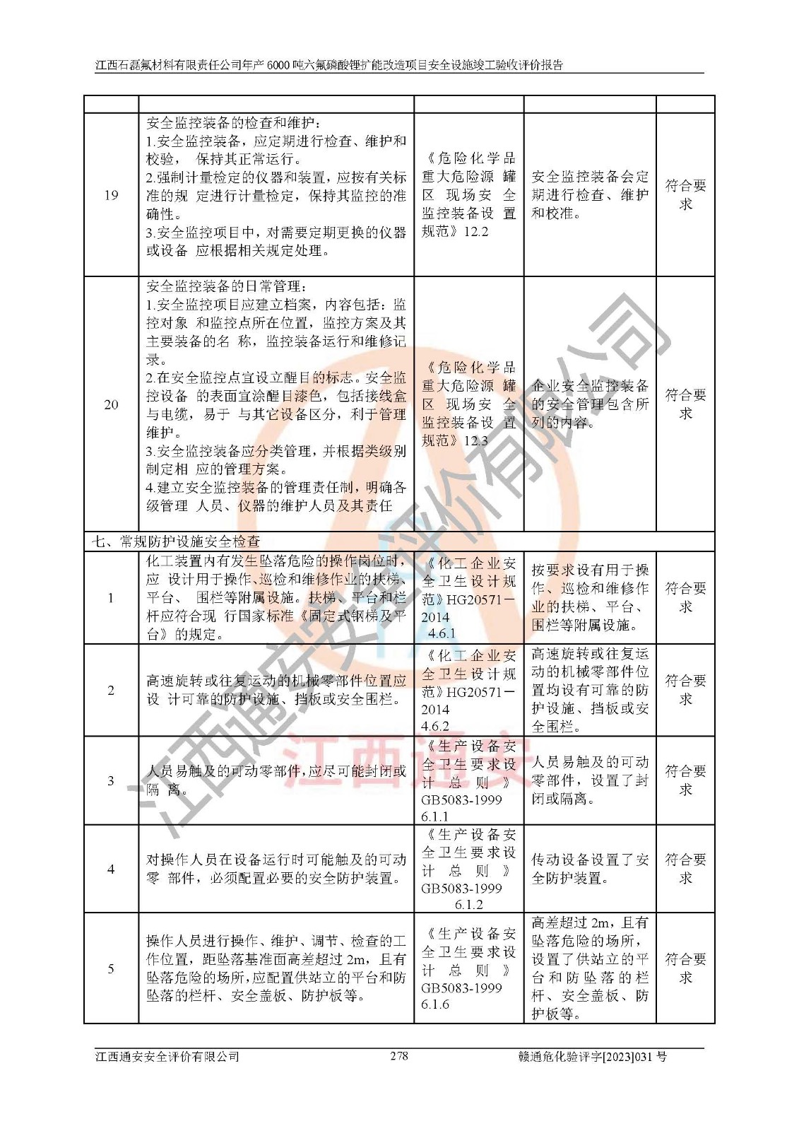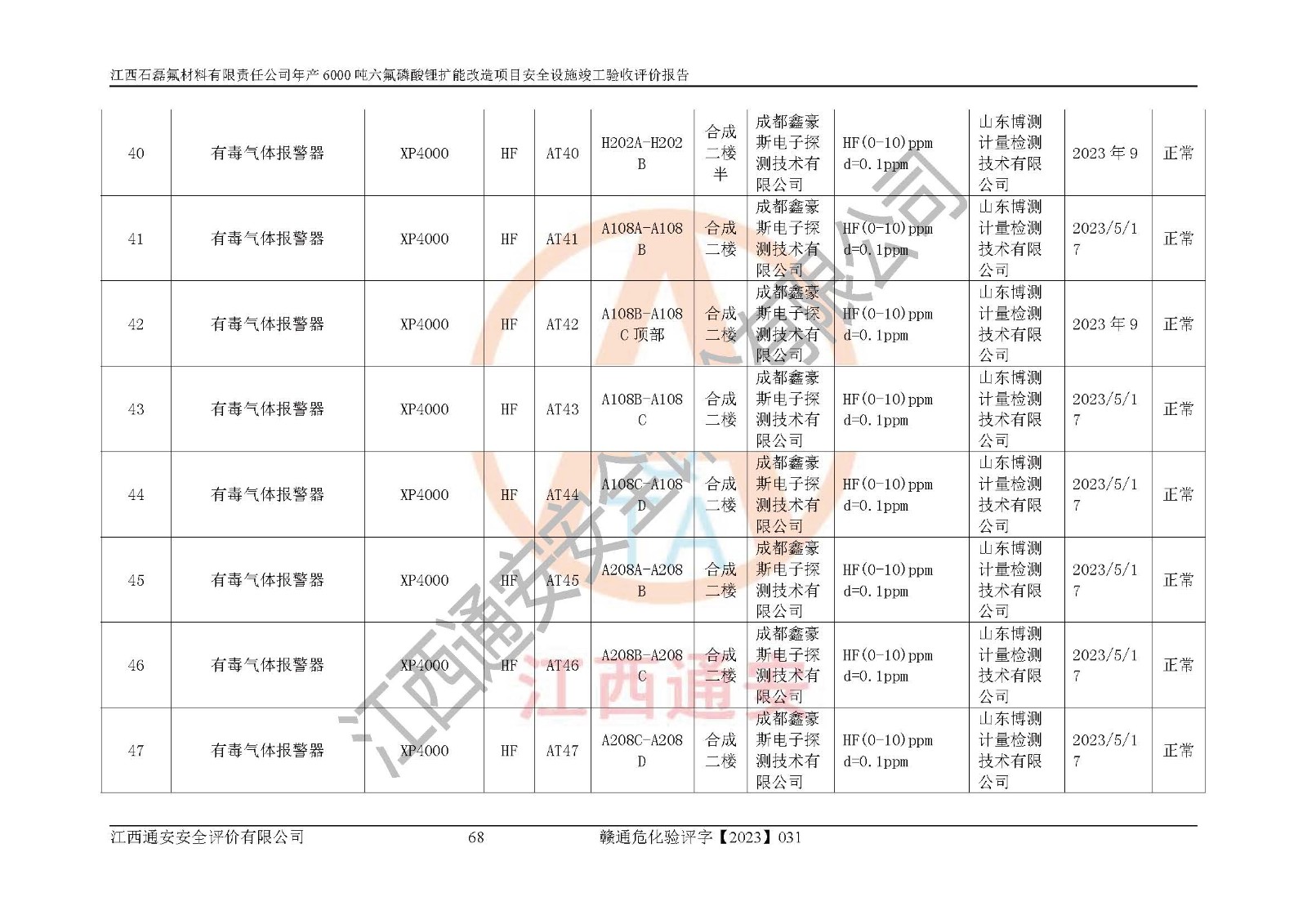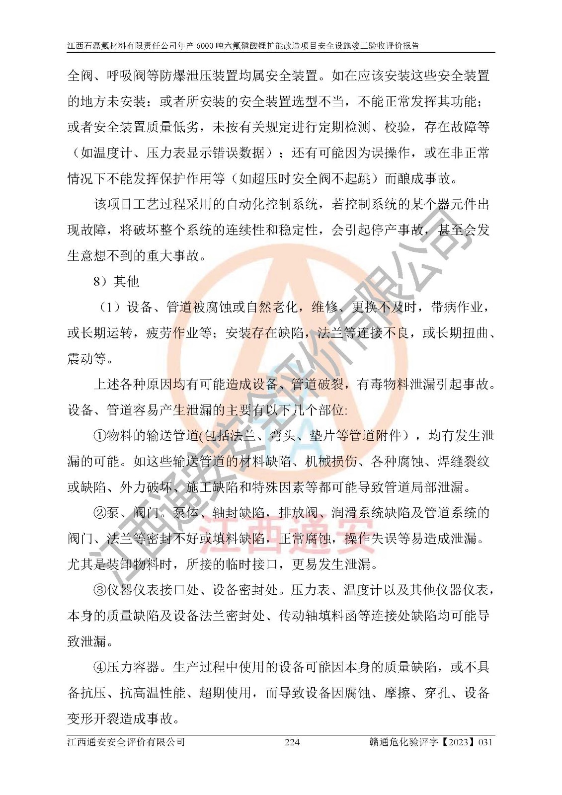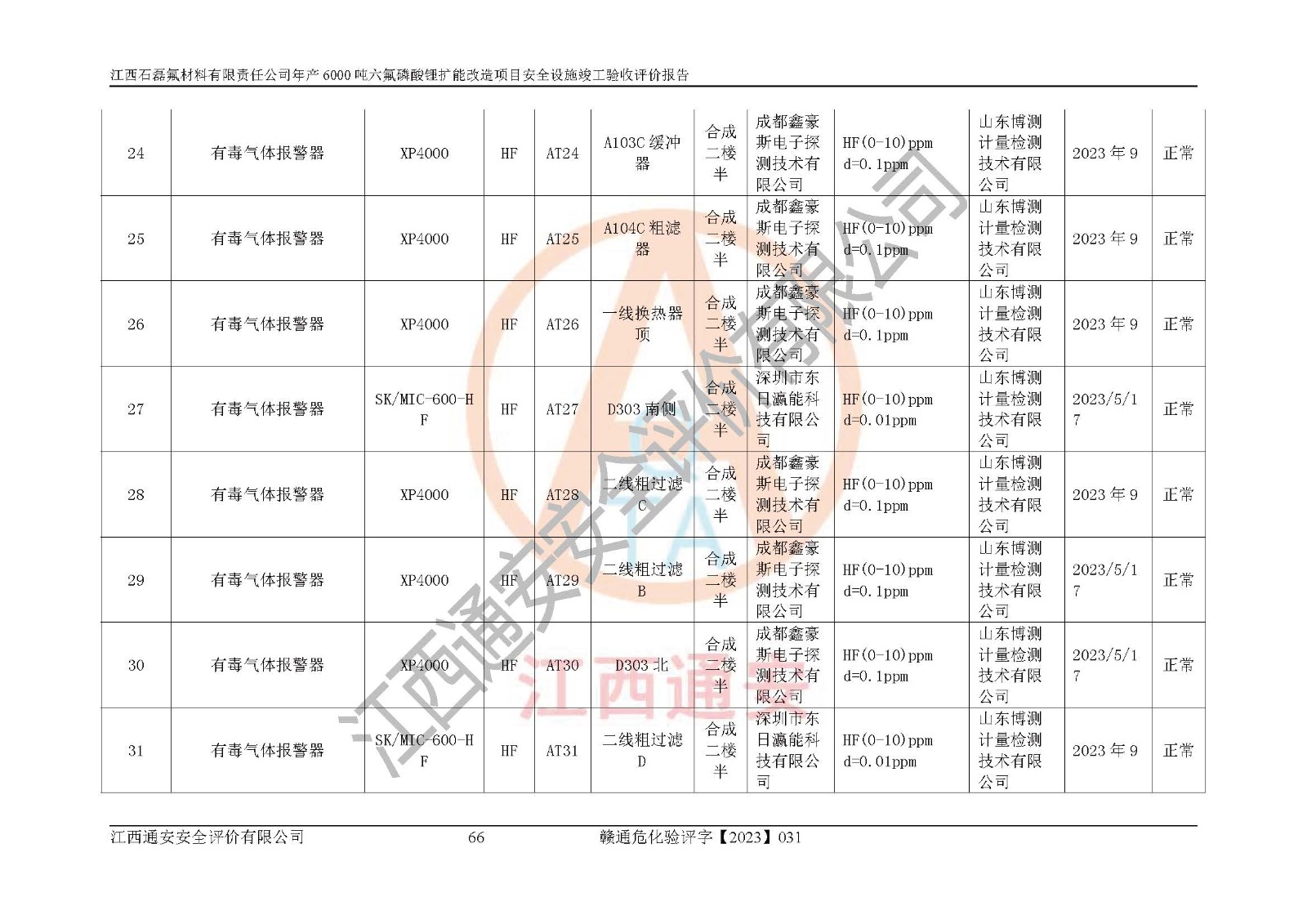 一、建设项目所在地的安全条件和与周边的安全防护距离 (1)该项目位于江西省赣州市会昌县氟盐化工产业基地,属于认定的化工园区,厂址选择合理,该项目与周边环境的防火间距符合规范的要求。 (2)重大危险源与“八类敏感场所及区域”的距离符合相关法律、法规的规定。 (3)该项目103生产车间三和201罐区一均构成**重大危险源。根据《危险化学品生产装置和储存设施外部安全防护距离确定方法》(GB/T 37243-2019)和《危险化学品生产装置和储存设施风险基准》(GB 36894-2018),该项目高敏感防护目标、重要防护目标、一般防护目标中的一类防护目标(<3×10-7)的外部安全防护距离包络线距离厂界*大值为76.36m,个人风险等值线范围内未出现该类防护目标;一般防护目标中的二类防护目标(<3×10-6)的外部安全防护距离包络线距离厂界*大值为51.62m,个人风险等值线范围内未涉及相应的防护目标;一般防护目标中的三类防护目标(<1×10-5)外部安全防护距离的包络线未出厂界。项目外部安全防护距离内无相应的防护目标,该项目不存在社会风险。 (4)该项目投产后在正常生产情况下,对其周边单位的生产、经营活动和居民的生活影响很小。在发生事故的情况下对周边单位的生产、经营活动和居民的生活存在影响。该项目周边单位的生产、经营活动和居民的生活对该项目投产后的正常生产影响很小。该项目所在地自然条件(不包括地震等破坏力**的自然灾害)的变化对该项目投产后的正常生产没有影响。 二、建设项目安全设施设计的采纳情况和已采用(取)的安全设施水平 该项目采用的主要安全设施包括了以下方面:检测、报警设施,设备安全防护设施,作业场所防护设施,安全警示标志,泄压和止逆设施,紧急处理设施,防止火灾蔓延设施,灭火设施,紧急个人处置设施,应急救援设施,劳动防护用品和装备等。 该项目在建设过程中采纳了《安全设施设计专篇》中的有关安全措施建议及要求,针对性的采取了相应的预防和控制措施,建设中未落实的安全措施,在试生产中已进行了整改。试生产表明该项目所采取的安全控制措施安全**,主要生产装置、设备运行平稳,安全可靠,安全水平较高,能够满足安全生产条件。 三、建设项目试生产(使用)后具备**现行有关安全生产法律、法规和部门规章及标准规定和要求的安全生产条件 1)法律法规等方面的符合性:该项目按照建设项目“三同时”要求,项目进行了备案、通过了安全条件审查、安全设施设计审查、试生产方案审查,立项审批手续齐全,安全设施设计、建设施工、施工监理均由有资质的单位承担,项目建设符合法律、法规规定的审批、施工、监理手续。项目建设期间,公司结合生产需要,增设了部分辅助设施和工艺管线,属于一般变更,试生产期间公司已委托河北英科石化工程有限公司进行了设计变更,作为已经审查通过的安全设施设计专篇的补充文件。 2)该项目与周边建构筑物的防火距离符合《精细化工企业工程设计防火标准》《建筑设计防火规范》的要求。根据《危险化学品生产装置和储存设施风险基准》GB36894-2018确定危险化学品单位周边重要目标和敏感场所承受的可容许个人风险和社会风险的定量风险评价。项目的个人风险计算结果表明,项目外部安全防护距离的包络线内无相应的防护目标。该软件未计算出社会风险。因此项目可容许个人风险和社会风险均在可接受范围内。 3)平面布置及常规防护设施措施的合理性:该项目生产场所、办公场所之间的间距满足安全要求,建筑结构、防火分区、防雷设施、安全出口的设置等满足安全生产的要求。消防道路的净宽度、净**、转弯半径均满足运输**及消防**通行。设置的常规防护设施、防止机械伤害、防急性中毒窒息的设施和措施符合要求。 4)设施、设备、装置及工艺方面的安全性:无**明令淘汰的工艺和 设备,该项目不涉及爆炸性危险区域划分。生产工艺操作和设置的安全设施满足安全需要,生产设施的布置能**人员疏散安全及操作方便。设施、设备、装置及工艺方面安全可靠。 5)特种设备、强制检测设备设施监督检验情况:该项目特种设备均进行了检验检测,并取得了检验报告;安全阀、压力表、有毒气体探头也进行了校验,校验结论合格,特种设备及安全附件符合《特种设备安全监察条例》 等相关法律法规、条例的规定。 6)公用工程、辅助设施的配套性:为该项目生产配套的供水、供电、 供气、供热等满足需要。 7)人员管理及安全培训方面充分性:公司现已建立了安全管理机构, 配备了专职安全管理人员。主要负责人王成具备化学工程与工艺专业本科学历,分管生产负责人曾中山具备化学工程与工艺专业本科学历,分管设备和技术负责人刘辉涛具备应用化学专业本科学历。专职安全管理人员共4人,配有一名注册安全工程师,专职安全管理人员均具有大专以上化工及安全专业相关学历。重点监管化工工艺的生产装置、储存设施操作人员具备高中及以上学历或化工类中等及以上职业教育水平。该公司制定了较完善的安全管理制度、岗位责任制、安全操作规程,制度执行情况较好。该公司已为从业职工交纳了工伤**。该公司对操作员工进行相关的培训和教育,经培训合格后上岗。 8)应急救援**性:企业根据自身实际情况,将该项目按照《生产经 营单位生产安全事故