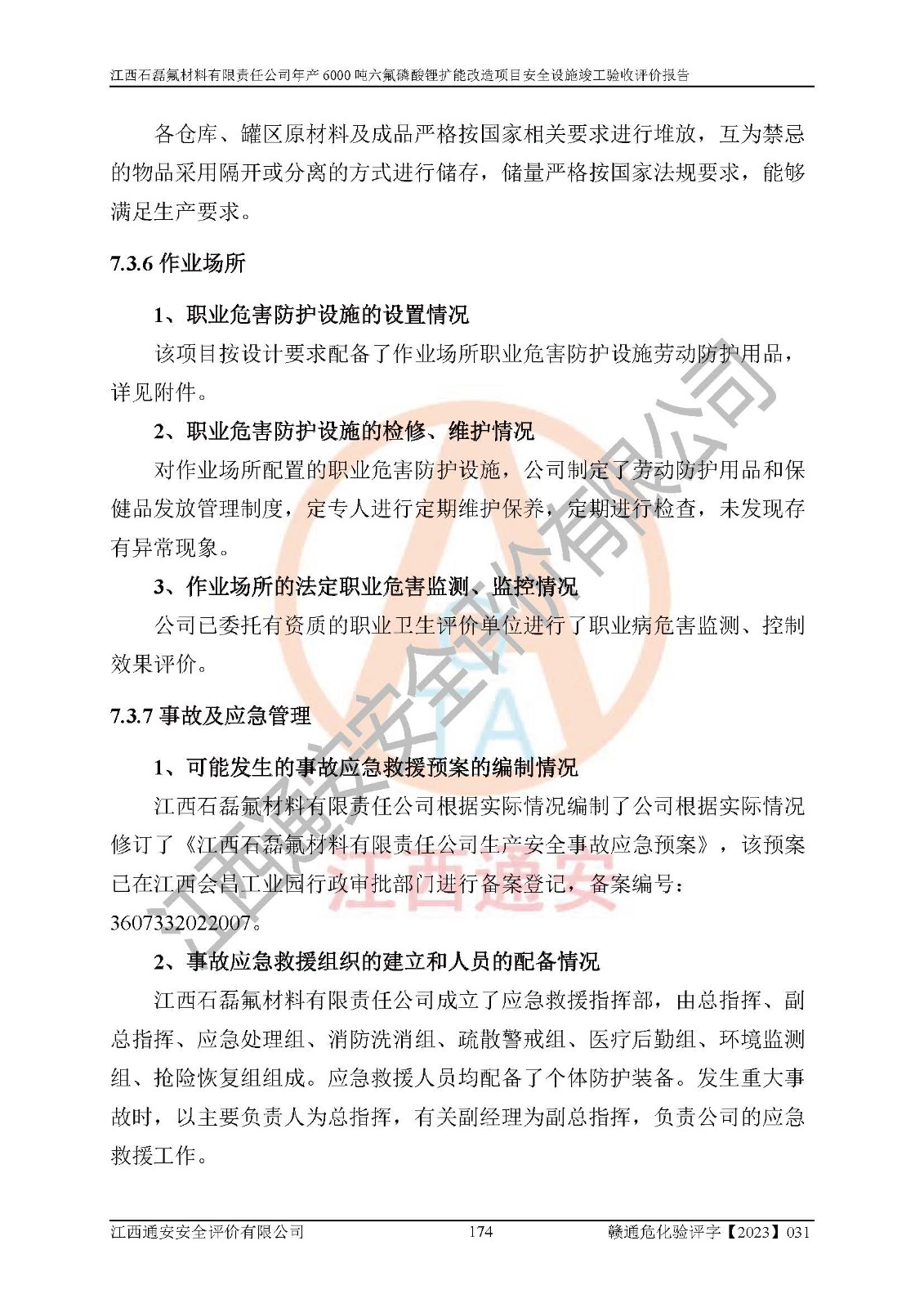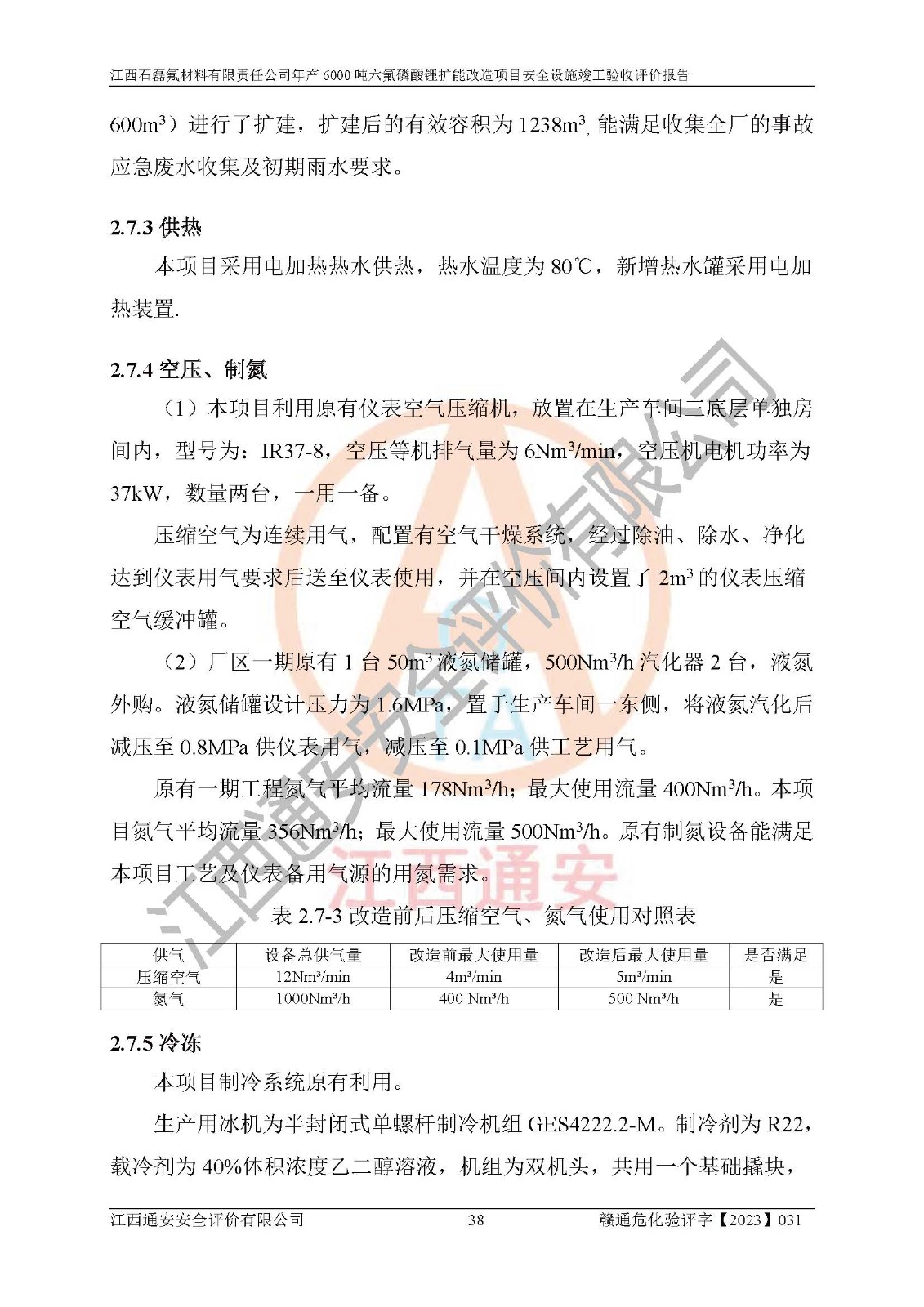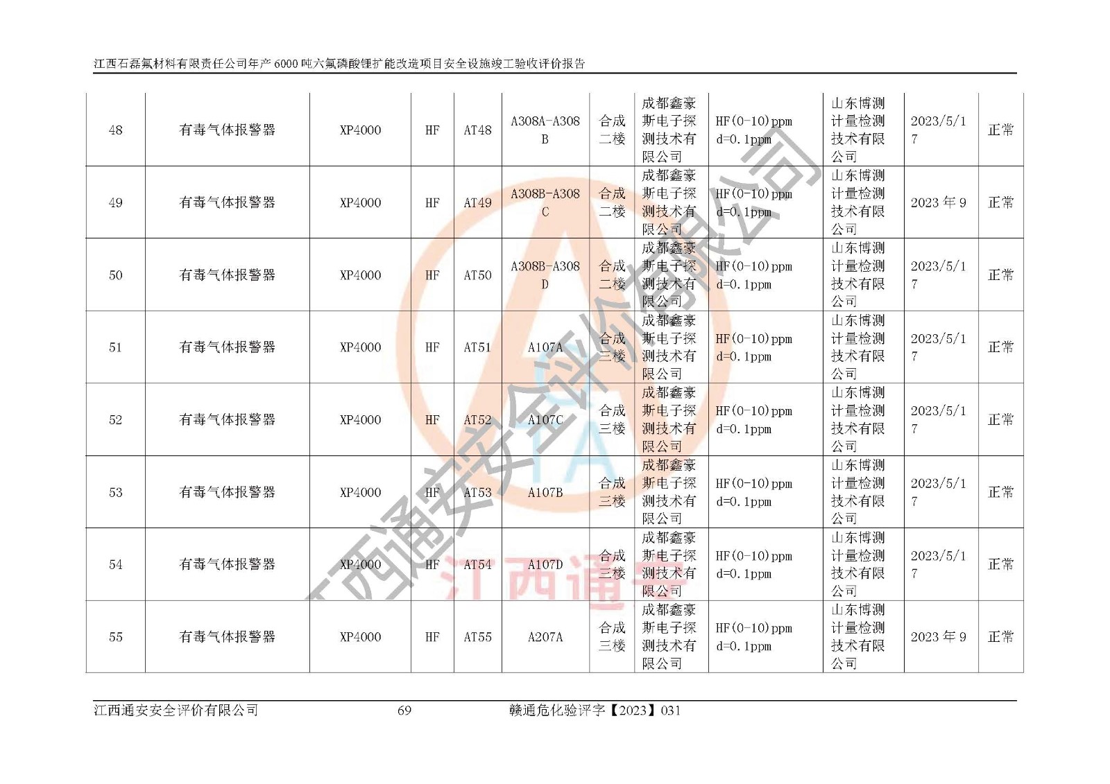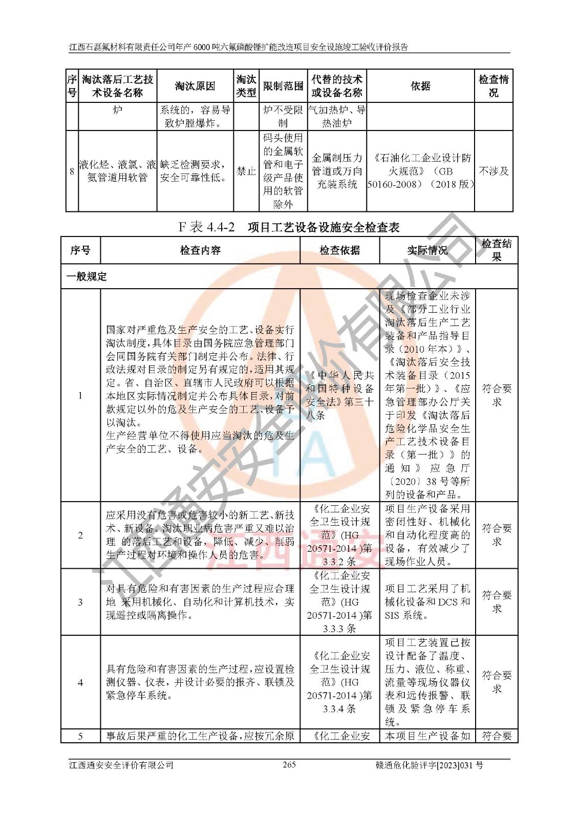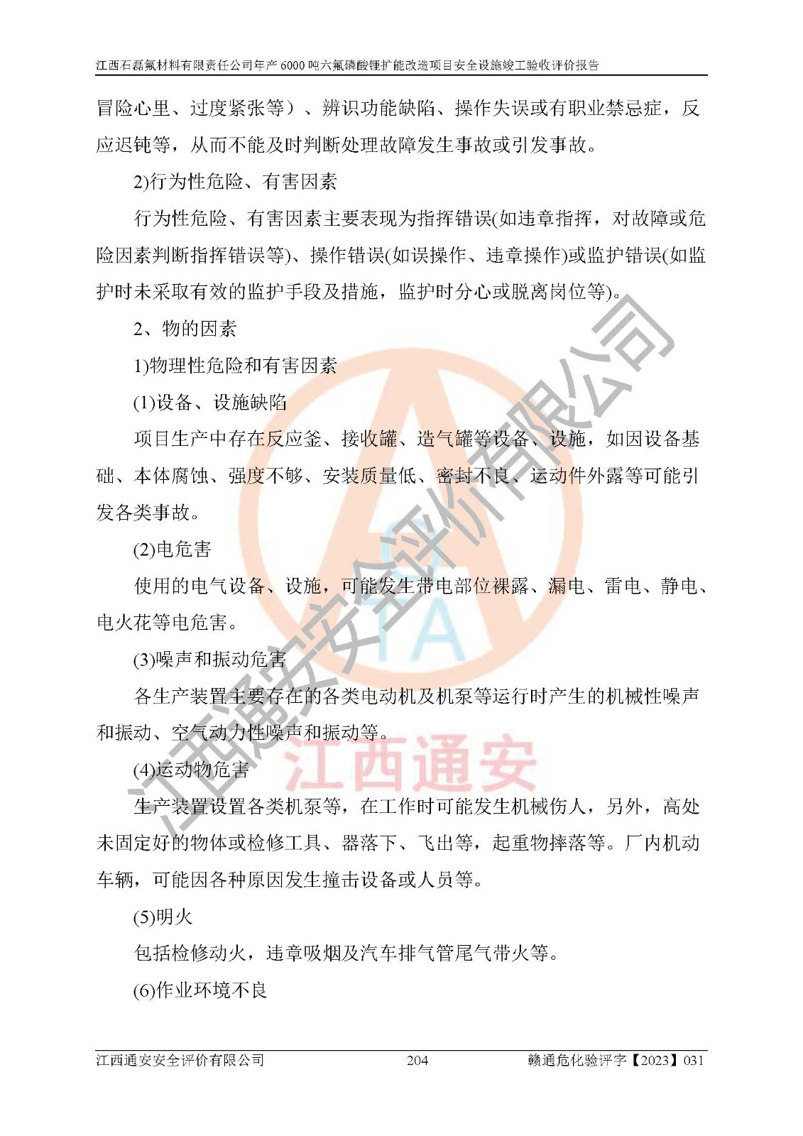 一、建设项目所在地的安全条件和与周边的安全防护距离 (1)该项目位于江西省赣州市会昌县氟盐化工产业基地,属于认定的化工园区,厂址选择合理,该项目与周边环境的防火间距符合规范的要求。 (2)重大危险源与“八类敏感场所及区域”的距离符合相关法律、法规的规定。 (3)该项目103生产车间三和201罐区一均构成**重大危险源。根据《危险化学品生产装置和储存设施外部安全防护距离确定方法》(GB/T 37243-2019)和《危险化学品生产装置和储存设施风险基准》(GB 36894-2018),该项目高敏感防护目标、重要防护目标、一般防护目标中的一类防护目标(<3×10-7)的外部安全防护距离包络线距离厂界*大值为76.36m,个人风险等值线范围内未出现该类防护目标;一般防护目标中的二类防护目标(<3×10-6)的外部安全防护距离包络线距离厂界*大值为51.62m,个人风险等值线范围内未涉及相应的防护目标;一般防护目标中的三类防护目标(<1×10-5)外部安全防护距离的包络线未出厂界。项目外部安全防护距离内无相应的防护目标,该项目不存在社会风险。 (4)该项目投产后在正常生产情况下,对其周边单位的生产、经营活动和居民的生活影响很小。在发生事故的情况下对周边单位的生产、经营活动和居民的生活存在影响。该项目周边单位的生产、经营活动和居民的生活对该项目投产后的正常生产影响很小。该项目所在地自然条件(不包括地震等破坏力**的自然灾害)的变化对该项目投产后的正常生产没有影响。 二、建设项目安全设施设计的采纳情况和已采用(取)的安全设施水平 该项目采用的主要安全设施包括了以下方面:检测、报警设施,设备安全防护设施,作业场所防护设施,安全警示标志,泄压和止逆设施,紧急处理设施,防止火灾蔓延设施,灭火设施,紧急个人处置设施,应急救援设施,劳动防护用品和装备等。 该项目在建设过程中采纳了《安全设施设计专篇》中的有关安全措施建议及要求,针对性的采取了相应的预防和控制措施,建设中未落实的安全措施,在试生产中已进行了整改。试生产表明该项目所采取的安全控制措施安全**,主要生产装置、设备运行平稳,安全可靠,安全水平较高,能够满足安全生产条件。 三、建设项目试生产(使用)后具备**现行有关安全生产法律、法规和部门规章及标准规定和要求的安全生产条件 1)法律法规等方面的符合性:该项目按照建设项目“三同时”要求,项目进行了备案、通过了安全条件审查、安全设施设计审查、试生产方案审查,立项审批手续齐全,安全设施设计、建设施工、施工监理均由有资质的单位承担,项目建设符合法律、法规规定的审批、施工、监理手续。项目建设期间,公司结合生产需要,增设了部分辅助设施和工艺管线,属于一般变更,试生产期间公司已委托河北英科石化工程有限公司进行了设计变更,作为已经审查通过的安全设施设计专篇的补充文件。 2)该项目与周边建构筑物的防火距离符合《精细化工企业工程设计防火标准》《建筑设计防火规范》的要求。根据《危险化学品生产装置和储存设施风险基准》GB36894-2018确定危险化学品单位周边重要目标和敏感场所承受的可容许个人风险和社会风险的定量风险评价。项目的个人风险计算结果表明,项目外部安全防护距离的包络线内无相应的防护目标。该软件未计算出社会风险。因此项目可容许个人风险和社会风险均在可接受范围内。 3)平面布置及常规防护设施措施的合理性:该项目生产场所、办公场所之间的间距满足安全要求,建筑结构、防火分区、防雷设施、安全出口的设置等满足安全生产的要求。消防道路的净宽度、净**、转弯半径均满足运输**及消防**通行。设置的常规防护设施、防止机械伤害、防急性中毒窒息的设施和措施符合要求。 4)设施、设备、装置及工艺方面的安全性:无**明令淘汰的工艺和 设备,该项目不涉及爆炸性危险区域划分。生产工艺操作和设置的安全设施满足安全需要,生产设施的布置能**人员疏散安全及操作方便。设施、设备、装置及工艺方面安全可靠。 5)特种设备、强制检测设备设施监督检验情况:该项目特种设备均进行了检验检测,并取得了检验报告;安全阀、压力表、有毒气体探头也进行了校验,校验结论合格,特种设备及安全附件符合《特种设备安全监察条例》 等相关法律法规、条例的规定。 6)公用工程、辅助设施的配套性:为该项目生产配套的供水、供电、 供气、供热等满足需要。 7)人员管理及安全培训方面充分性:公司现已建立了安全管理机构, 配备了专职安全管理人员。主要负责人王成具备化学工程与工艺专业本科学历,分管生产负责人曾中山具备化学工程与工艺专业本科学历,分管设备和技术负责人刘辉涛具备应用化学专业本科学历。专职安全管理人员共4人,配有一名注册安全工程师,专职安全管理人员均具有大专以上化工及安全专业相关学历。重点监管化工工艺的生产装置、储存设施操作人员具备高中及以上学历或化工类中等及以上职业教育水平。该公司制定了较完善的安全管理制度、岗位责任制、安全操作规程,制度执行情况较好。该公司已为从业职工交纳了工伤**。该公司对操作员工进行相关的培训和教育,经培训合格后上岗。 8)应急救援**性:企业根据自身实际情况,将该项目按照《生产经 营单位生产安全事故
