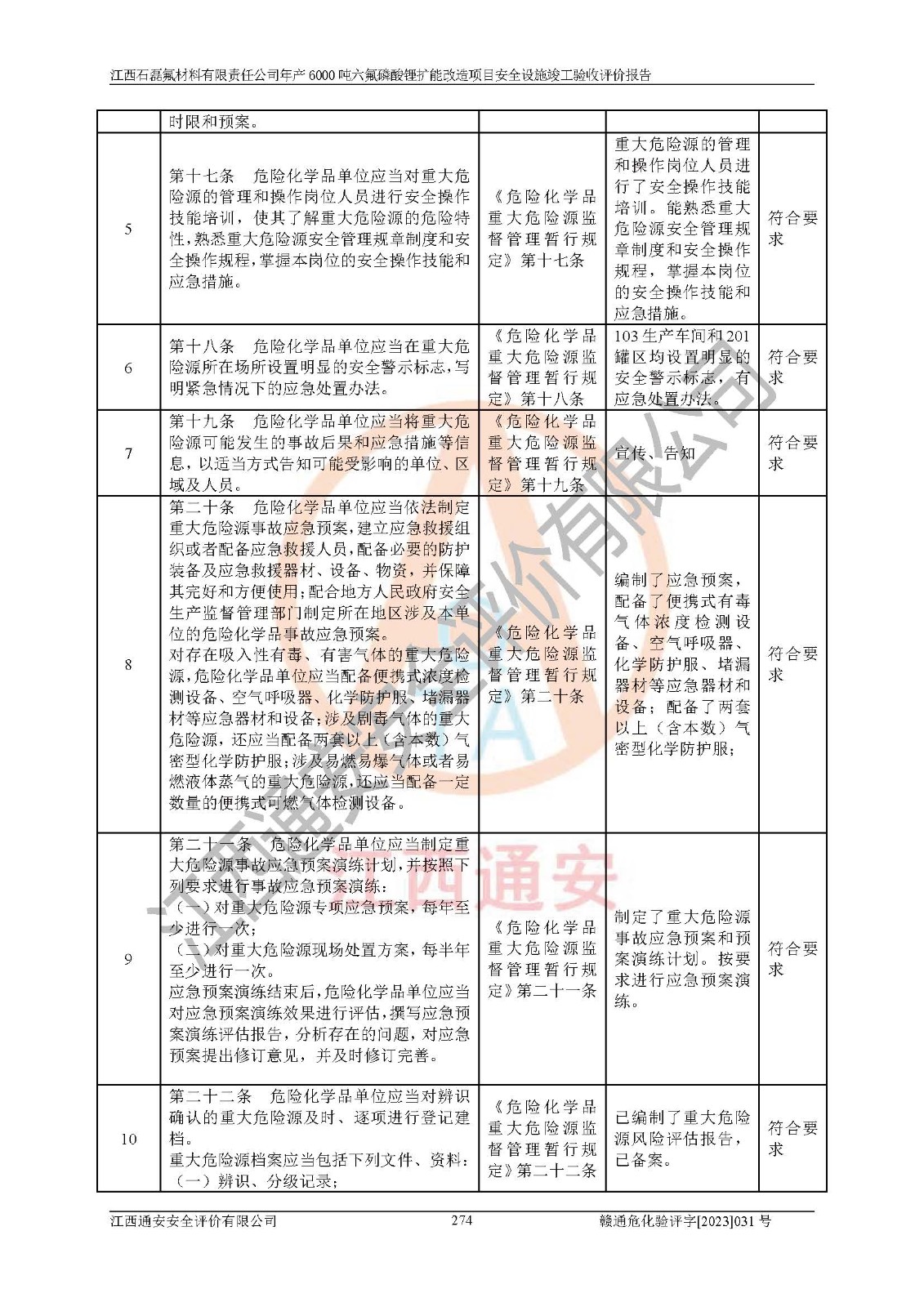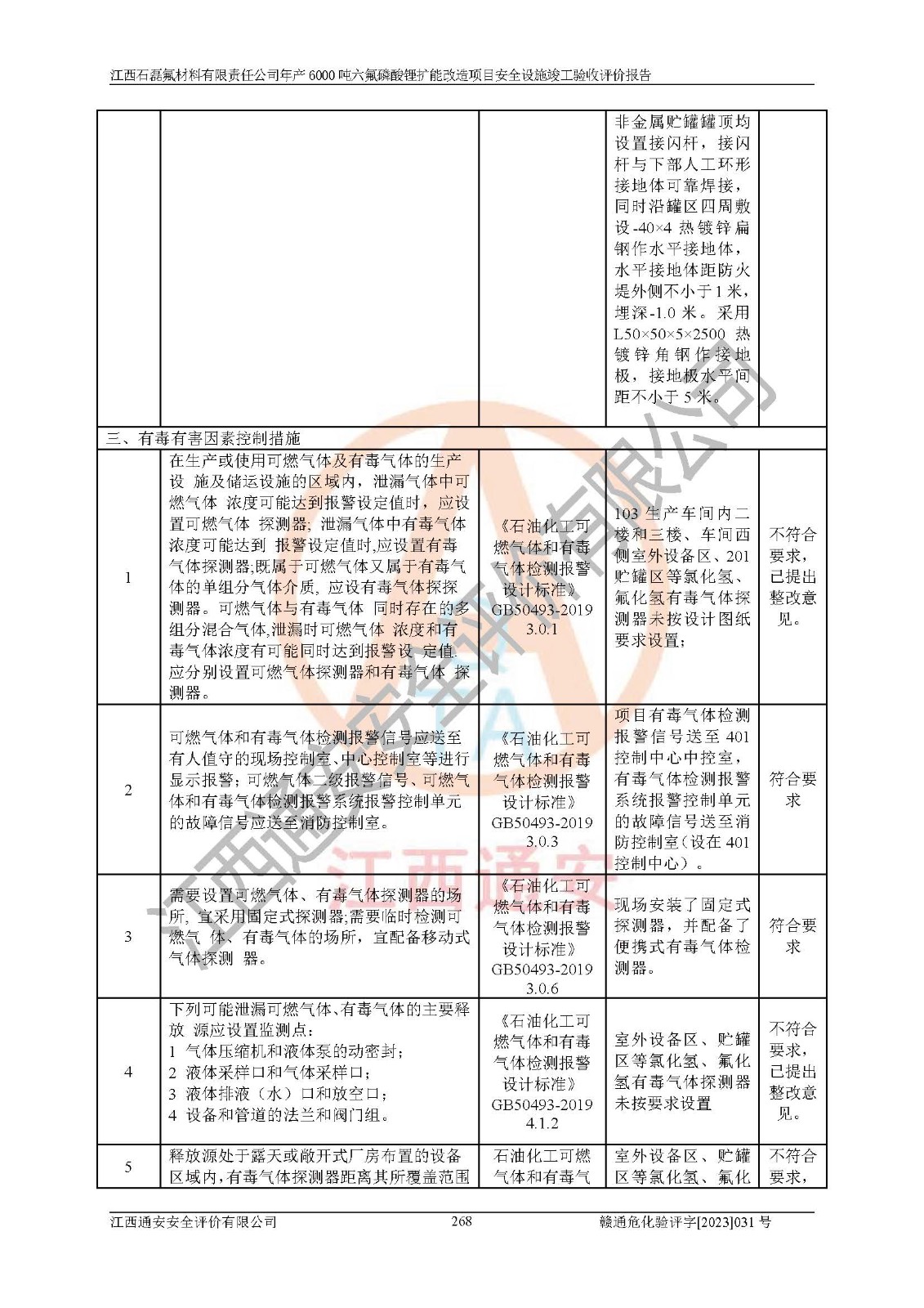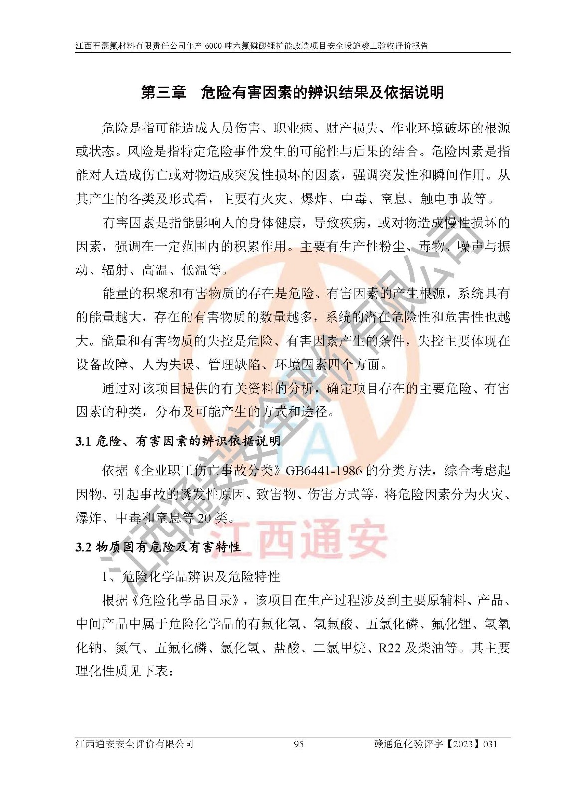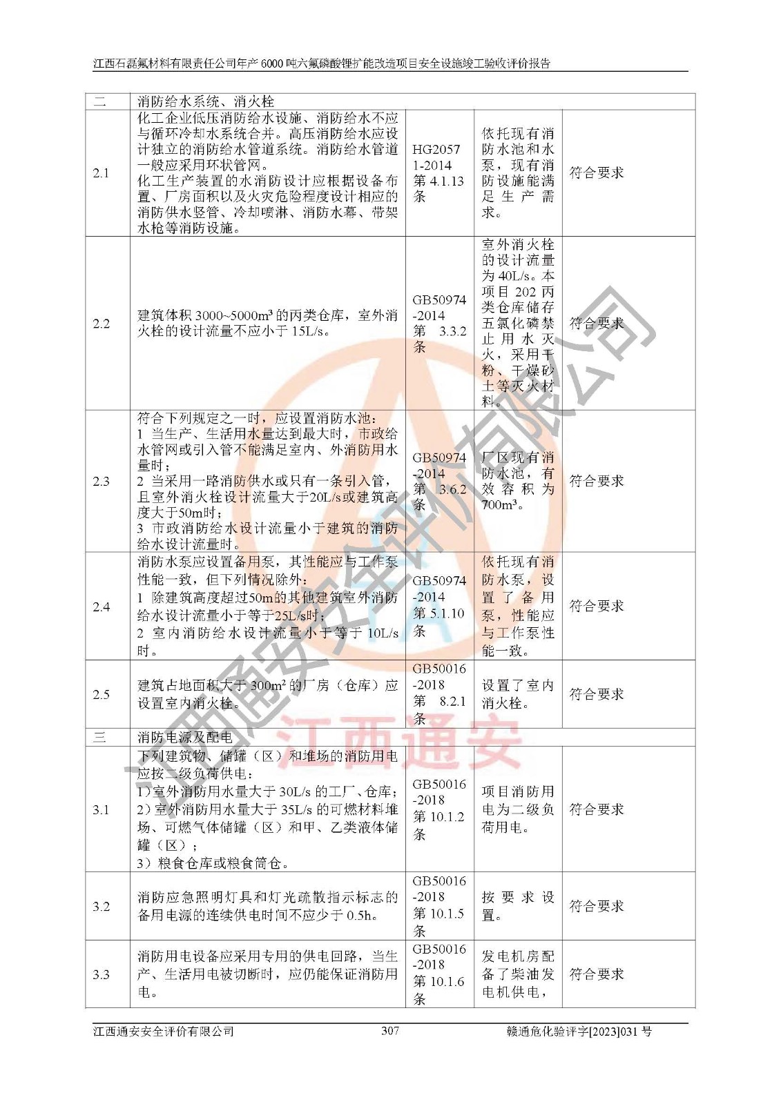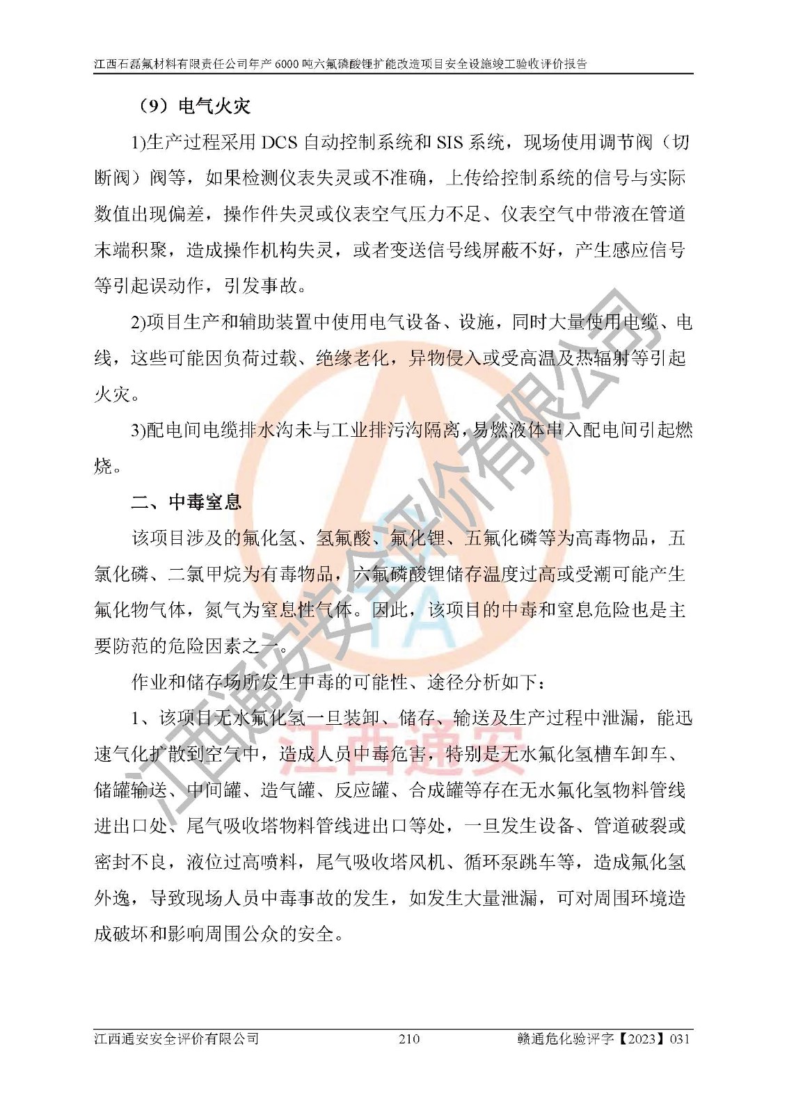 一、建设项目所在地的安全条件和与周边的安全防护距离 (1)该项目位于江西省赣州市会昌县氟盐化工产业基地,属于认定的化工园区,厂址选择合理,该项目与周边环境的防火间距符合规范的要求。 (2)重大危险源与“八类敏感场所及区域”的距离符合相关法律、法规的规定。 (3)该项目103生产车间三和201罐区一均构成**重大危险源。根据《危险化学品生产装置和储存设施外部安全防护距离确定方法》(GB/T 37243-2019)和《危险化学品生产装置和储存设施风险基准》(GB 36894-2018),该项目高敏感防护目标、重要防护目标、一般防护目标中的一类防护目标(<3×10-7)的外部安全防护距离包络线距离厂界*大值为76.36m,个人风险等值线范围内未出现该类防护目标;一般防护目标中的二类防护目标(<3×10-6)的外部安全防护距离包络线距离厂界*大值为51.62m,个人风险等值线范围内未涉及相应的防护目标;一般防护目标中的三类防护目标(<1×10-5)外部安全防护距离的包络线未出厂界。项目外部安全防护距离内无相应的防护目标,该项目不存在社会风险。 (4)该项目投产后在正常生产情况下,对其周边单位的生产、经营活动和居民的生活影响很小。在发生事故的情况下对周边单位的生产、经营活动和居民的生活存在影响。该项目周边单位的生产、经营活动和居民的生活对该项目投产后的正常生产影响很小。该项目所在地自然条件(不包括地震等破坏力**的自然灾害)的变化对该项目投产后的正常生产没有影响。 二、建设项目安全设施设计的采纳情况和已采用(取)的安全设施水平 该项目采用的主要安全设施包括了以下方面:检测、报警设施,设备安全防护设施,作业场所防护设施,安全警示标志,泄压和止逆设施,紧急处理设施,防止火灾蔓延设施,灭火设施,紧急个人处置设施,应急救援设施,劳动防护用品和装备等。 该项目在建设过程中采纳了《安全设施设计专篇》中的有关安全措施建议及要求,针对性的采取了相应的预防和控制措施,建设中未落实的安全措施,在试生产中已进行了整改。试生产表明该项目所采取的安全控制措施安全**,主要生产装置、设备运行平稳,安全可靠,安全水平较高,能够满足安全生产条件。 三、建设项目试生产(使用)后具备**现行有关安全生产法律、法规和部门规章及标准规定和要求的安全生产条件 1)法律法规等方面的符合性:该项目按照建设项目“三同时”要求,项目进行了备案、通过了安全条件审查、安全设施设计审查、试生产方案审查,立项审批手续齐全,安全设施设计、建设施工、施工监理均由有资质的单位承担,项目建设符合法律、法规规定的审批、施工、监理手续。项目建设期间,公司结合生产需要,增设了部分辅助设施和工艺管线,属于一般变更,试生产期间公司已委托河北英科石化工程有限公司进行了设计变更,作为已经审查通过的安全设施设计专篇的补充文件。 2)该项目与周边建构筑物的防火距离符合《精细化工企业工程设计防火标准》《建筑设计防火规范》的要求。根据《危险化学品生产装置和储存设施风险基准》GB36894-2018确定危险化学品单位周边重要目标和敏感场所承受的可容许个人风险和社会风险的定量风险评价。项目的个人风险计算结果表明,项目外部安全防护距离的包络线内无相应的防护目标。该软件未计算出社会风险。因此项目可容许个人风险和社会风险均在可接受范围内。 3)平面布置及常规防护设施措施的合理性:该项目生产场所、办公场所之间的间距满足安全要求,建筑结构、防火分区、防雷设施、安全出口的设置等满足安全生产的要求。消防道路的净宽度、净**、转弯半径均满足运输**及消防**通行。设置的常规防护设施、防止机械伤害、防急性中毒窒息的设施和措施符合要求。 4)设施、设备、装置及工艺方面的安全性:无**明令淘汰的工艺和 设备,该项目不涉及爆炸性危险区域划分。生产工艺操作和设置的安全设施满足安全需要,生产设施的布置能**人员疏散安全及操作方便。设施、设备、装置及工艺方面安全可靠。 5)特种设备、强制检测设备设施监督检验情况:该项目特种设备均进行了检验检测,并取得了检验报告;安全阀、压力表、有毒气体探头也进行了校验,校验结论合格,特种设备及安全附件符合《特种设备安全监察条例》 等相关法律法规、条例的规定。 6)公用工程、辅助设施的配套性:为该项目生产配套的供水、供电、 供气、供热等满足需要。 7)人员管理及安全培训方面充分性:公司现已建立了安全管理机构, 配备了专职安全管理人员。主要负责人王成具备化学工程与工艺专业本科学历,分管生产负责人曾中山具备化学工程与工艺专业本科学历,分管设备和技术负责人刘辉涛具备应用化学专业本科学历。专职安全管理人员共4人,配有一名注册安全工程师,专职安全管理人员均具有大专以上化工及安全专业相关学历。重点监管化工工艺的生产装置、储存设施操作人员具备高中及以上学历或化工类中等及以上职业教育水平。该公司制定了较完善的安全管理制度、岗位责任制、安全操作规程,制度执行情况较好。该公司已为从业职工交纳了工伤**。该公司对操作员工进行相关的培训和教育,经培训合格后上岗。 8)应急救援**性:企业根据自身实际情况,将该项目按照《生产经 营单位生产安全事故