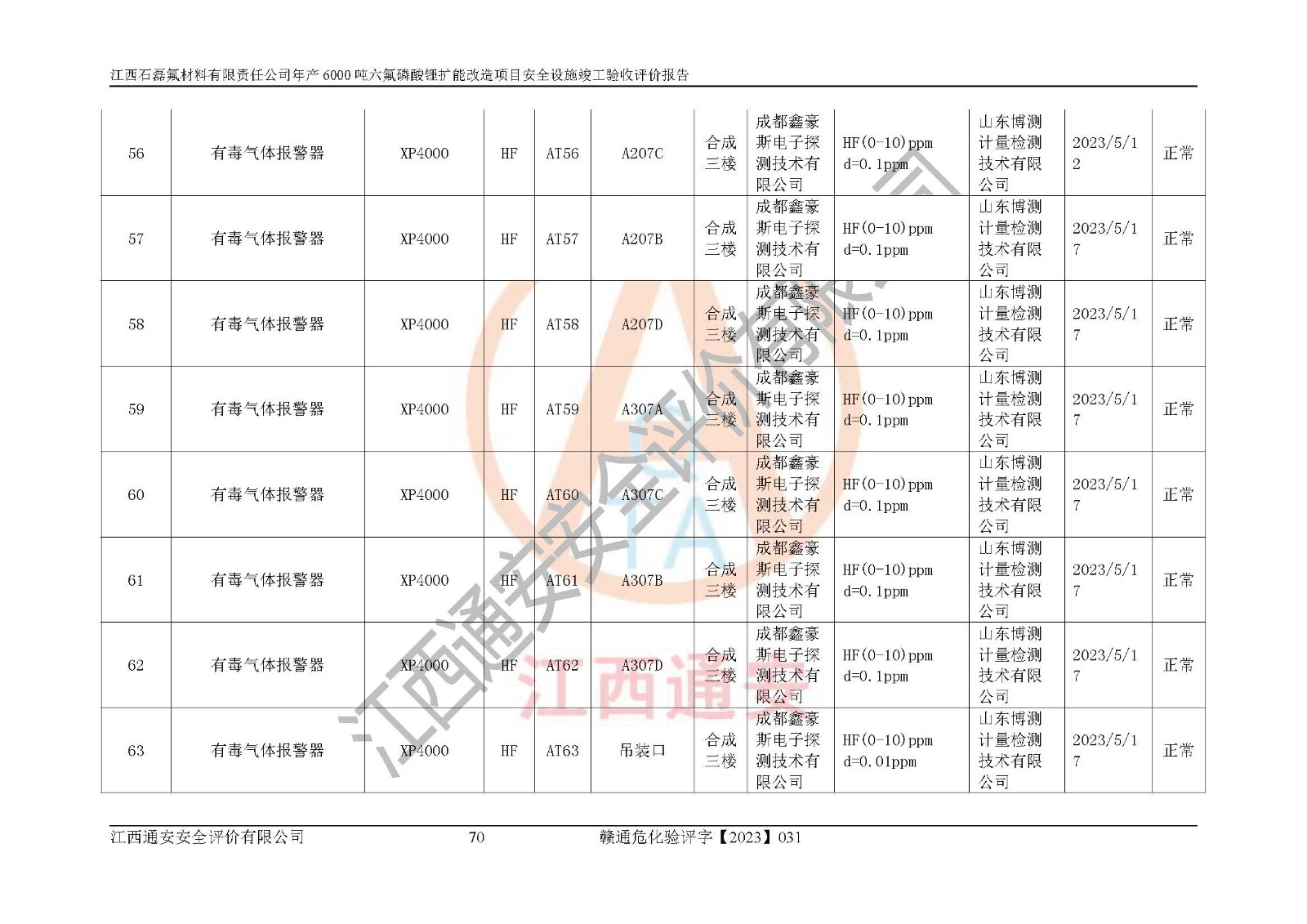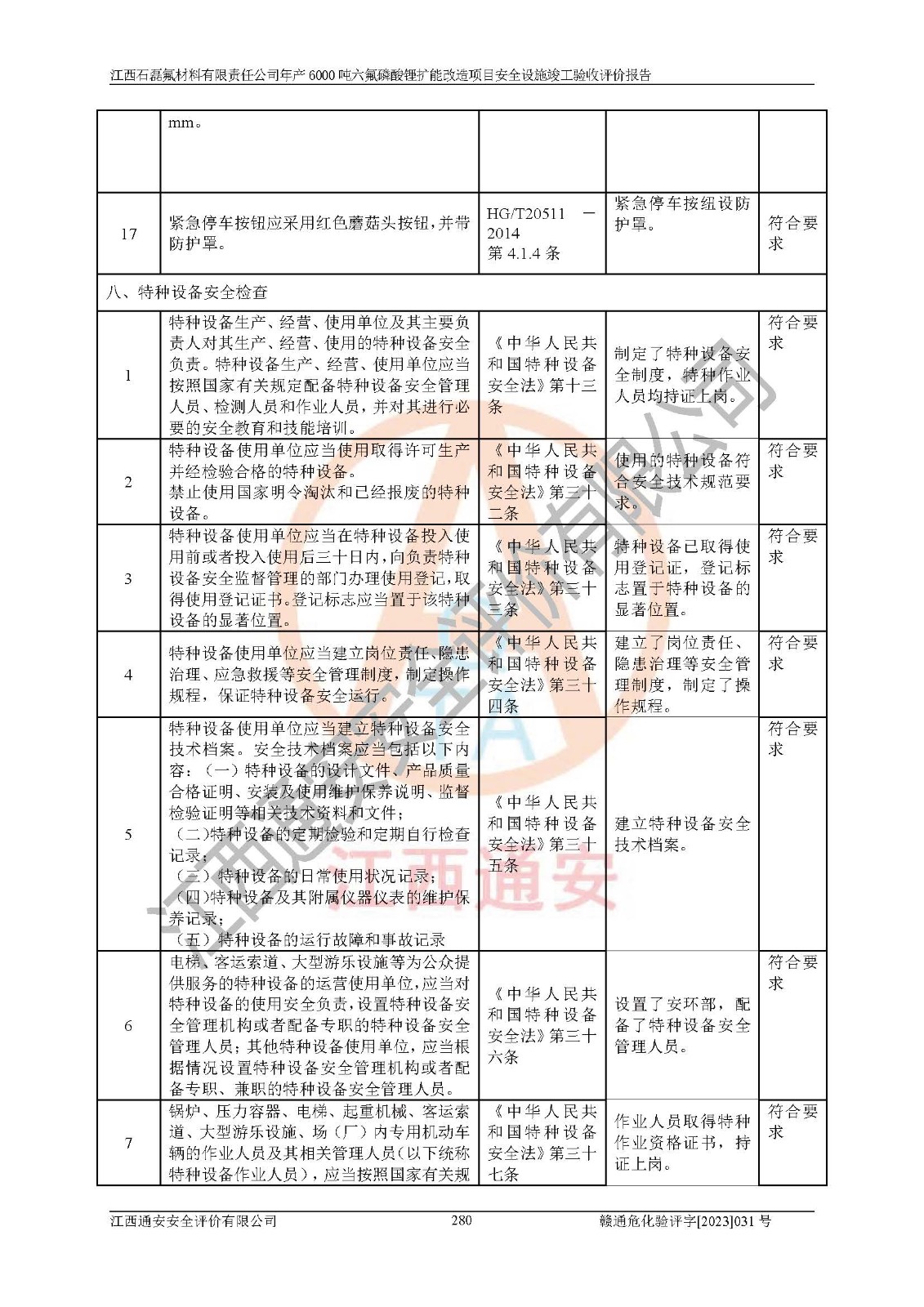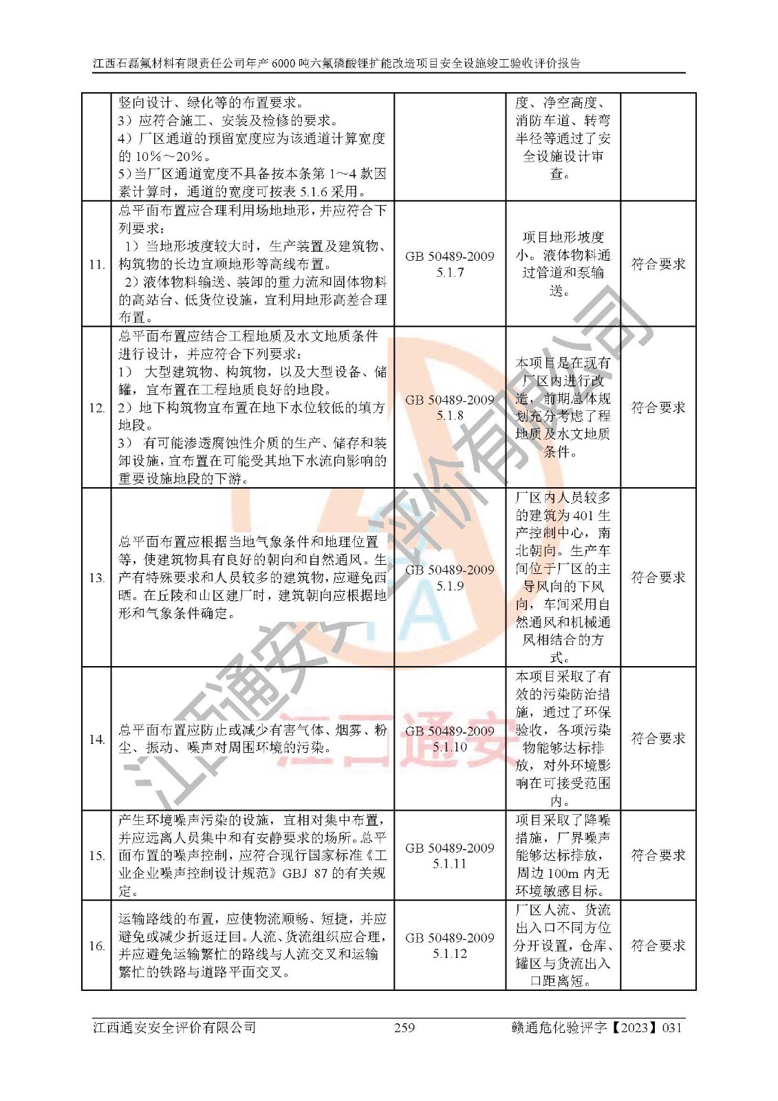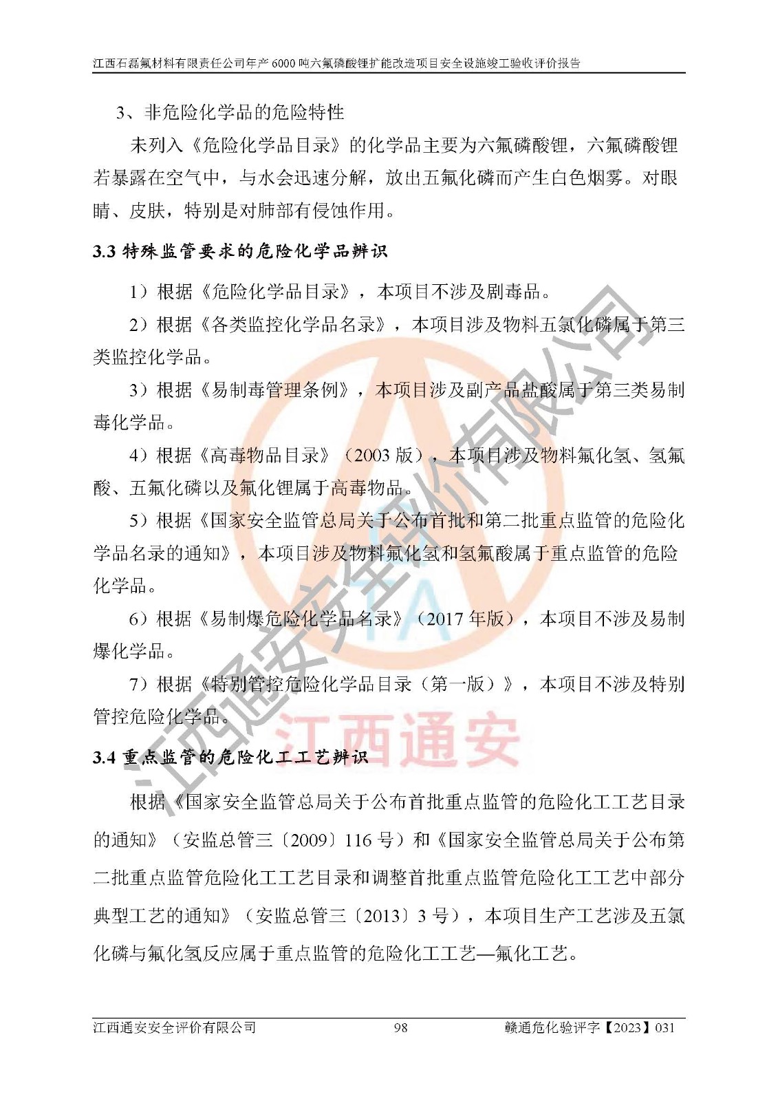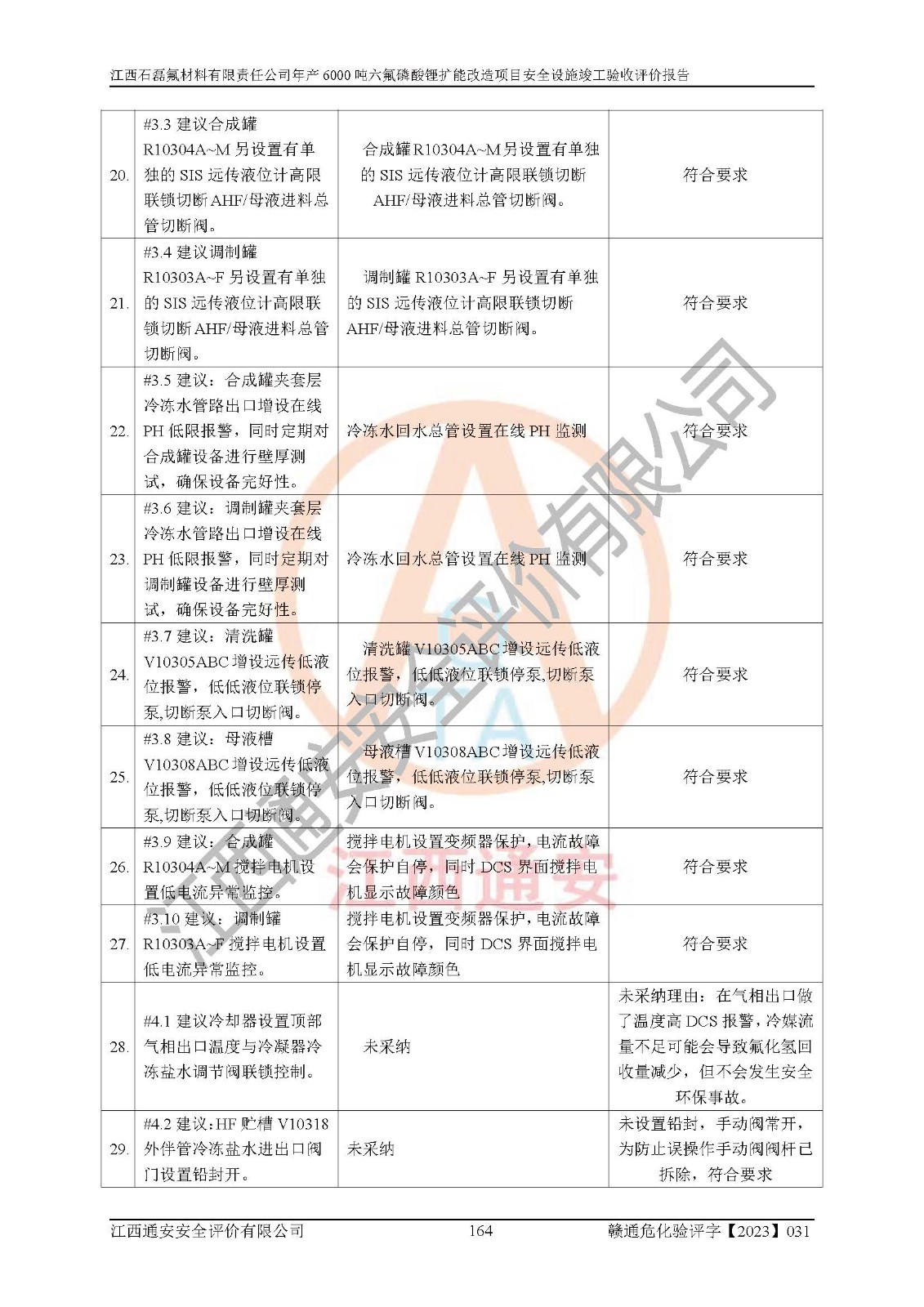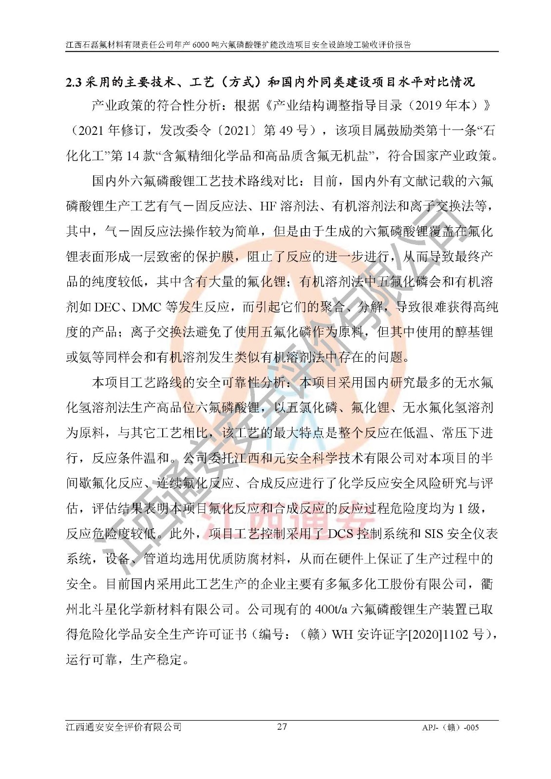 一、建设项目所在地的安全条件和与周边的安全防护距离 (1)该项目位于江西省赣州市会昌县氟盐化工产业基地,属于认定的化工园区,厂址选择合理,该项目与周边环境的防火间距符合规范的要求。 (2)重大危险源与“八类敏感场所及区域”的距离符合相关法律、法规的规定。 (3)该项目103生产车间三和201罐区一均构成**重大危险源。根据《危险化学品生产装置和储存设施外部安全防护距离确定方法》(GB/T 37243-2019)和《危险化学品生产装置和储存设施风险基准》(GB 36894-2018),该项目高敏感防护目标、重要防护目标、一般防护目标中的一类防护目标(<3×10-7)的外部安全防护距离包络线距离厂界*大值为76.36m,个人风险等值线范围内未出现该类防护目标;一般防护目标中的二类防护目标(<3×10-6)的外部安全防护距离包络线距离厂界*大值为51.62m,个人风险等值线范围内未涉及相应的防护目标;一般防护目标中的三类防护目标(<1×10-5)外部安全防护距离的包络线未出厂界。项目外部安全防护距离内无相应的防护目标,该项目不存在社会风险。 (4)该项目投产后在正常生产情况下,对其周边单位的生产、经营活动和居民的生活影响很小。在发生事故的情况下对周边单位的生产、经营活动和居民的生活存在影响。该项目周边单位的生产、经营活动和居民的生活对该项目投产后的正常生产影响很小。该项目所在地自然条件(不包括地震等破坏力**的自然灾害)的变化对该项目投产后的正常生产没有影响。 二、建设项目安全设施设计的采纳情况和已采用(取)的安全设施水平 该项目采用的主要安全设施包括了以下方面:检测、报警设施,设备安全防护设施,作业场所防护设施,安全警示标志,泄压和止逆设施,紧急处理设施,防止火灾蔓延设施,灭火设施,紧急个人处置设施,应急救援设施,劳动防护用品和装备等。 该项目在建设过程中采纳了《安全设施设计专篇》中的有关安全措施建议及要求,针对性的采取了相应的预防和控制措施,建设中未落实的安全措施,在试生产中已进行了整改。试生产表明该项目所采取的安全控制措施安全**,主要生产装置、设备运行平稳,安全可靠,安全水平较高,能够满足安全生产条件。 三、建设项目试生产(使用)后具备**现行有关安全生产法律、法规和部门规章及标准规定和要求的安全生产条件 1)法律法规等方面的符合性:该项目按照建设项目“三同时”要求,项目进行了备案、通过了安全条件审查、安全设施设计审查、试生产方案审查,立项审批手续齐全,安全设施设计、建设施工、施工监理均由有资质的单位承担,项目建设符合法律、法规规定的审批、施工、监理手续。项目建设期间,公司结合生产需要,增设了部分辅助设施和工艺管线,属于一般变更,试生产期间公司已委托河北英科石化工程有限公司进行了设计变更,作为已经审查通过的安全设施设计专篇的补充文件。 2)该项目与周边建构筑物的防火距离符合《精细化工企业工程设计防火标准》《建筑设计防火规范》的要求。根据《危险化学品生产装置和储存设施风险基准》GB36894-2018确定危险化学品单位周边重要目标和敏感场所承受的可容许个人风险和社会风险的定量风险评价。项目的个人风险计算结果表明,项目外部安全防护距离的包络线内无相应的防护目标。该软件未计算出社会风险。因此项目可容许个人风险和社会风险均在可接受范围内。 3)平面布置及常规防护设施措施的合理性:该项目生产场所、办公场所之间的间距满足安全要求,建筑结构、防火分区、防雷设施、安全出口的设置等满足安全生产的要求。消防道路的净宽度、净**、转弯半径均满足运输**及消防**通行。设置的常规防护设施、防止机械伤害、防急性中毒窒息的设施和措施符合要求。 4)设施、设备、装置及工艺方面的安全性:无**明令淘汰的工艺和 设备,该项目不涉及爆炸性危险区域划分。生产工艺操作和设置的安全设施满足安全需要,生产设施的布置能**人员疏散安全及操作方便。设施、设备、装置及工艺方面安全可靠。 5)特种设备、强制检测设备设施监督检验情况:该项目特种设备均进行了检验检测,并取得了检验报告;安全阀、压力表、有毒气体探头也进行了校验,校验结论合格,特种设备及安全附件符合《特种设备安全监察条例》 等相关法律法规、条例的规定。 6)公用工程、辅助设施的配套性:为该项目生产配套的供水、供电、 供气、供热等满足需要。 7)人员管理及安全培训方面充分性:公司现已建立了安全管理机构, 配备了专职安全管理人员。主要负责人王成具备化学工程与工艺专业本科学历,分管生产负责人曾中山具备化学工程与工艺专业本科学历,分管设备和技术负责人刘辉涛具备应用化学专业本科学历。专职安全管理人员共4人,配有一名注册安全工程师,专职安全管理人员均具有大专以上化工及安全专业相关学历。重点监管化工工艺的生产装置、储存设施操作人员具备高中及以上学历或化工类中等及以上职业教育水平。该公司制定了较完善的安全管理制度、岗位责任制、安全操作规程,制度执行情况较好。该公司已为从业职工交纳了工伤**。该公司对操作员工进行相关的培训和教育,经培训合格后上岗。 8)应急救援**性:企业根据自身实际情况,将该项目按照《生产经 营单位生产安全事故