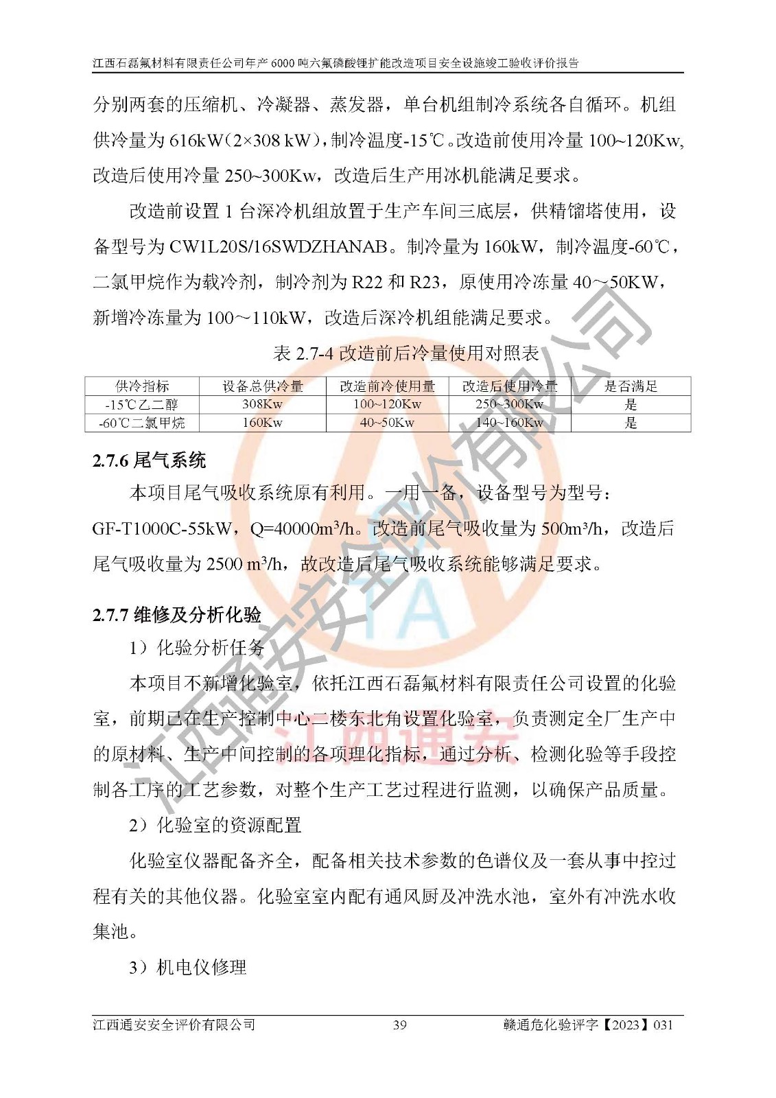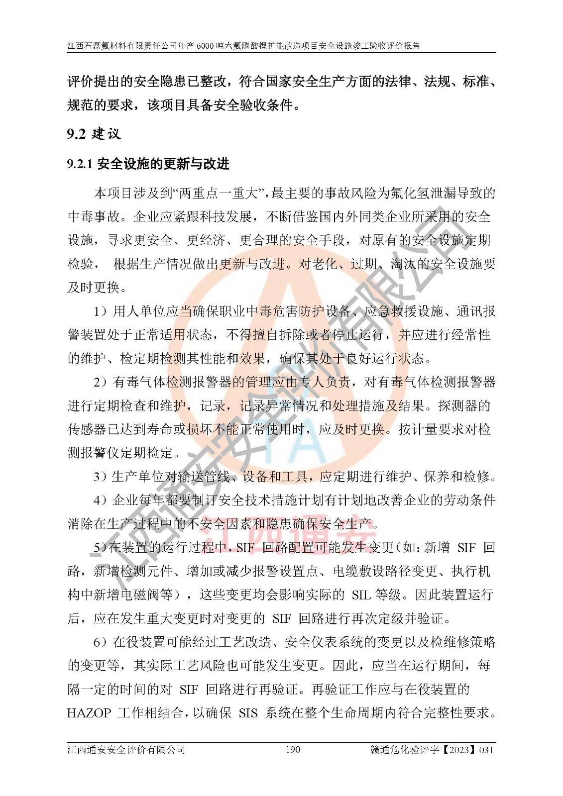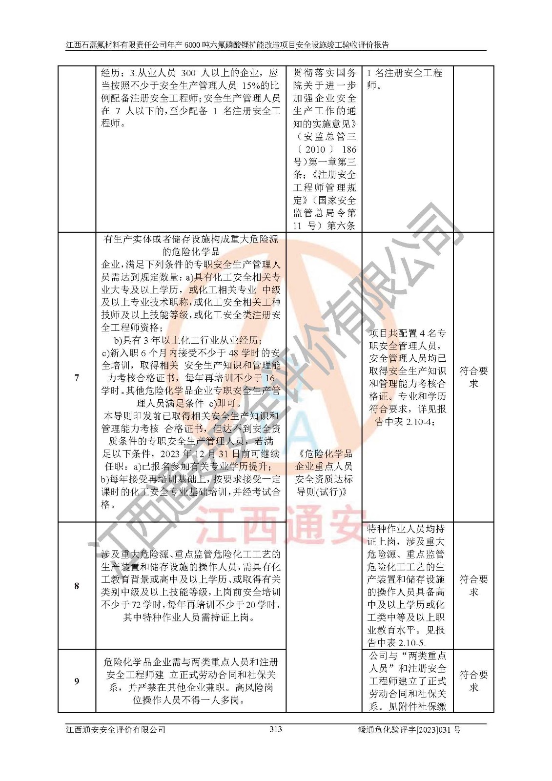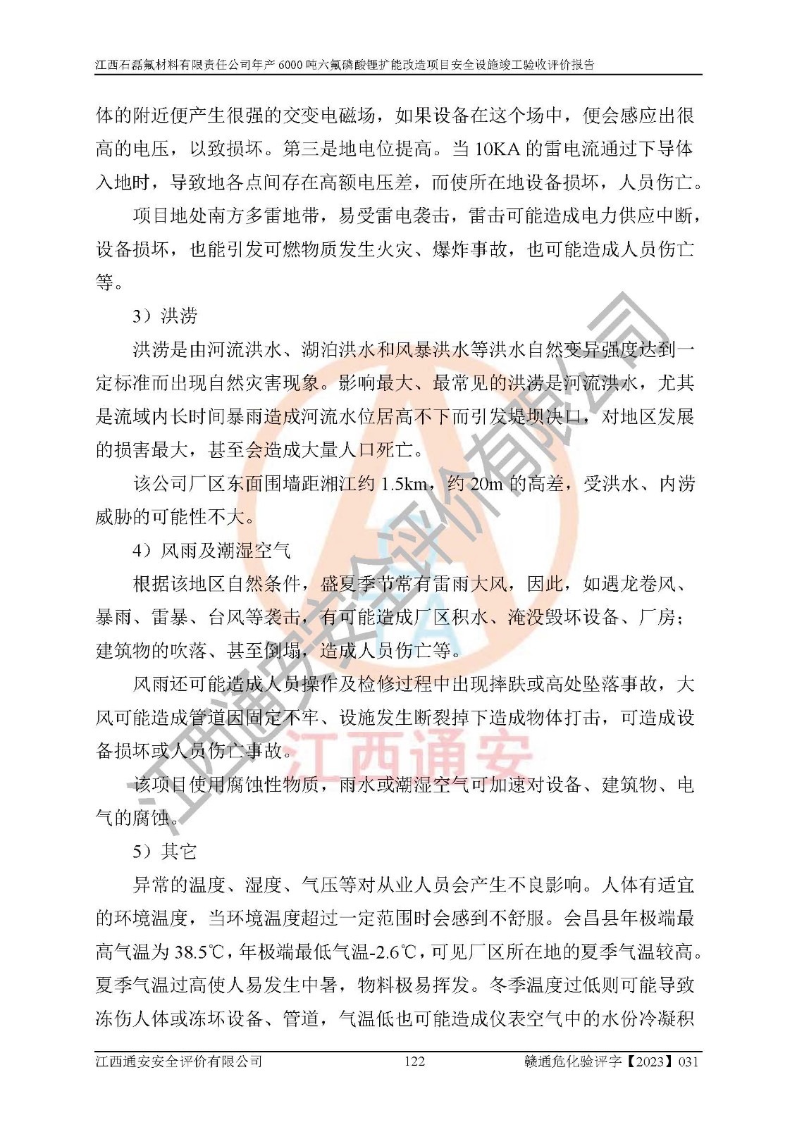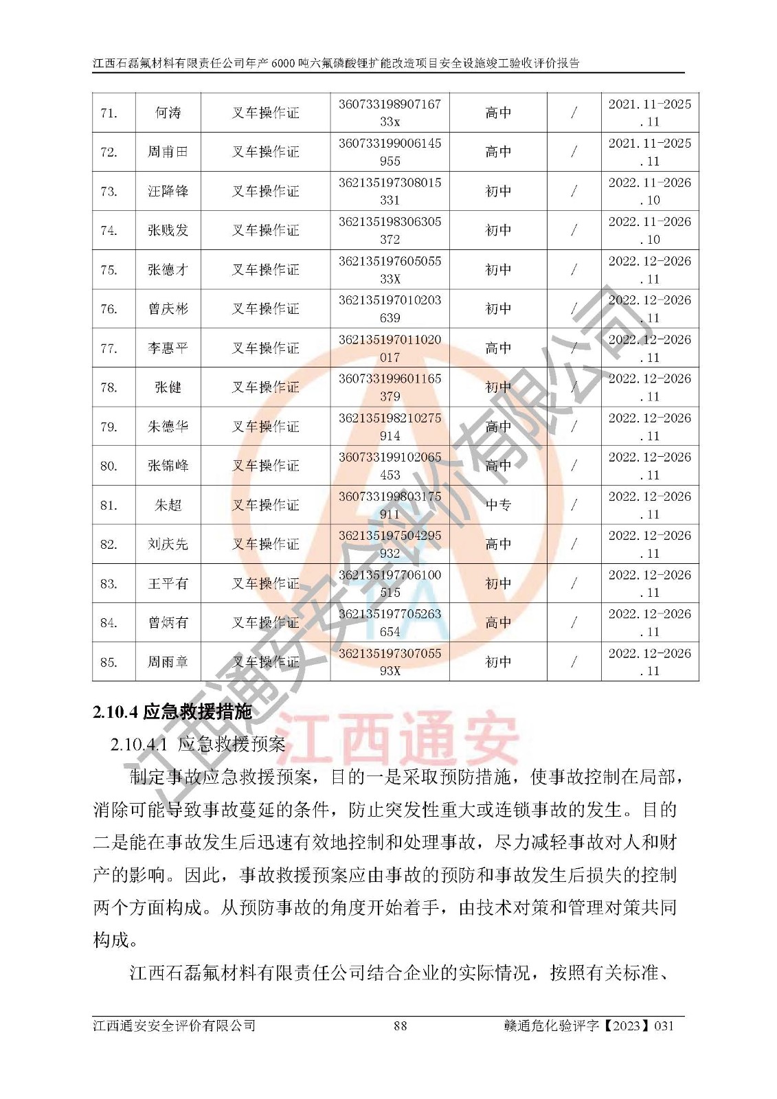 一、建设项目所在地的安全条件和与周边的安全防护距离 (1)该项目位于江西省赣州市会昌县氟盐化工产业基地,属于认定的化工园区,厂址选择合理,该项目与周边环境的防火间距符合规范的要求。 (2)重大危险源与“八类敏感场所及区域”的距离符合相关法律、法规的规定。 (3)该项目103生产车间三和201罐区一均构成**重大危险源。根据《危险化学品生产装置和储存设施外部安全防护距离确定方法》(GB/T 37243-2019)和《危险化学品生产装置和储存设施风险基准》(GB 36894-2018),该项目高敏感防护目标、重要防护目标、一般防护目标中的一类防护目标(<3×10-7)的外部安全防护距离包络线距离厂界*大值为76.36m,个人风险等值线范围内未出现该类防护目标;一般防护目标中的二类防护目标(<3×10-6)的外部安全防护距离包络线距离厂界*大值为51.62m,个人风险等值线范围内未涉及相应的防护目标;一般防护目标中的三类防护目标(<1×10-5)外部安全防护距离的包络线未出厂界。项目外部安全防护距离内无相应的防护目标,该项目不存在社会风险。 (4)该项目投产后在正常生产情况下,对其周边单位的生产、经营活动和居民的生活影响很小。在发生事故的情况下对周边单位的生产、经营活动和居民的生活存在影响。该项目周边单位的生产、经营活动和居民的生活对该项目投产后的正常生产影响很小。该项目所在地自然条件(不包括地震等破坏力**的自然灾害)的变化对该项目投产后的正常生产没有影响。 二、建设项目安全设施设计的采纳情况和已采用(取)的安全设施水平 该项目采用的主要安全设施包括了以下方面:检测、报警设施,设备安全防护设施,作业场所防护设施,安全警示标志,泄压和止逆设施,紧急处理设施,防止火灾蔓延设施,灭火设施,紧急个人处置设施,应急救援设施,劳动防护用品和装备等。 该项目在建设过程中采纳了《安全设施设计专篇》中的有关安全措施建议及要求,针对性的采取了相应的预防和控制措施,建设中未落实的安全措施,在试生产中已进行了整改。试生产表明该项目所采取的安全控制措施安全**,主要生产装置、设备运行平稳,安全可靠,安全水平较高,能够满足安全生产条件。 三、建设项目试生产(使用)后具备**现行有关安全生产法律、法规和部门规章及标准规定和要求的安全生产条件 1)法律法规等方面的符合性:该项目按照建设项目“三同时”要求,项目进行了备案、通过了安全条件审查、安全设施设计审查、试生产方案审查,立项审批手续齐全,安全设施设计、建设施工、施工监理均由有资质的单位承担,项目建设符合法律、法规规定的审批、施工、监理手续。项目建设期间,公司结合生产需要,增设了部分辅助设施和工艺管线,属于一般变更,试生产期间公司已委托河北英科石化工程有限公司进行了设计变更,作为已经审查通过的安全设施设计专篇的补充文件。 2)该项目与周边建构筑物的防火距离符合《精细化工企业工程设计防火标准》《建筑设计防火规范》的要求。根据《危险化学品生产装置和储存设施风险基准》GB36894-2018确定危险化学品单位周边重要目标和敏感场所承受的可容许个人风险和社会风险的定量风险评价。项目的个人风险计算结果表明,项目外部安全防护距离的包络线内无相应的防护目标。该软件未计算出社会风险。因此项目可容许个人风险和社会风险均在可接受范围内。 3)平面布置及常规防护设施措施的合理性:该项目生产场所、办公场所之间的间距满足安全要求,建筑结构、防火分区、防雷设施、安全出口的设置等满足安全生产的要求。消防道路的净宽度、净**、转弯半径均满足运输**及消防**通行。设置的常规防护设施、防止机械伤害、防急性中毒窒息的设施和措施符合要求。 4)设施、设备、装置及工艺方面的安全性:无**明令淘汰的工艺和 设备,该项目不涉及爆炸性危险区域划分。生产工艺操作和设置的安全设施满足安全需要,生产设施的布置能**人员疏散安全及操作方便。设施、设备、装置及工艺方面安全可靠。 5)特种设备、强制检测设备设施监督检验情况:该项目特种设备均进行了检验检测,并取得了检验报告;安全阀、压力表、有毒气体探头也进行了校验,校验结论合格,特种设备及安全附件符合《特种设备安全监察条例》 等相关法律法规、条例的规定。 6)公用工程、辅助设施的配套性:为该项目生产配套的供水、供电、 供气、供热等满足需要。 7)人员管理及安全培训方面充分性:公司现已建立了安全管理机构, 配备了专职安全管理人员。主要负责人王成具备化学工程与工艺专业本科学历,分管生产负责人曾中山具备化学工程与工艺专业本科学历,分管设备和技术负责人刘辉涛具备应用化学专业本科学历。专职安全管理人员共4人,配有一名注册安全工程师,专职安全管理人员均具有大专以上化工及安全专业相关学历。重点监管化工工艺的生产装置、储存设施操作人员具备高中及以上学历或化工类中等及以上职业教育水平。该公司制定了较完善的安全管理制度、岗位责任制、安全操作规程,制度执行情况较好。该公司已为从业职工交纳了工伤**。该公司对操作员工进行相关的培训和教育,经培训合格后上岗。 8)应急救援**性:企业根据自身实际情况,将该项目按照《生产经 营单位生产安全事故