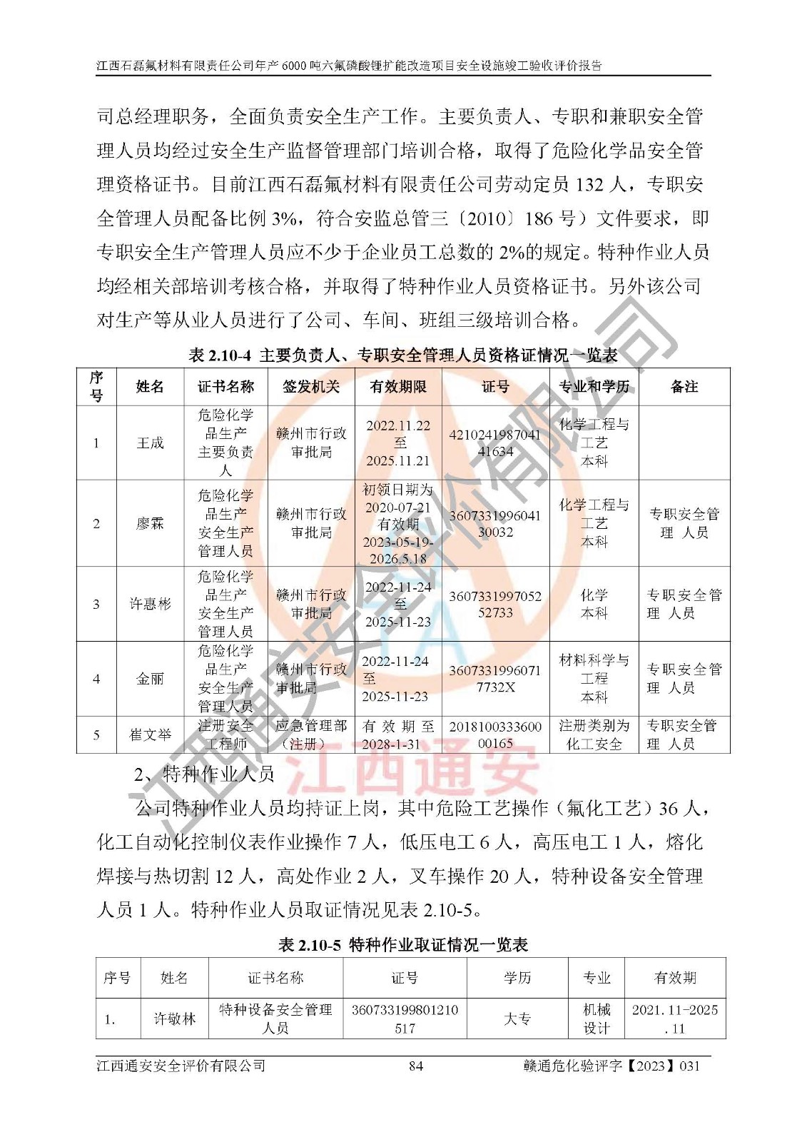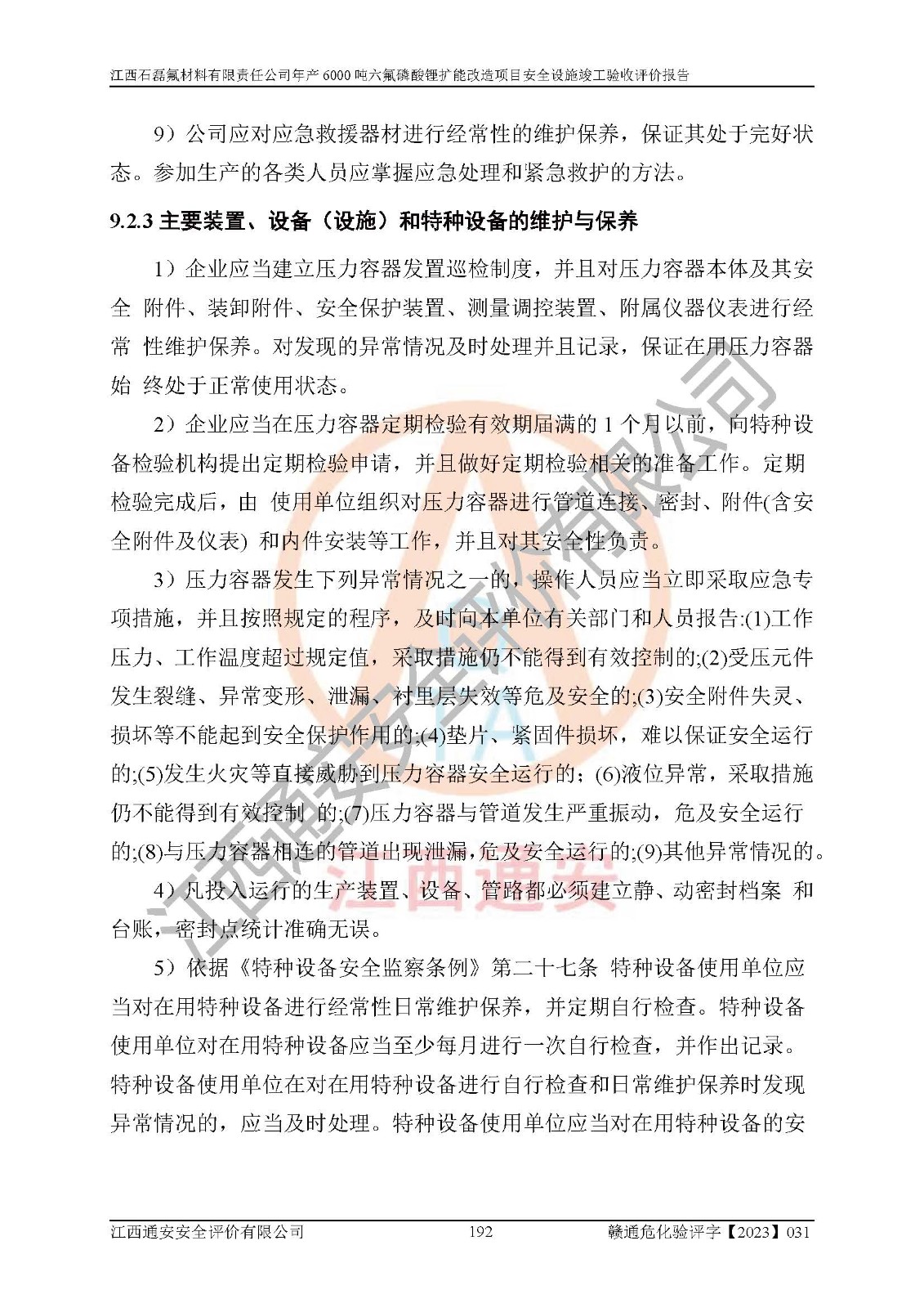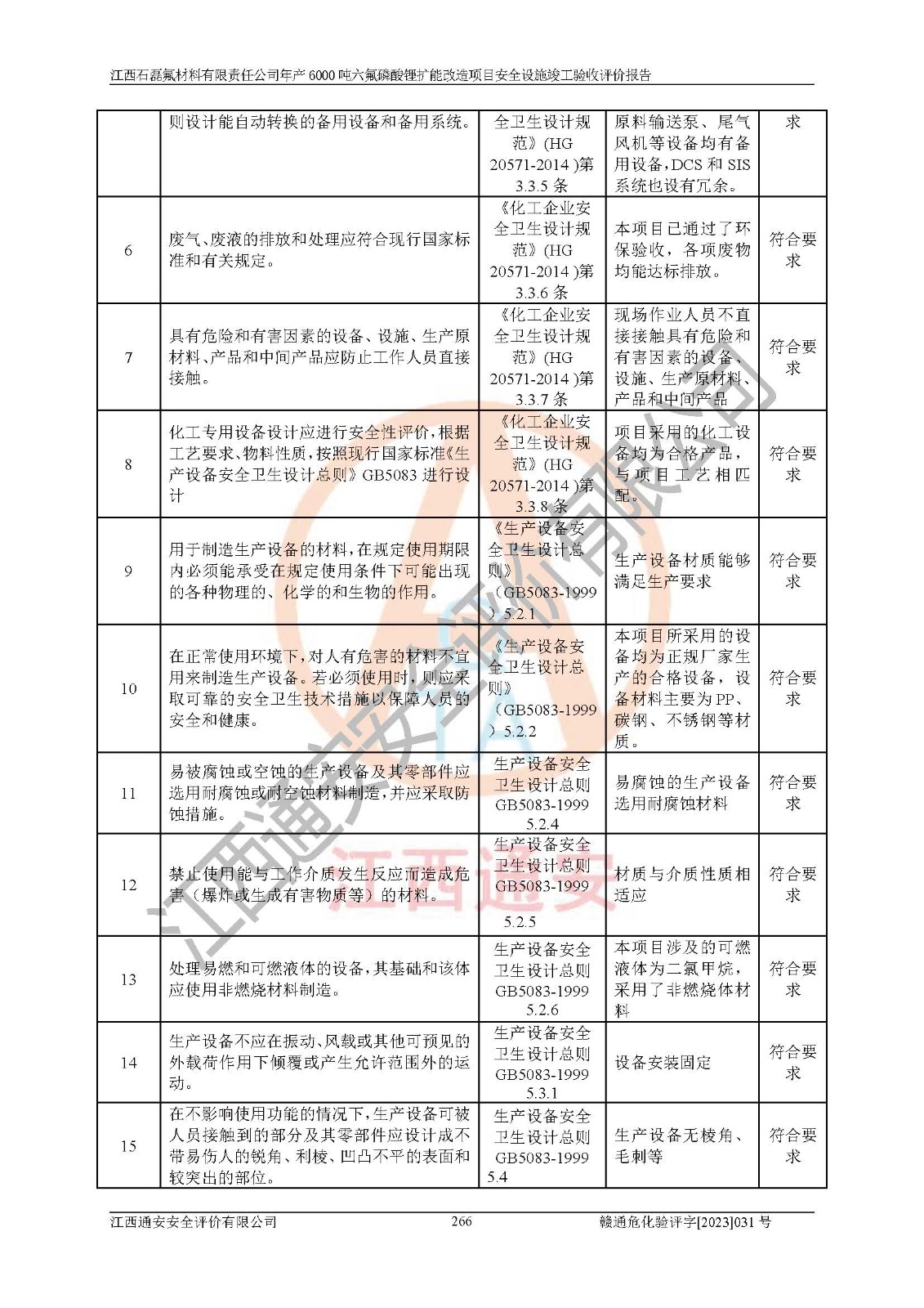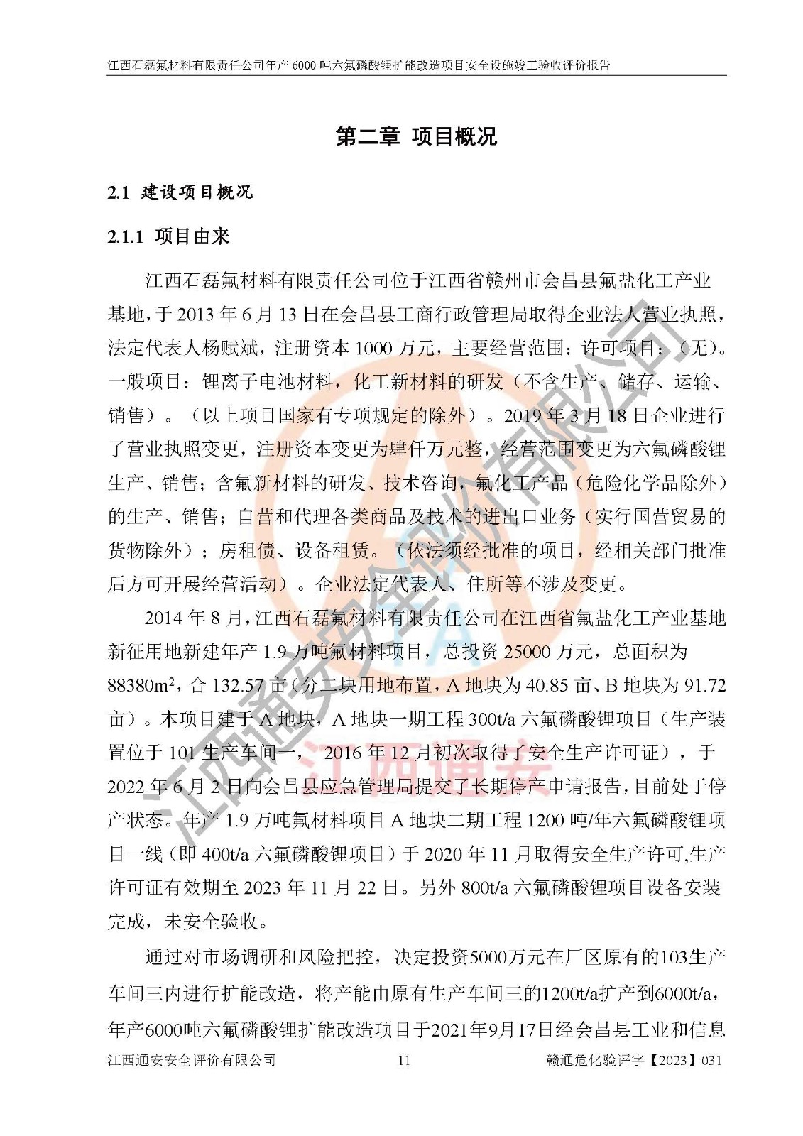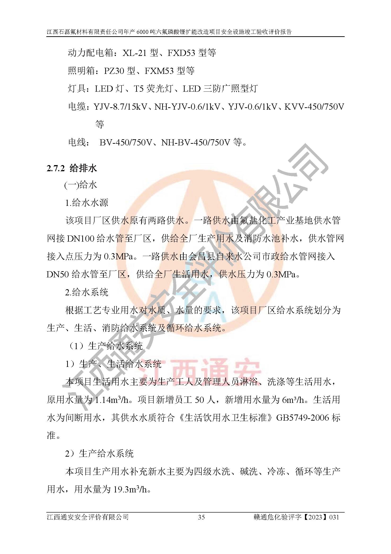 一、建设项目所在地的安全条件和与周边的安全防护距离 (1)该项目位于江西省赣州市会昌县氟盐化工产业基地,属于认定的化工园区,厂址选择合理,该项目与周边环境的防火间距符合规范的要求。 (2)重大危险源与“八类敏感场所及区域”的距离符合相关法律、法规的规定。 (3)该项目103生产车间三和201罐区一均构成**重大危险源。根据《危险化学品生产装置和储存设施外部安全防护距离确定方法》(GB/T 37243-2019)和《危险化学品生产装置和储存设施风险基准》(GB 36894-2018),该项目高敏感防护目标、重要防护目标、一般防护目标中的一类防护目标(<3×10-7)的外部安全防护距离包络线距离厂界*大值为76.36m,个人风险等值线范围内未出现该类防护目标;一般防护目标中的二类防护目标(<3×10-6)的外部安全防护距离包络线距离厂界*大值为51.62m,个人风险等值线范围内未涉及相应的防护目标;一般防护目标中的三类防护目标(<1×10-5)外部安全防护距离的包络线未出厂界。项目外部安全防护距离内无相应的防护目标,该项目不存在社会风险。 (4)该项目投产后在正常生产情况下,对其周边单位的生产、经营活动和居民的生活影响很小。在发生事故的情况下对周边单位的生产、经营活动和居民的生活存在影响。该项目周边单位的生产、经营活动和居民的生活对该项目投产后的正常生产影响很小。该项目所在地自然条件(不包括地震等破坏力**的自然灾害)的变化对该项目投产后的正常生产没有影响。 二、建设项目安全设施设计的采纳情况和已采用(取)的安全设施水平 该项目采用的主要安全设施包括了以下方面:检测、报警设施,设备安全防护设施,作业场所防护设施,安全警示标志,泄压和止逆设施,紧急处理设施,防止火灾蔓延设施,灭火设施,紧急个人处置设施,应急救援设施,劳动防护用品和装备等。 该项目在建设过程中采纳了《安全设施设计专篇》中的有关安全措施建议及要求,针对性的采取了相应的预防和控制措施,建设中未落实的安全措施,在试生产中已进行了整改。试生产表明该项目所采取的安全控制措施安全**,主要生产装置、设备运行平稳,安全可靠,安全水平较高,能够满足安全生产条件。 三、建设项目试生产(使用)后具备**现行有关安全生产法律、法规和部门规章及标准规定和要求的安全生产条件 1)法律法规等方面的符合性:该项目按照建设项目“三同时”要求,项目进行了备案、通过了安全条件审查、安全设施设计审查、试生产方案审查,立项审批手续齐全,安全设施设计、建设施工、施工监理均由有资质的单位承担,项目建设符合法律、法规规定的审批、施工、监理手续。项目建设期间,公司结合生产需要,增设了部分辅助设施和工艺管线,属于一般变更,试生产期间公司已委托河北英科石化工程有限公司进行了设计变更,作为已经审查通过的安全设施设计专篇的补充文件。 2)该项目与周边建构筑物的防火距离符合《精细化工企业工程设计防火标准》《建筑设计防火规范》的要求。根据《危险化学品生产装置和储存设施风险基准》GB36894-2018确定危险化学品单位周边重要目标和敏感场所承受的可容许个人风险和社会风险的定量风险评价。项目的个人风险计算结果表明,项目外部安全防护距离的包络线内无相应的防护目标。该软件未计算出社会风险。因此项目可容许个人风险和社会风险均在可接受范围内。 3)平面布置及常规防护设施措施的合理性:该项目生产场所、办公场所之间的间距满足安全要求,建筑结构、防火分区、防雷设施、安全出口的设置等满足安全生产的要求。消防道路的净宽度、净**、转弯半径均满足运输**及消防**通行。设置的常规防护设施、防止机械伤害、防急性中毒窒息的设施和措施符合要求。 4)设施、设备、装置及工艺方面的安全性:无**明令淘汰的工艺和 设备,该项目不涉及爆炸性危险区域划分。生产工艺操作和设置的安全设施满足安全需要,生产设施的布置能**人员疏散安全及操作方便。设施、设备、装置及工艺方面安全可靠。 5)特种设备、强制检测设备设施监督检验情况:该项目特种设备均进行了检验检测,并取得了检验报告;安全阀、压力表、有毒气体探头也进行了校验,校验结论合格,特种设备及安全附件符合《特种设备安全监察条例》 等相关法律法规、条例的规定。 6)公用工程、辅助设施的配套性:为该项目生产配套的供水、供电、 供气、供热等满足需要。 7)人员管理及安全培训方面充分性:公司现已建立了安全管理机构, 配备了专职安全管理人员。主要负责人王成具备化学工程与工艺专业本科学历,分管生产负责人曾中山具备化学工程与工艺专业本科学历,分管设备和技术负责人刘辉涛具备应用化学专业本科学历。专职安全管理人员共4人,配有一名注册安全工程师,专职安全管理人员均具有大专以上化工及安全专业相关学历。重点监管化工工艺的生产装置、储存设施操作人员具备高中及以上学历或化工类中等及以上职业教育水平。该公司制定了较完善的安全管理制度、岗位责任制、安全操作规程,制度执行情况较好。该公司已为从业职工交纳了工伤**。该公司对操作员工进行相关的培训和教育,经培训合格后上岗。 8)应急救援**性:企业根据自身实际情况,将该项目按照《生产经 营单位生产安全事故