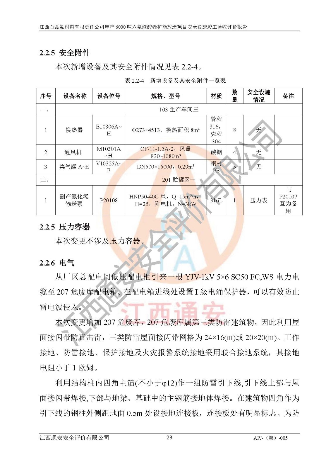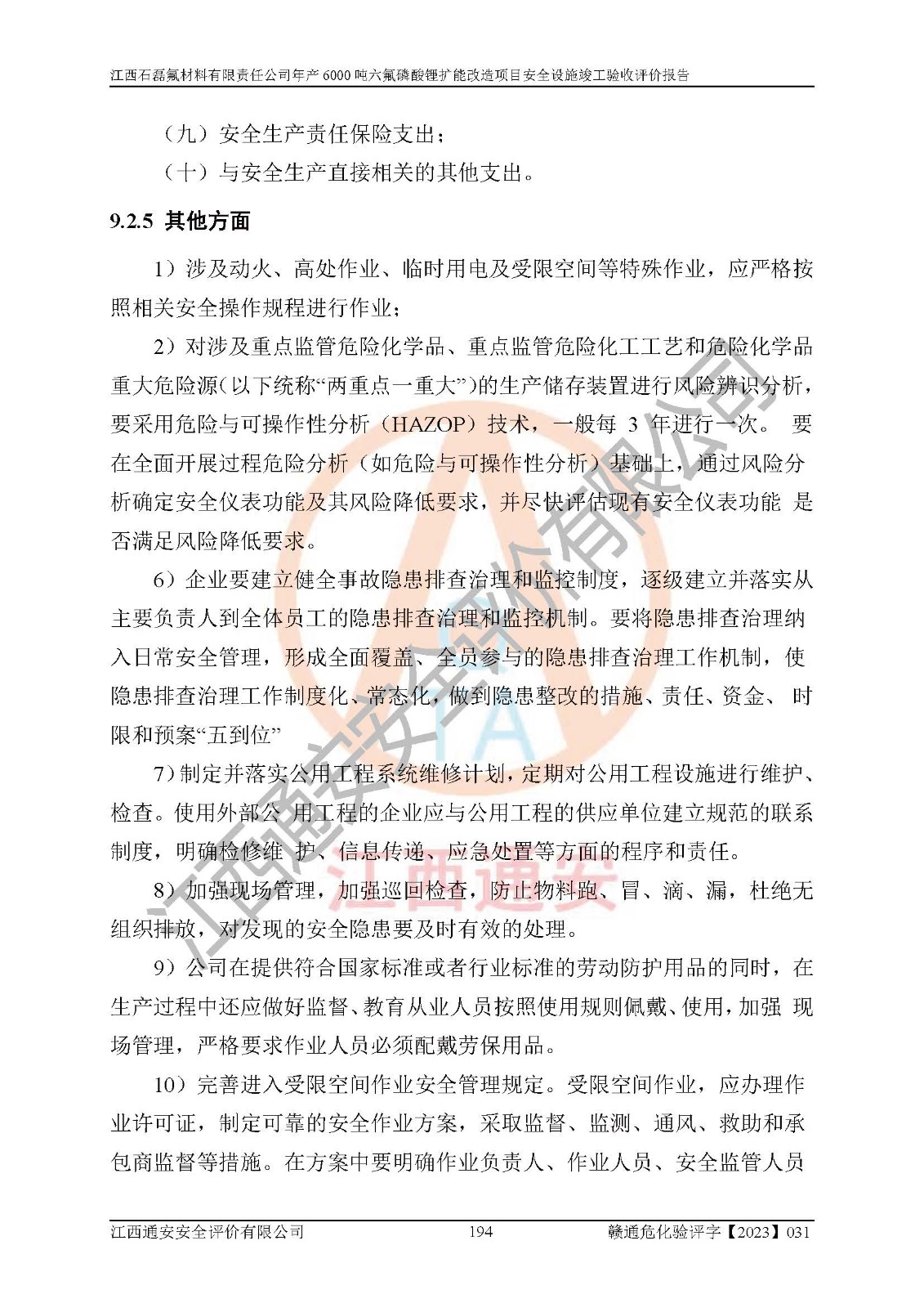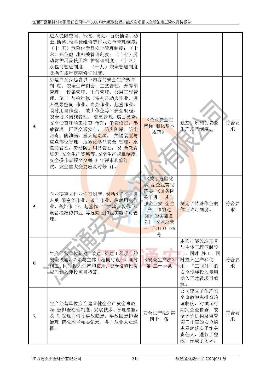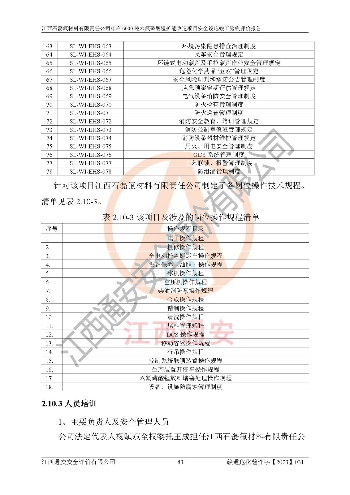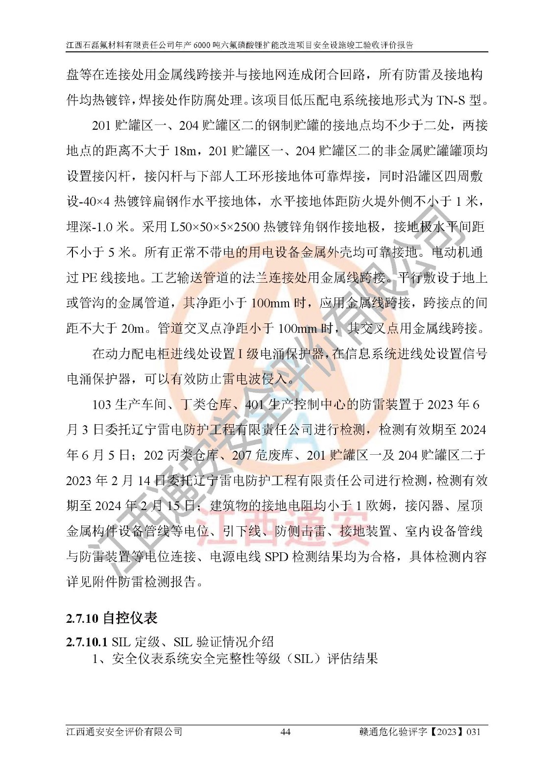 一、建设项目所在地的安全条件和与周边的安全防护距离 (1)该项目位于江西省赣州市会昌县氟盐化工产业基地,属于认定的化工园区,厂址选择合理,该项目与周边环境的防火间距符合规范的要求。 (2)重大危险源与“八类敏感场所及区域”的距离符合相关法律、法规的规定。 (3)该项目103生产车间三和201罐区一均构成**重大危险源。根据《危险化学品生产装置和储存设施外部安全防护距离确定方法》(GB/T 37243-2019)和《危险化学品生产装置和储存设施风险基准》(GB 36894-2018),该项目高敏感防护目标、重要防护目标、一般防护目标中的一类防护目标(<3×10-7)的外部安全防护距离包络线距离厂界*大值为76.36m,个人风险等值线范围内未出现该类防护目标;一般防护目标中的二类防护目标(<3×10-6)的外部安全防护距离包络线距离厂界*大值为51.62m,个人风险等值线范围内未涉及相应的防护目标;一般防护目标中的三类防护目标(<1×10-5)外部安全防护距离的包络线未出厂界。项目外部安全防护距离内无相应的防护目标,该项目不存在社会风险。 (4)该项目投产后在正常生产情况下,对其周边单位的生产、经营活动和居民的生活影响很小。在发生事故的情况下对周边单位的生产、经营活动和居民的生活存在影响。该项目周边单位的生产、经营活动和居民的生活对该项目投产后的正常生产影响很小。该项目所在地自然条件(不包括地震等破坏力**的自然灾害)的变化对该项目投产后的正常生产没有影响。 二、建设项目安全设施设计的采纳情况和已采用(取)的安全设施水平 该项目采用的主要安全设施包括了以下方面:检测、报警设施,设备安全防护设施,作业场所防护设施,安全警示标志,泄压和止逆设施,紧急处理设施,防止火灾蔓延设施,灭火设施,紧急个人处置设施,应急救援设施,劳动防护用品和装备等。 该项目在建设过程中采纳了《安全设施设计专篇》中的有关安全措施建议及要求,针对性的采取了相应的预防和控制措施,建设中未落实的安全措施,在试生产中已进行了整改。试生产表明该项目所采取的安全控制措施安全**,主要生产装置、设备运行平稳,安全可靠,安全水平较高,能够满足安全生产条件。 三、建设项目试生产(使用)后具备**现行有关安全生产法律、法规和部门规章及标准规定和要求的安全生产条件 1)法律法规等方面的符合性:该项目按照建设项目“三同时”要求,项目进行了备案、通过了安全条件审查、安全设施设计审查、试生产方案审查,立项审批手续齐全,安全设施设计、建设施工、施工监理均由有资质的单位承担,项目建设符合法律、法规规定的审批、施工、监理手续。项目建设期间,公司结合生产需要,增设了部分辅助设施和工艺管线,属于一般变更,试生产期间公司已委托河北英科石化工程有限公司进行了设计变更,作为已经审查通过的安全设施设计专篇的补充文件。 2)该项目与周边建构筑物的防火距离符合《精细化工企业工程设计防火标准》《建筑设计防火规范》的要求。根据《危险化学品生产装置和储存设施风险基准》GB36894-2018确定危险化学品单位周边重要目标和敏感场所承受的可容许个人风险和社会风险的定量风险评价。项目的个人风险计算结果表明,项目外部安全防护距离的包络线内无相应的防护目标。该软件未计算出社会风险。因此项目可容许个人风险和社会风险均在可接受范围内。 3)平面布置及常规防护设施措施的合理性:该项目生产场所、办公场所之间的间距满足安全要求,建筑结构、防火分区、防雷设施、安全出口的设置等满足安全生产的要求。消防道路的净宽度、净**、转弯半径均满足运输**及消防**通行。设置的常规防护设施、防止机械伤害、防急性中毒窒息的设施和措施符合要求。 4)设施、设备、装置及工艺方面的安全性:无**明令淘汰的工艺和 设备,该项目不涉及爆炸性危险区域划分。生产工艺操作和设置的安全设施满足安全需要,生产设施的布置能**人员疏散安全及操作方便。设施、设备、装置及工艺方面安全可靠。 5)特种设备、强制检测设备设施监督检验情况:该项目特种设备均进行了检验检测,并取得了检验报告;安全阀、压力表、有毒气体探头也进行了校验,校验结论合格,特种设备及安全附件符合《特种设备安全监察条例》 等相关法律法规、条例的规定。 6)公用工程、辅助设施的配套性:为该项目生产配套的供水、供电、 供气、供热等满足需要。 7)人员管理及安全培训方面充分性:公司现已建立了安全管理机构, 配备了专职安全管理人员。主要负责人王成具备化学工程与工艺专业本科学历,分管生产负责人曾中山具备化学工程与工艺专业本科学历,分管设备和技术负责人刘辉涛具备应用化学专业本科学历。专职安全管理人员共4人,配有一名注册安全工程师,专职安全管理人员均具有大专以上化工及安全专业相关学历。重点监管化工工艺的生产装置、储存设施操作人员具备高中及以上学历或化工类中等及以上职业教育水平。该公司制定了较完善的安全管理制度、岗位责任制、安全操作规程,制度执行情况较好。该公司已为从业职工交纳了工伤**。该公司对操作员工进行相关的培训和教育,经培训合格后上岗。 8)应急救援**性:企业根据自身实际情况,将该项目按照《生产经 营单位生产安全事故
