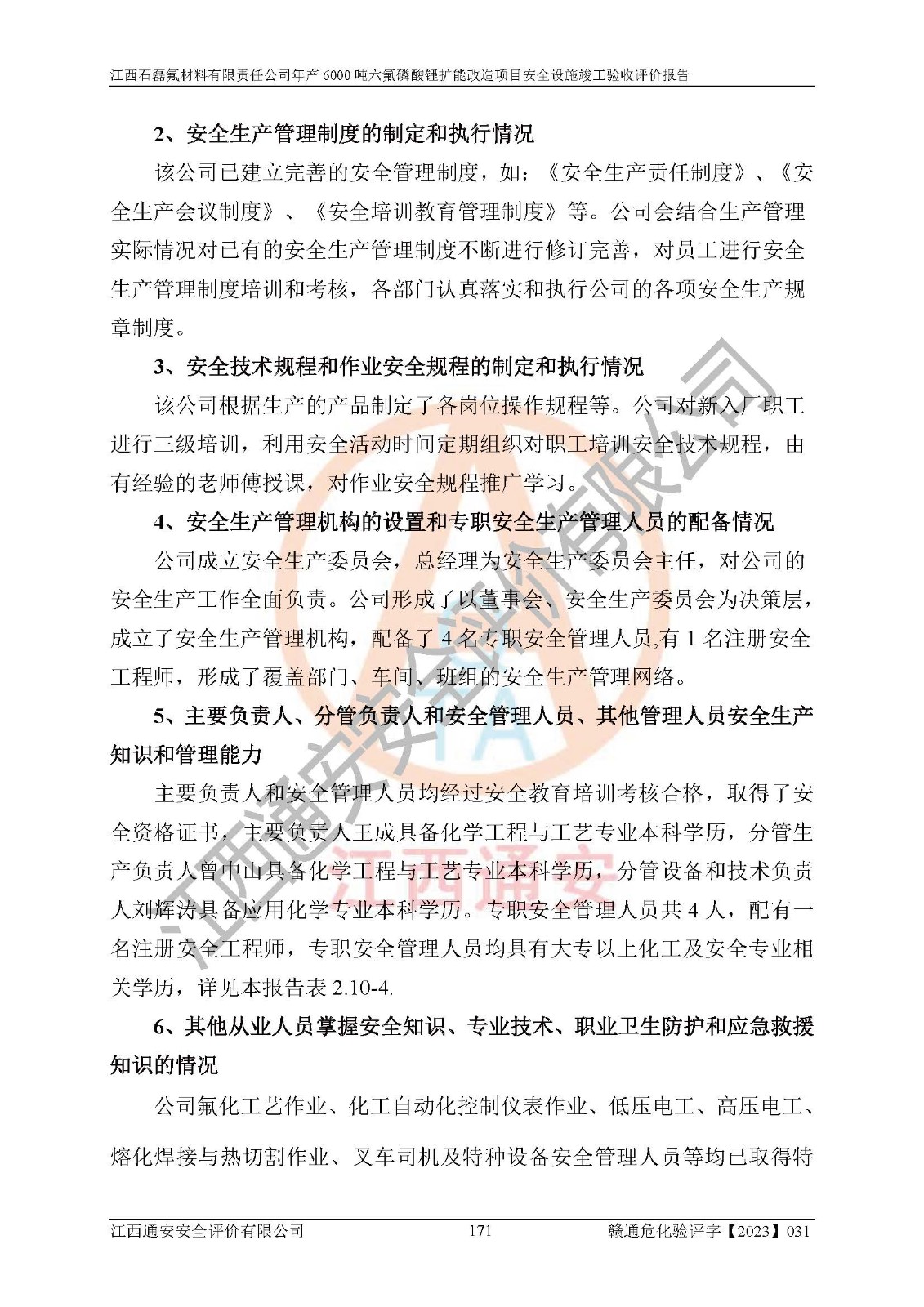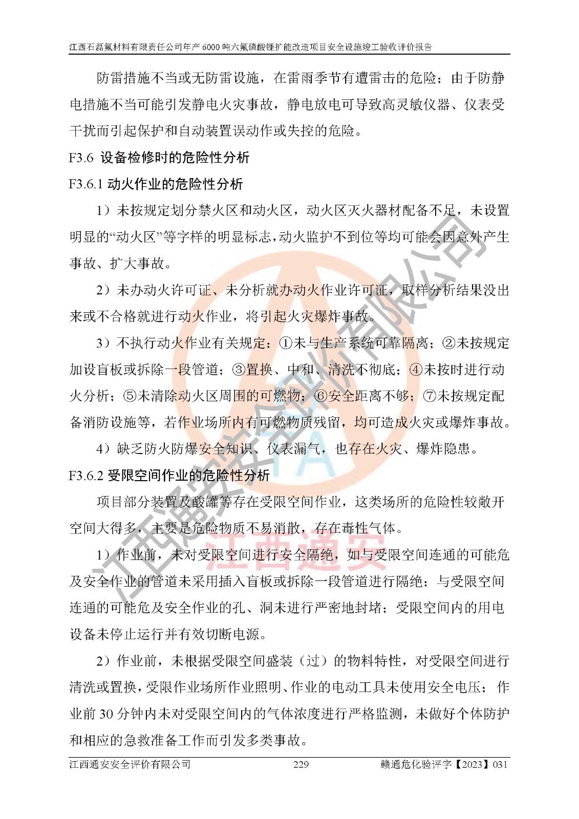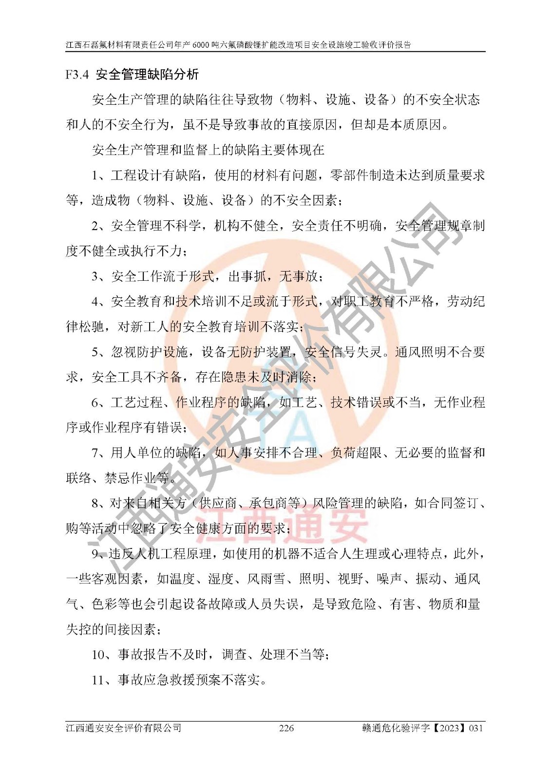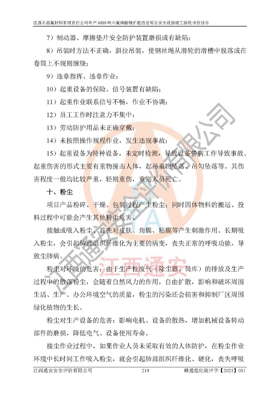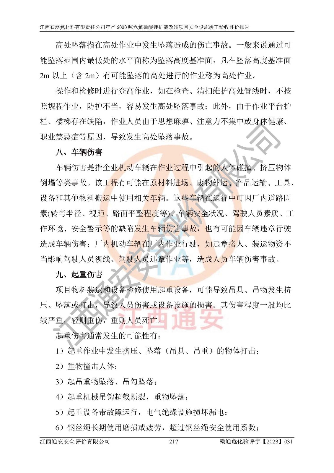 一、建设项目所在地的安全条件和与周边的安全防护距离 (1)该项目位于江西省赣州市会昌县氟盐化工产业基地,属于认定的化工园区,厂址选择合理,该项目与周边环境的防火间距符合规范的要求。 (2)重大危险源与“八类敏感场所及区域”的距离符合相关法律、法规的规定。 (3)该项目103生产车间三和201罐区一均构成**重大危险源。根据《危险化学品生产装置和储存设施外部安全防护距离确定方法》(GB/T 37243-2019)和《危险化学品生产装置和储存设施风险基准》(GB 36894-2018),该项目高敏感防护目标、重要防护目标、一般防护目标中的一类防护目标(<3×10-7)的外部安全防护距离包络线距离厂界*大值为76.36m,个人风险等值线范围内未出现该类防护目标;一般防护目标中的二类防护目标(<3×10-6)的外部安全防护距离包络线距离厂界*大值为51.62m,个人风险等值线范围内未涉及相应的防护目标;一般防护目标中的三类防护目标(<1×10-5)外部安全防护距离的包络线未出厂界。项目外部安全防护距离内无相应的防护目标,该项目不存在社会风险。 (4)该项目投产后在正常生产情况下,对其周边单位的生产、经营活动和居民的生活影响很小。在发生事故的情况下对周边单位的生产、经营活动和居民的生活存在影响。该项目周边单位的生产、经营活动和居民的生活对该项目投产后的正常生产影响很小。该项目所在地自然条件(不包括地震等破坏力**的自然灾害)的变化对该项目投产后的正常生产没有影响。 二、建设项目安全设施设计的采纳情况和已采用(取)的安全设施水平 该项目采用的主要安全设施包括了以下方面:检测、报警设施,设备安全防护设施,作业场所防护设施,安全警示标志,泄压和止逆设施,紧急处理设施,防止火灾蔓延设施,灭火设施,紧急个人处置设施,应急救援设施,劳动防护用品和装备等。 该项目在建设过程中采纳了《安全设施设计专篇》中的有关安全措施建议及要求,针对性的采取了相应的预防和控制措施,建设中未落实的安全措施,在试生产中已进行了整改。试生产表明该项目所采取的安全控制措施安全**,主要生产装置、设备运行平稳,安全可靠,安全水平较高,能够满足安全生产条件。 三、建设项目试生产(使用)后具备**现行有关安全生产法律、法规和部门规章及标准规定和要求的安全生产条件 1)法律法规等方面的符合性:该项目按照建设项目“三同时”要求,项目进行了备案、通过了安全条件审查、安全设施设计审查、试生产方案审查,立项审批手续齐全,安全设施设计、建设施工、施工监理均由有资质的单位承担,项目建设符合法律、法规规定的审批、施工、监理手续。项目建设期间,公司结合生产需要,增设了部分辅助设施和工艺管线,属于一般变更,试生产期间公司已委托河北英科石化工程有限公司进行了设计变更,作为已经审查通过的安全设施设计专篇的补充文件。 2)该项目与周边建构筑物的防火距离符合《精细化工企业工程设计防火标准》《建筑设计防火规范》的要求。根据《危险化学品生产装置和储存设施风险基准》GB36894-2018确定危险化学品单位周边重要目标和敏感场所承受的可容许个人风险和社会风险的定量风险评价。项目的个人风险计算结果表明,项目外部安全防护距离的包络线内无相应的防护目标。该软件未计算出社会风险。因此项目可容许个人风险和社会风险均在可接受范围内。 3)平面布置及常规防护设施措施的合理性:该项目生产场所、办公场所之间的间距满足安全要求,建筑结构、防火分区、防雷设施、安全出口的设置等满足安全生产的要求。消防道路的净宽度、净**、转弯半径均满足运输**及消防**通行。设置的常规防护设施、防止机械伤害、防急性中毒窒息的设施和措施符合要求。 4)设施、设备、装置及工艺方面的安全性:无**明令淘汰的工艺和 设备,该项目不涉及爆炸性危险区域划分。生产工艺操作和设置的安全设施满足安全需要,生产设施的布置能**人员疏散安全及操作方便。设施、设备、装置及工艺方面安全可靠。 5)特种设备、强制检测设备设施监督检验情况:该项目特种设备均进行了检验检测,并取得了检验报告;安全阀、压力表、有毒气体探头也进行了校验,校验结论合格,特种设备及安全附件符合《特种设备安全监察条例》 等相关法律法规、条例的规定。 6)公用工程、辅助设施的配套性:为该项目生产配套的供水、供电、 供气、供热等满足需要。 7)人员管理及安全培训方面充分性:公司现已建立了安全管理机构, 配备了专职安全管理人员。主要负责人王成具备化学工程与工艺专业本科学历,分管生产负责人曾中山具备化学工程与工艺专业本科学历,分管设备和技术负责人刘辉涛具备应用化学专业本科学历。专职安全管理人员共4人,配有一名注册安全工程师,专职安全管理人员均具有大专以上化工及安全专业相关学历。重点监管化工工艺的生产装置、储存设施操作人员具备高中及以上学历或化工类中等及以上职业教育水平。该公司制定了较完善的安全管理制度、岗位责任制、安全操作规程,制度执行情况较好。该公司已为从业职工交纳了工伤**。该公司对操作员工进行相关的培训和教育,经培训合格后上岗。 8)应急救援**性:企业根据自身实际情况,将该项目按照《生产经 营单位生产安全事故