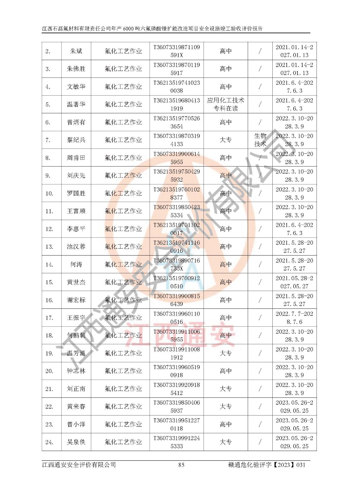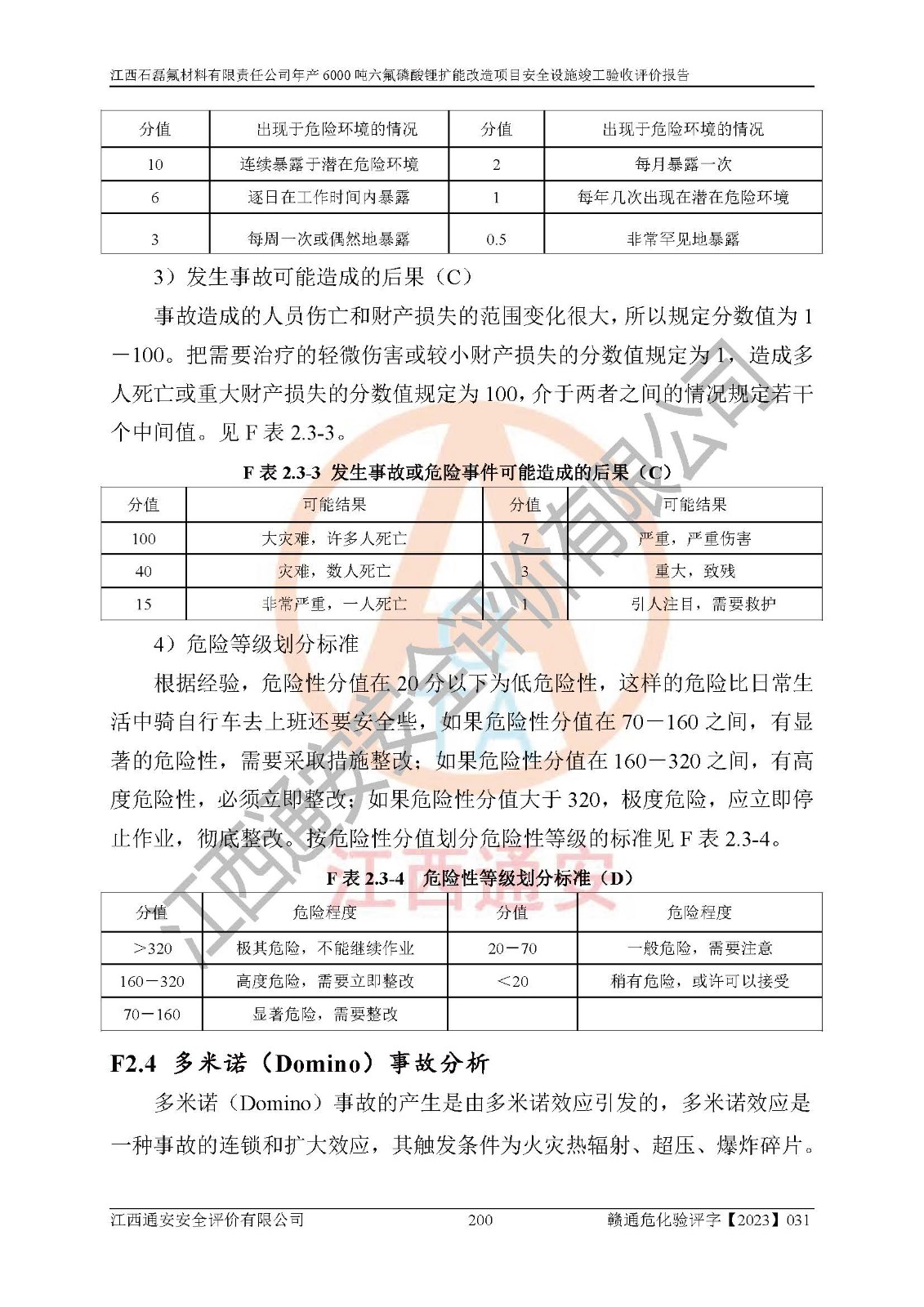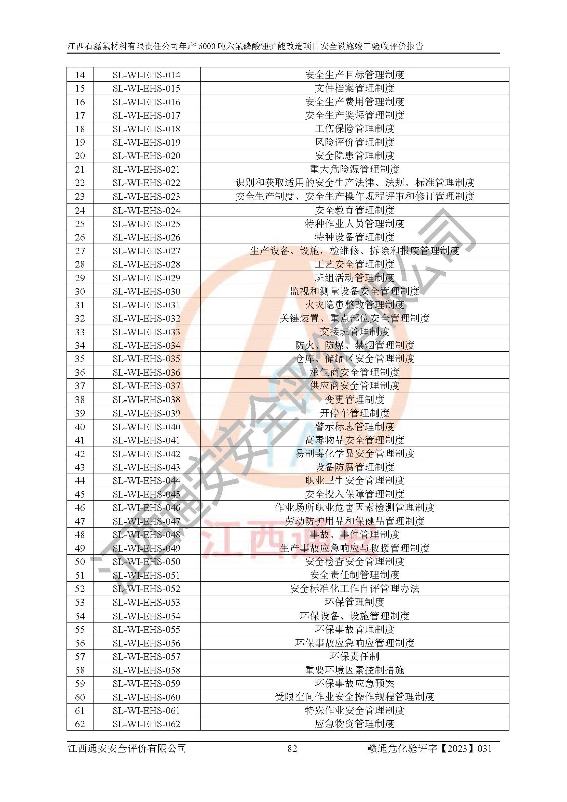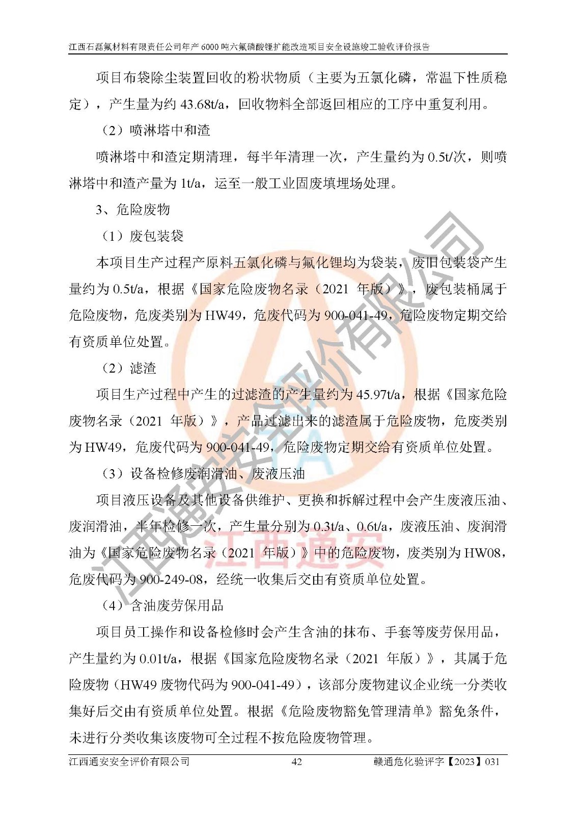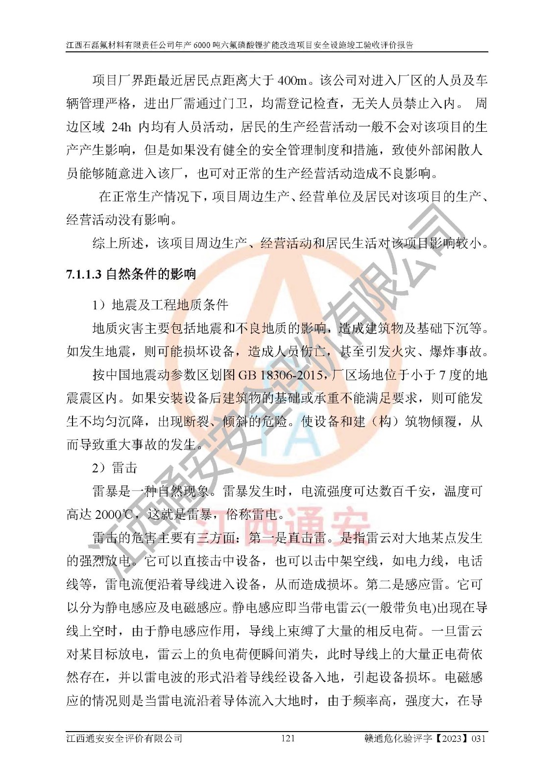 一、建设项目所在地的安全条件和与周边的安全防护距离 (1)该项目位于江西省赣州市会昌县氟盐化工产业基地,属于认定的化工园区,厂址选择合理,该项目与周边环境的防火间距符合规范的要求。 (2)重大危险源与“八类敏感场所及区域”的距离符合相关法律、法规的规定。 (3)该项目103生产车间三和201罐区一均构成**重大危险源。根据《危险化学品生产装置和储存设施外部安全防护距离确定方法》(GB/T 37243-2019)和《危险化学品生产装置和储存设施风险基准》(GB 36894-2018),该项目高敏感防护目标、重要防护目标、一般防护目标中的一类防护目标(<3×10-7)的外部安全防护距离包络线距离厂界*大值为76.36m,个人风险等值线范围内未出现该类防护目标;一般防护目标中的二类防护目标(<3×10-6)的外部安全防护距离包络线距离厂界*大值为51.62m,个人风险等值线范围内未涉及相应的防护目标;一般防护目标中的三类防护目标(<1×10-5)外部安全防护距离的包络线未出厂界。项目外部安全防护距离内无相应的防护目标,该项目不存在社会风险。 (4)该项目投产后在正常生产情况下,对其周边单位的生产、经营活动和居民的生活影响很小。在发生事故的情况下对周边单位的生产、经营活动和居民的生活存在影响。该项目周边单位的生产、经营活动和居民的生活对该项目投产后的正常生产影响很小。该项目所在地自然条件(不包括地震等破坏力**的自然灾害)的变化对该项目投产后的正常生产没有影响。 二、建设项目安全设施设计的采纳情况和已采用(取)的安全设施水平 该项目采用的主要安全设施包括了以下方面:检测、报警设施,设备安全防护设施,作业场所防护设施,安全警示标志,泄压和止逆设施,紧急处理设施,防止火灾蔓延设施,灭火设施,紧急个人处置设施,应急救援设施,劳动防护用品和装备等。 该项目在建设过程中采纳了《安全设施设计专篇》中的有关安全措施建议及要求,针对性的采取了相应的预防和控制措施,建设中未落实的安全措施,在试生产中已进行了整改。试生产表明该项目所采取的安全控制措施安全**,主要生产装置、设备运行平稳,安全可靠,安全水平较高,能够满足安全生产条件。 三、建设项目试生产(使用)后具备**现行有关安全生产法律、法规和部门规章及标准规定和要求的安全生产条件 1)法律法规等方面的符合性:该项目按照建设项目“三同时”要求,项目进行了备案、通过了安全条件审查、安全设施设计审查、试生产方案审查,立项审批手续齐全,安全设施设计、建设施工、施工监理均由有资质的单位承担,项目建设符合法律、法规规定的审批、施工、监理手续。项目建设期间,公司结合生产需要,增设了部分辅助设施和工艺管线,属于一般变更,试生产期间公司已委托河北英科石化工程有限公司进行了设计变更,作为已经审查通过的安全设施设计专篇的补充文件。 2)该项目与周边建构筑物的防火距离符合《精细化工企业工程设计防火标准》《建筑设计防火规范》的要求。根据《危险化学品生产装置和储存设施风险基准》GB36894-2018确定危险化学品单位周边重要目标和敏感场所承受的可容许个人风险和社会风险的定量风险评价。项目的个人风险计算结果表明,项目外部安全防护距离的包络线内无相应的防护目标。该软件未计算出社会风险。因此项目可容许个人风险和社会风险均在可接受范围内。 3)平面布置及常规防护设施措施的合理性:该项目生产场所、办公场所之间的间距满足安全要求,建筑结构、防火分区、防雷设施、安全出口的设置等满足安全生产的要求。消防道路的净宽度、净**、转弯半径均满足运输**及消防**通行。设置的常规防护设施、防止机械伤害、防急性中毒窒息的设施和措施符合要求。 4)设施、设备、装置及工艺方面的安全性:无**明令淘汰的工艺和 设备,该项目不涉及爆炸性危险区域划分。生产工艺操作和设置的安全设施满足安全需要,生产设施的布置能**人员疏散安全及操作方便。设施、设备、装置及工艺方面安全可靠。 5)特种设备、强制检测设备设施监督检验情况:该项目特种设备均进行了检验检测,并取得了检验报告;安全阀、压力表、有毒气体探头也进行了校验,校验结论合格,特种设备及安全附件符合《特种设备安全监察条例》 等相关法律法规、条例的规定。 6)公用工程、辅助设施的配套性:为该项目生产配套的供水、供电、 供气、供热等满足需要。 7)人员管理及安全培训方面充分性:公司现已建立了安全管理机构, 配备了专职安全管理人员。主要负责人王成具备化学工程与工艺专业本科学历,分管生产负责人曾中山具备化学工程与工艺专业本科学历,分管设备和技术负责人刘辉涛具备应用化学专业本科学历。专职安全管理人员共4人,配有一名注册安全工程师,专职安全管理人员均具有大专以上化工及安全专业相关学历。重点监管化工工艺的生产装置、储存设施操作人员具备高中及以上学历或化工类中等及以上职业教育水平。该公司制定了较完善的安全管理制度、岗位责任制、安全操作规程,制度执行情况较好。该公司已为从业职工交纳了工伤**。该公司对操作员工进行相关的培训和教育,经培训合格后上岗。 8)应急救援**性:企业根据自身实际情况,将该项目按照《生产经 营单位生产安全事故