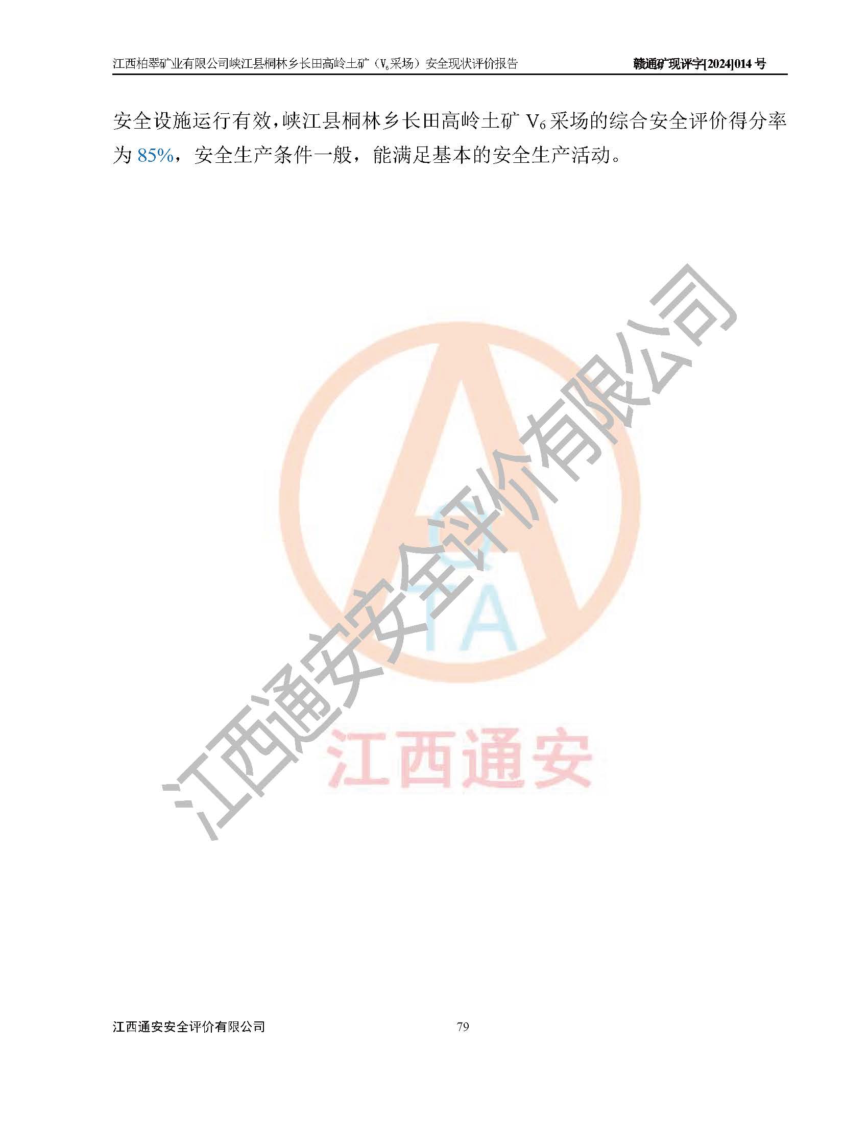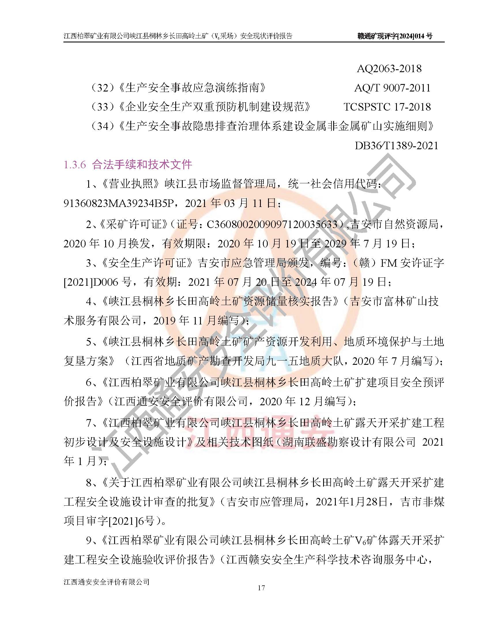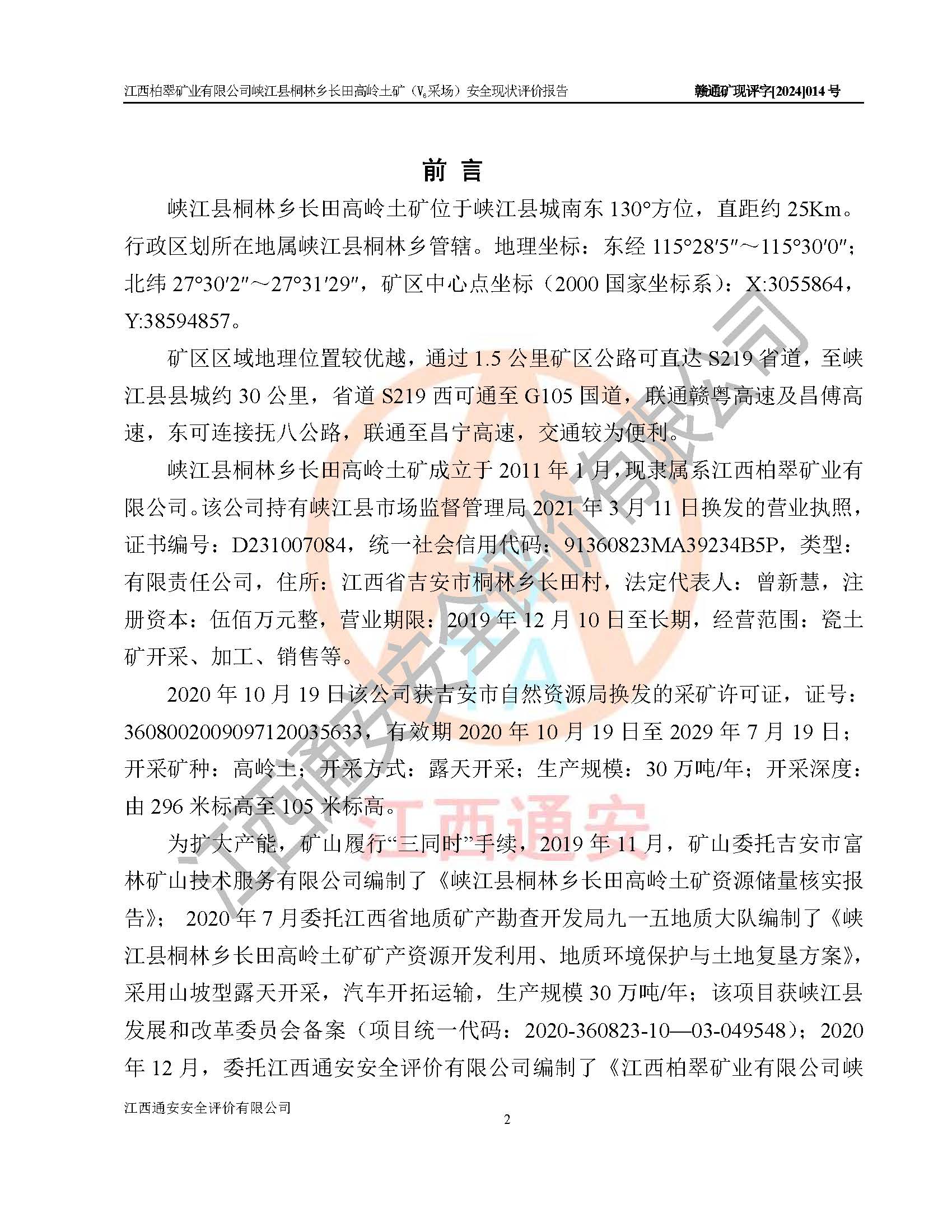 评价报告名称 | 江西柏翠矿业有限公司峡江县桐林乡长田高岭土矿(V6采场)安全现状评价报告 | ||||
